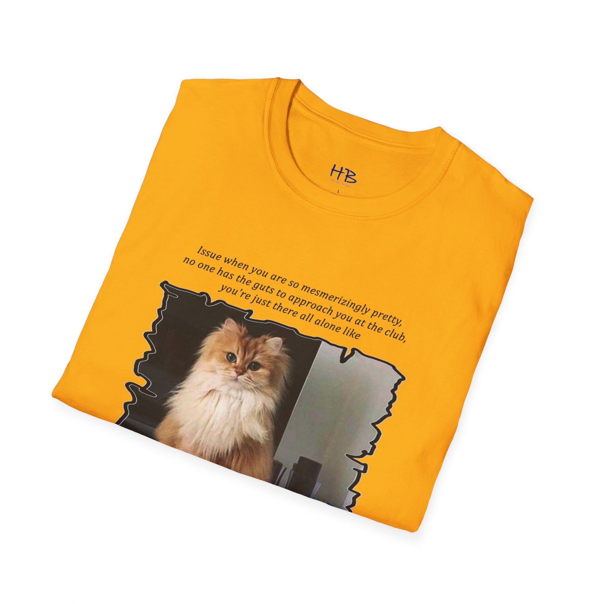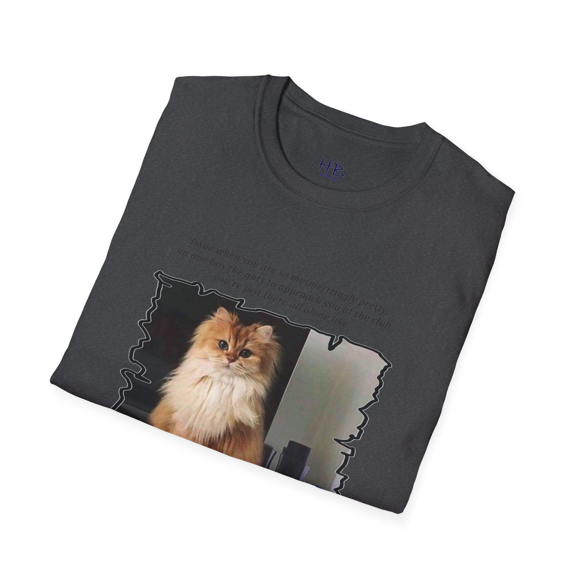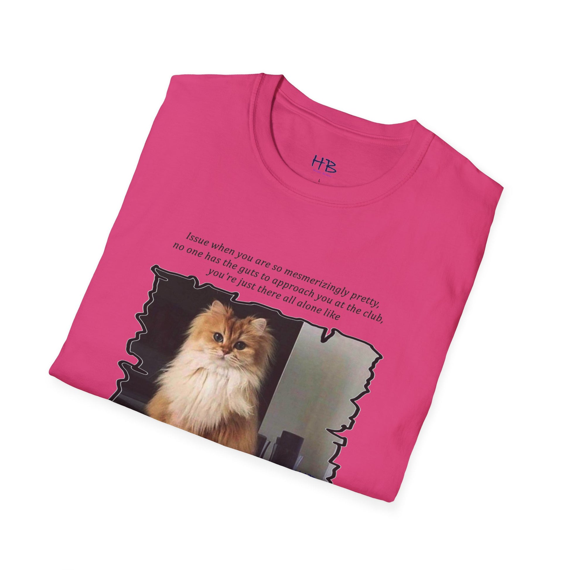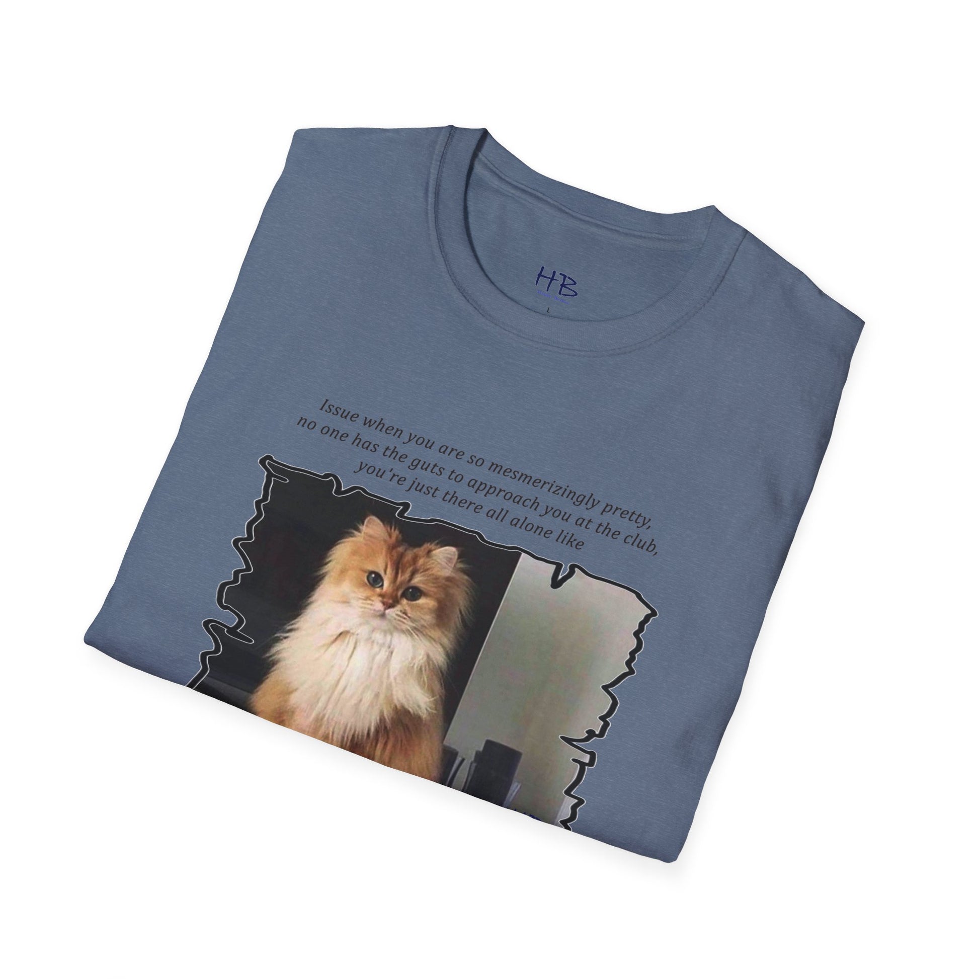 The accompanying text on the tee shirt reads, "When you're so mesmerizingly pretty, no one has the courage to approach you at the club. You're just there all alone, like a beautiful but lonely kitty." This clever text highlights the issue that even the most beautiful of creatures can feel alone and isolated at times.