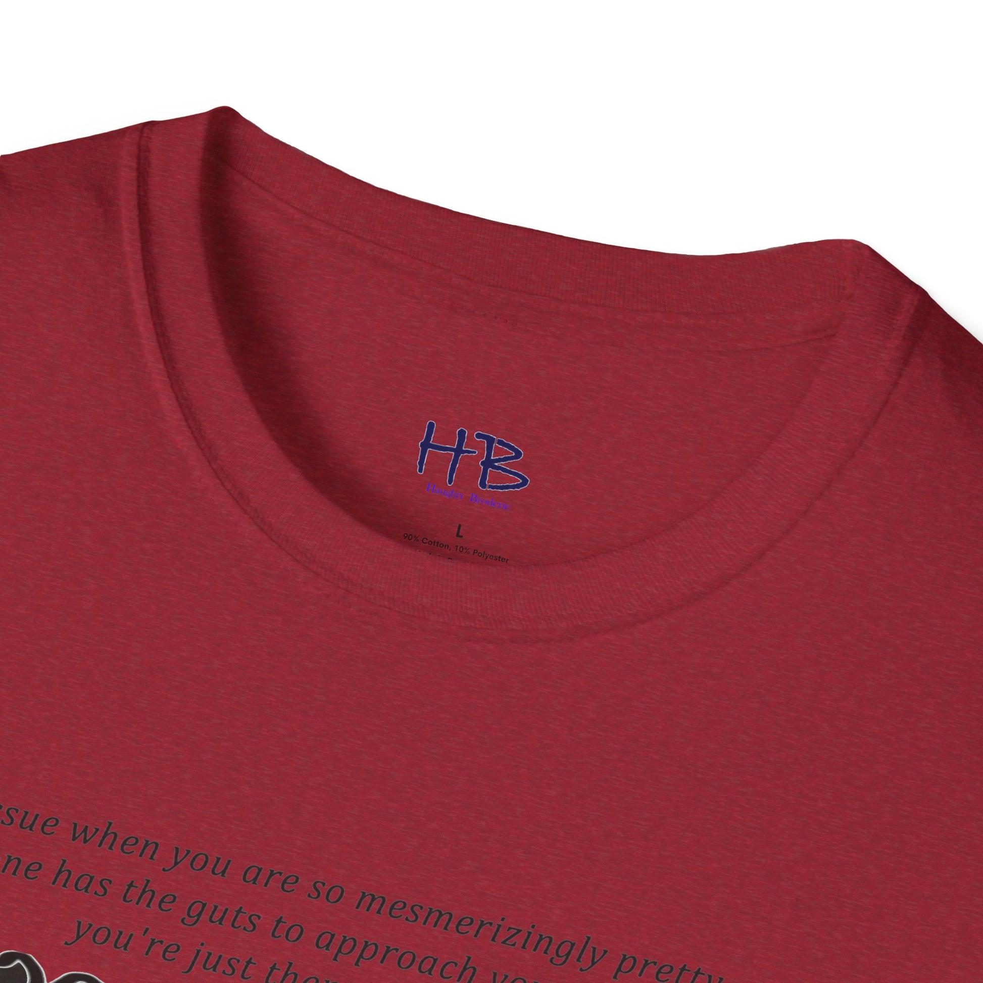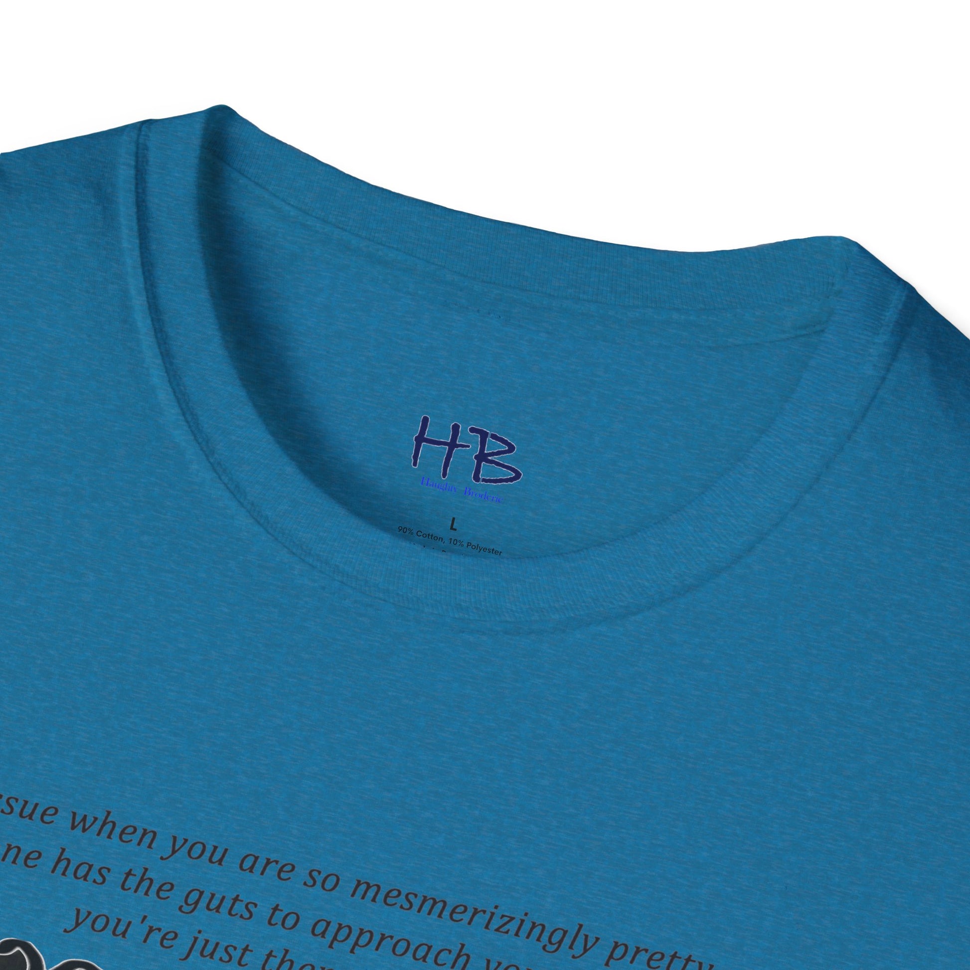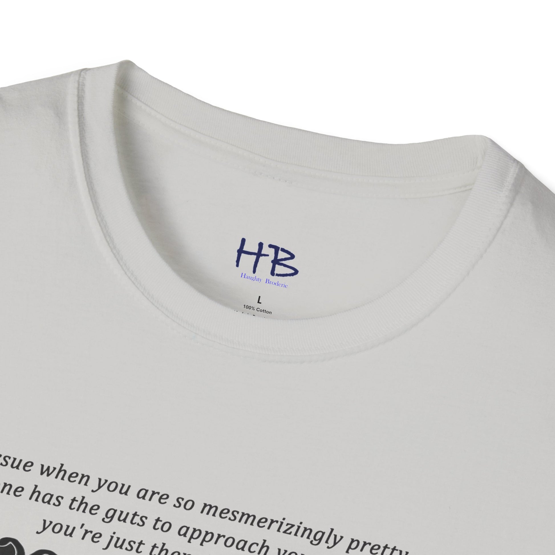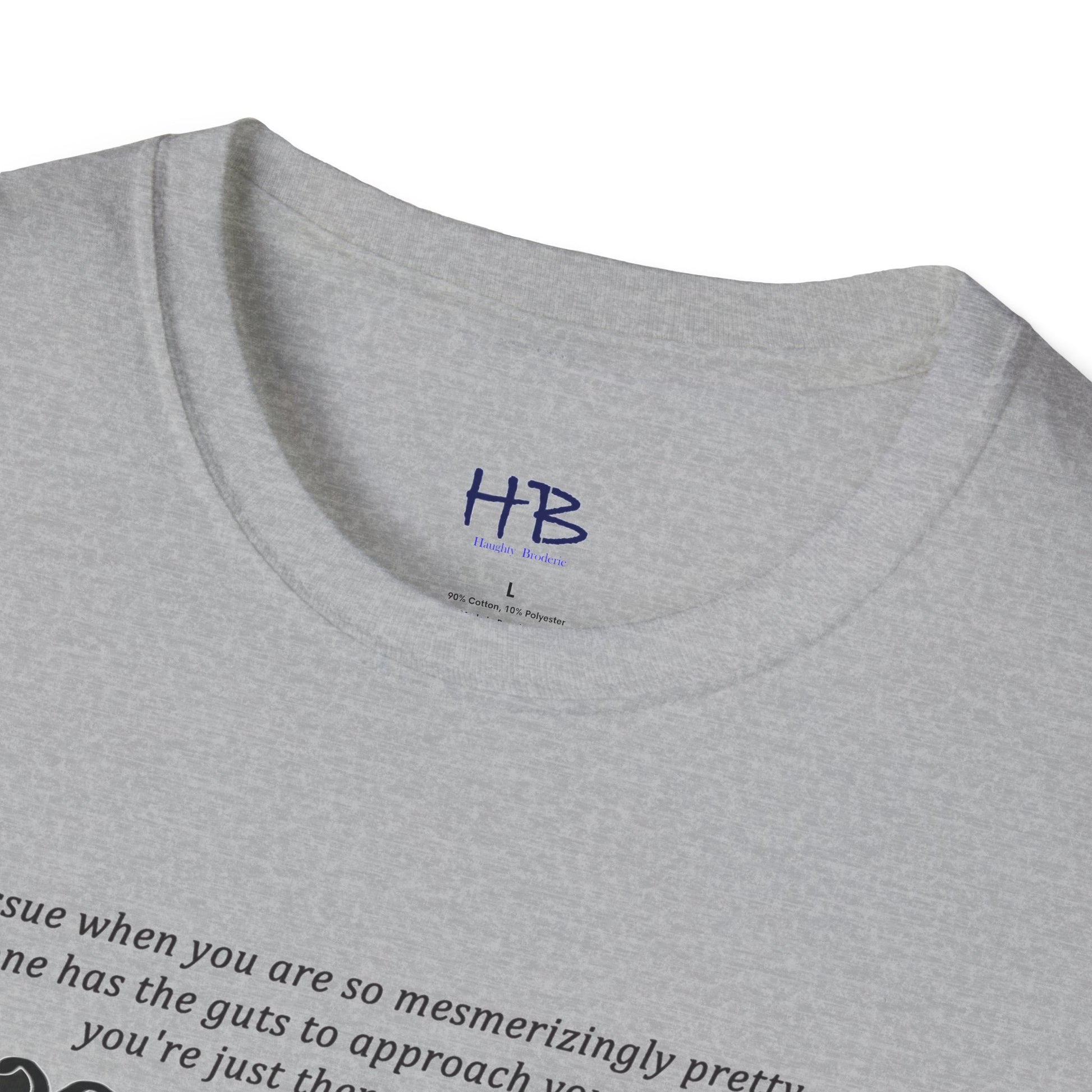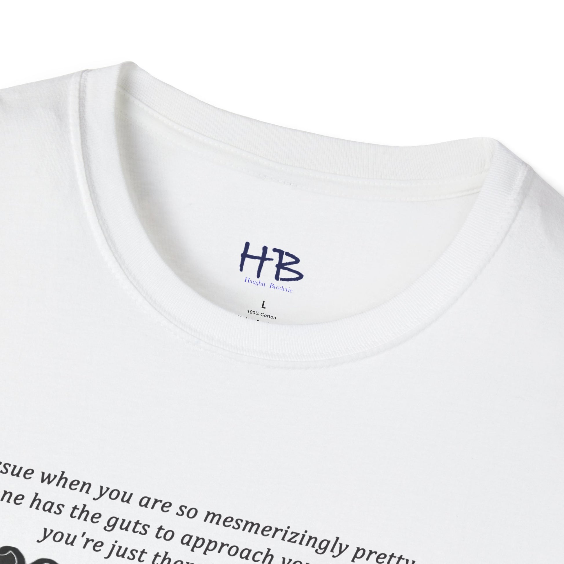 The accompanying text on the tee shirt reads, "When you're so mesmerizingly pretty, no one has the courage to approach you at the club. You're just there all alone, like a beautiful but lonely kitty." This clever text highlights the issue that even the most beautiful of creatures can feel alone and isolated at times.