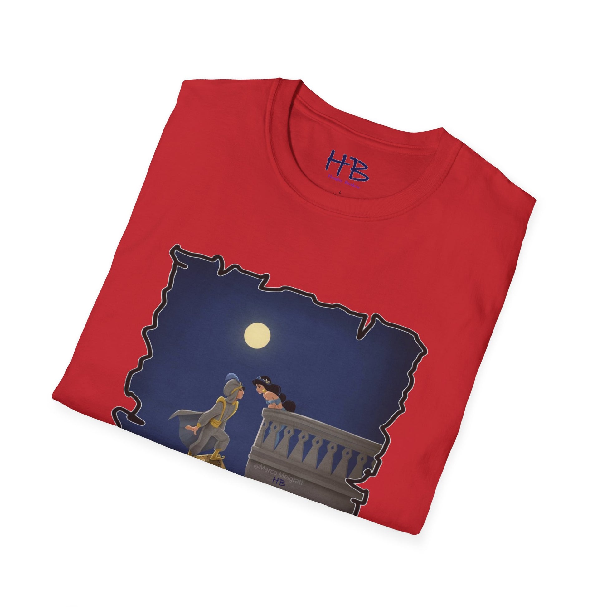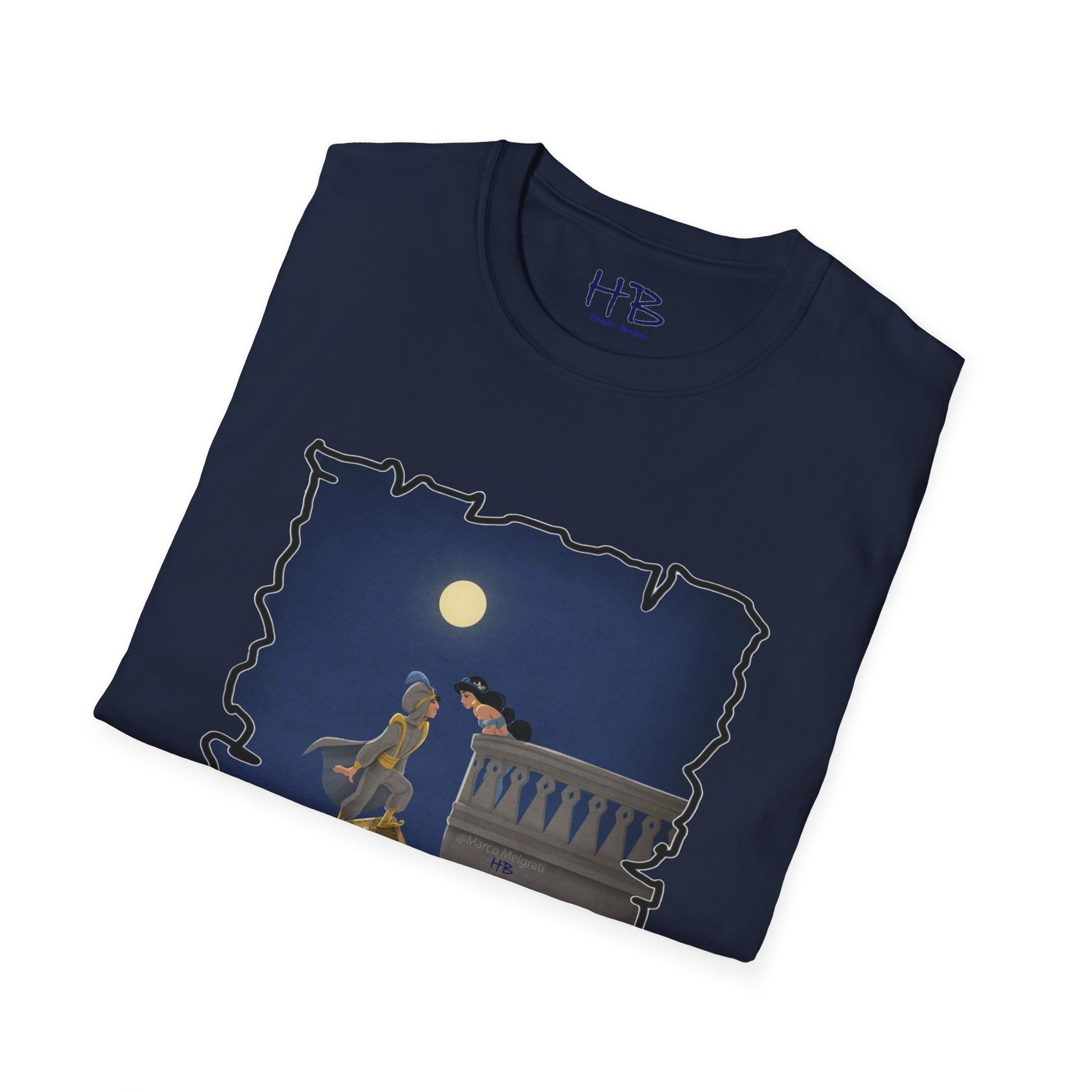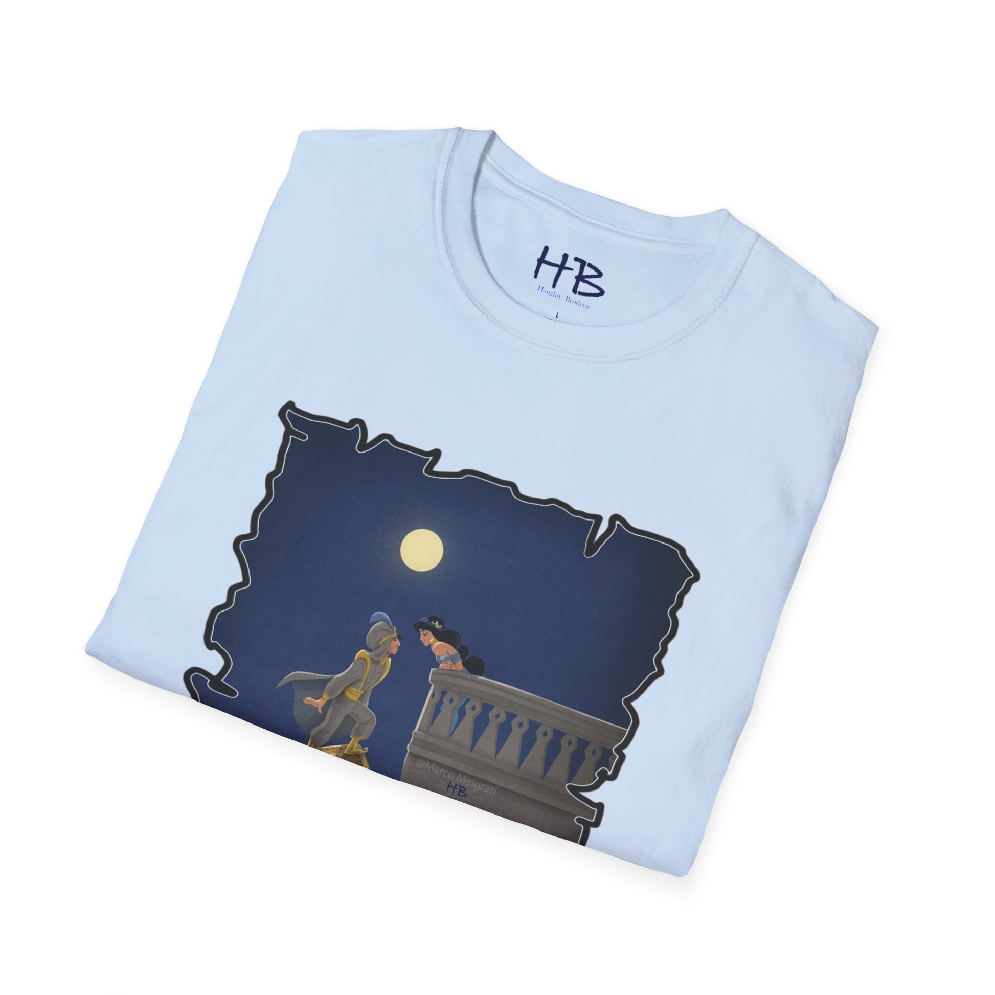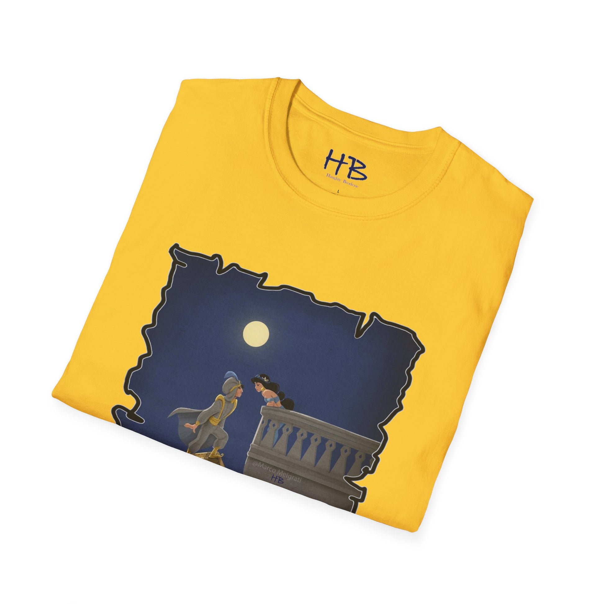 Introducing our latest tee shirt design, featuring a beloved scene from the famous tale of Aladin and Jasmin. In this depiction,