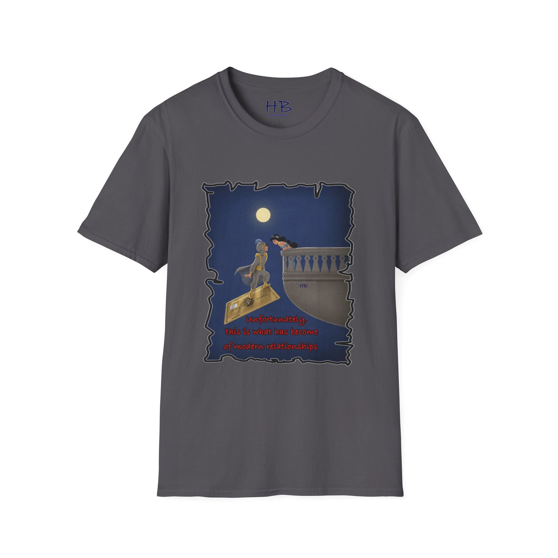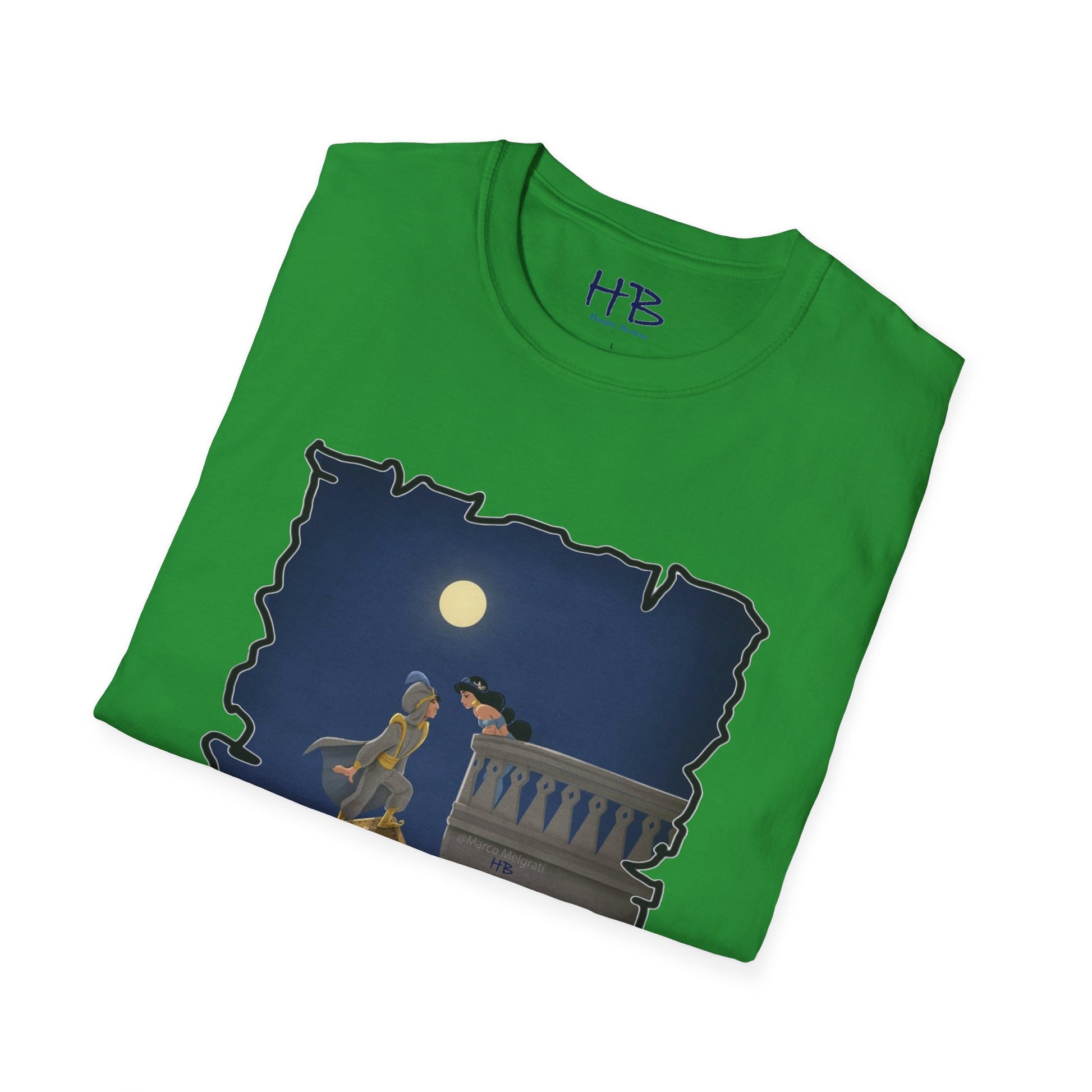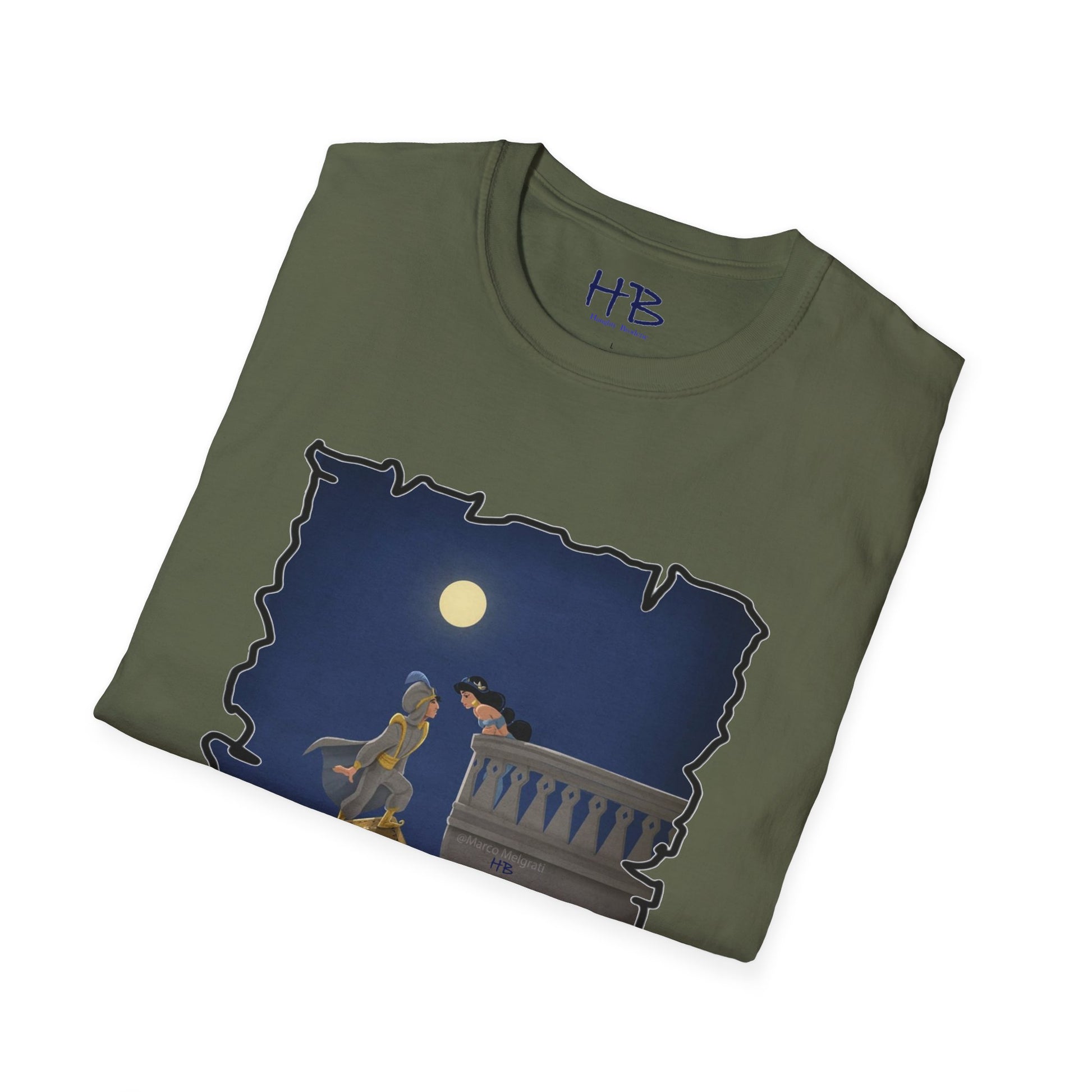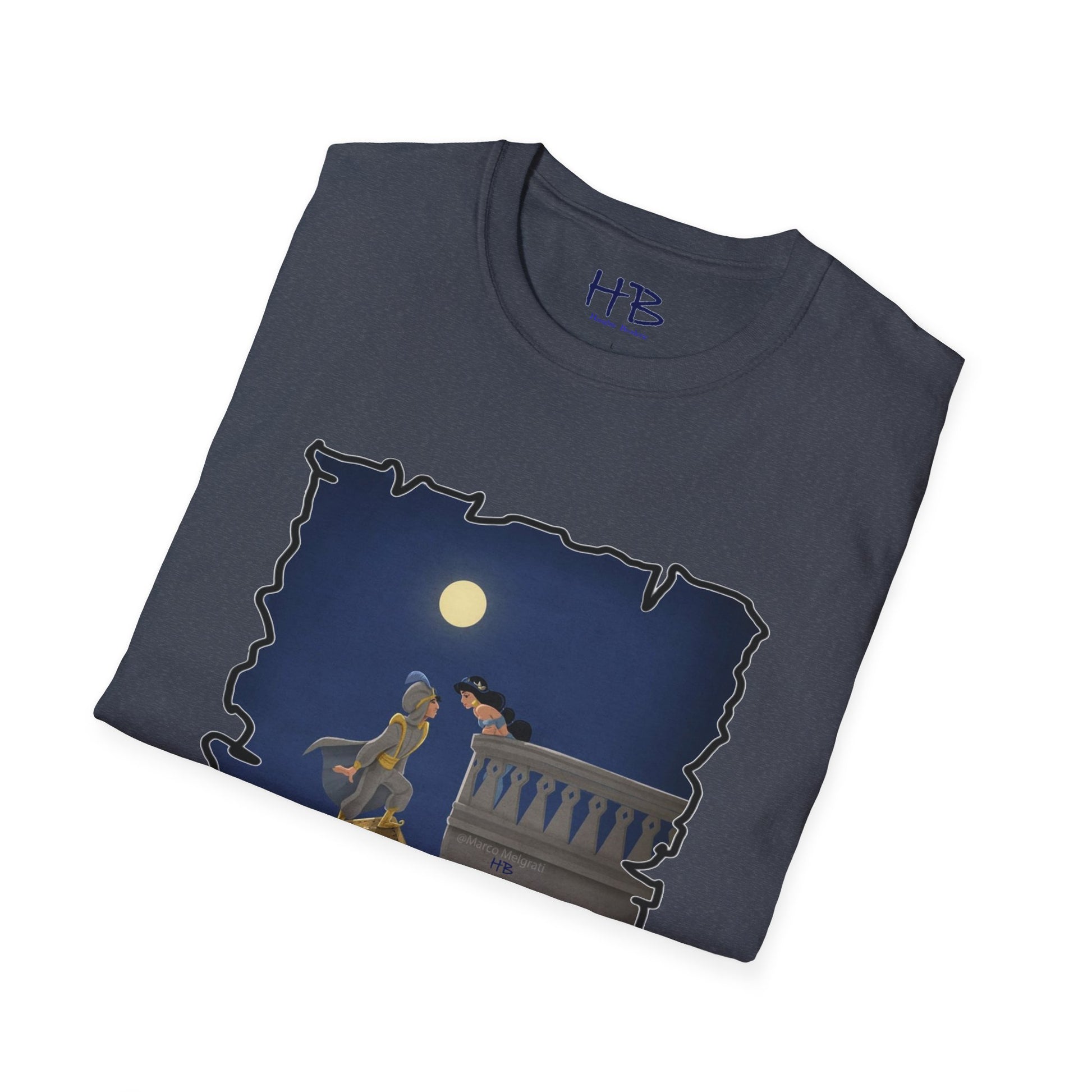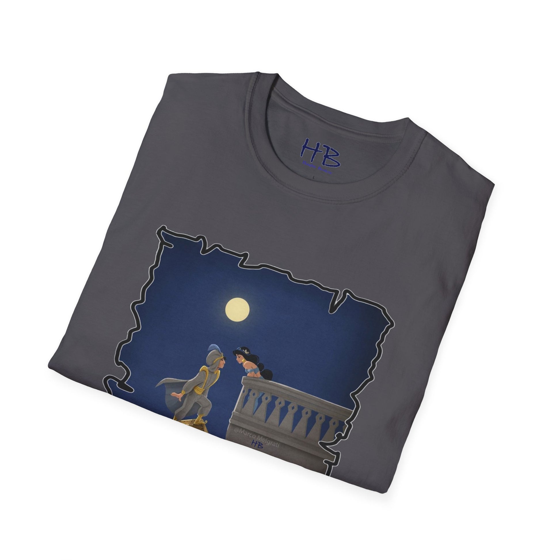 Introducing our latest tee shirt design, featuring a beloved scene from the famous tale of Aladin and Jasmin. In this depiction,
