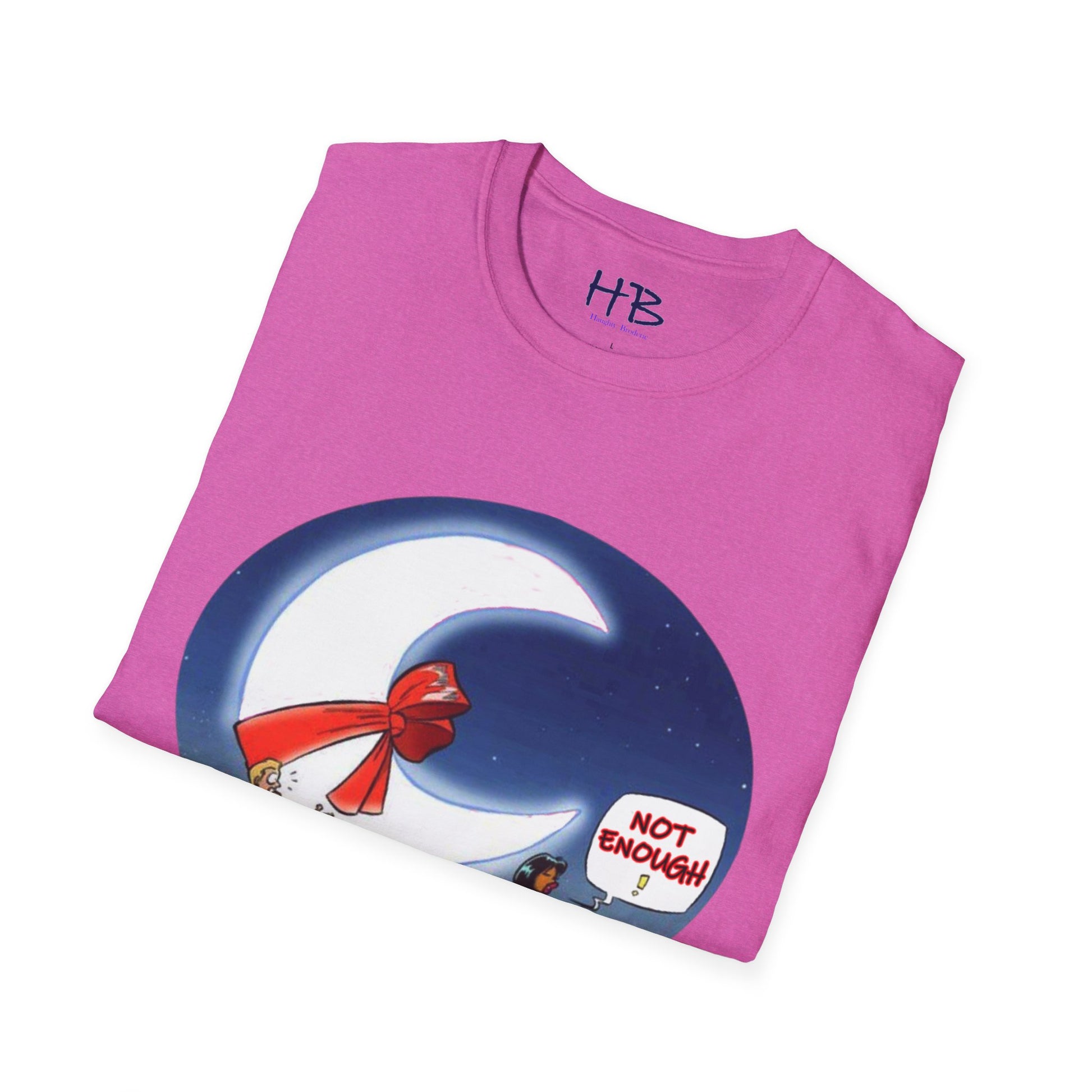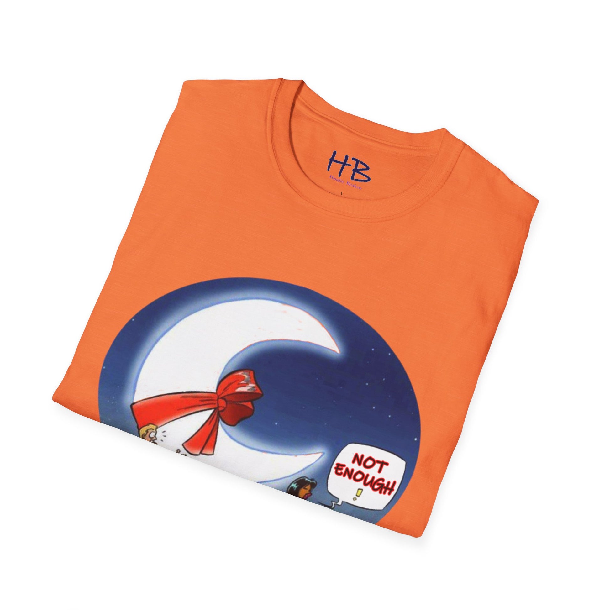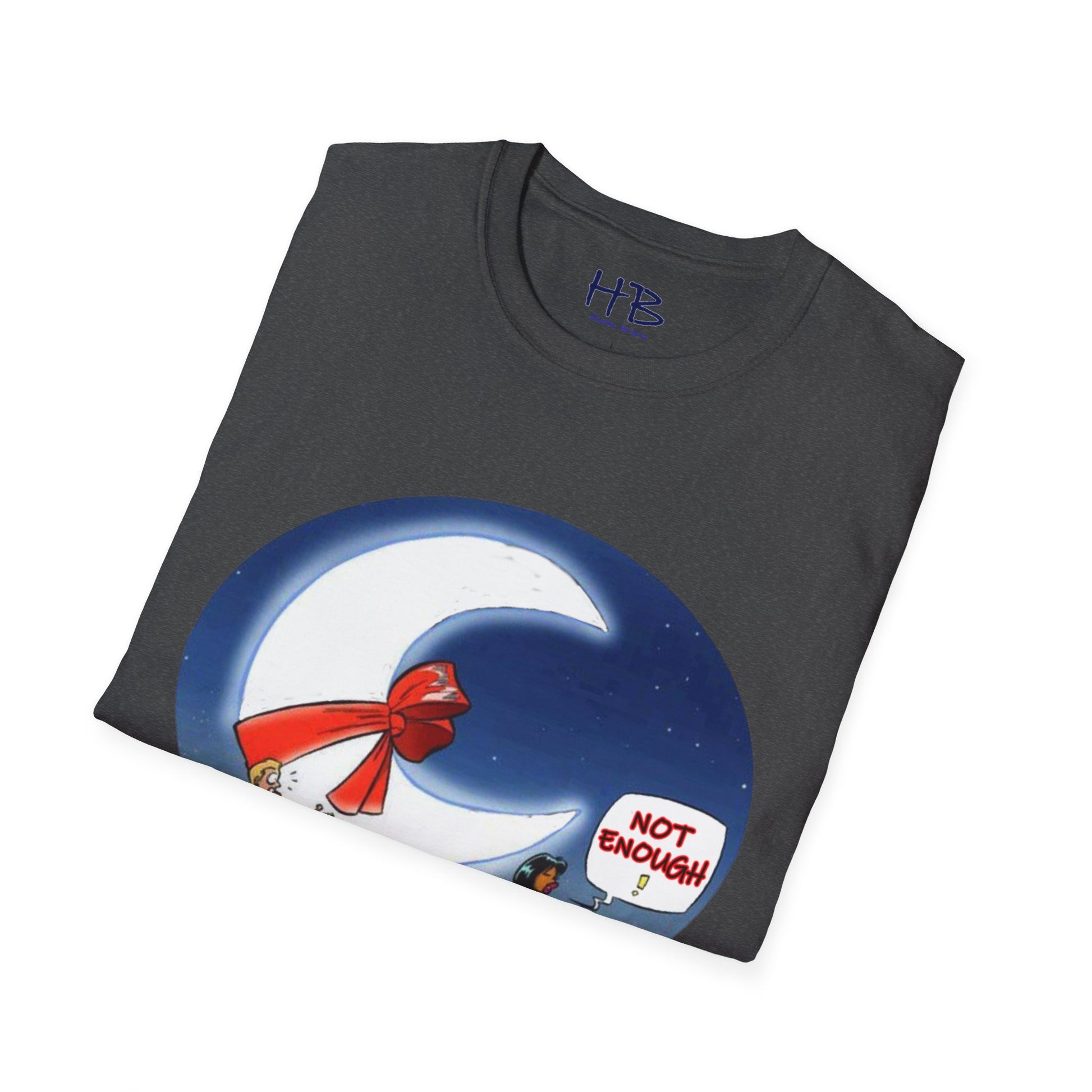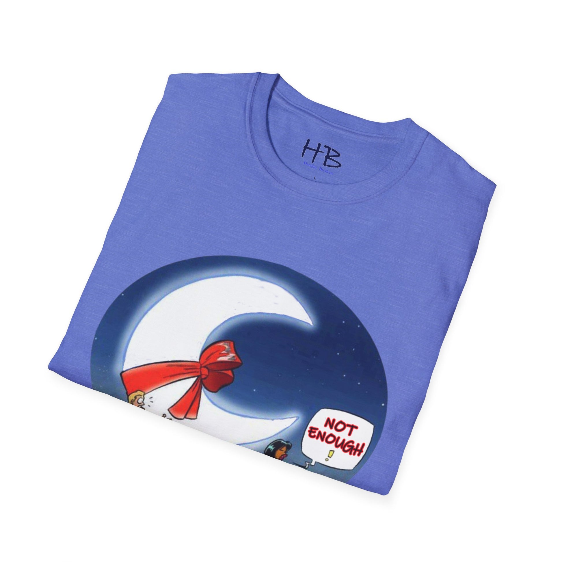 Introducing our exquisitely crafted garment that goes beyond being a mere tee shirt. This wearable canvas showcases a captivating portrayal of a discontented woman under the ethereal night sky, aglitter with a myriad of stars. By her side stands a dapper young gentleman, bearing the weight of the crescent moon, adorned with a sizable red bow. His outstretched arm offers the moon as a gesture of love and devotion. Yet, the woman's response is a resounding "NOT ENOUGH!"