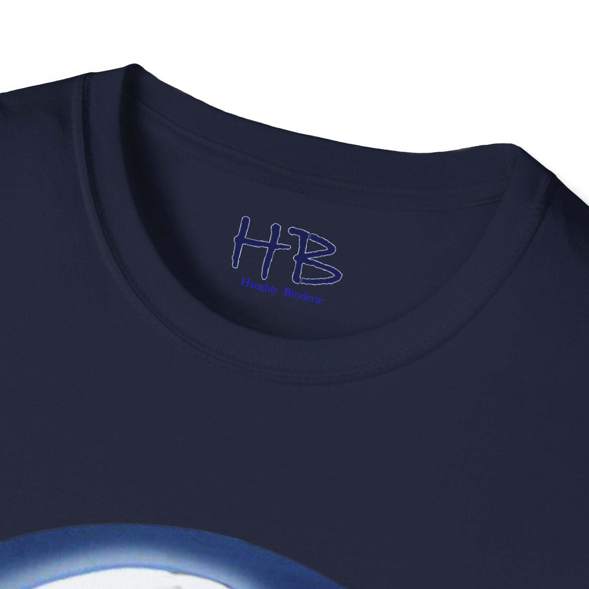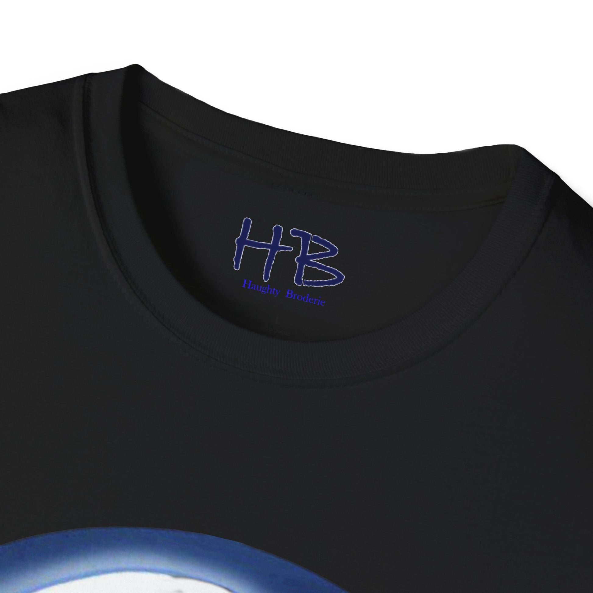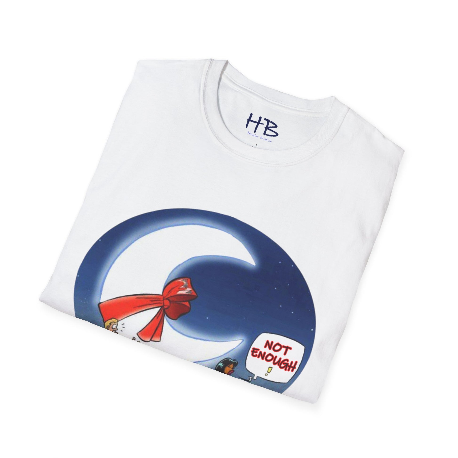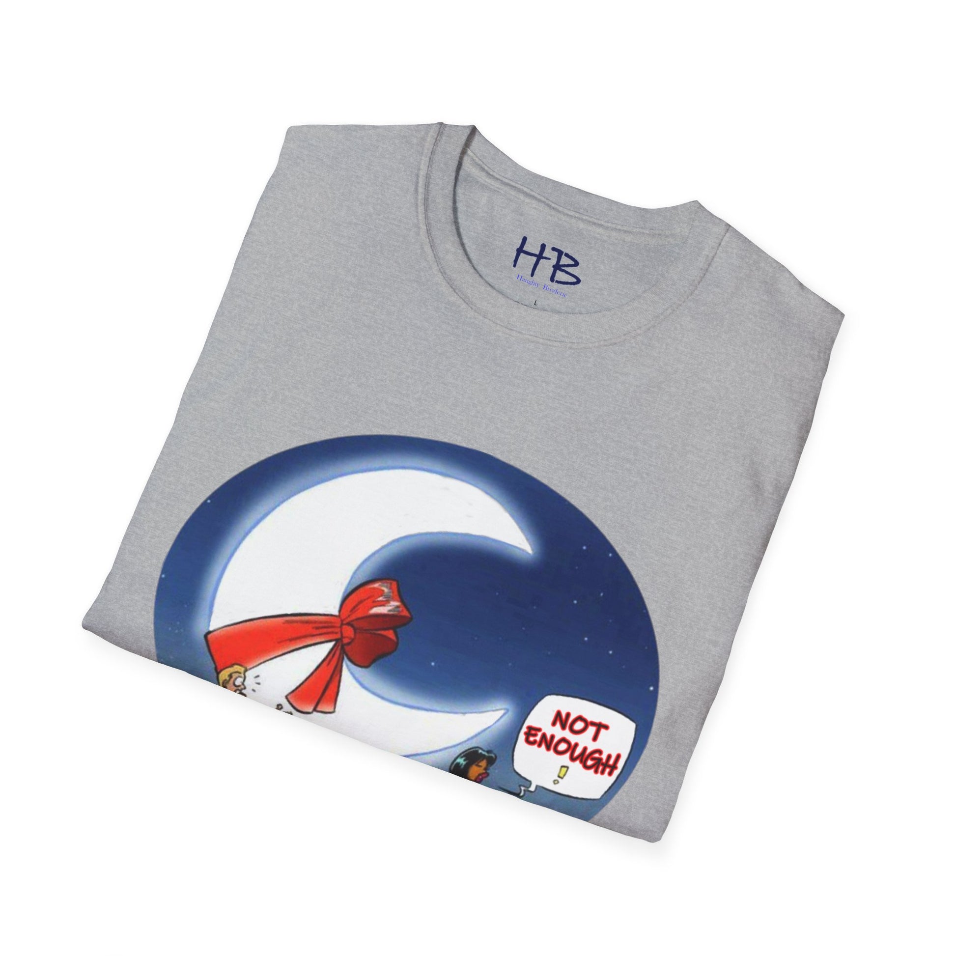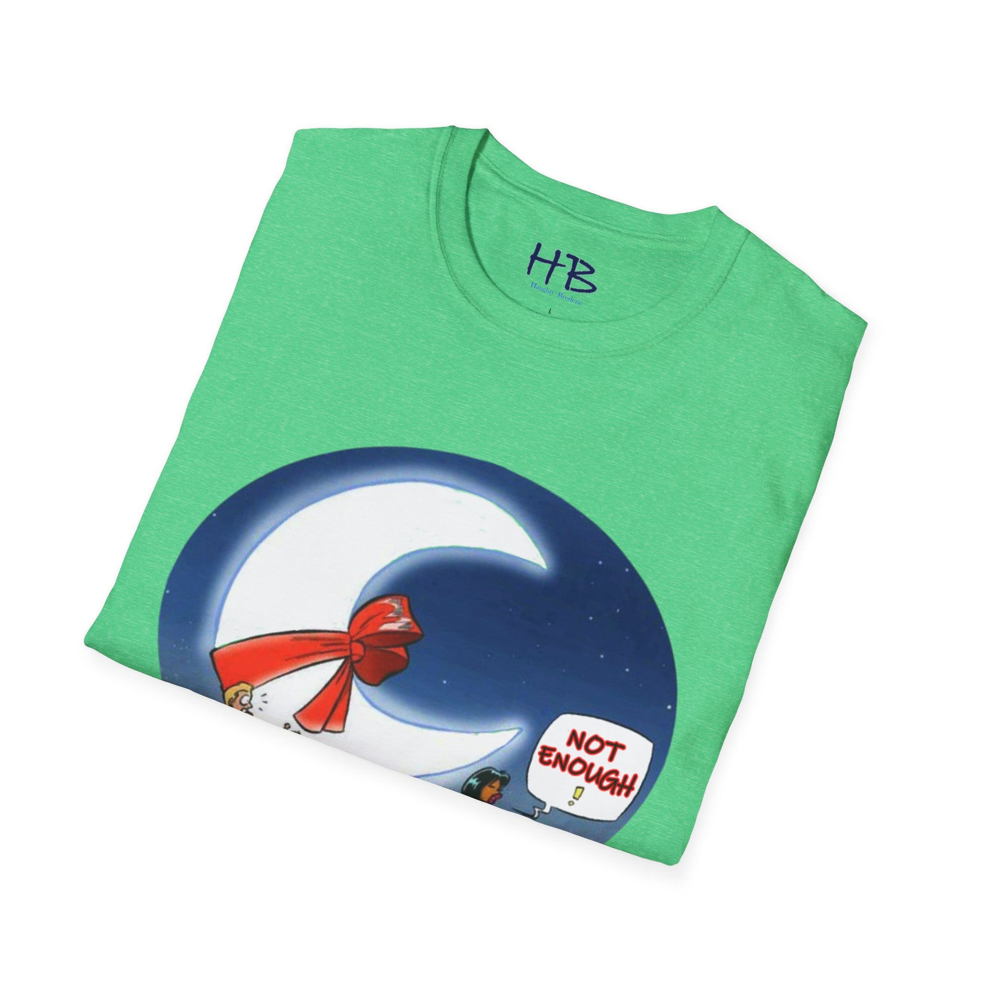 Introducing our exquisitely crafted garment that goes beyond being a mere tee shirt. This wearable canvas showcases a captivating portrayal of a discontented woman under the ethereal night sky, aglitter with a myriad of stars. By her side stands a dapper young gentleman, bearing the weight of the crescent moon, adorned with a sizable red bow. His outstretched arm offers the moon as a gesture of love and devotion. Yet, the woman's response is a resounding "NOT ENOUGH!"