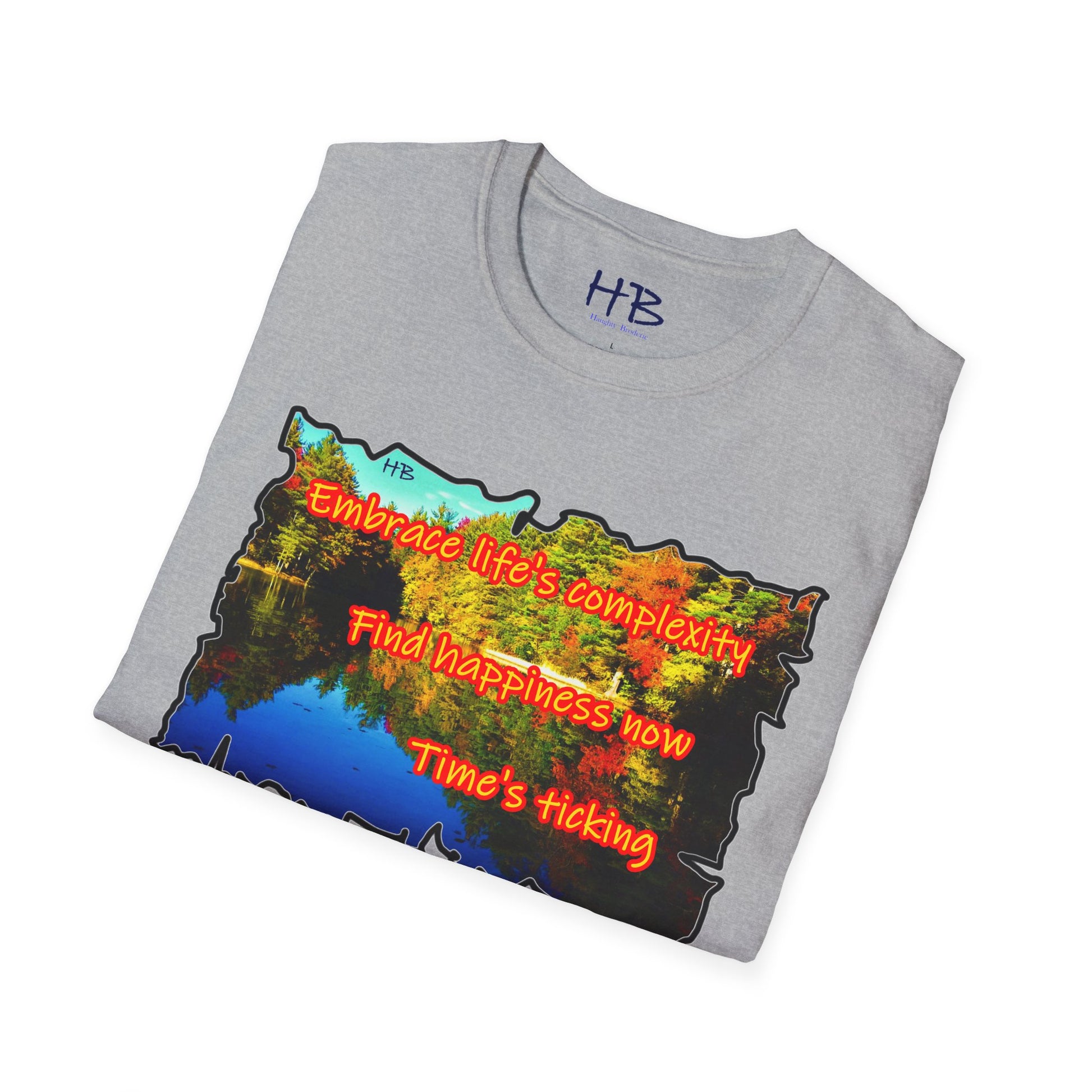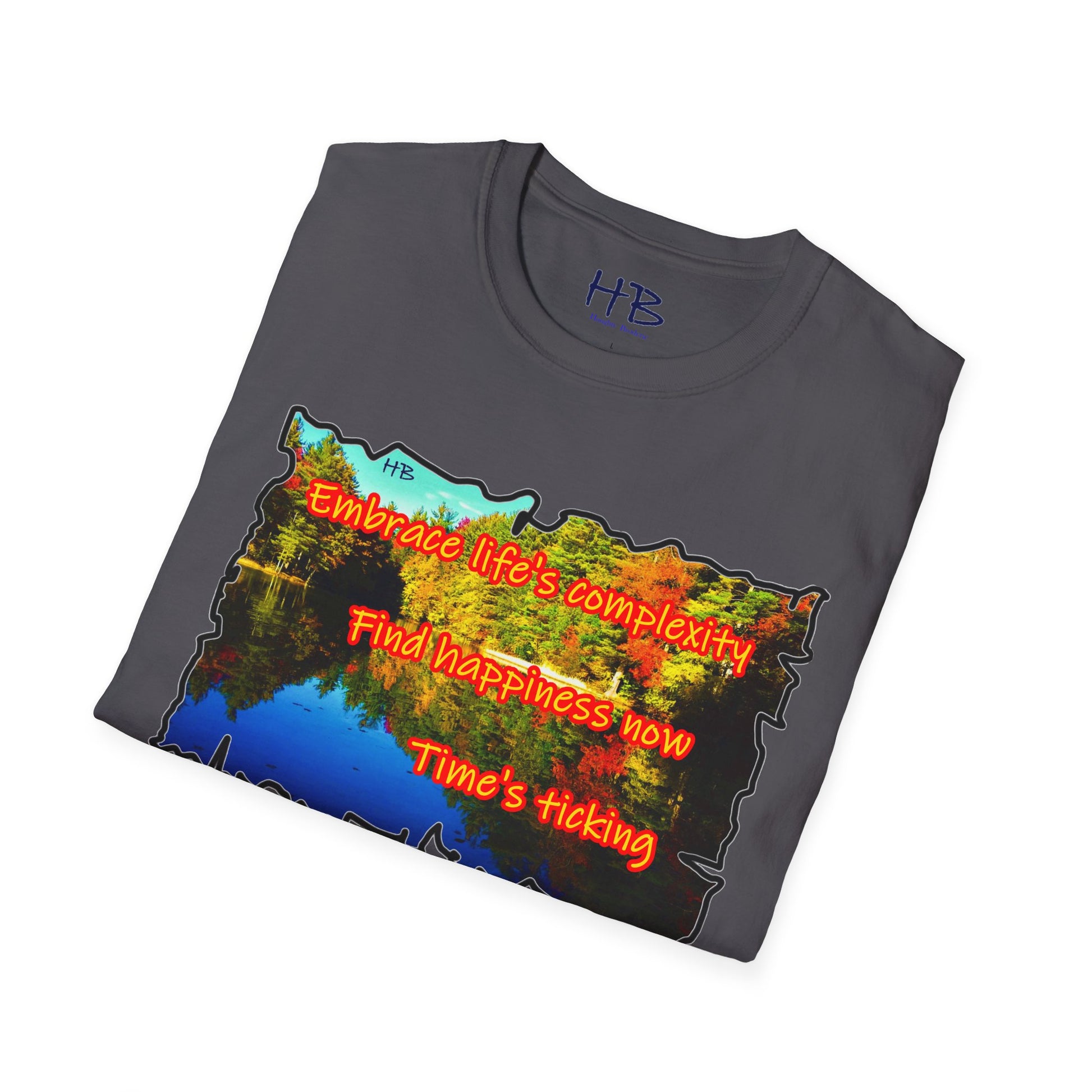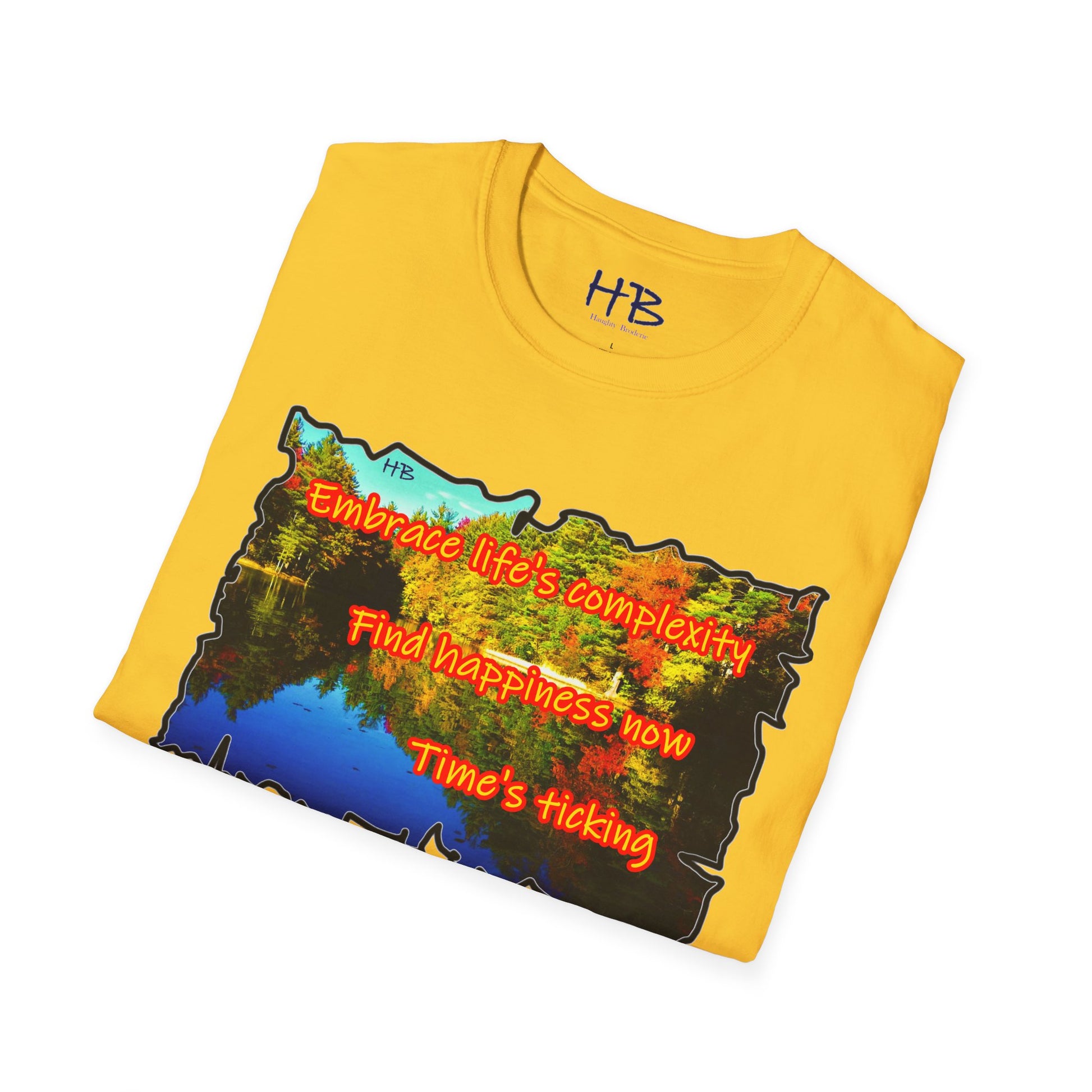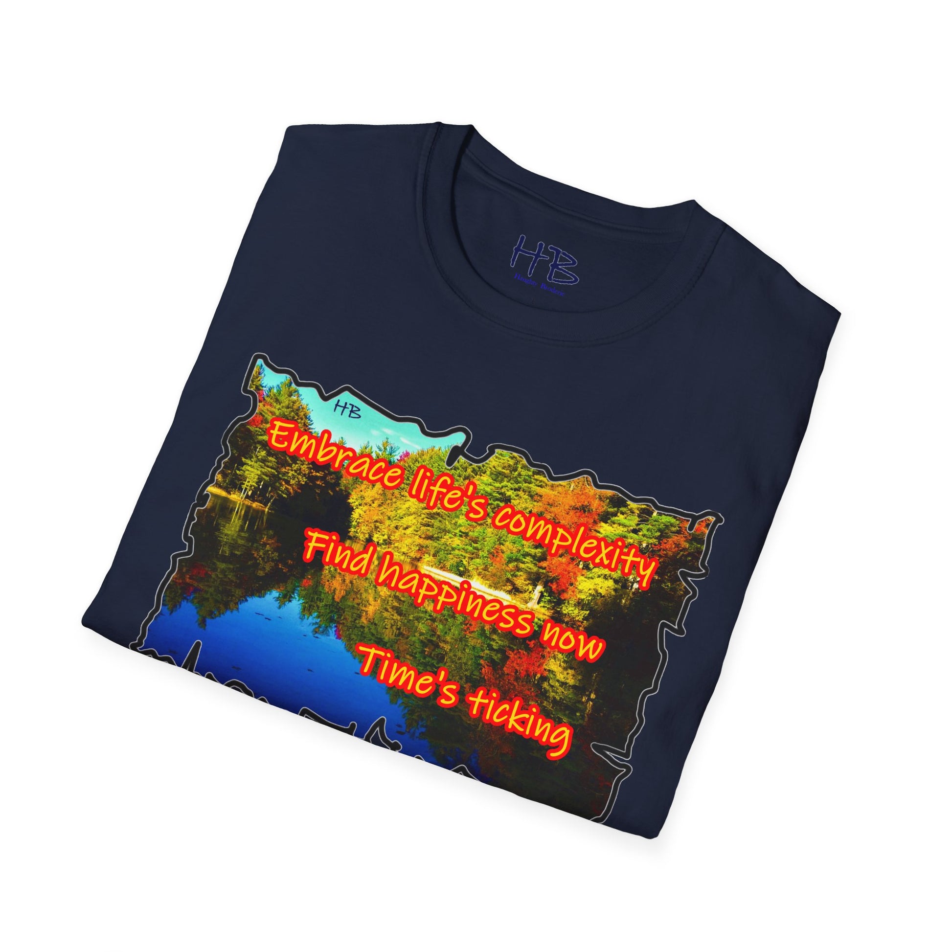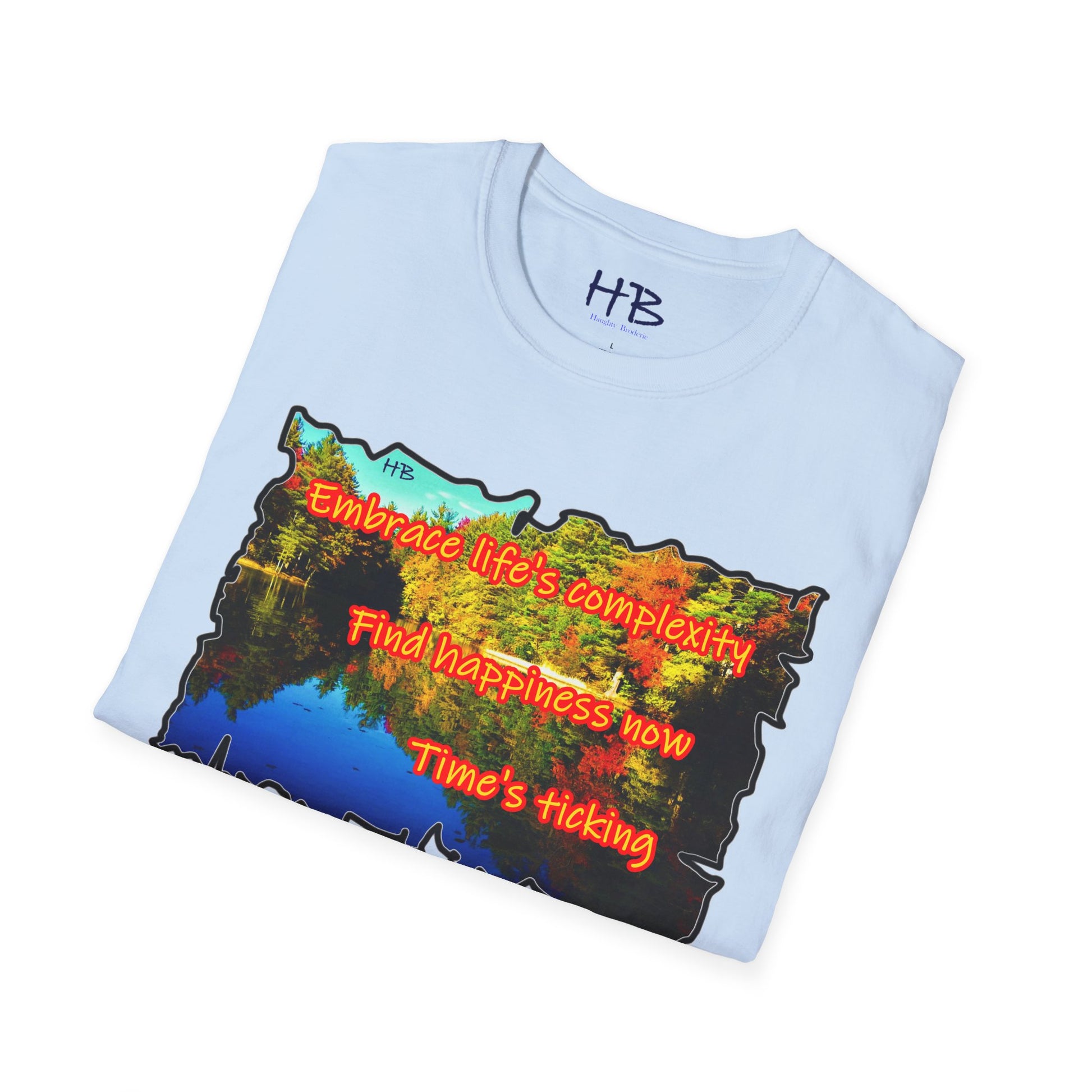 Next, focus on the carefully crafted phrase: "Embrace life's complexity, find joy now, time’s flowing." This isn't just a t-shirt; it’s a wearable reminder to live in the moment. A gentle prompt to embrace the journey of life, without waiting for an ideal future that might never materialize.