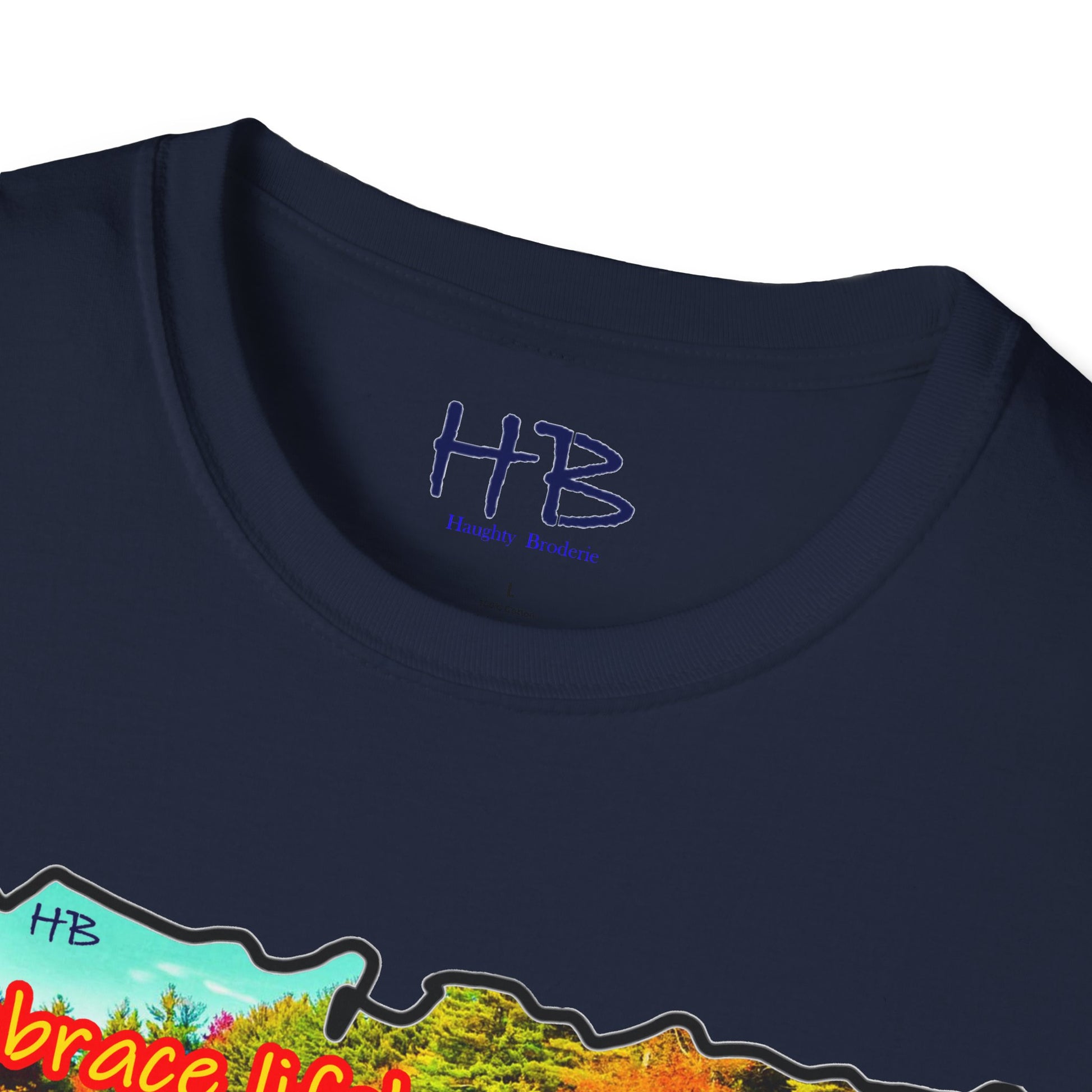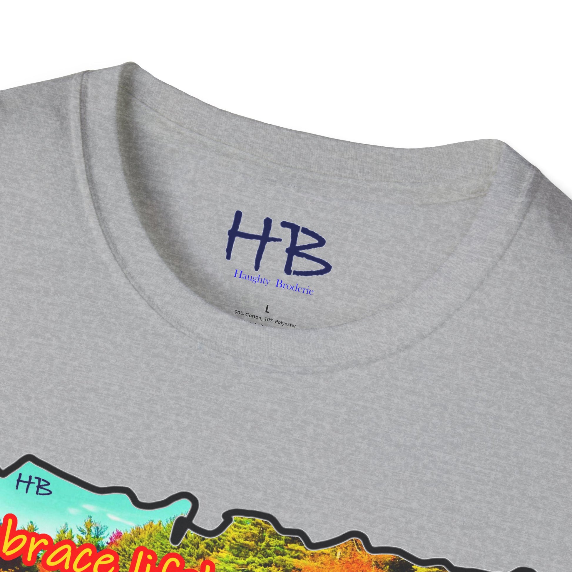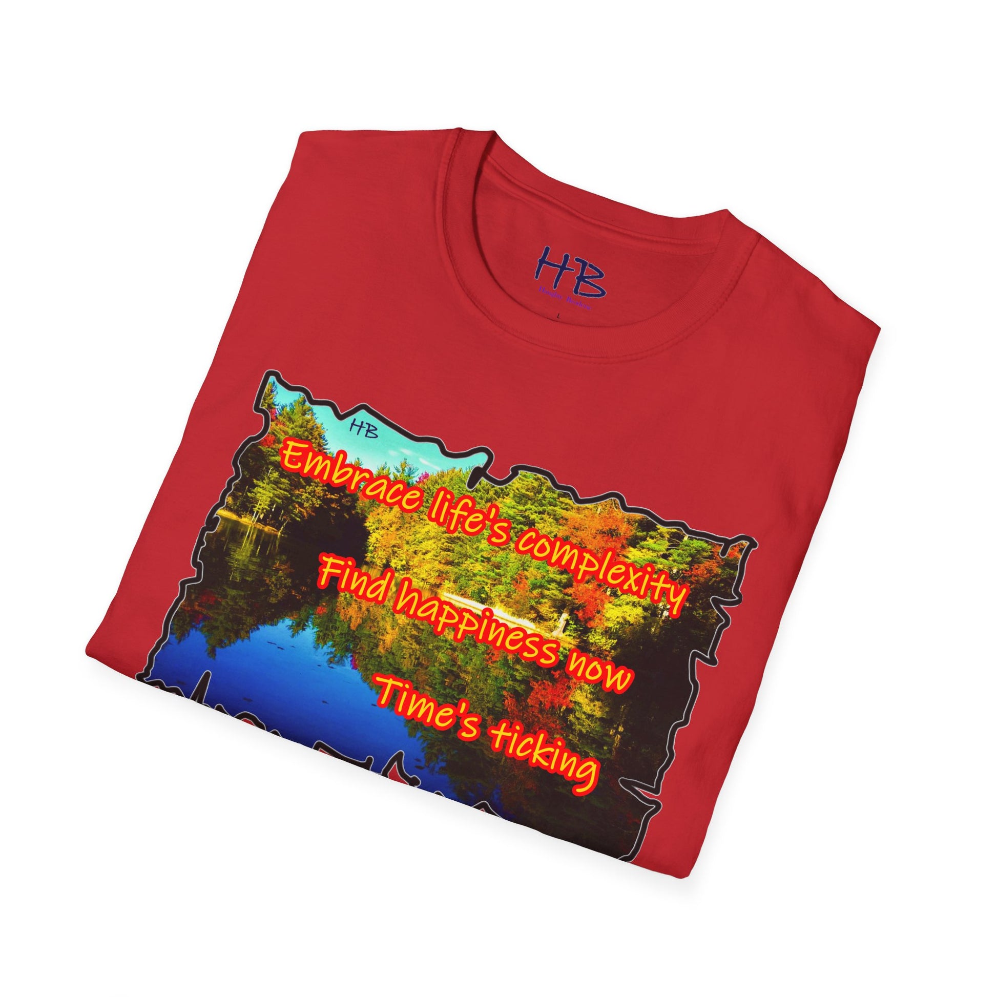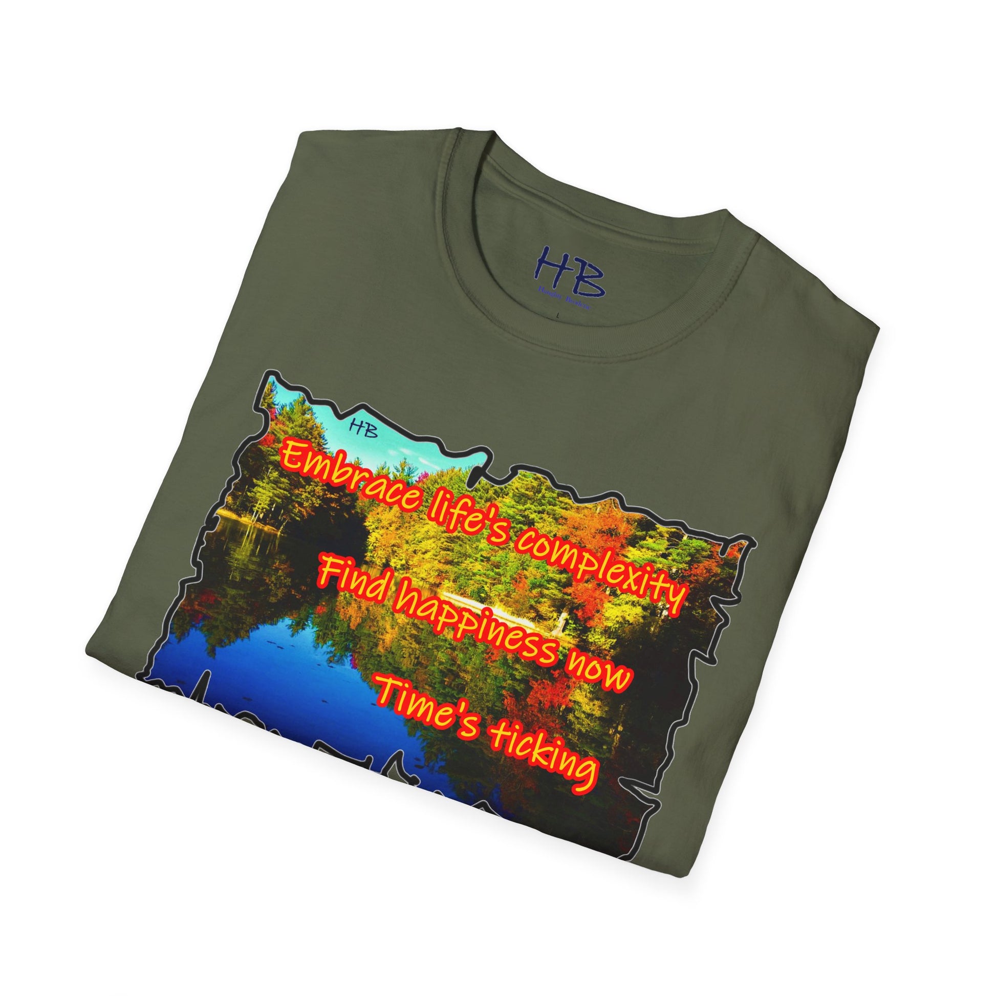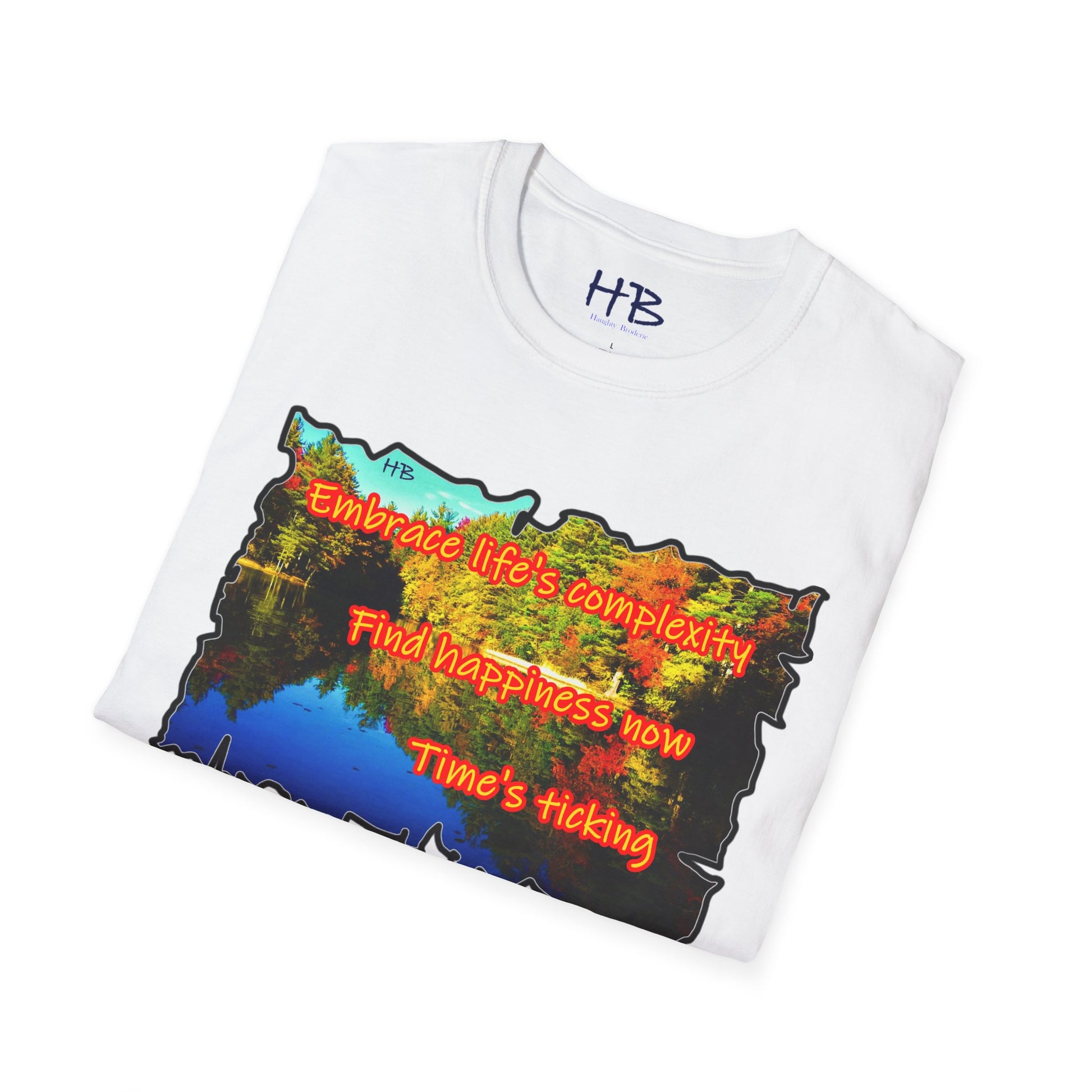Next, focus on the carefully crafted phrase: "Embrace life's complexity, find joy now, time’s flowing." This isn't just a t-shirt; it’s a wearable reminder to live in the moment. A gentle prompt to embrace the journey of life, without waiting for an ideal future that might never materialize.