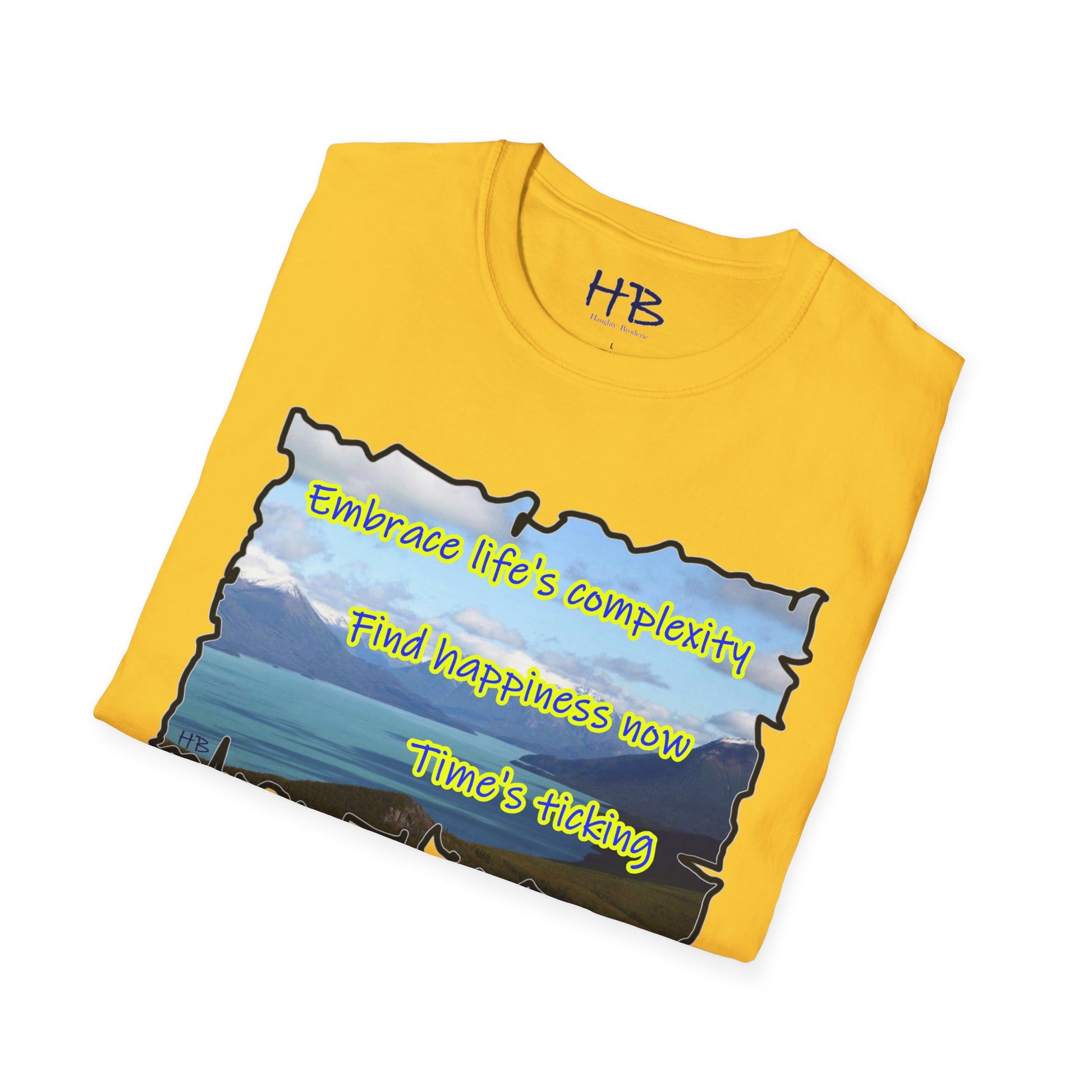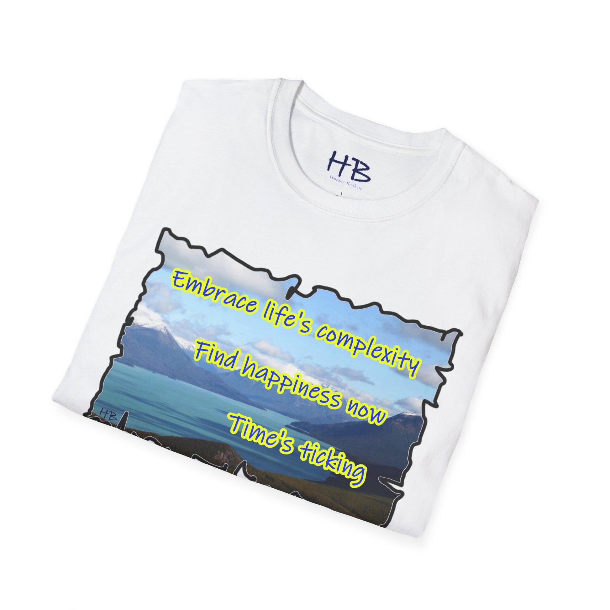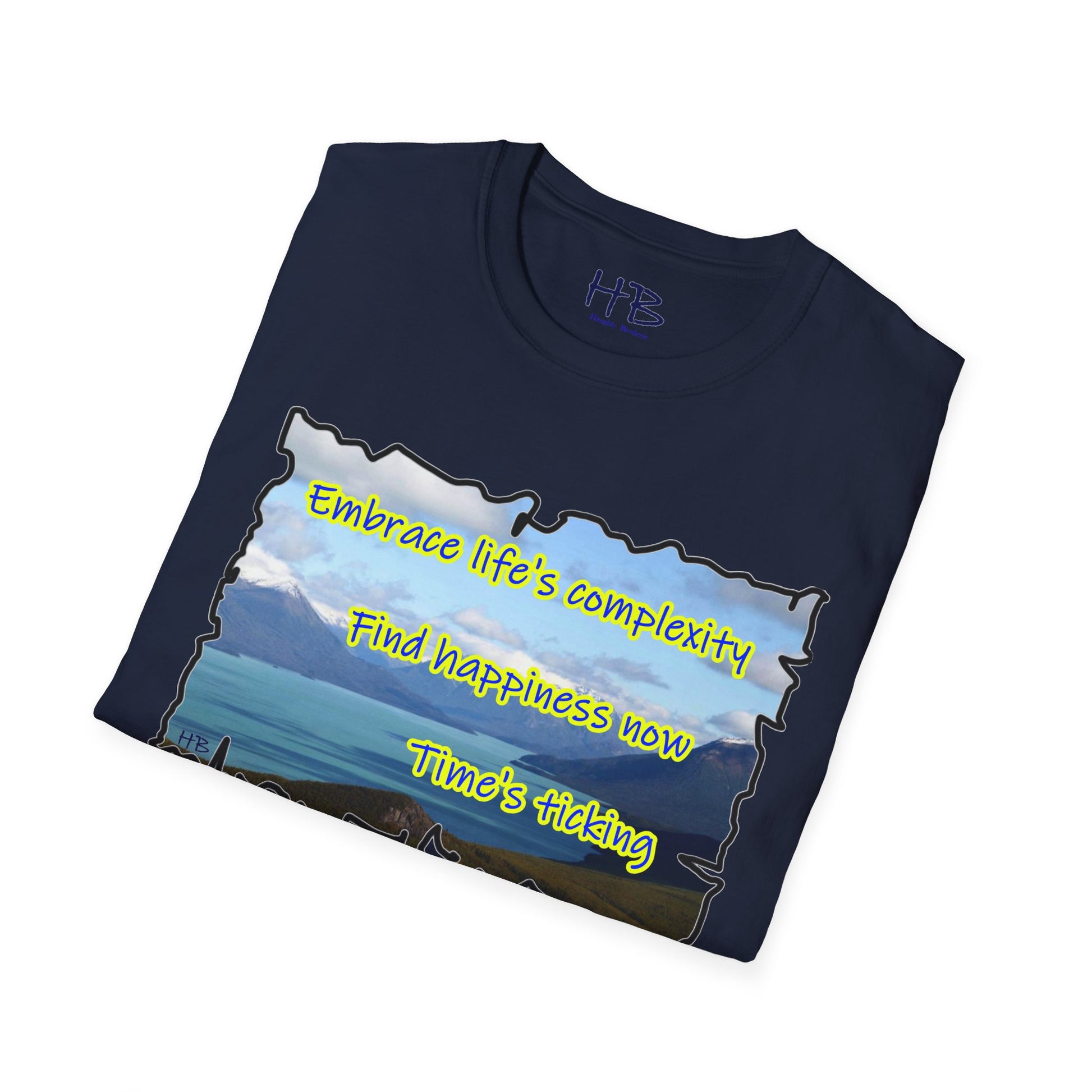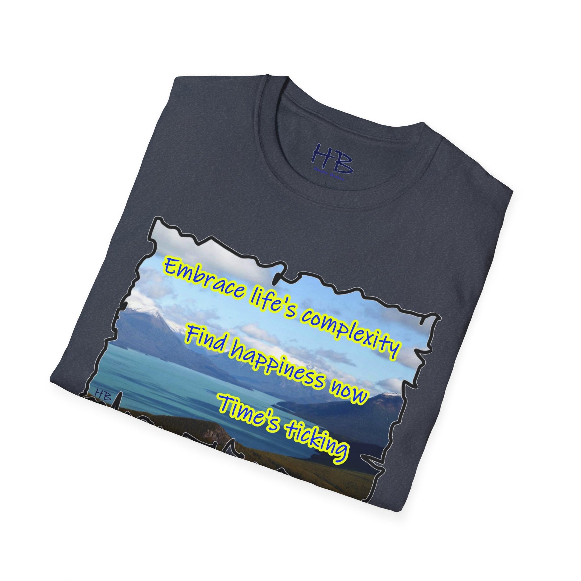 Now, let your eyes move to the thoughtfully crafted words, a timeless message that resonates: "Embrace life's complexity, find joy now, time's ticking." This isn't just a t-shirt; it’s wearable wisdom, a reminder that the beauty of life is found in the present moment. It urges you to accept life's twists and turns, without waiting for an ideal future that might never come.