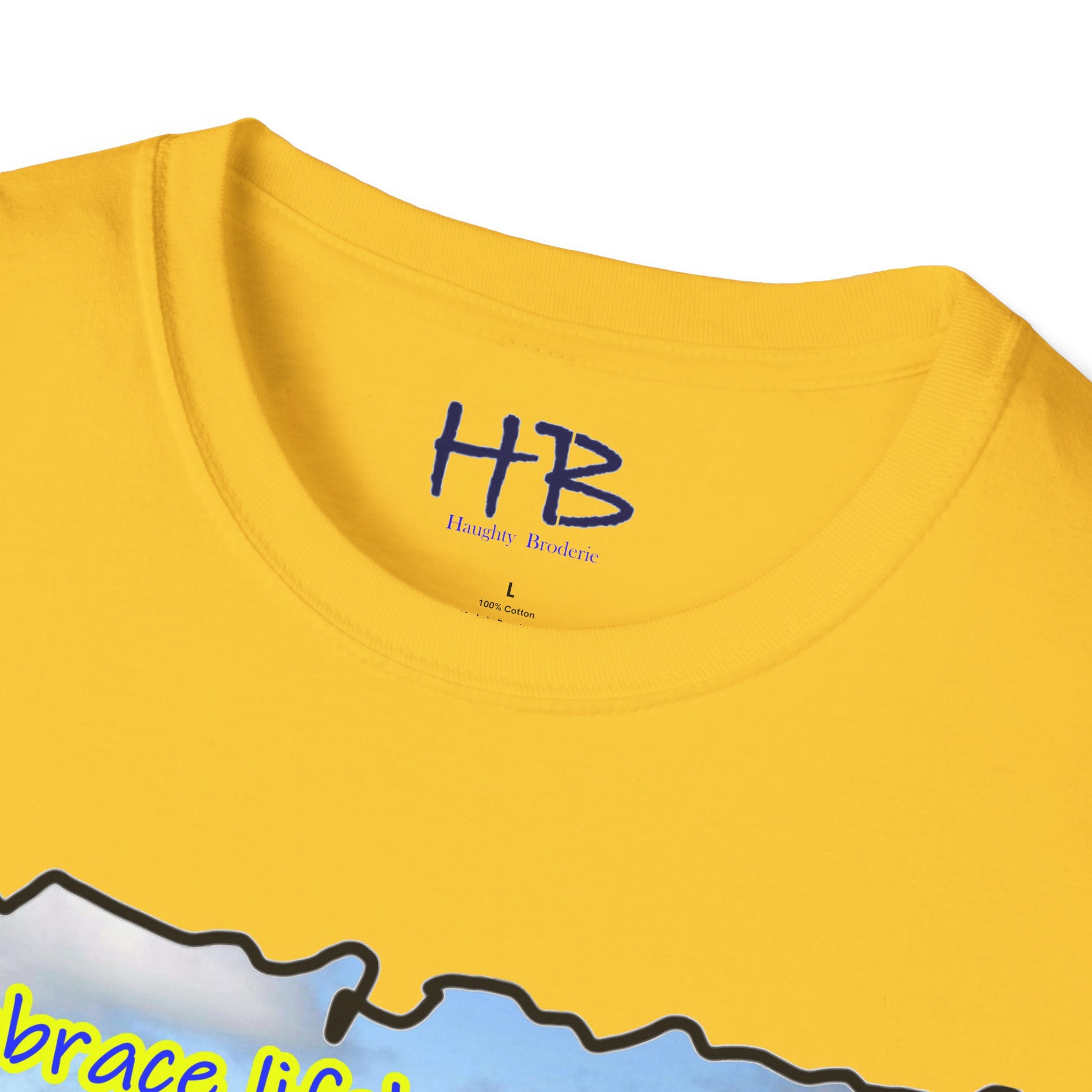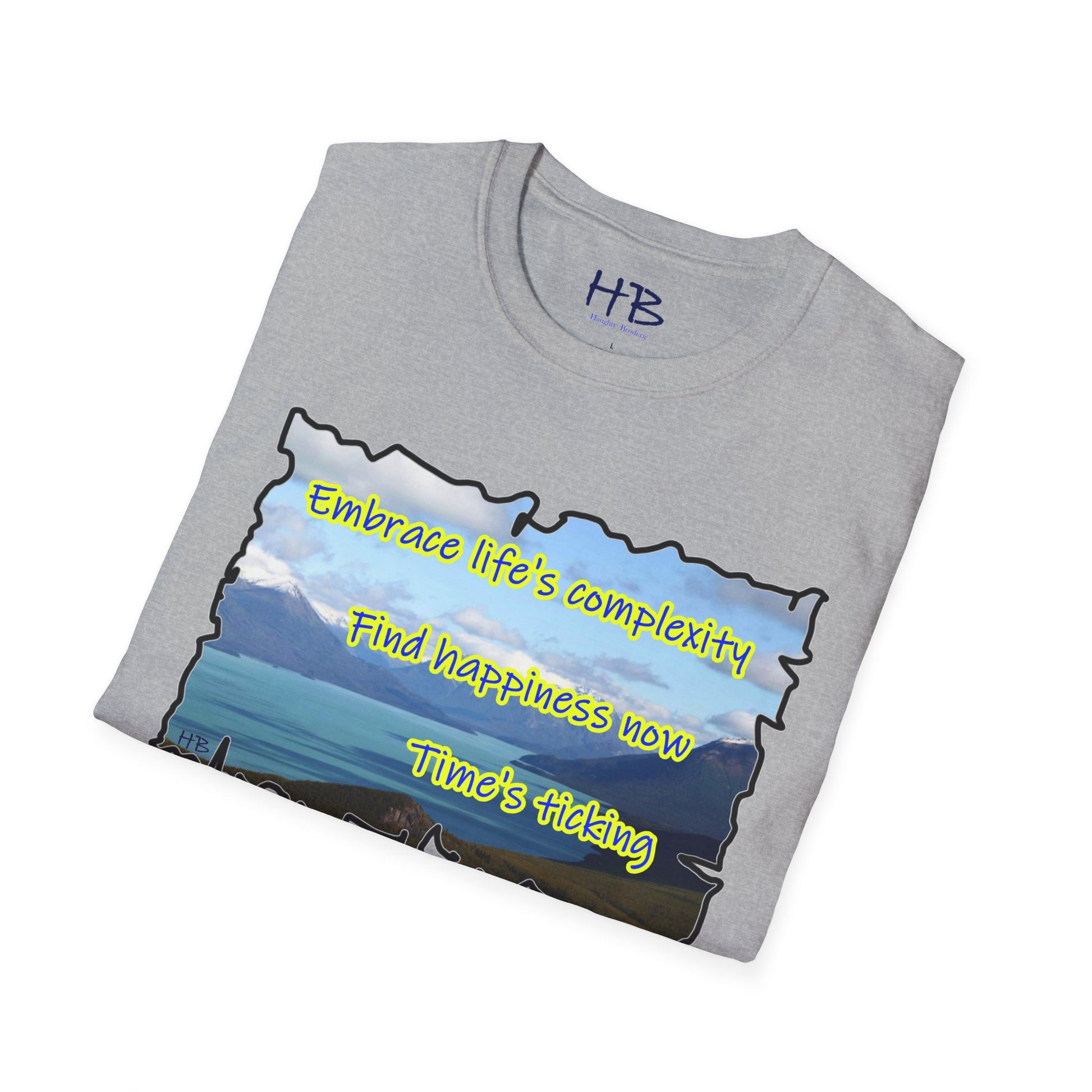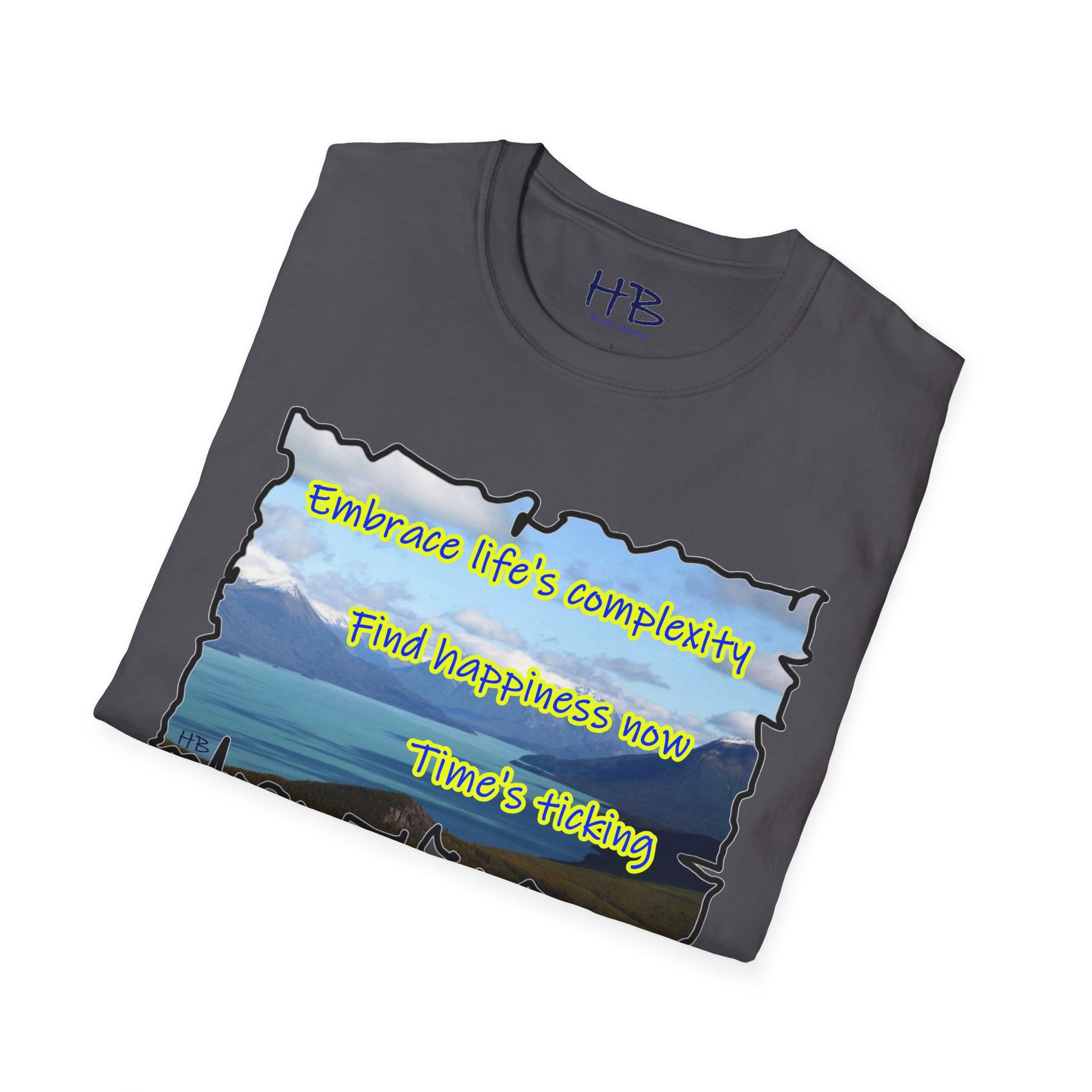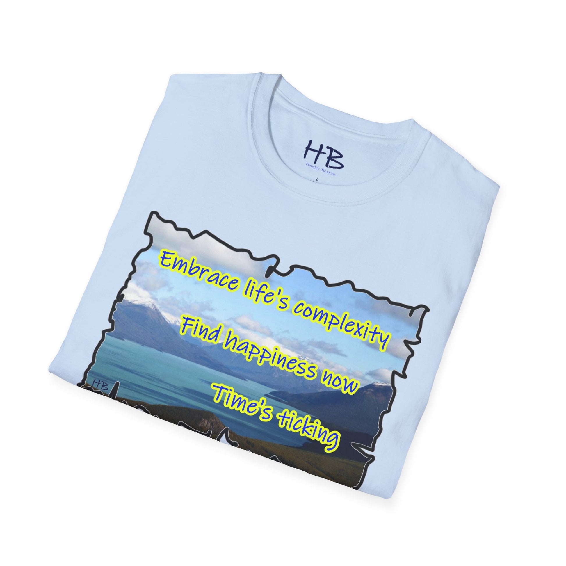 Now, let your eyes move to the thoughtfully crafted words, a timeless message that resonates: "Embrace life's complexity, find joy now, time's ticking." This isn't just a t-shirt; it’s wearable wisdom, a reminder that the beauty of life is found in the present moment. It urges you to accept life's twists and turns, without waiting for an ideal future that might never come.