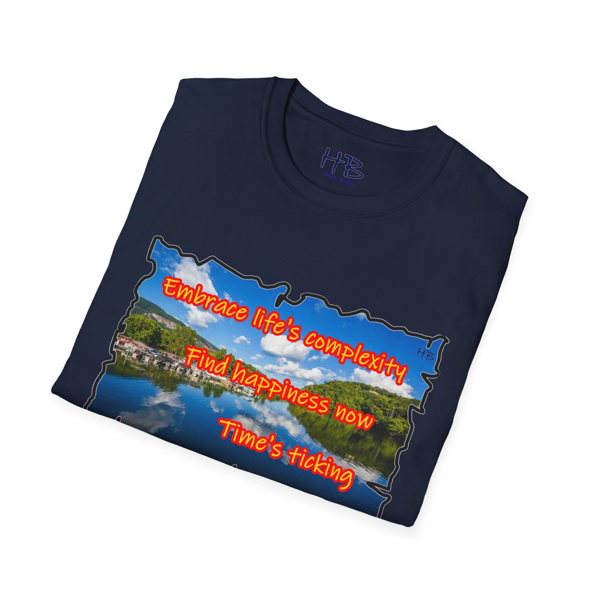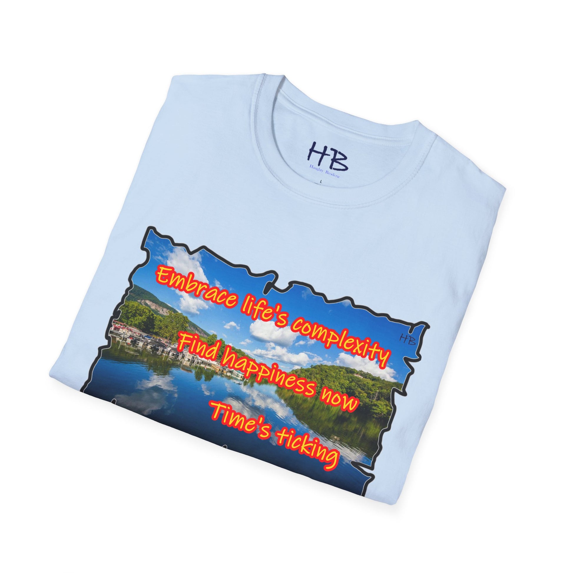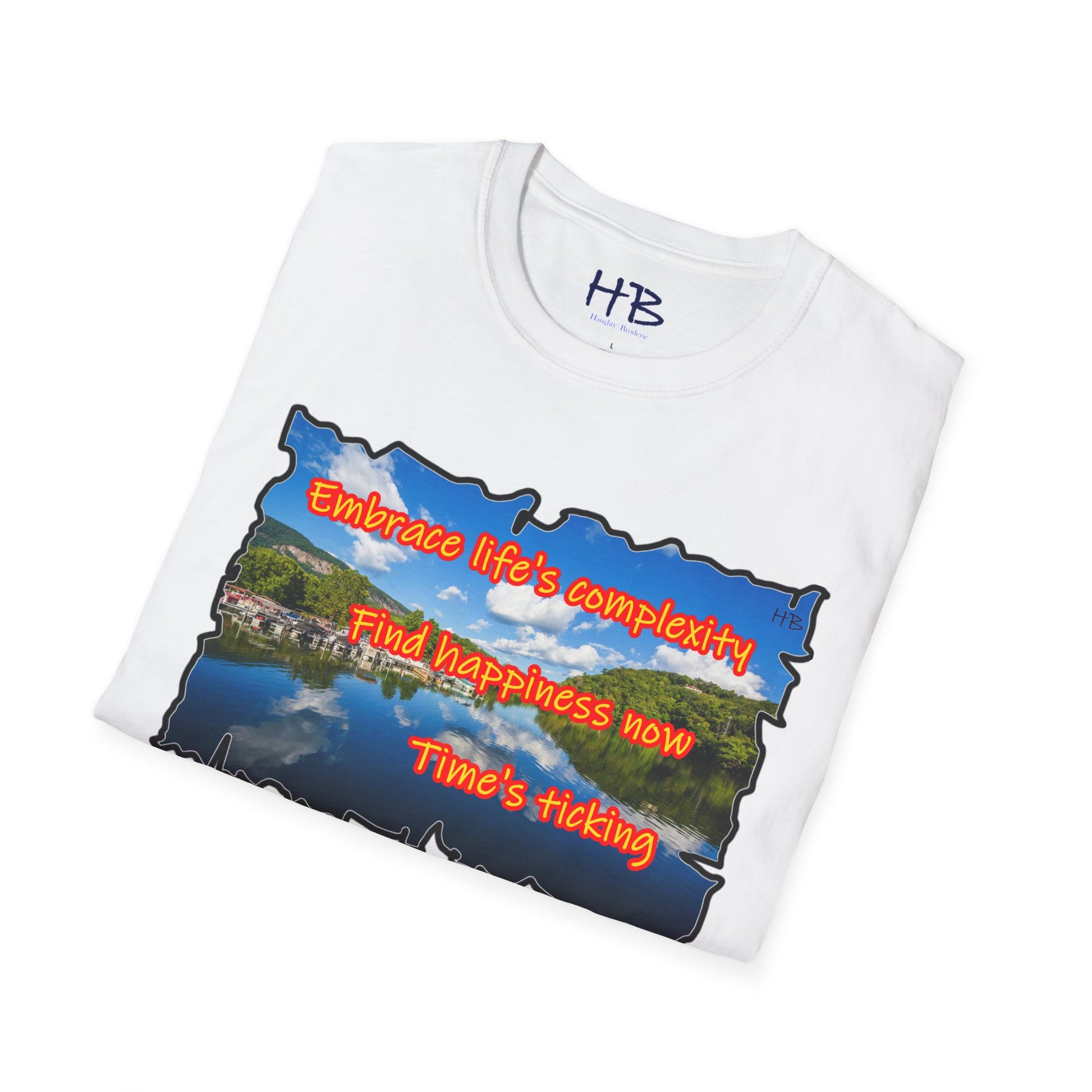 Now, let your gaze drift to the carefully scripted words, a mantra echoing through time: "Embrace life's complexity, find happiness now, time's flowing." This isn't just a t-shirt; it's a wearable philosophy, a reminder that the beauty of life unfolds in the present moment. It’s a call to embrace the intricacies of existence without waiting for an ideal future that may never come.