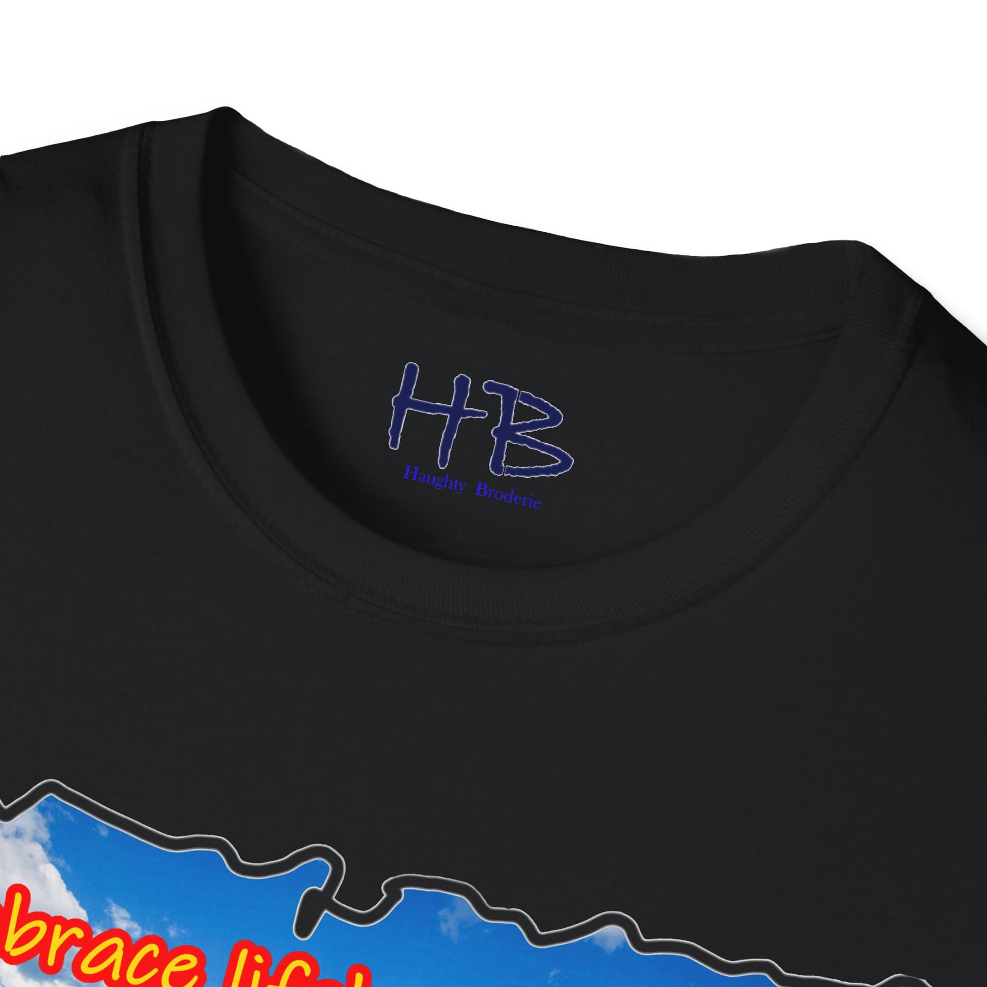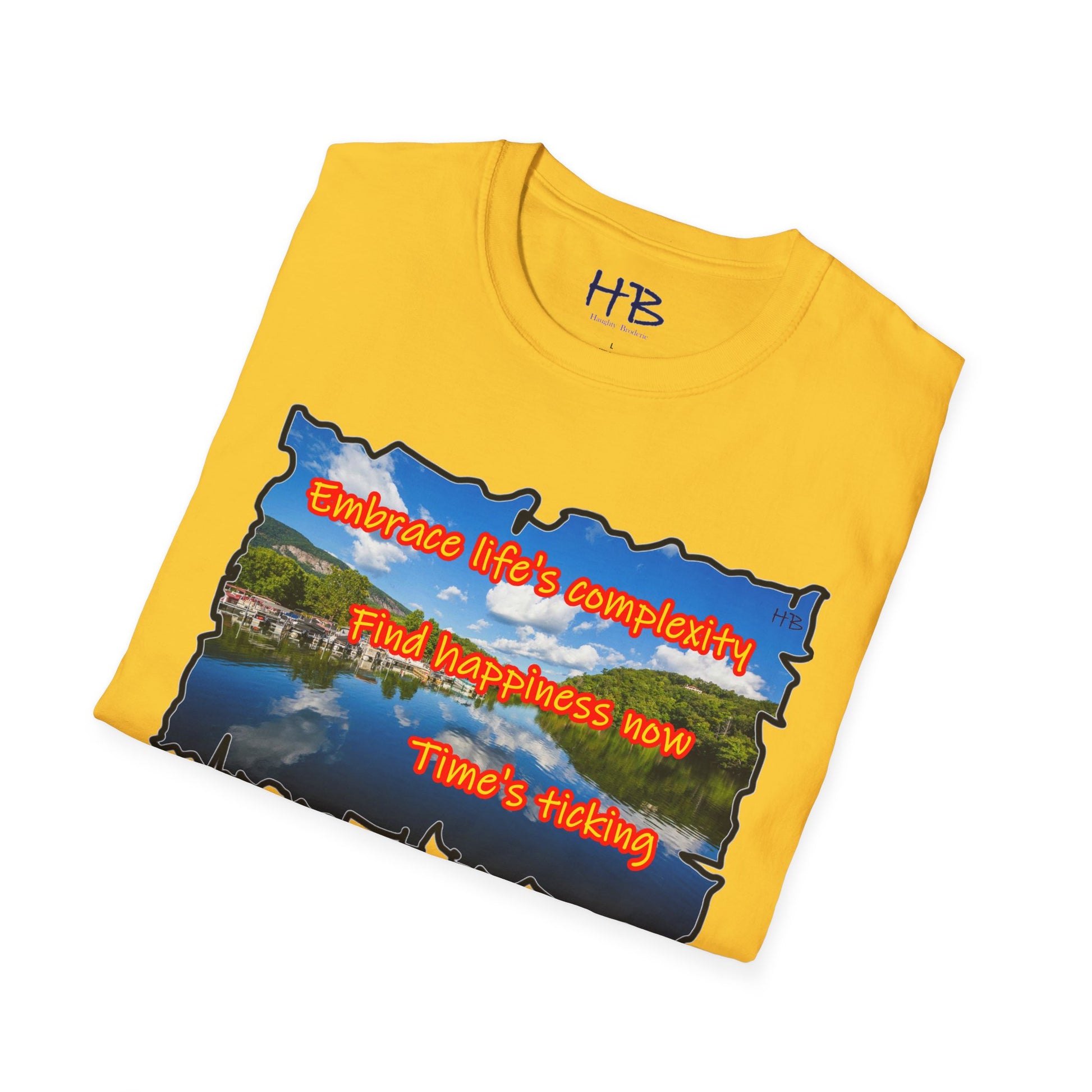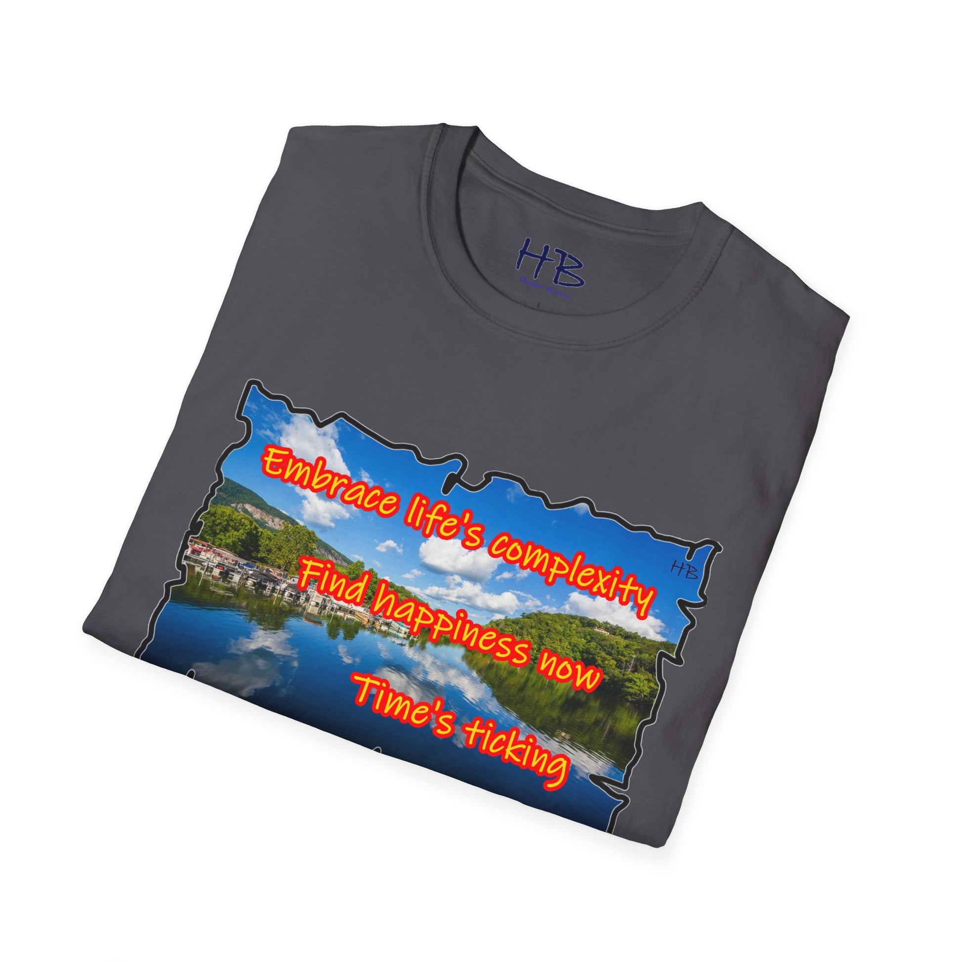 Now, let your gaze drift to the carefully scripted words, a mantra echoing through time: "Embrace life's complexity, find happiness now, time's flowing." This isn't just a t-shirt; it's a wearable philosophy, a reminder that the beauty of life unfolds in the present moment. It’s a call to embrace the intricacies of existence without waiting for an ideal future that may never come.