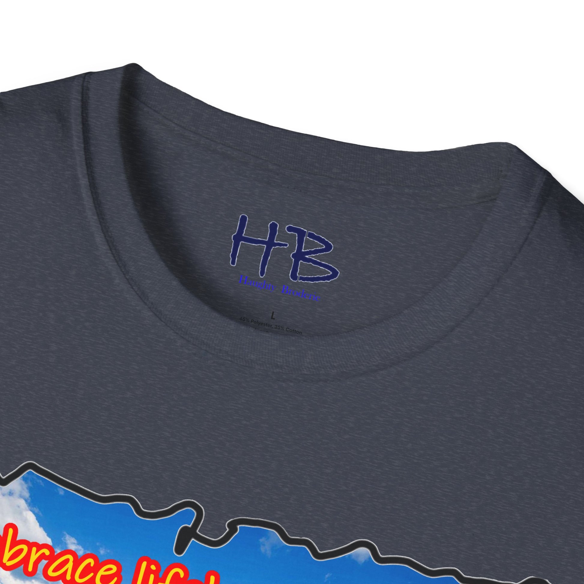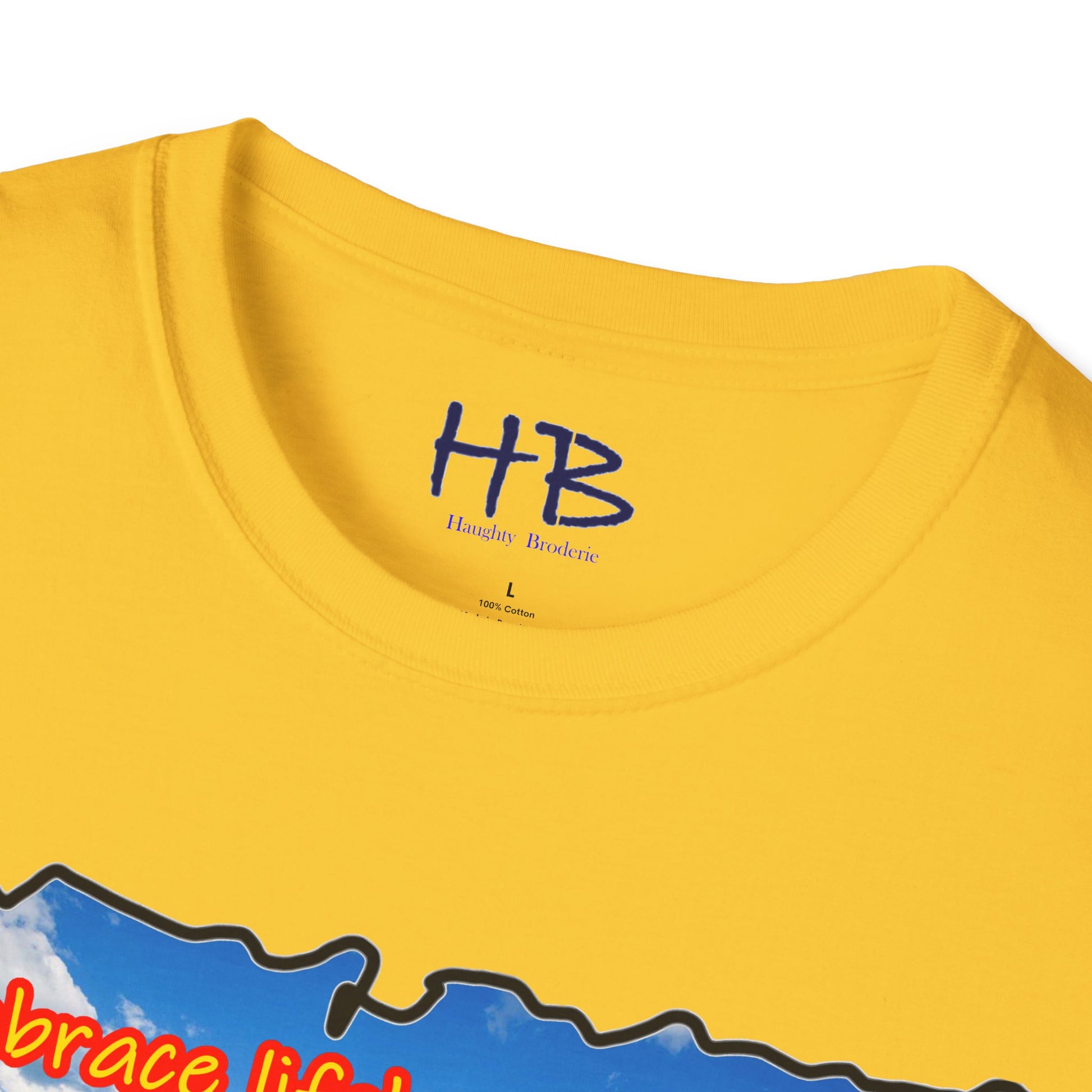Introducing our latest masterpiece of wear, a garment that transcends the mere fabric and stitches, offering a profound narrative woven into every fiber. Behold, the epitome of elegance — a picturesque tableau sprawled across the canvas of your chest. Picture this: a serene lake, its waters yearning to touch lush, grassy land adorned with trees. In the backdrop, towering mountains rise against a sky painted with fluffy clouds. Nature's harmony captured in a single glance.