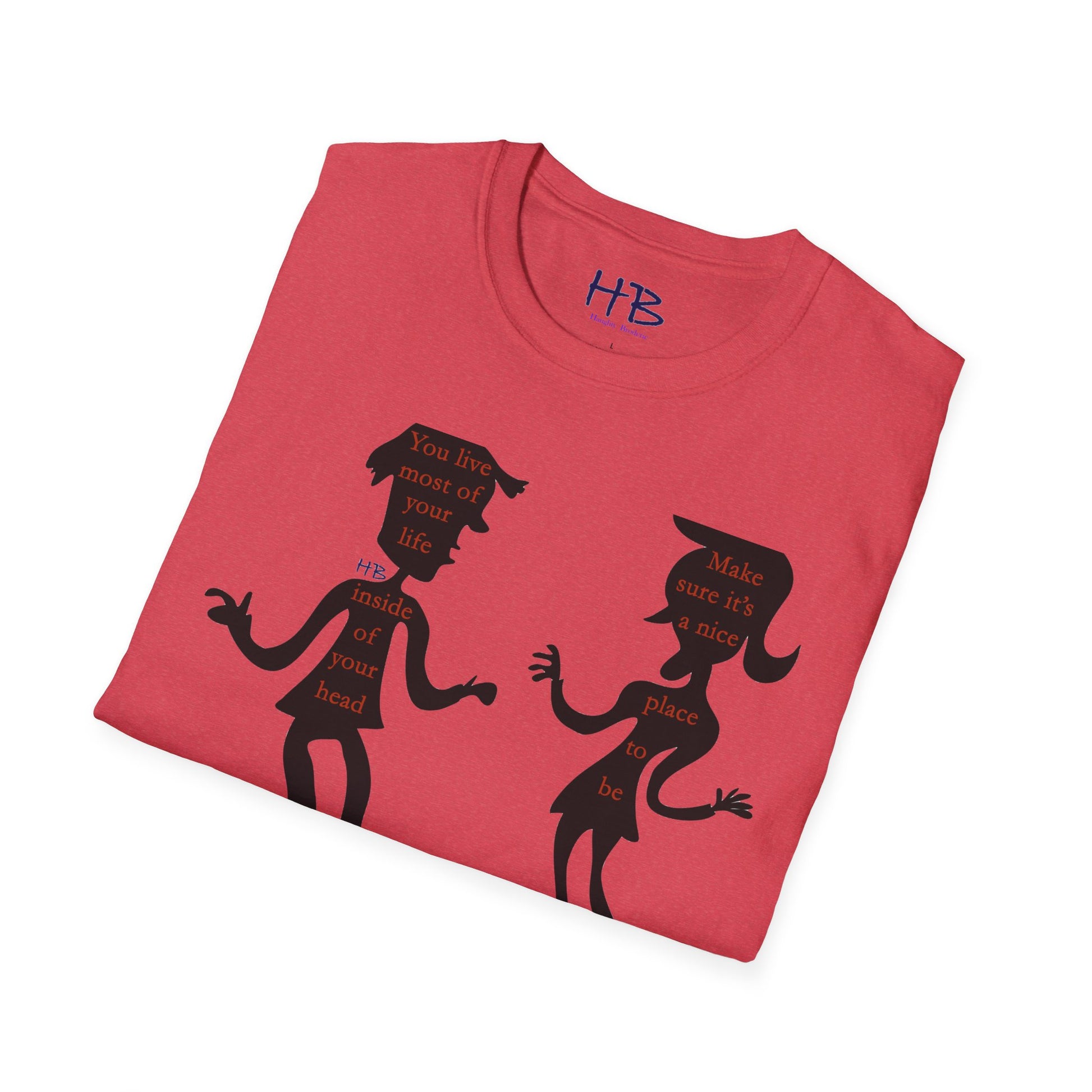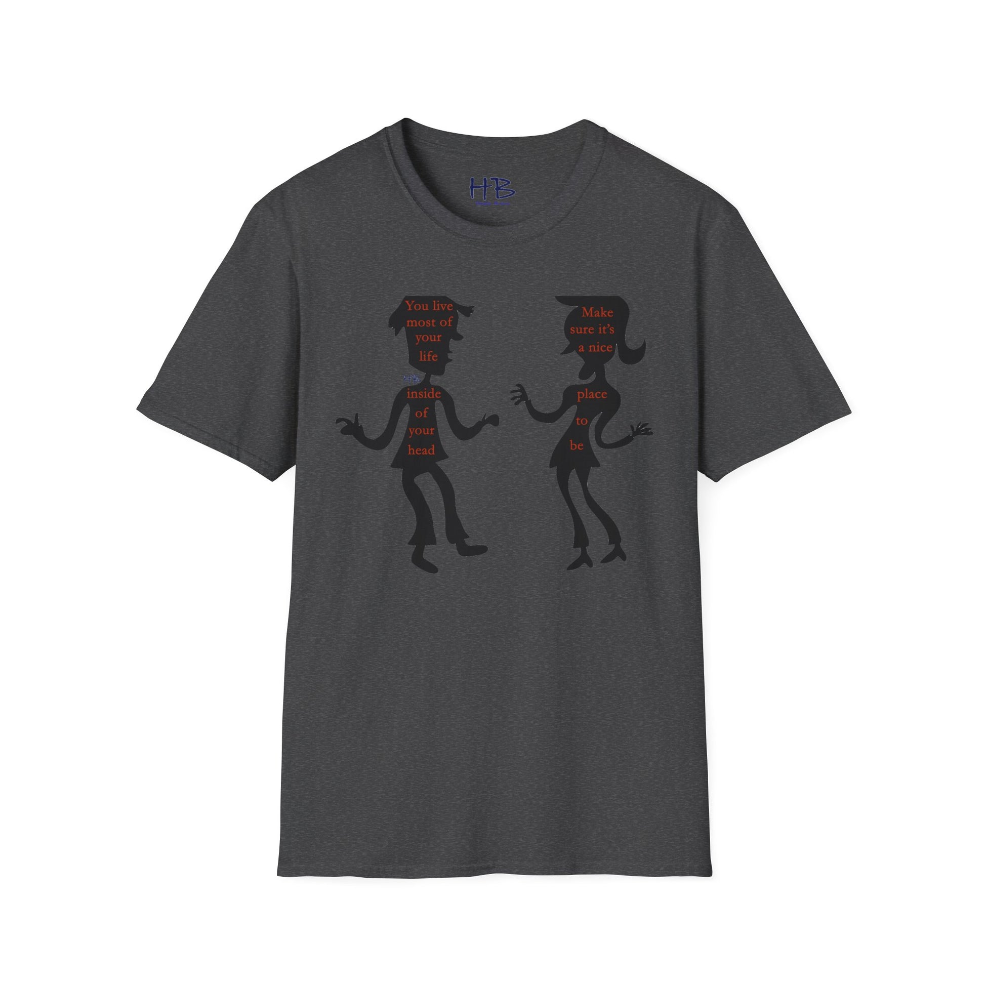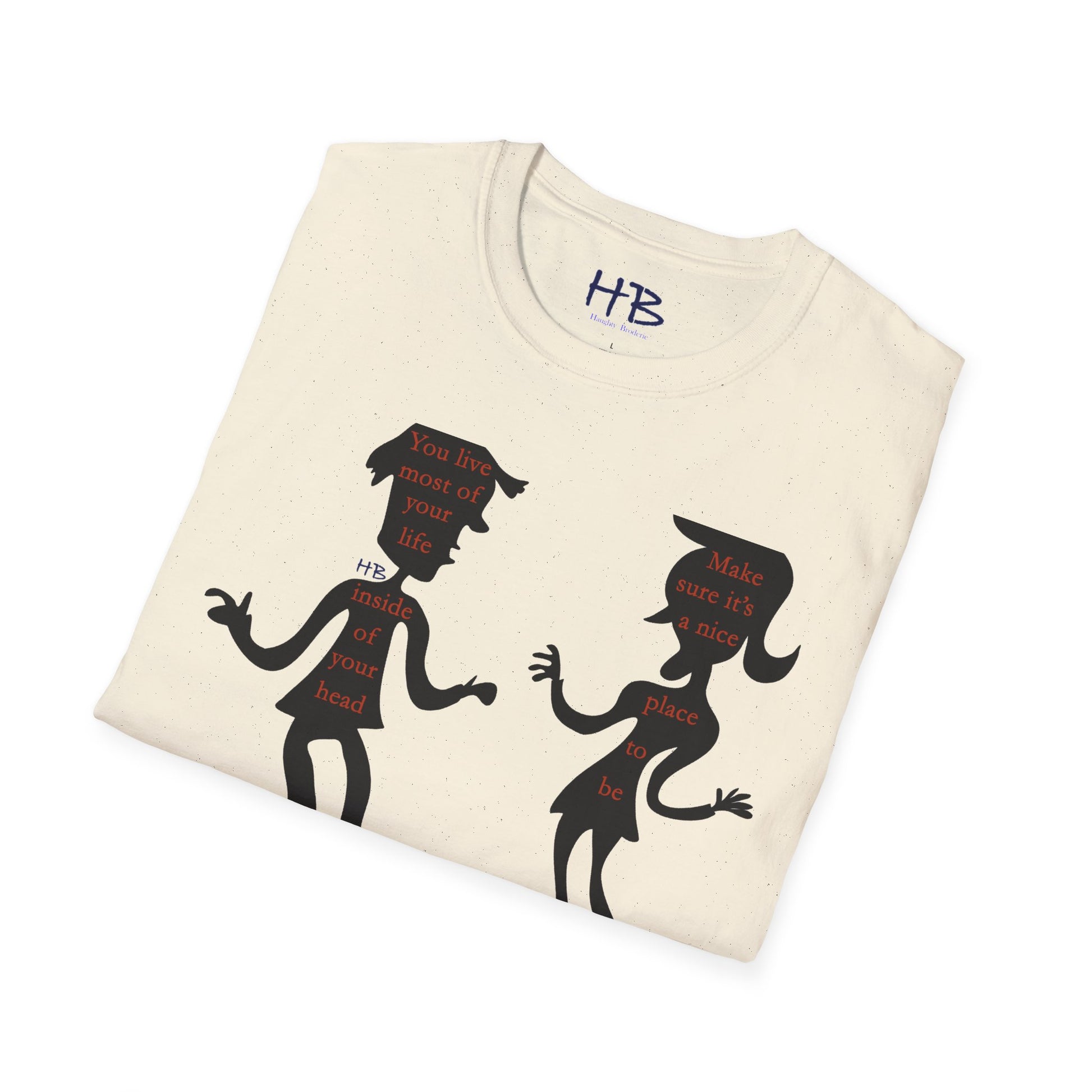 Introducing our latest tee shirt featuring a captivating image depicting two human outlines - one male and one female - both appearing to relish a blissful moment. This design is perfect for those who are seeking to uplift their mindset and cherish their mental well-being.