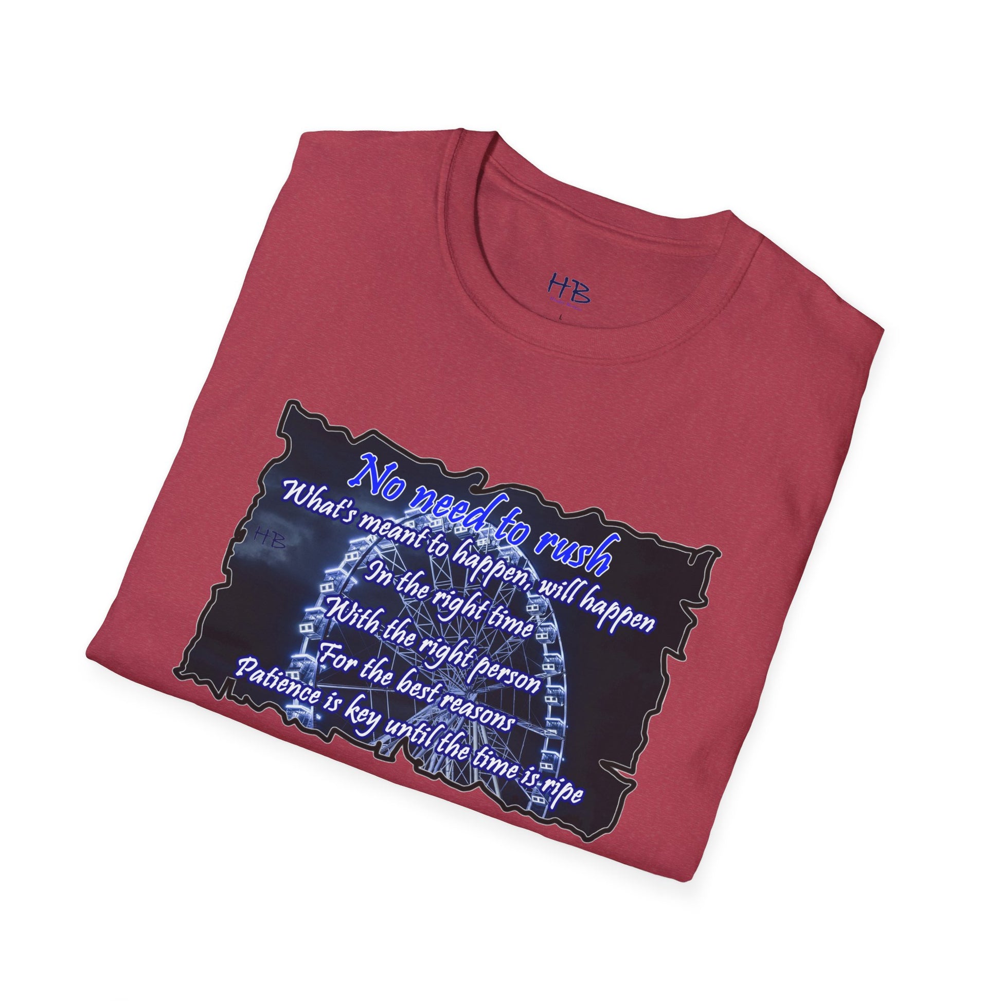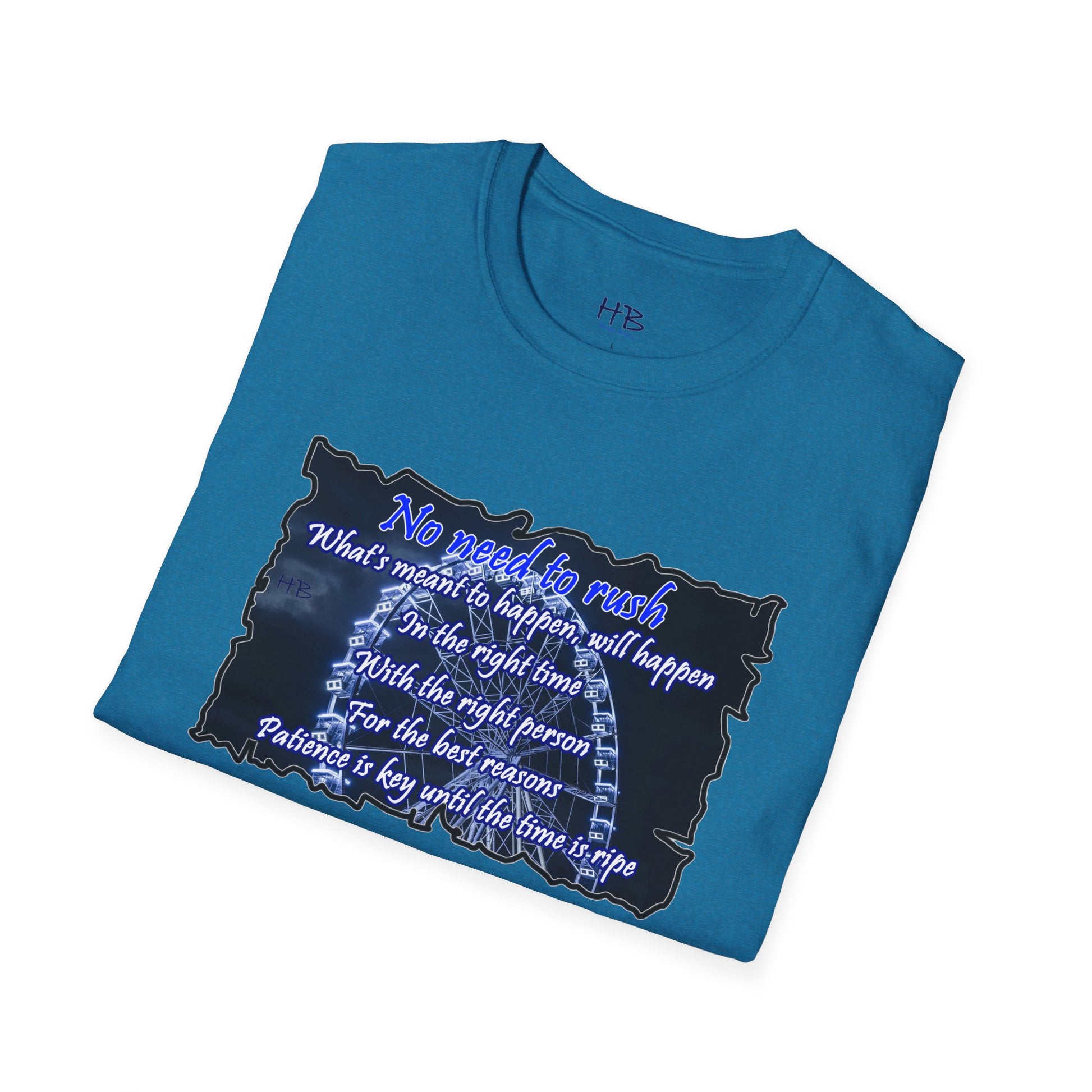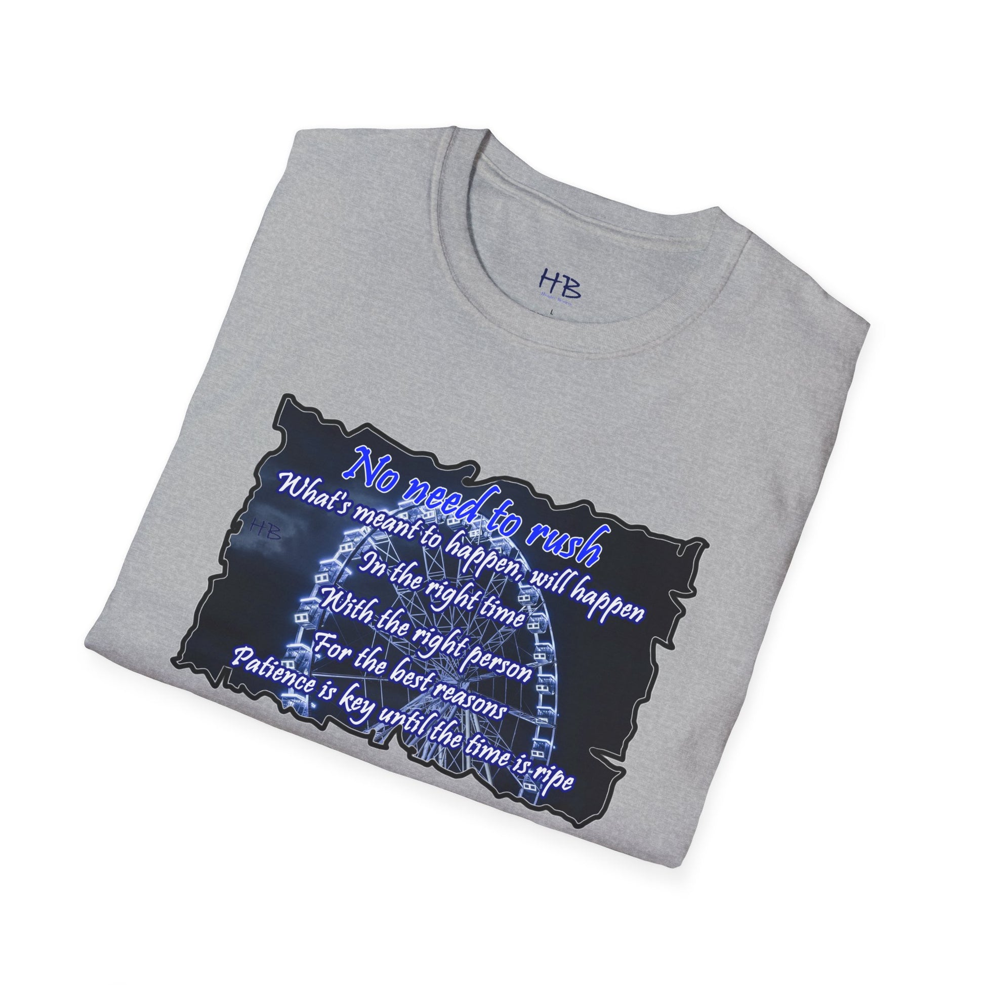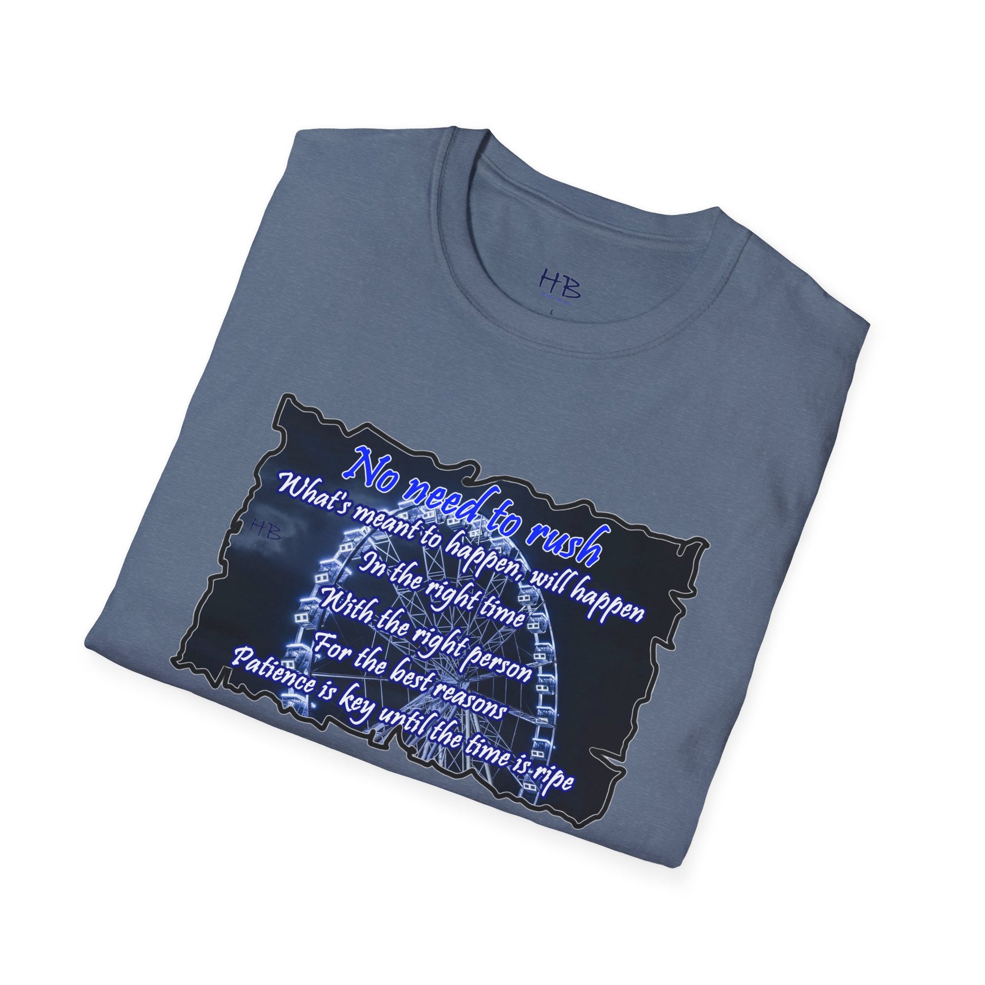 Emblazoned with a message centered around the virtues of patience and timing, our tee shirt beautifully conveys the sentiment "No need to rush", underscoring the importance of allowing events to unfold organically in their own time. The Ferris wheel serves as a poignant symbol of this concept, as it revolves continuously, ultimately arriving at its destination when the timing is perfect.