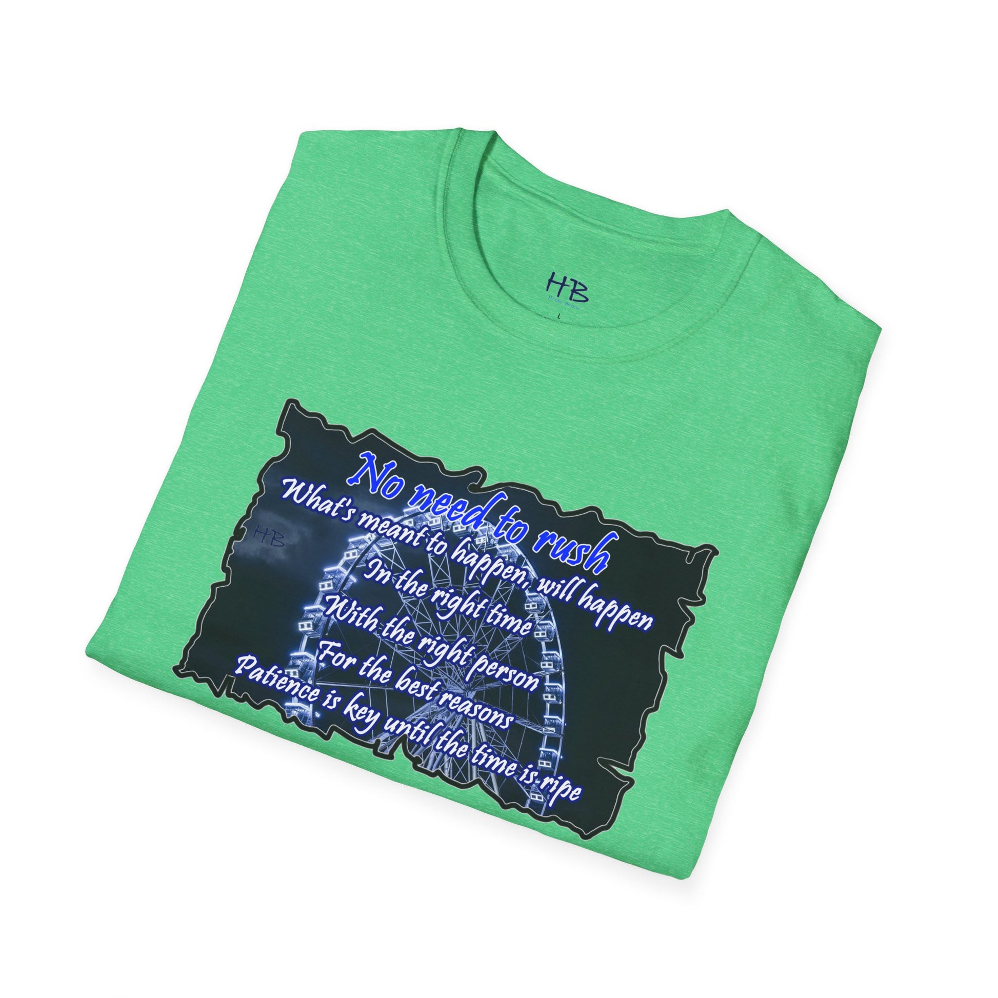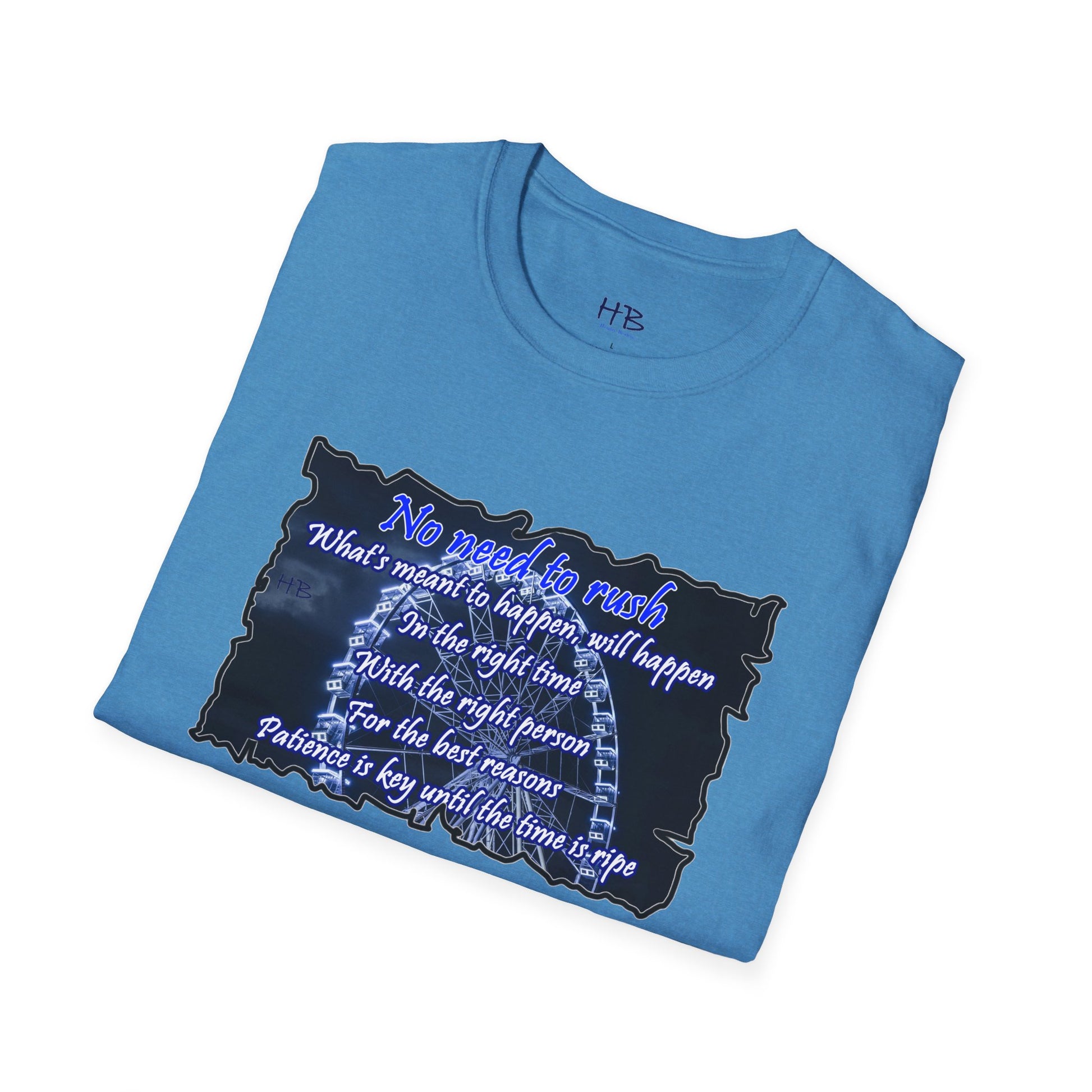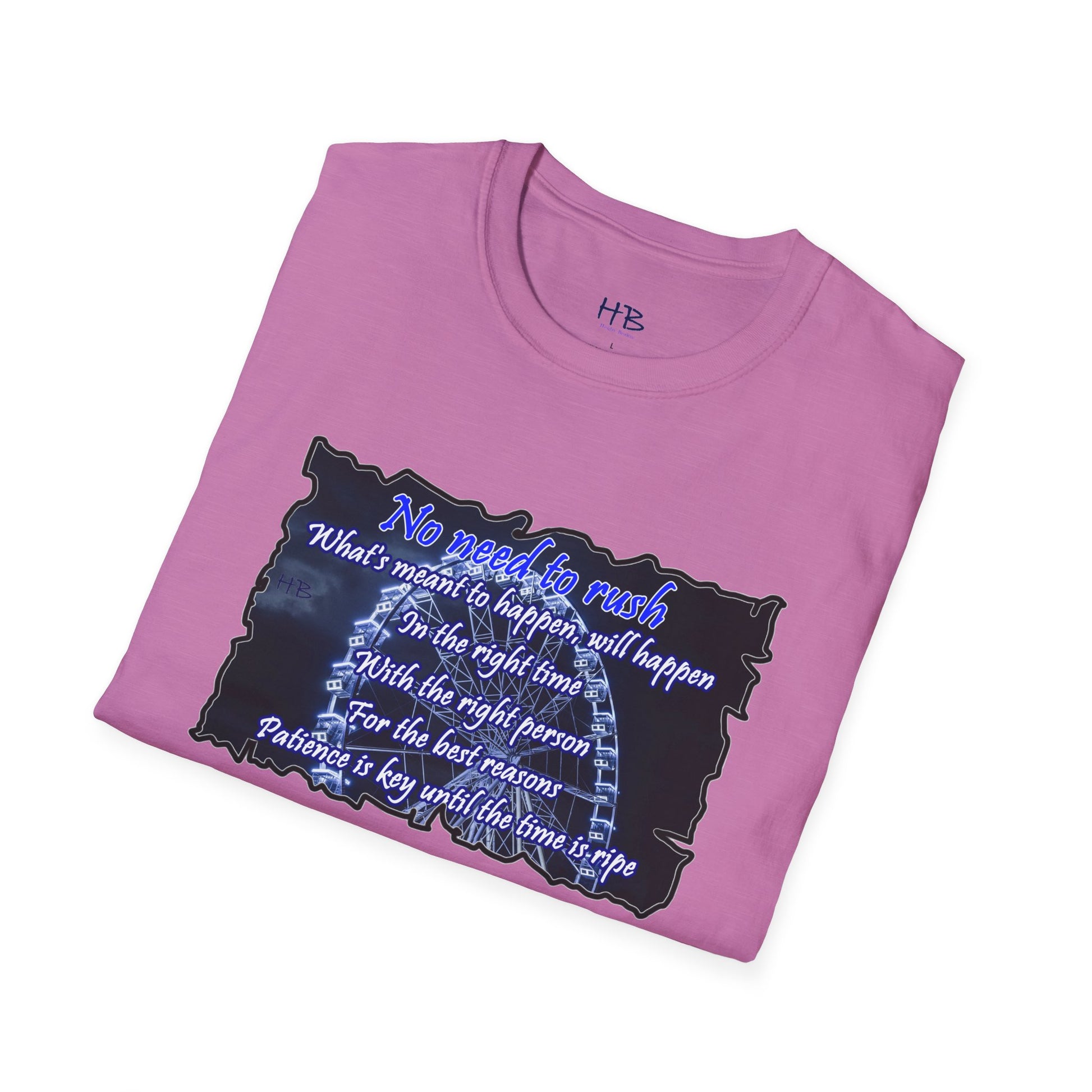 Emblazoned with a message centered around the virtues of patience and timing, our tee shirt beautifully conveys the sentiment "No need to rush", underscoring the importance of allowing events to unfold organically in their own time. The Ferris wheel serves as a poignant symbol of this concept, as it revolves continuously, ultimately arriving at its destination when the timing is perfect.