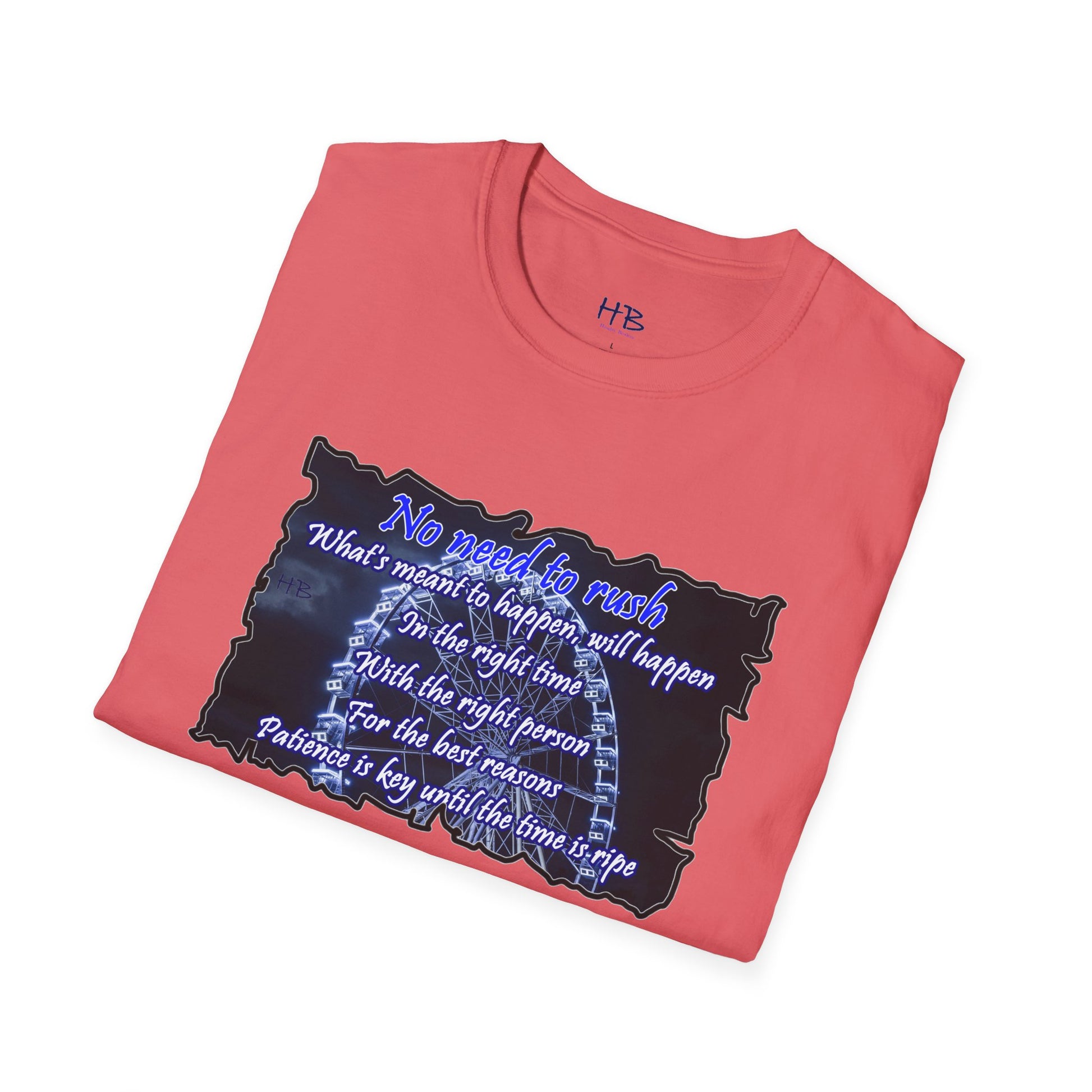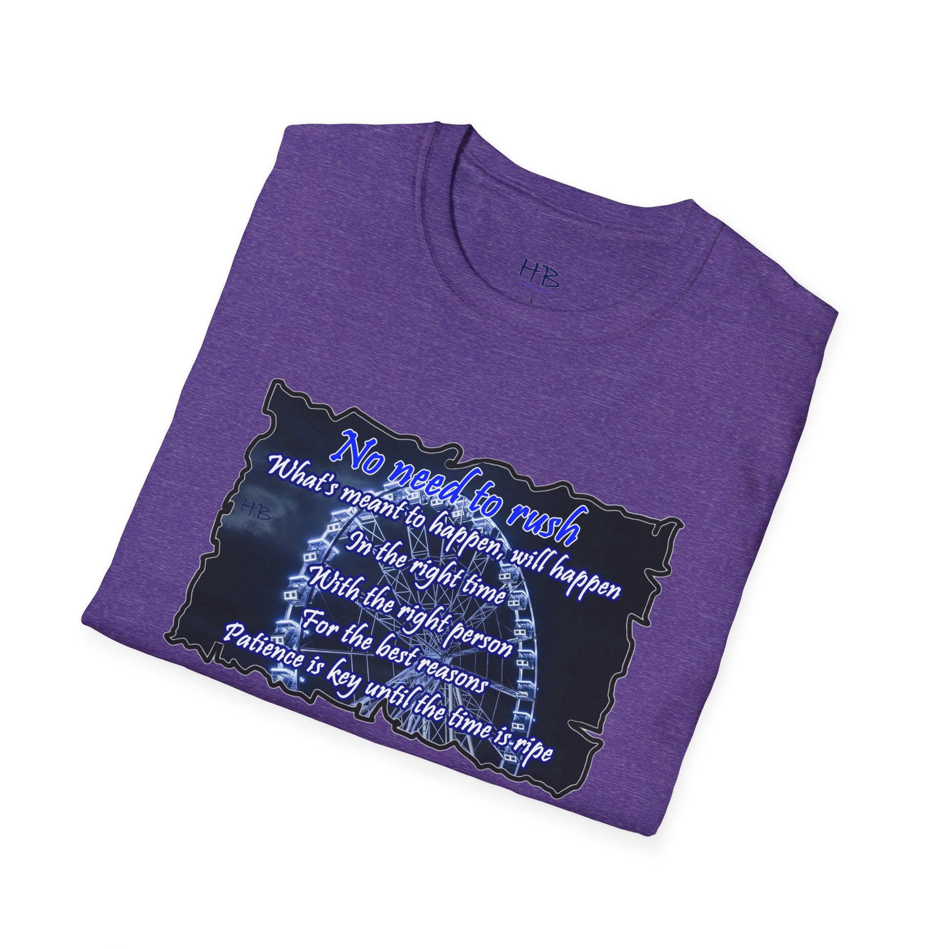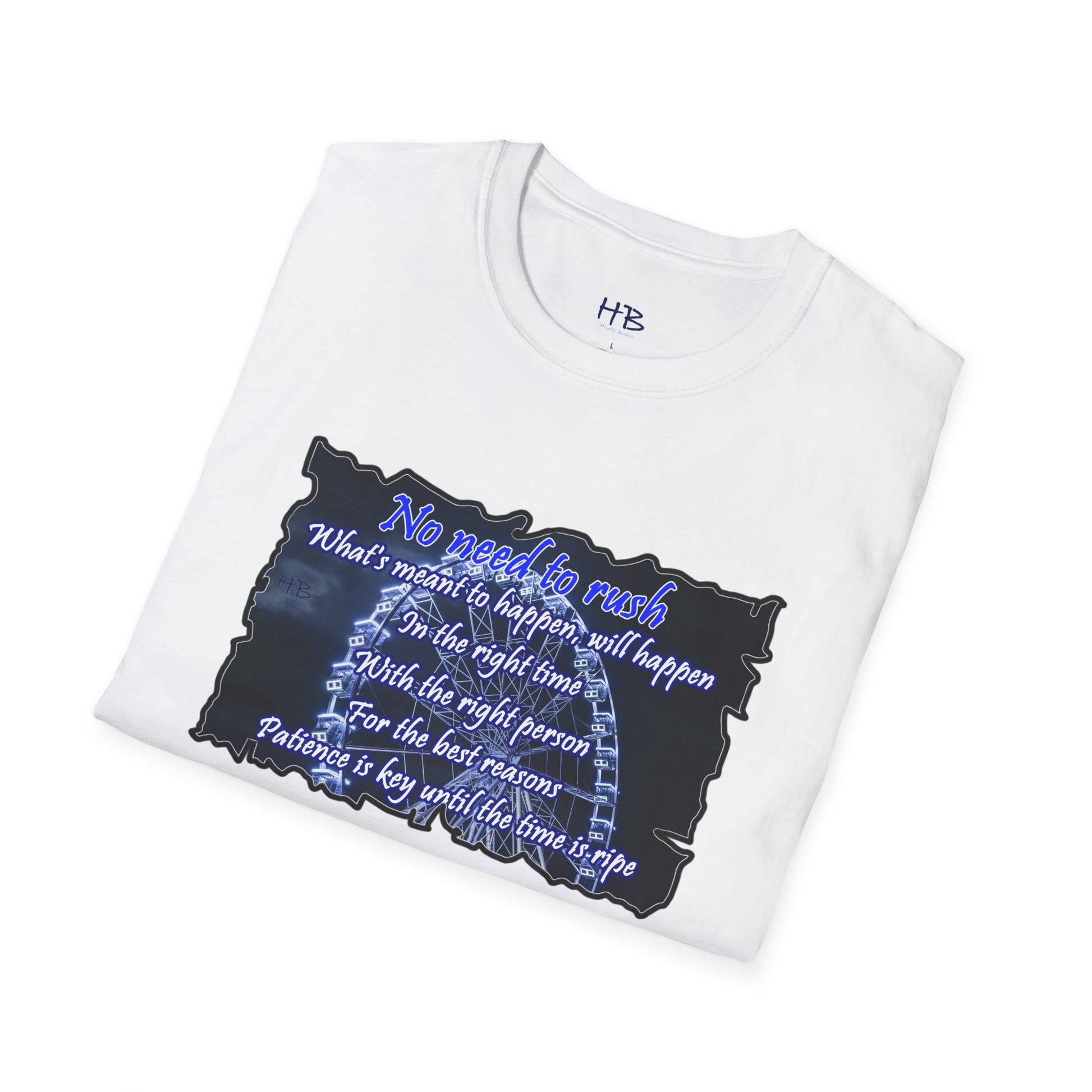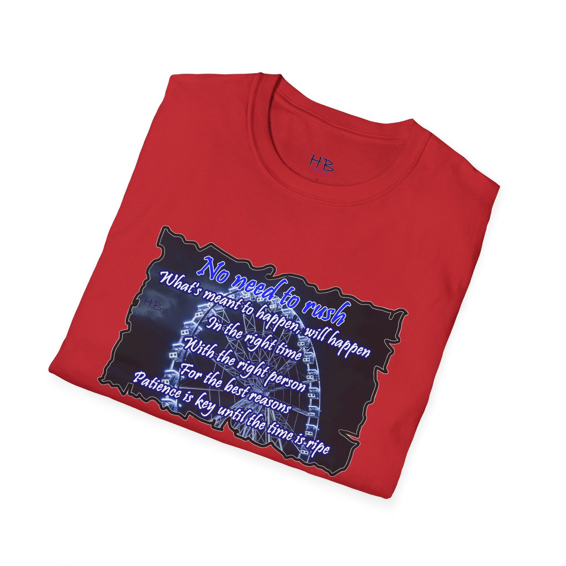 Emblazoned with a message centered around the virtues of patience and timing, our tee shirt beautifully conveys the sentiment "No need to rush", underscoring the importance of allowing events to unfold organically in their own time. The Ferris wheel serves as a poignant symbol of this concept, as it revolves continuously, ultimately arriving at its destination when the timing is perfect.