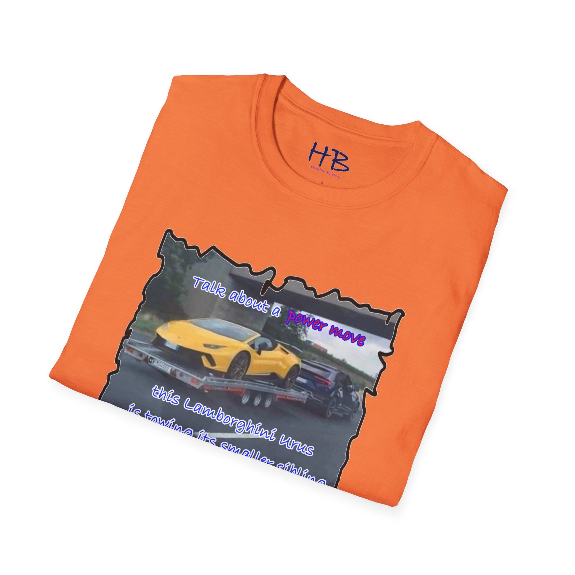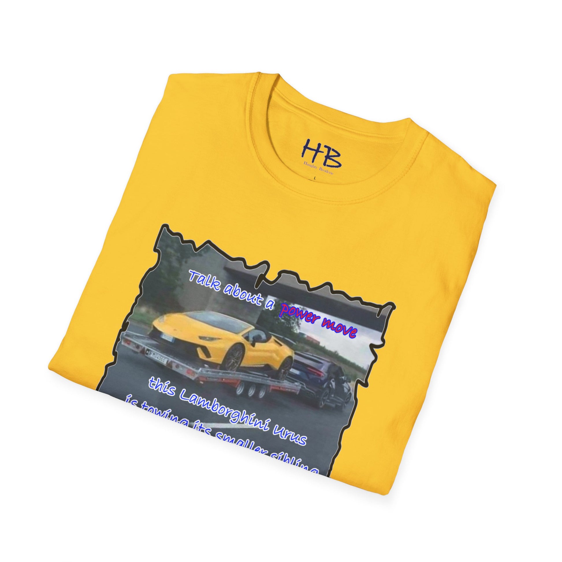 Introducing a remarkable tee shirt that features a stunning image captured by a passing driver, showcasing a Lamborghini Urus exhibiting its dominance by towing its smaller sibling Aventador on a flat bed over the highway. The text boldly declares, "What a power move!" as this luxurious vehicle confidently takes control of the road, flaunting its strength and authority. This tee shirt is perfect for car enthusiasts and anyone who appreciates the beauty and power of Lamborghini. It's made from high-quality materials that are soft and comfortable to wear, ensuring that you'll look and feel great while wearing it. So, if you want to show off your passion for Lamborghini and make a statement wherever you go, this tee shirt is the perfect choice for you. Order yours today and join the ranks of those who appreciate the thrill of the open road and the power of this magnificent supercar vehicle.