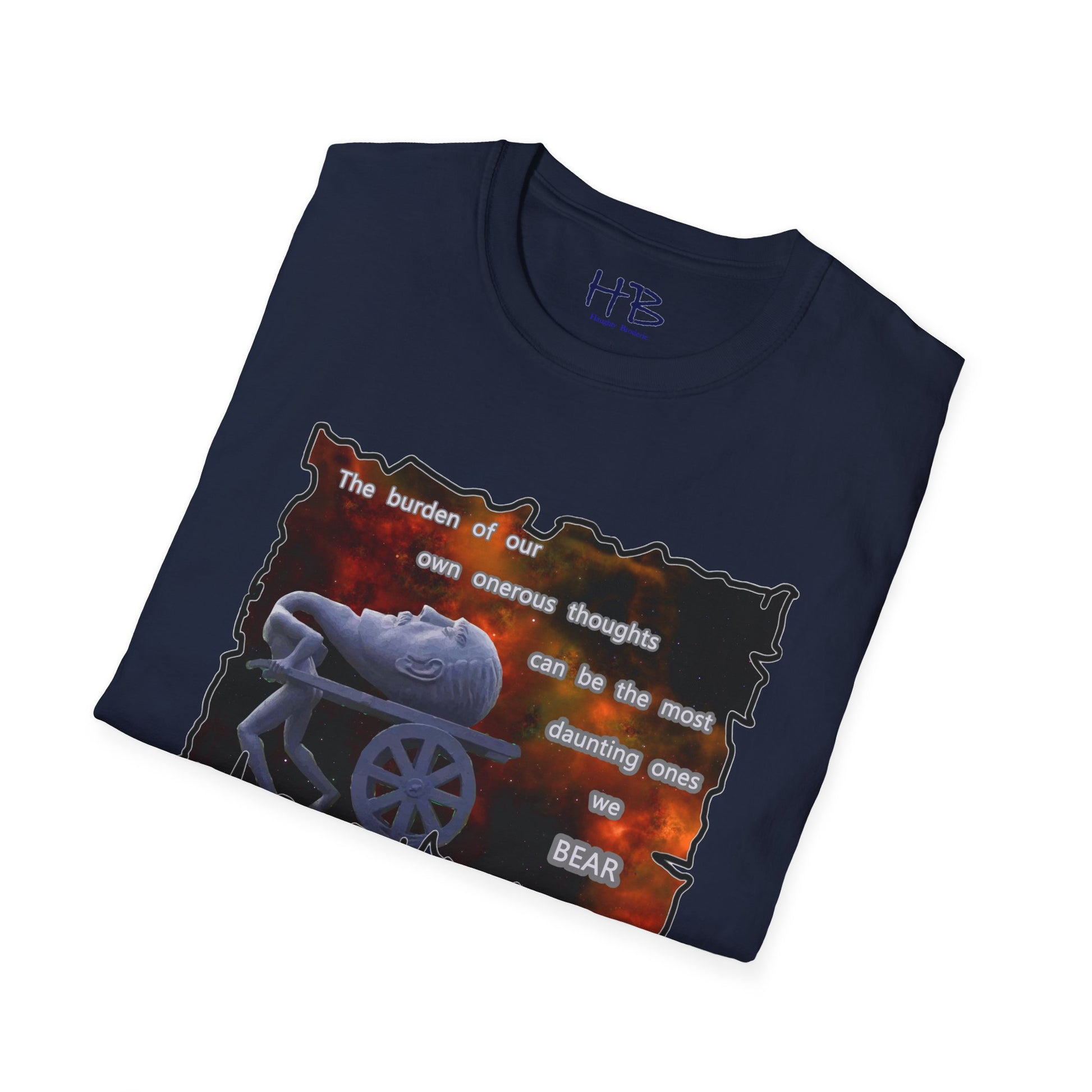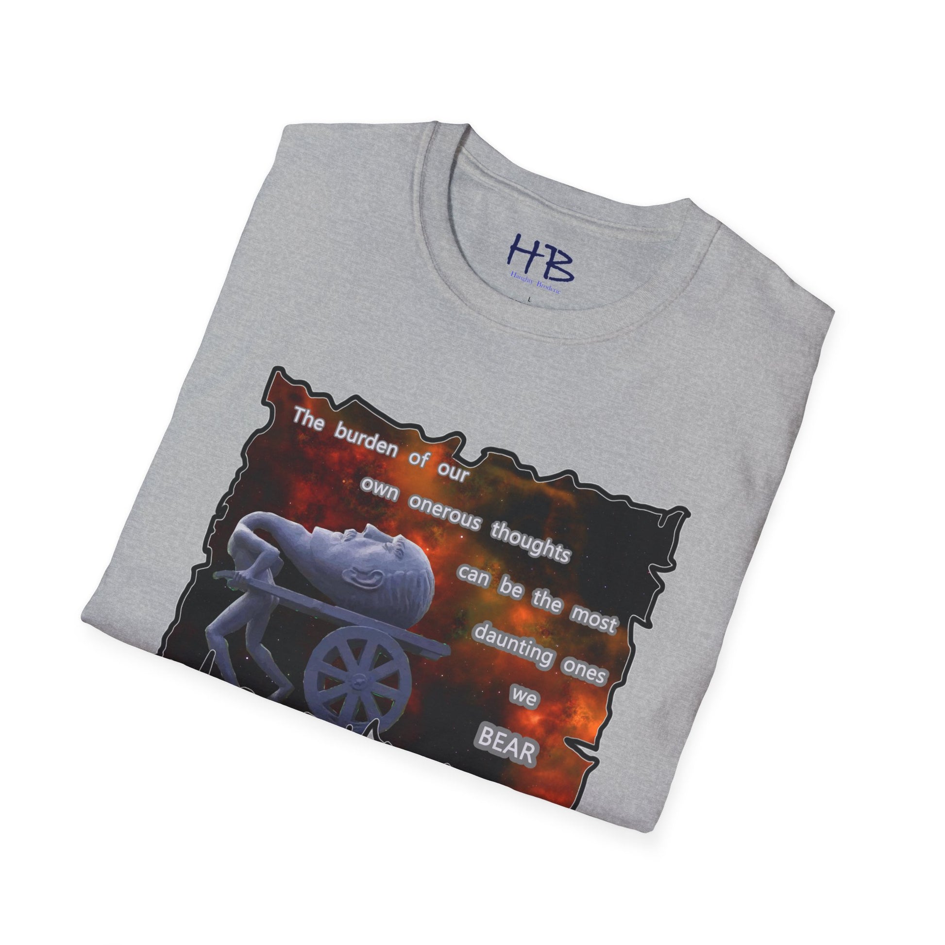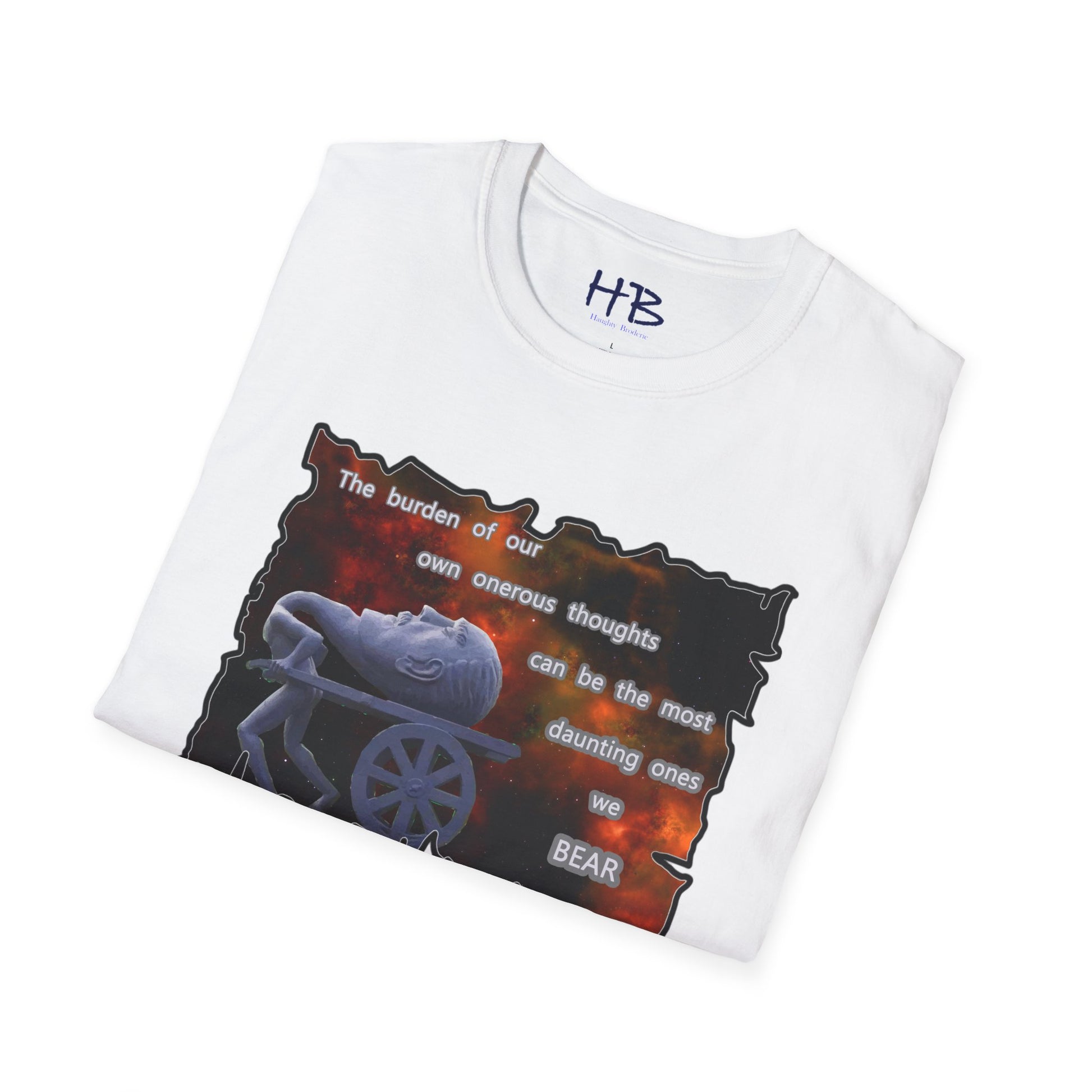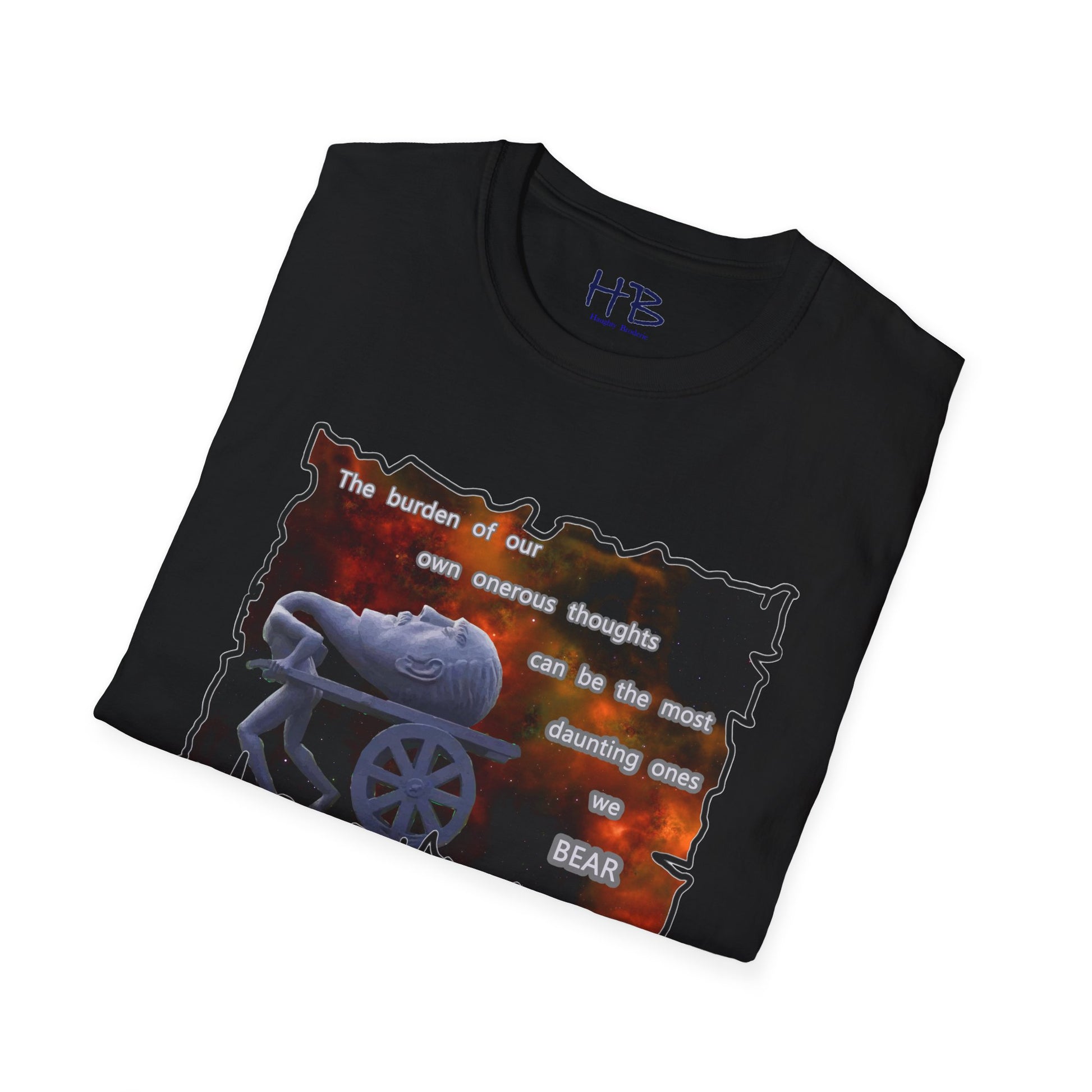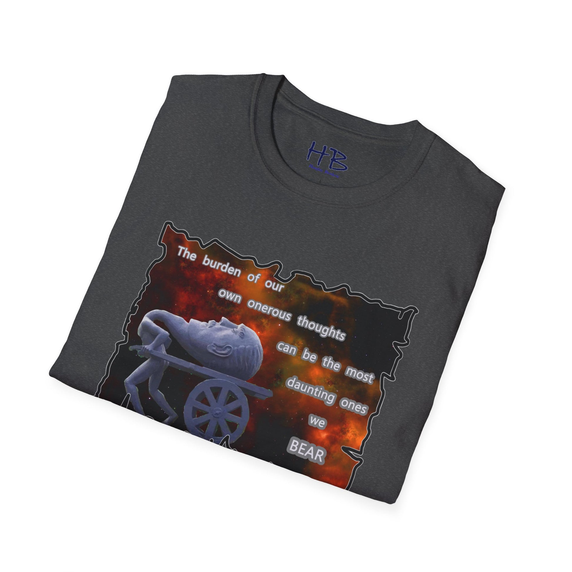 Introducing our latest creation, a garment that embodies the weight of our inner struggles and the resilience to overcome them - the ultimate expression of personal strength and determination. Imagine a shirt that carries the weight of your deepest thoughts and challenges, yet propels you forward with unwavering resolve. Behold a powerful symbol that depicts a stone head atop a trolley, symbolizing the burdens we carry and the journey we undertake to overcome them.