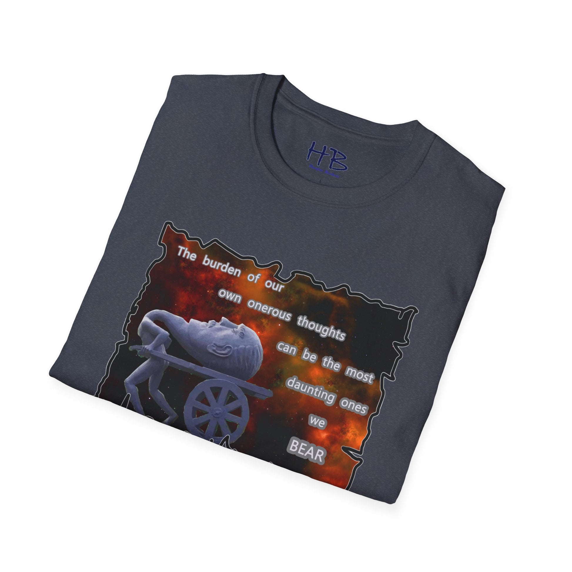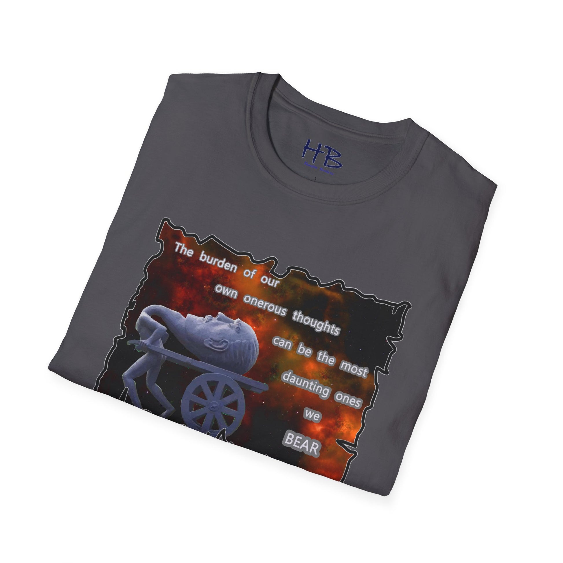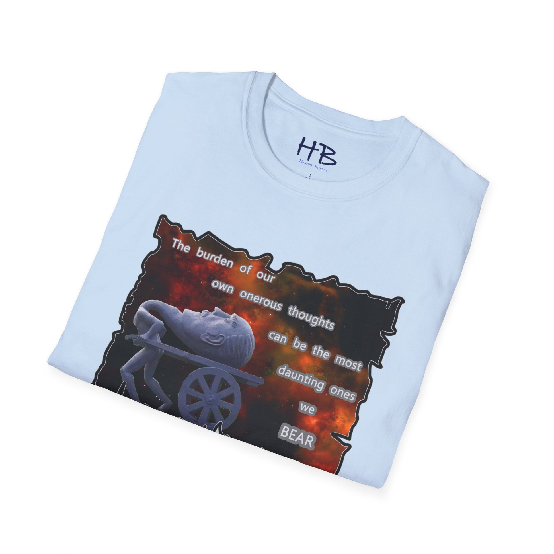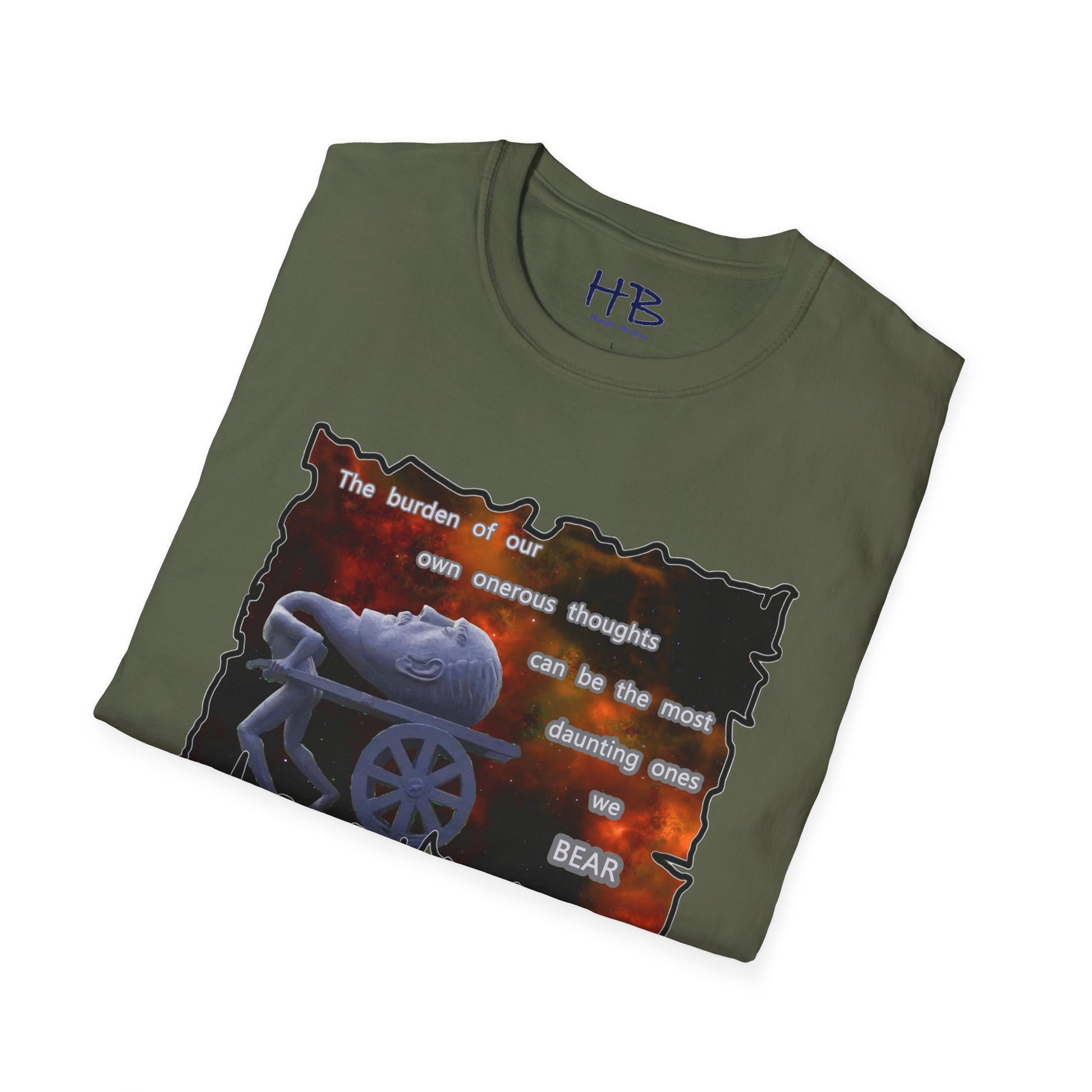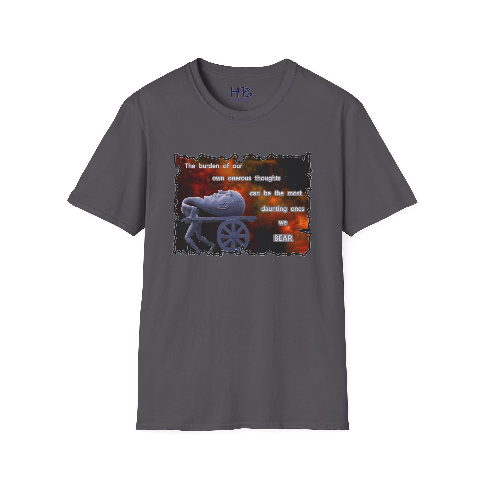 Introducing our latest creation, a garment that embodies the weight of our inner struggles and the resilience to overcome them - the ultimate expression of personal strength and determination. Imagine a shirt that carries the weight of your deepest thoughts and challenges, yet propels you forward with unwavering resolve. Behold a powerful symbol that depicts a stone head atop a trolley, symbolizing the burdens we carry and the journey we undertake to overcome them.