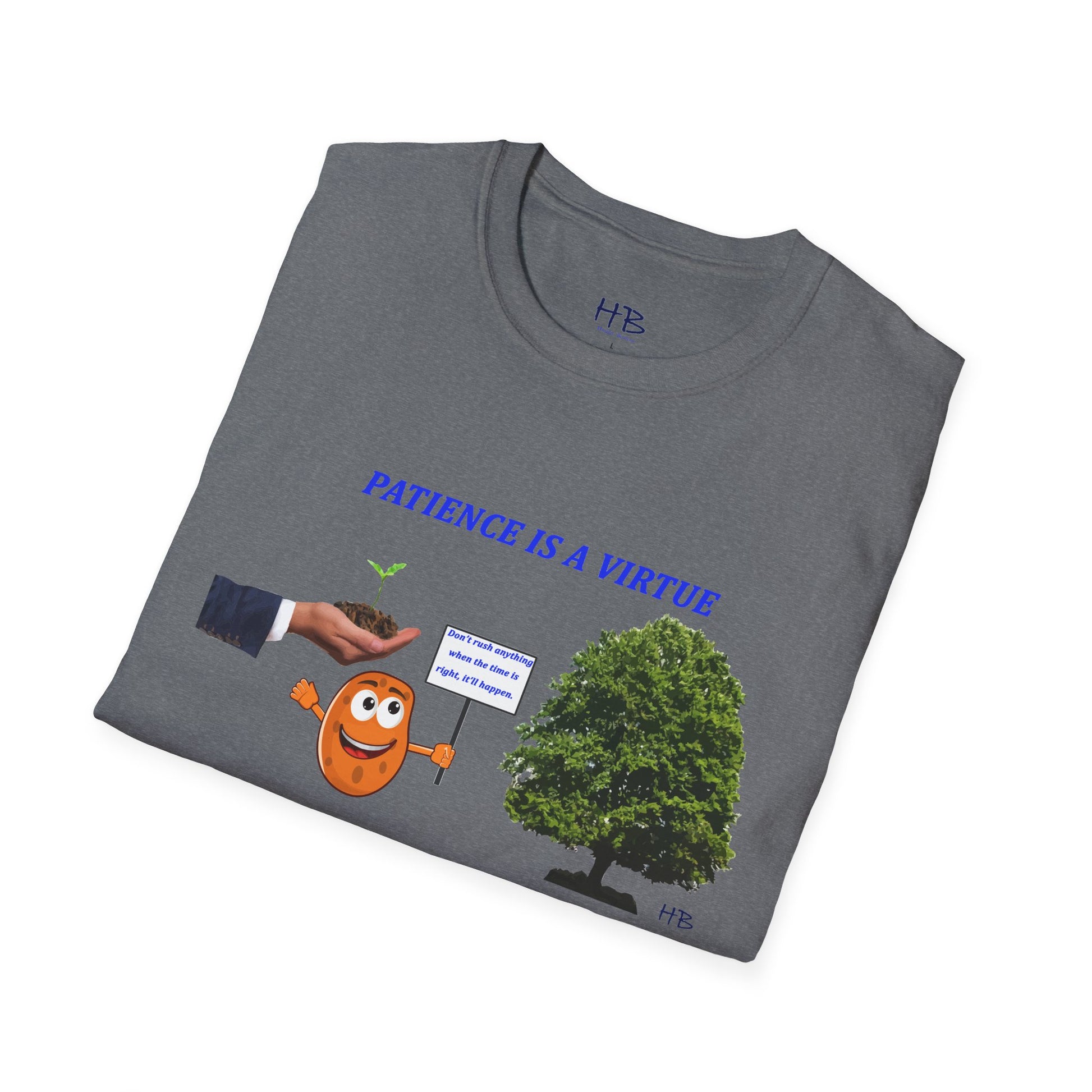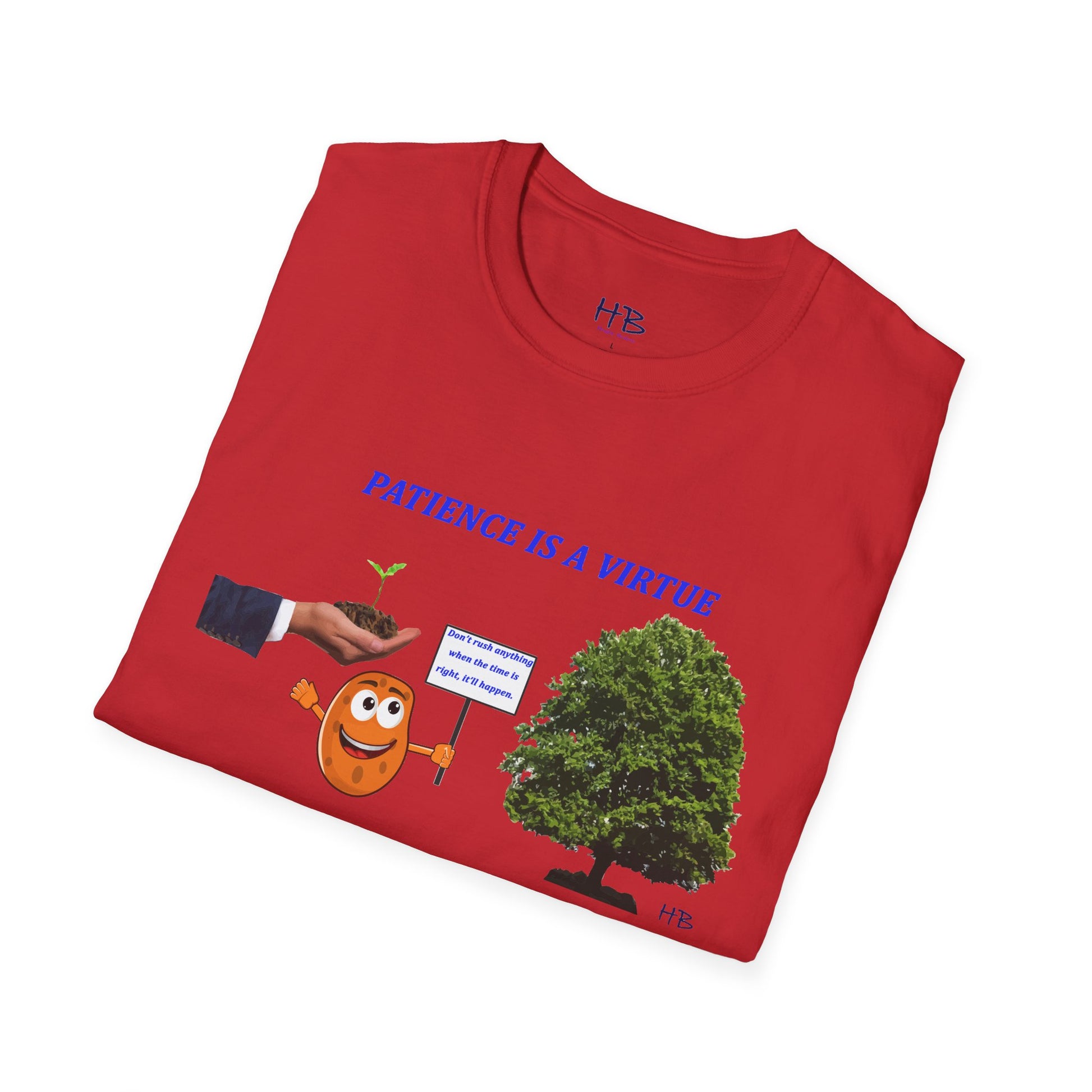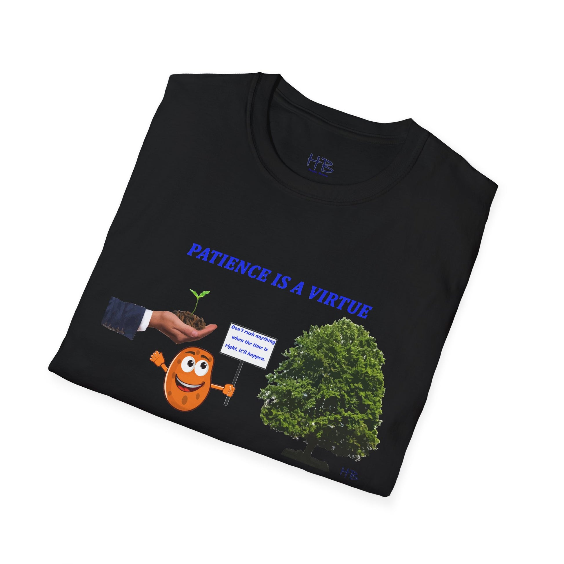 Introducing our latest tee shirt design, featuring a powerful and inspiring message: "Patience is a virtue". The design features an image of a seed holding a sign that says "Don't rush anything, when the time is right, it'll happen". The design also includes an image of a business man's hand holding a just-growing plant and a fully grown tree, reminding us that great things take time and patience.