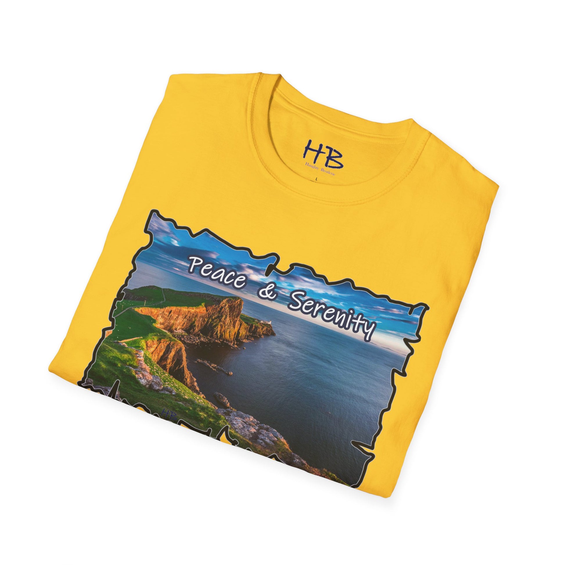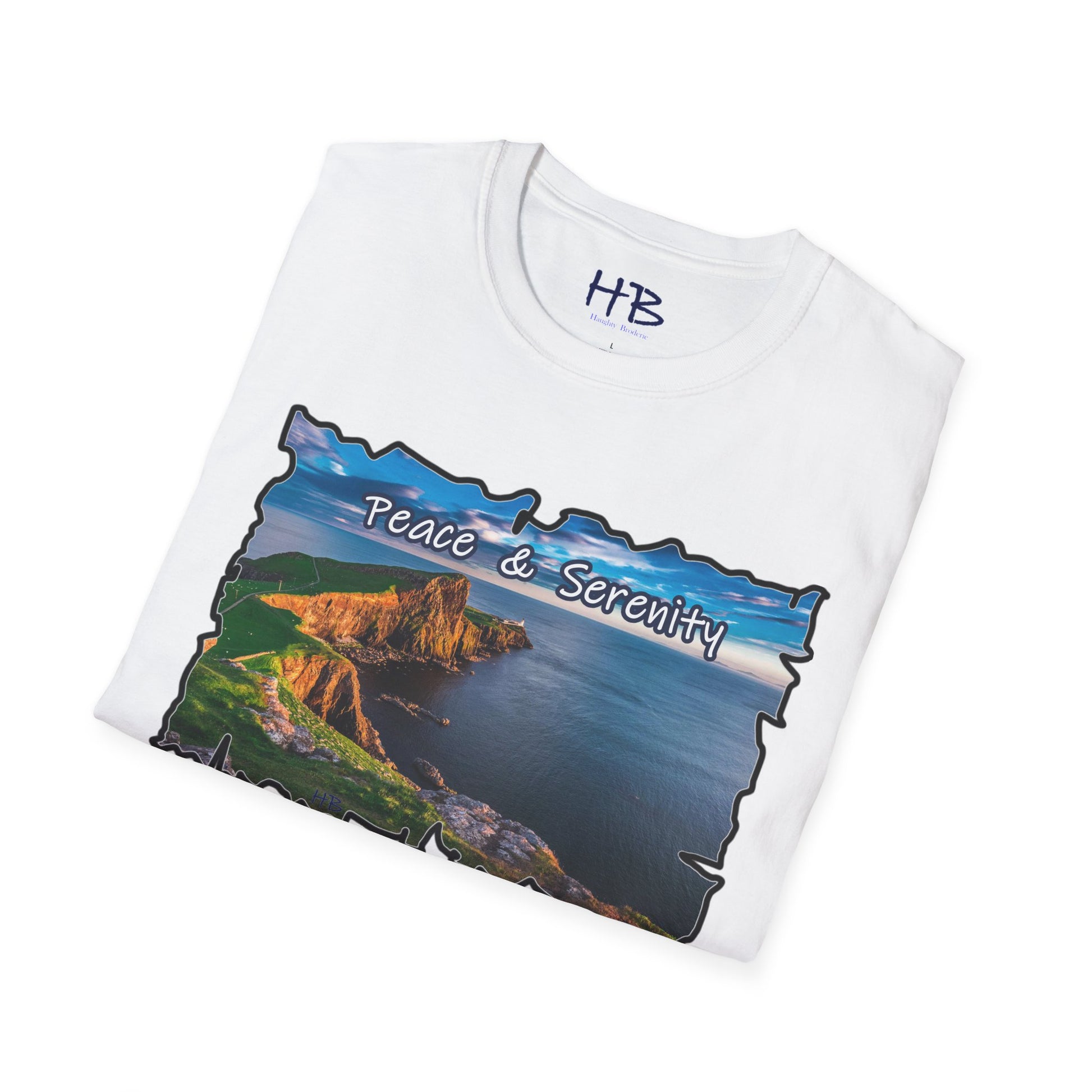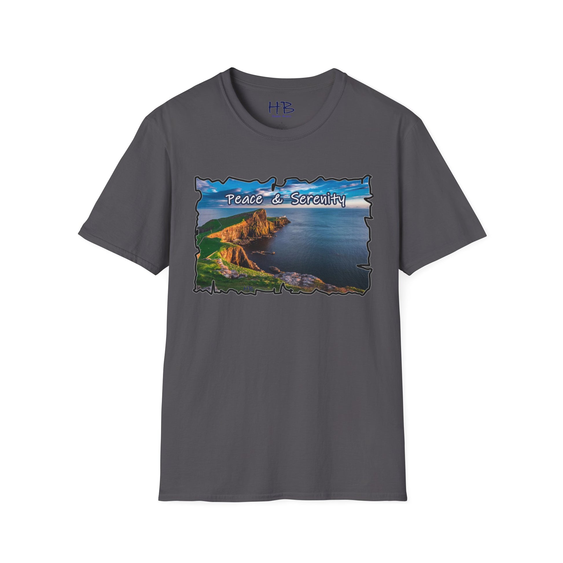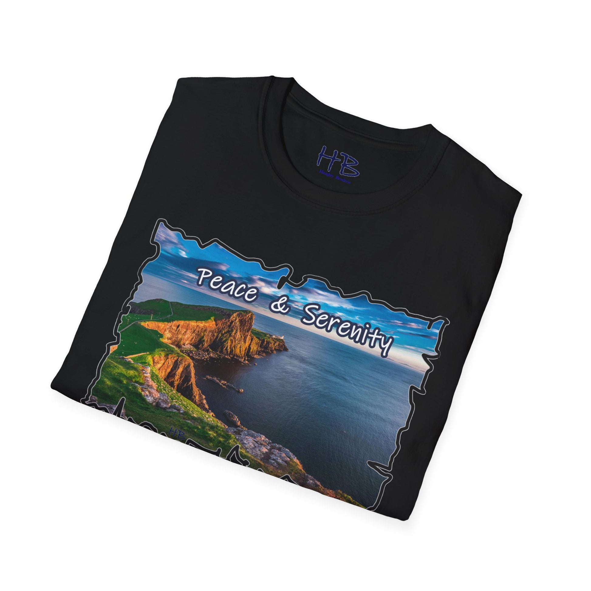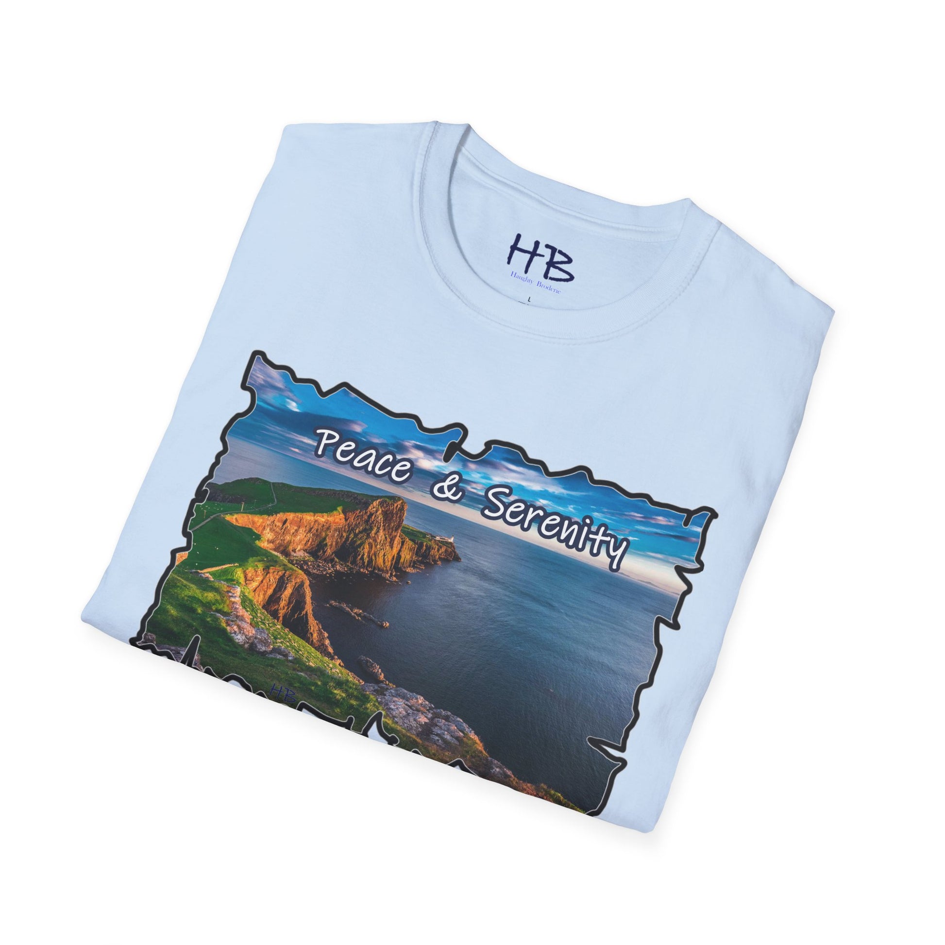 Introducing our "Tranquil Haven" T-shirt, a wearable masterpiece that encapsulates the essence of an idyllic paradise. Immerse yourself in a breathtaking scene where a luxuriant green cliff gracefully meets the expanse of a serene blue ocean, while wisps of cloud in hues of blue and purple adorn the sky, creating a haven of peace and serenity. This picturesque panorama serves as a reminder of the yearning for tranquility, an escape from the hustle and bustle of everyday life.