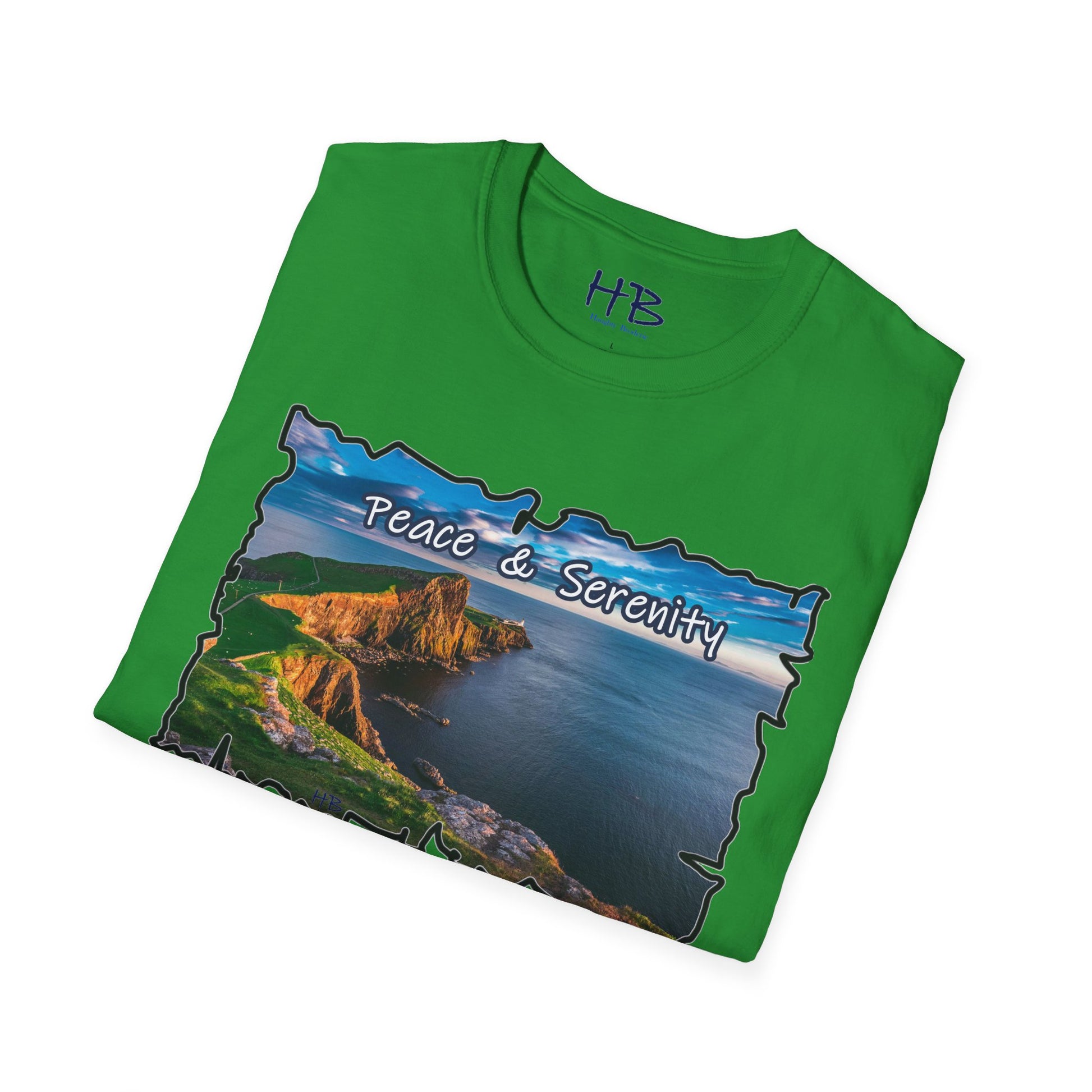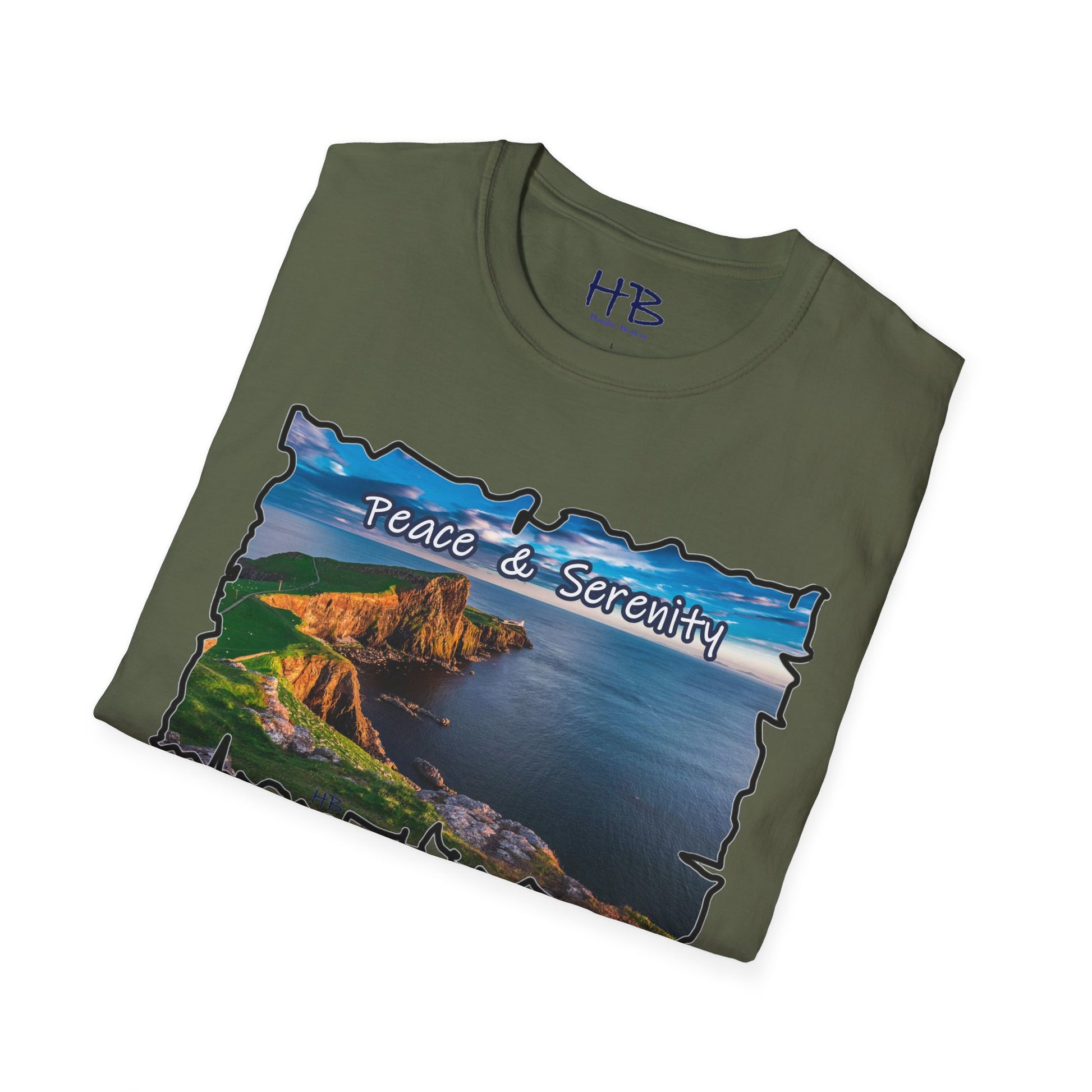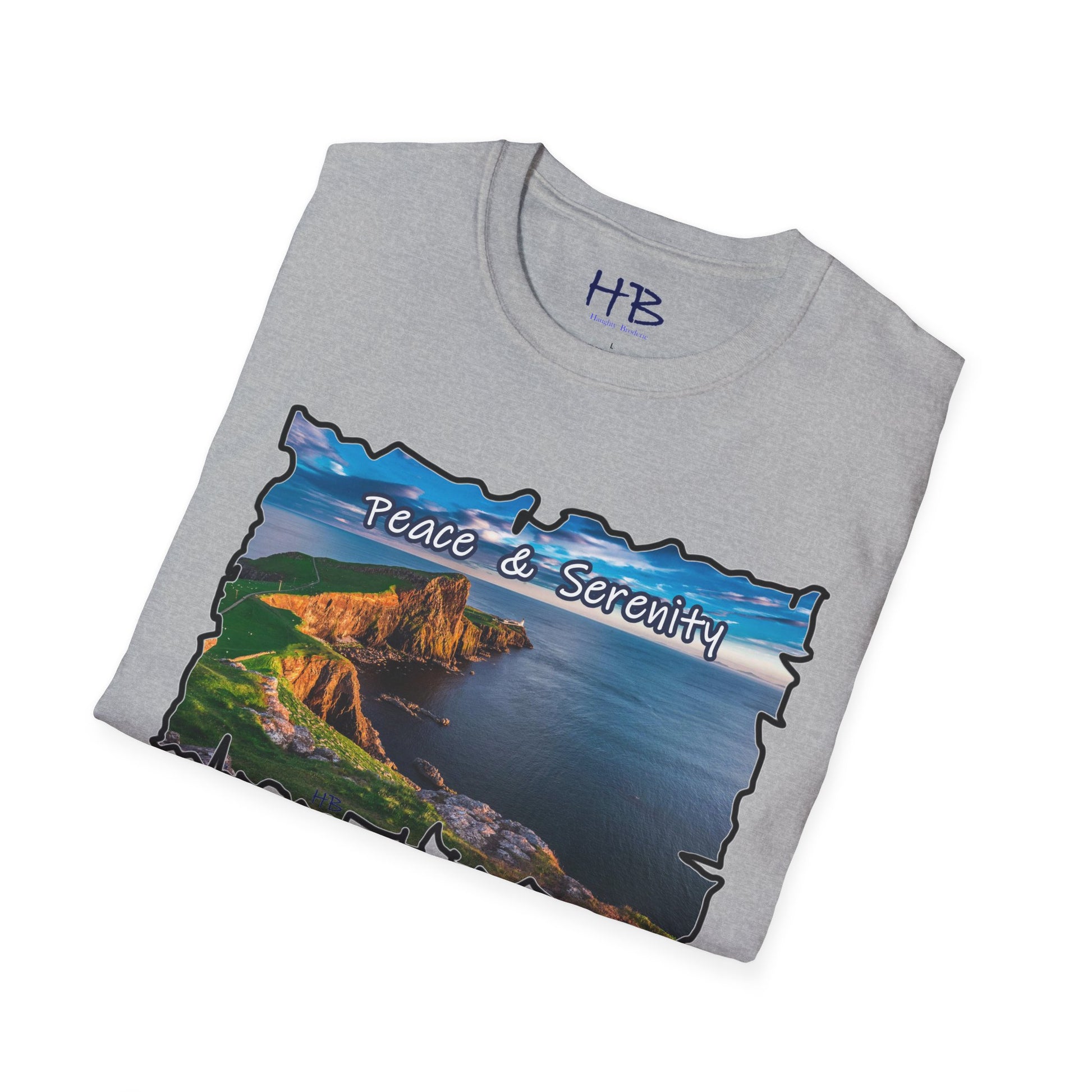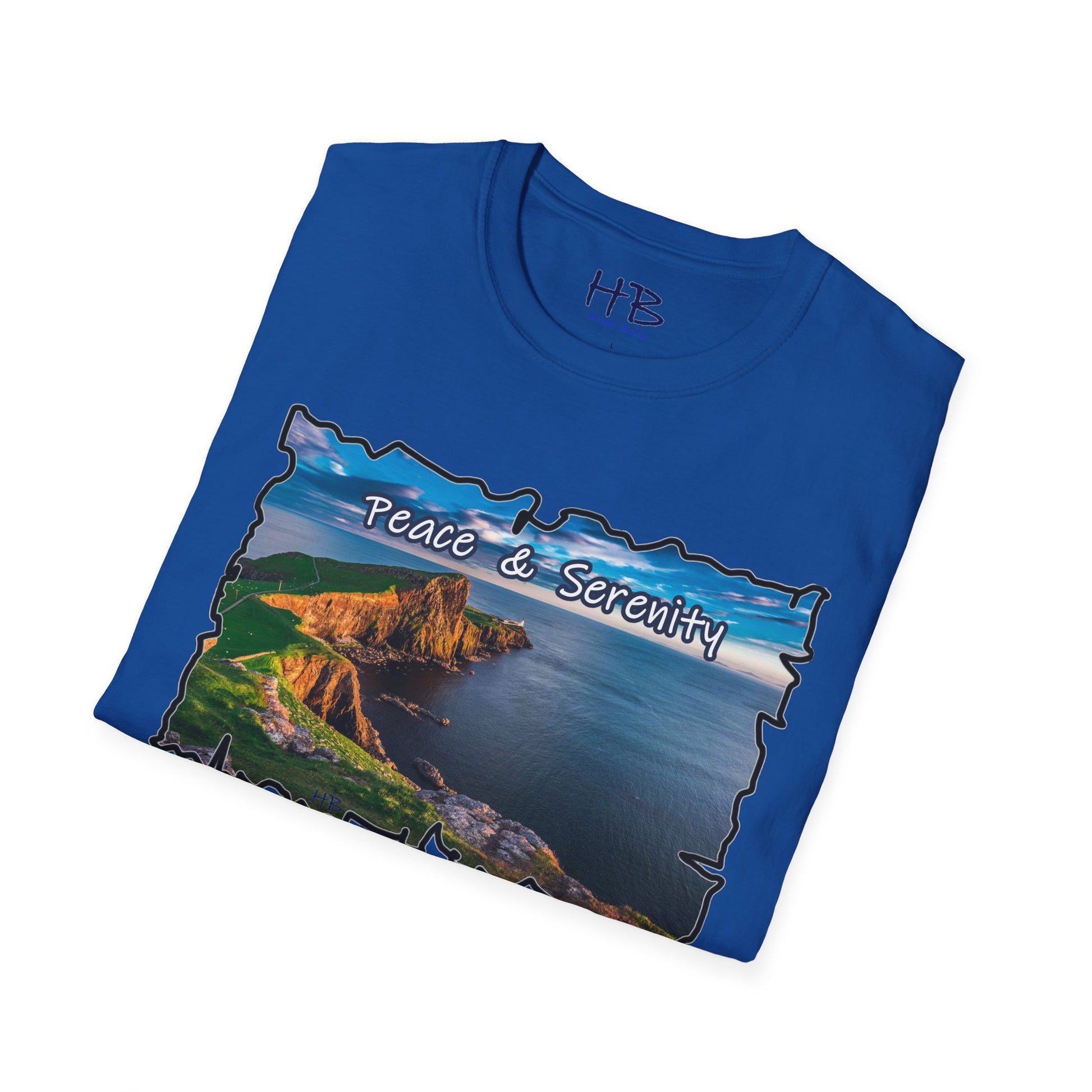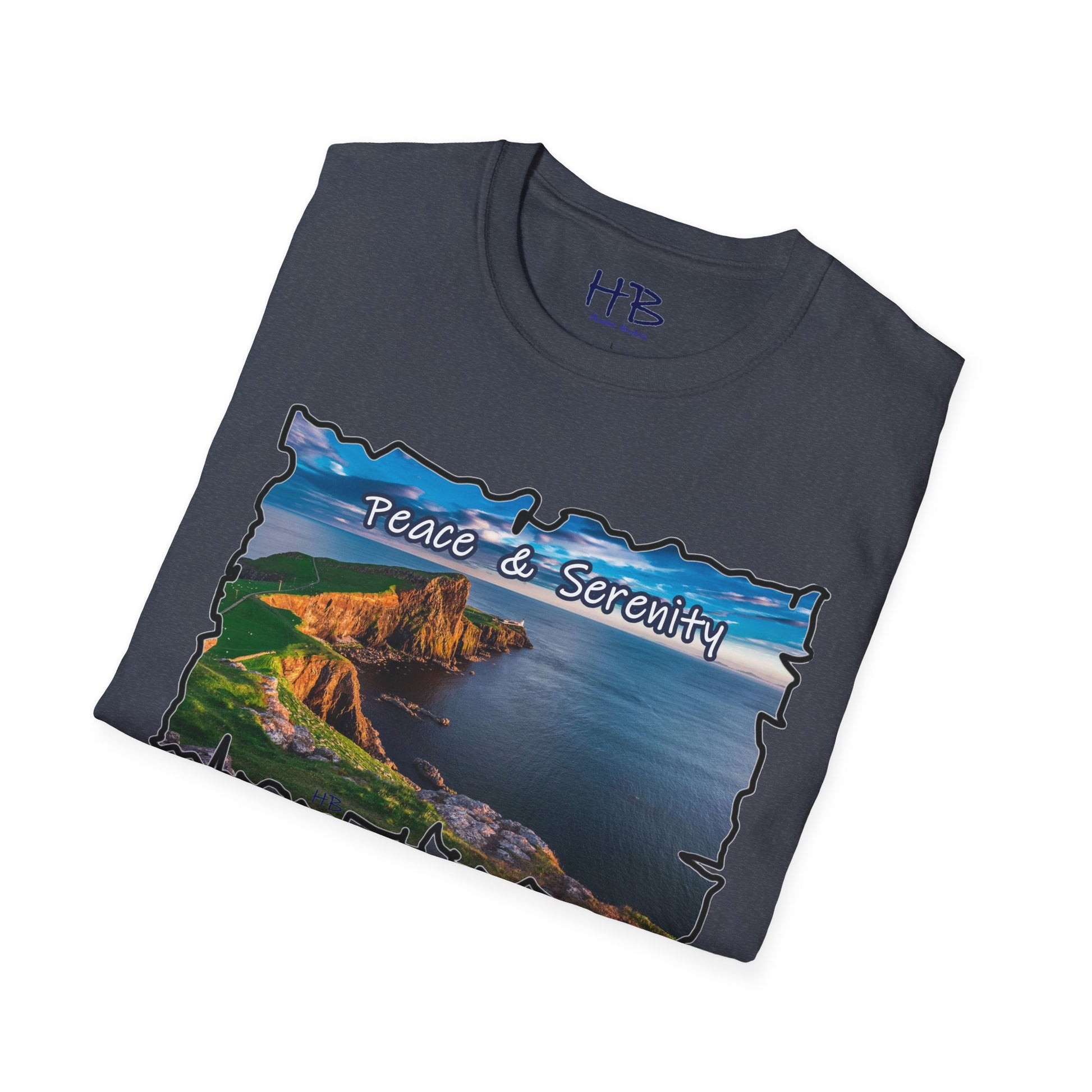 Introducing our "Tranquil Haven" T-shirt, a wearable masterpiece that encapsulates the essence of an idyllic paradise. Immerse yourself in a breathtaking scene where a luxuriant green cliff gracefully meets the expanse of a serene blue ocean, while wisps of cloud in hues of blue and purple adorn the sky, creating a haven of peace and serenity. This picturesque panorama serves as a reminder of the yearning for tranquility, an escape from the hustle and bustle of everyday life.