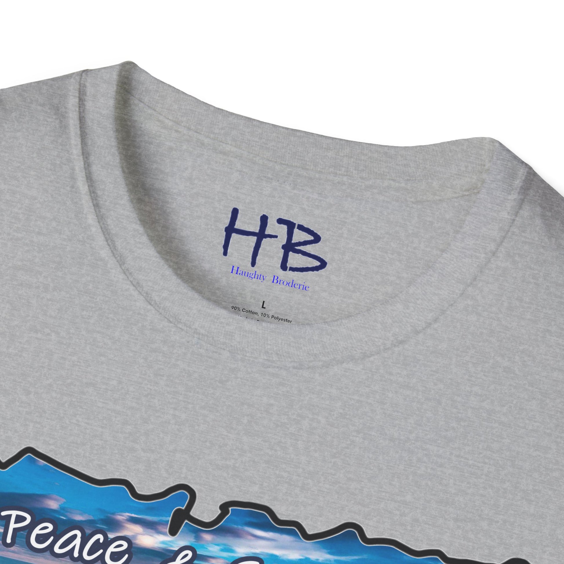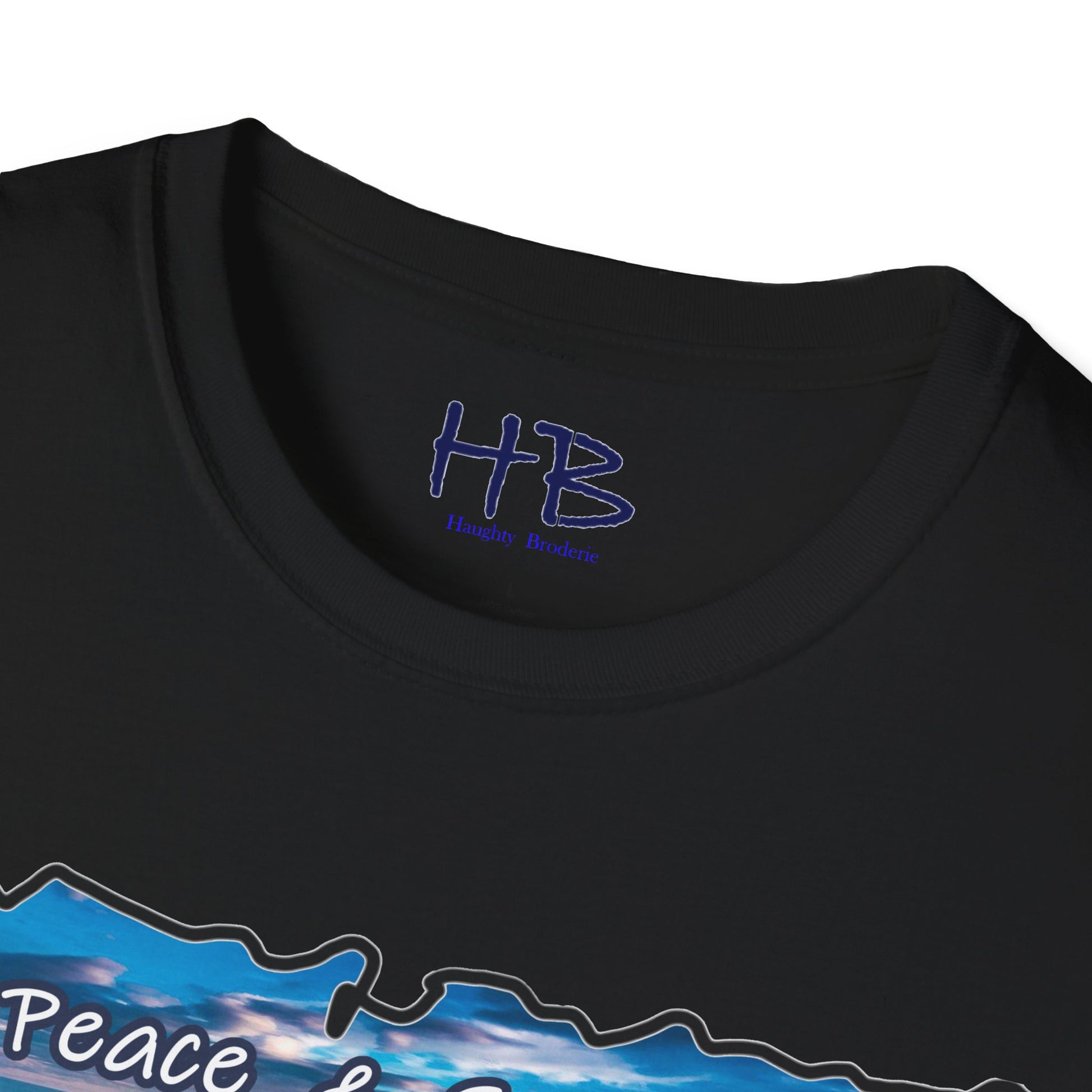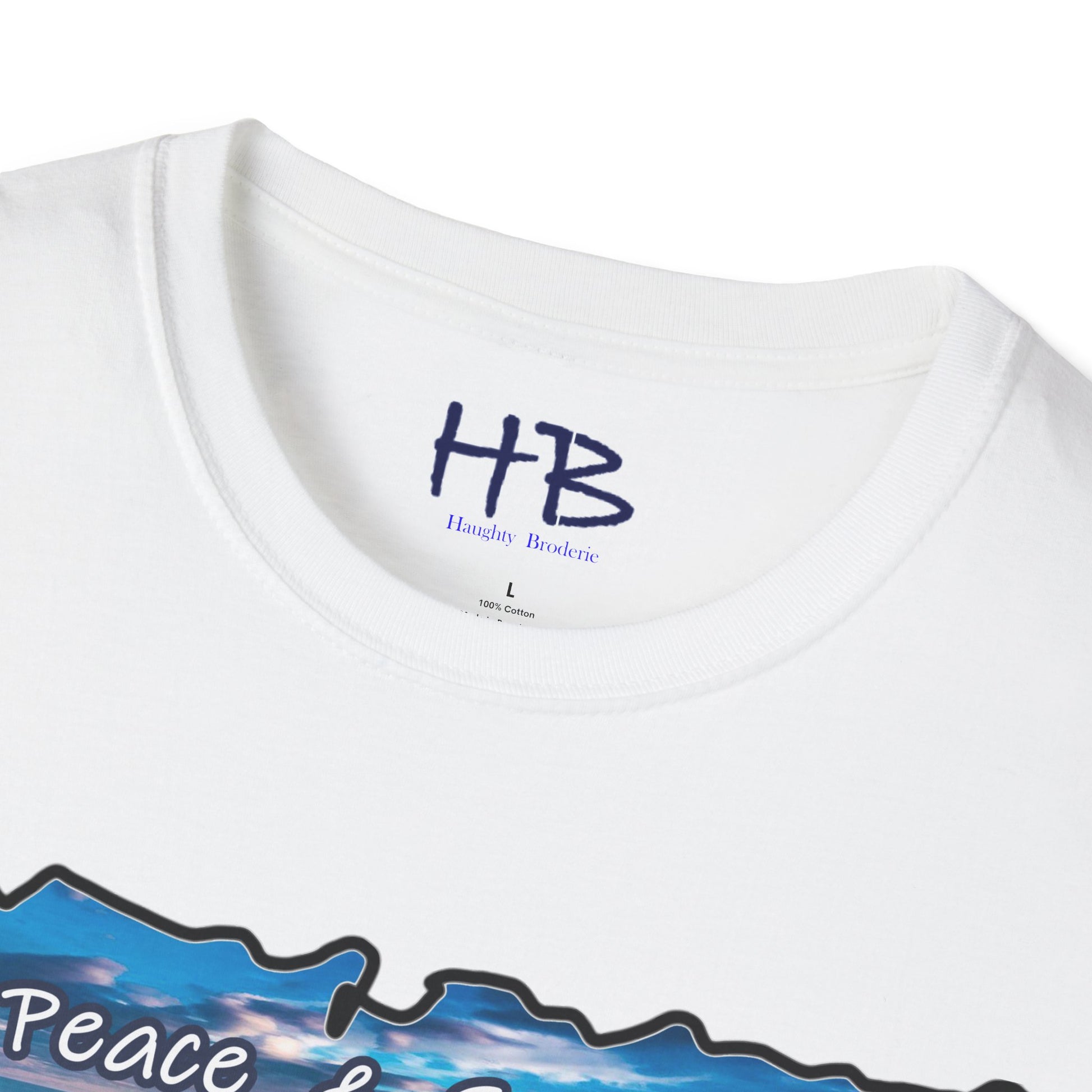 Imagine donning this shirt and carrying with you the embodiment of a peaceful retreat. The text, elegantly embroidered, spells out "Peace & Serenity," a succinct mantra inviting mindfulness, meditation, and a moment of respite. This wearable artwork resonates with those who seek solace, simplicity, and a touch of minimalistic beauty in their lives.