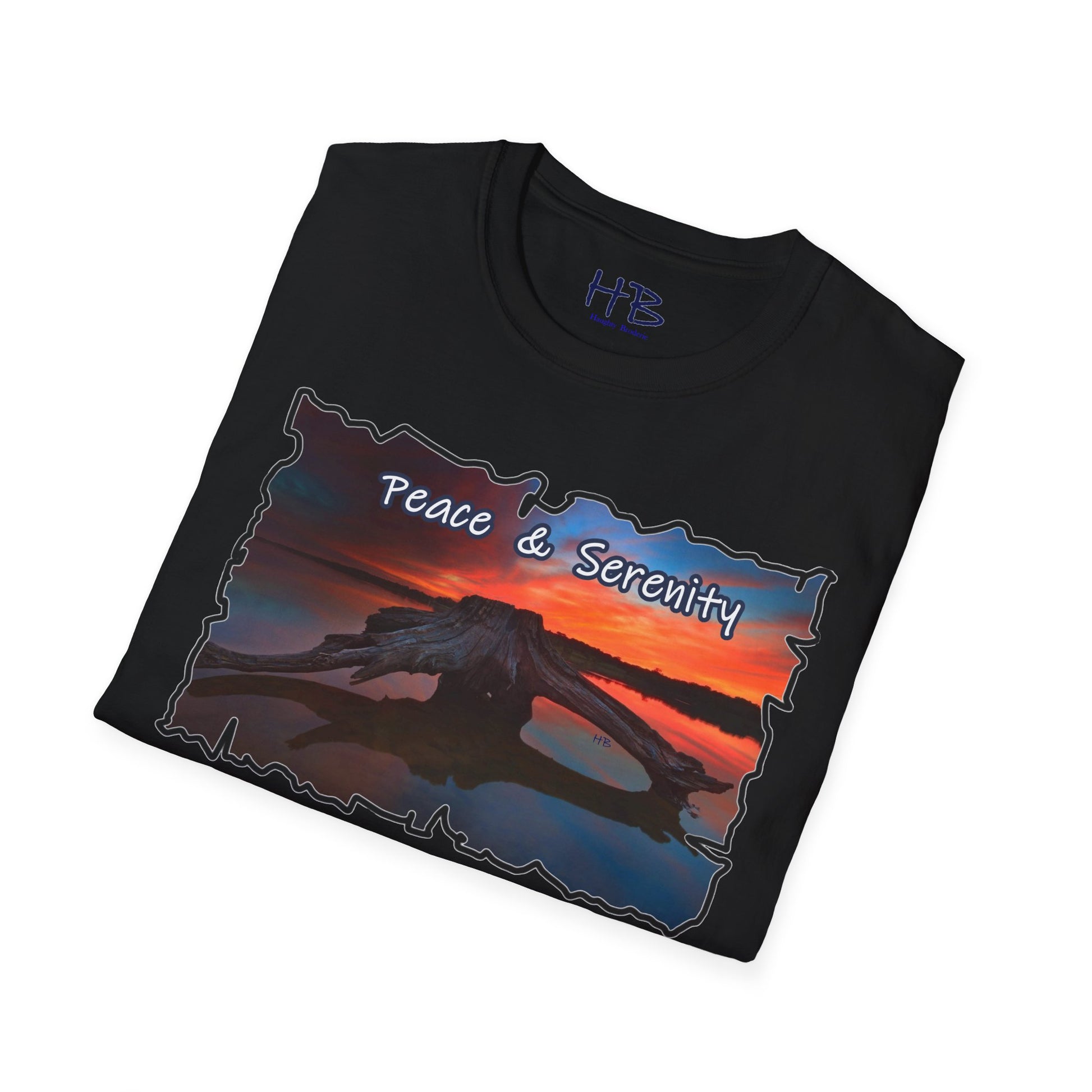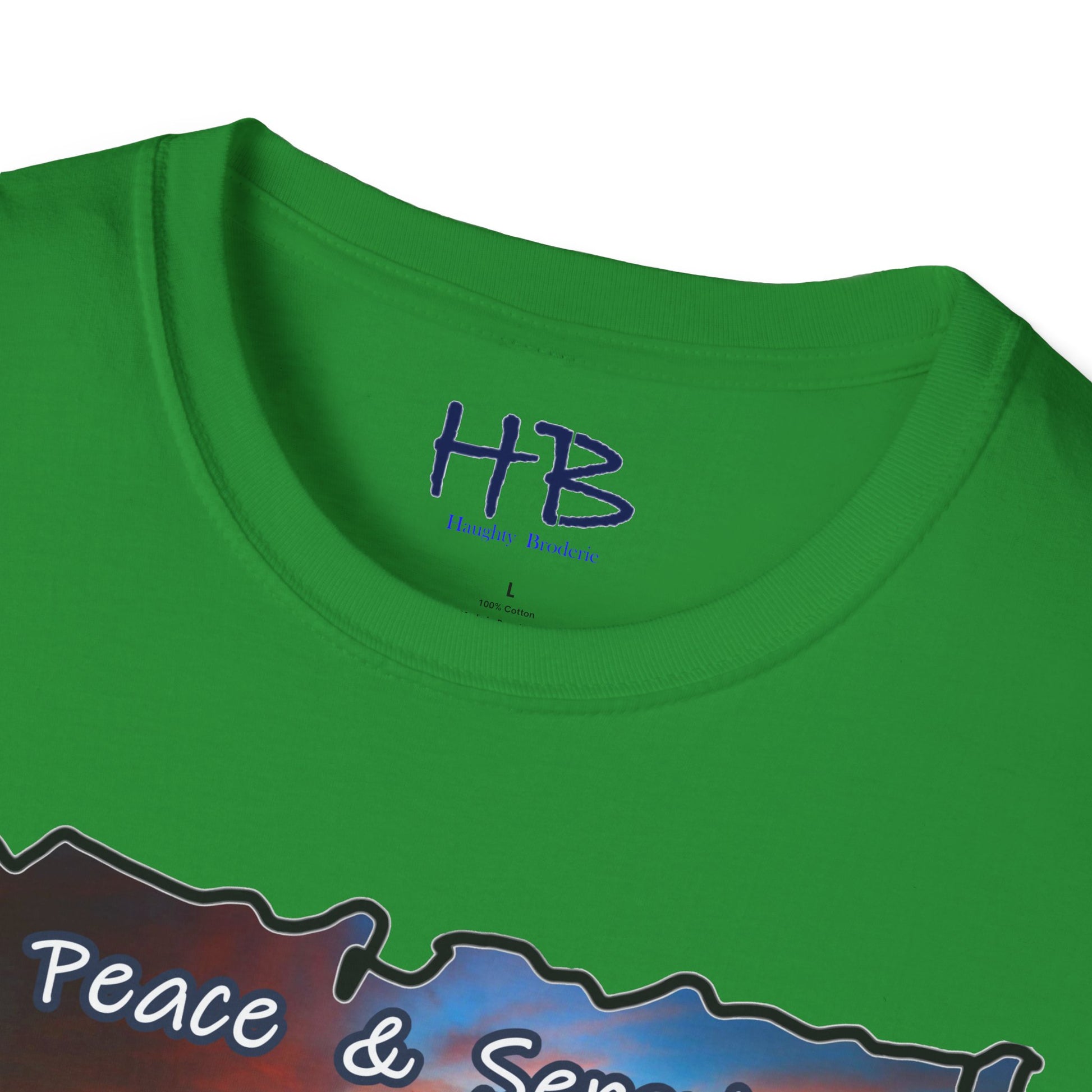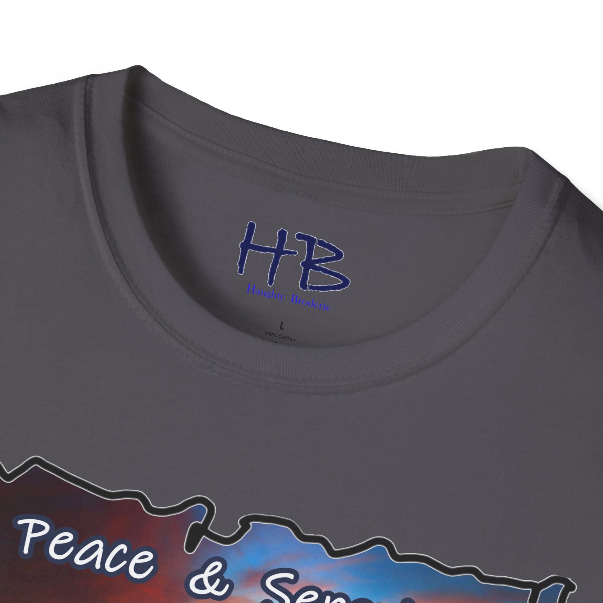 This idyllic image is not merely a snapshot; it's a visual poem that resonates with the dreams of those who toil tirelessly year-round, aspiring to bask in the luxury of such a serene haven. The text delicately embroidered at the bottom of the scene simply reads "Peace & Serenity," a gentle reminder of the overarching theme that this wearable masterpiece embodies.