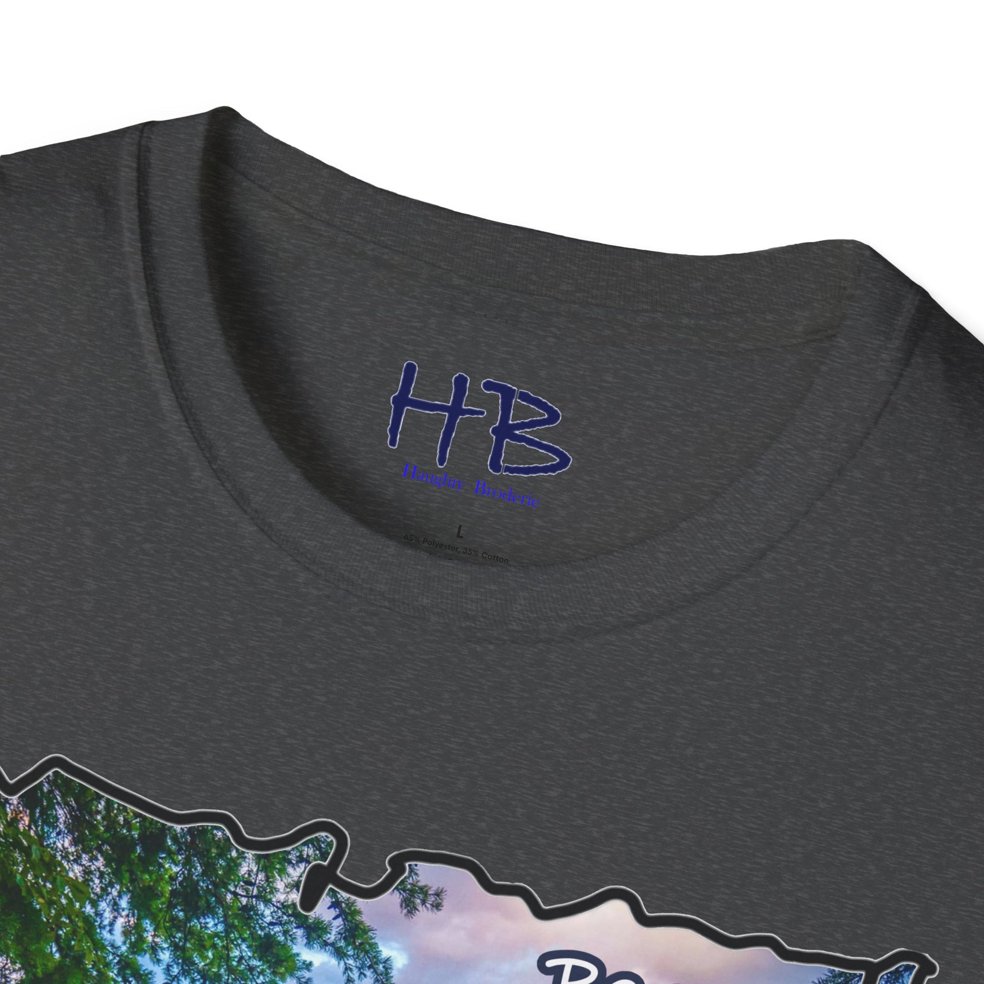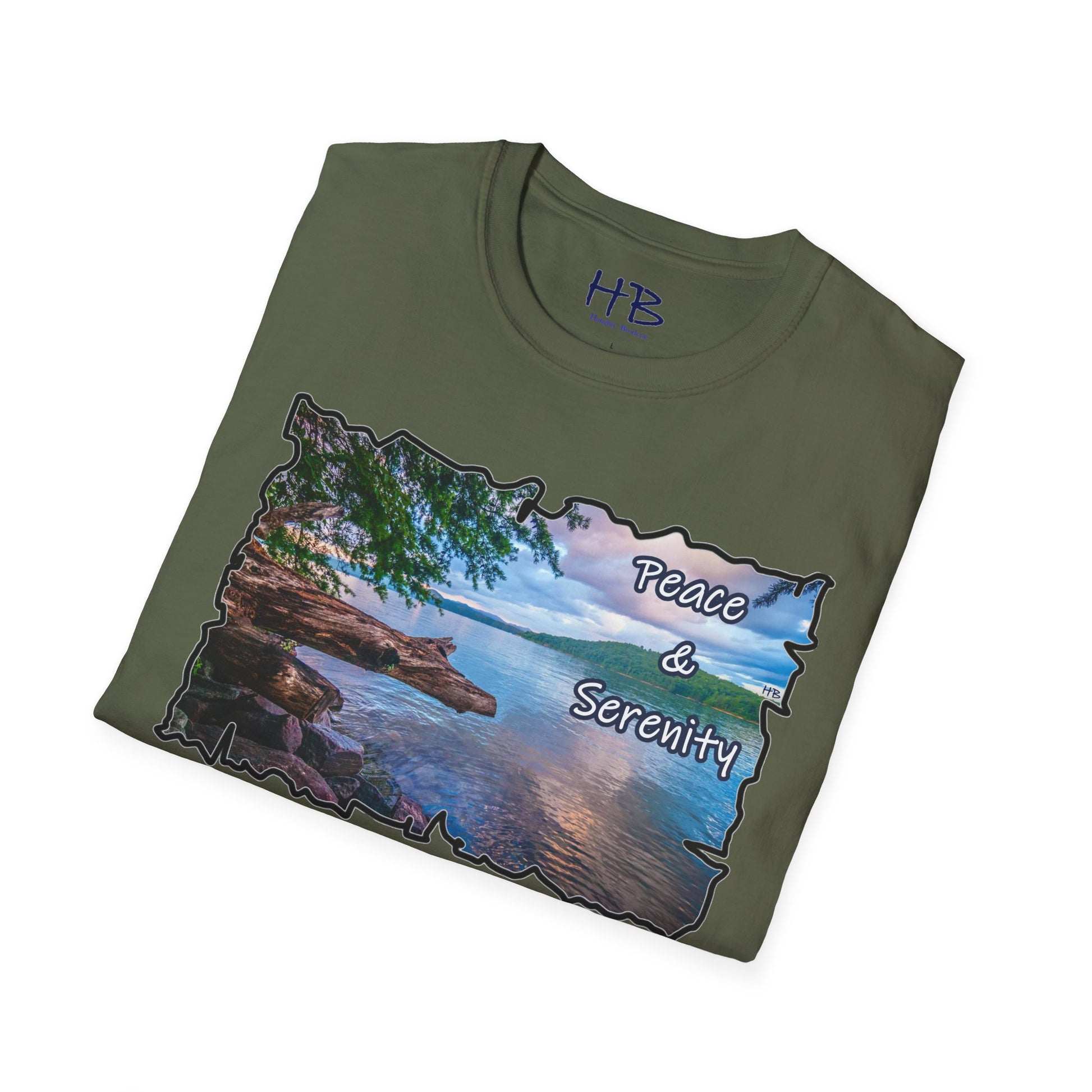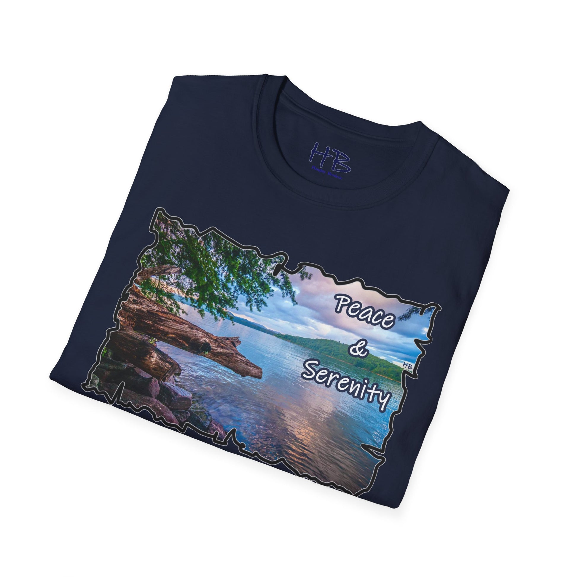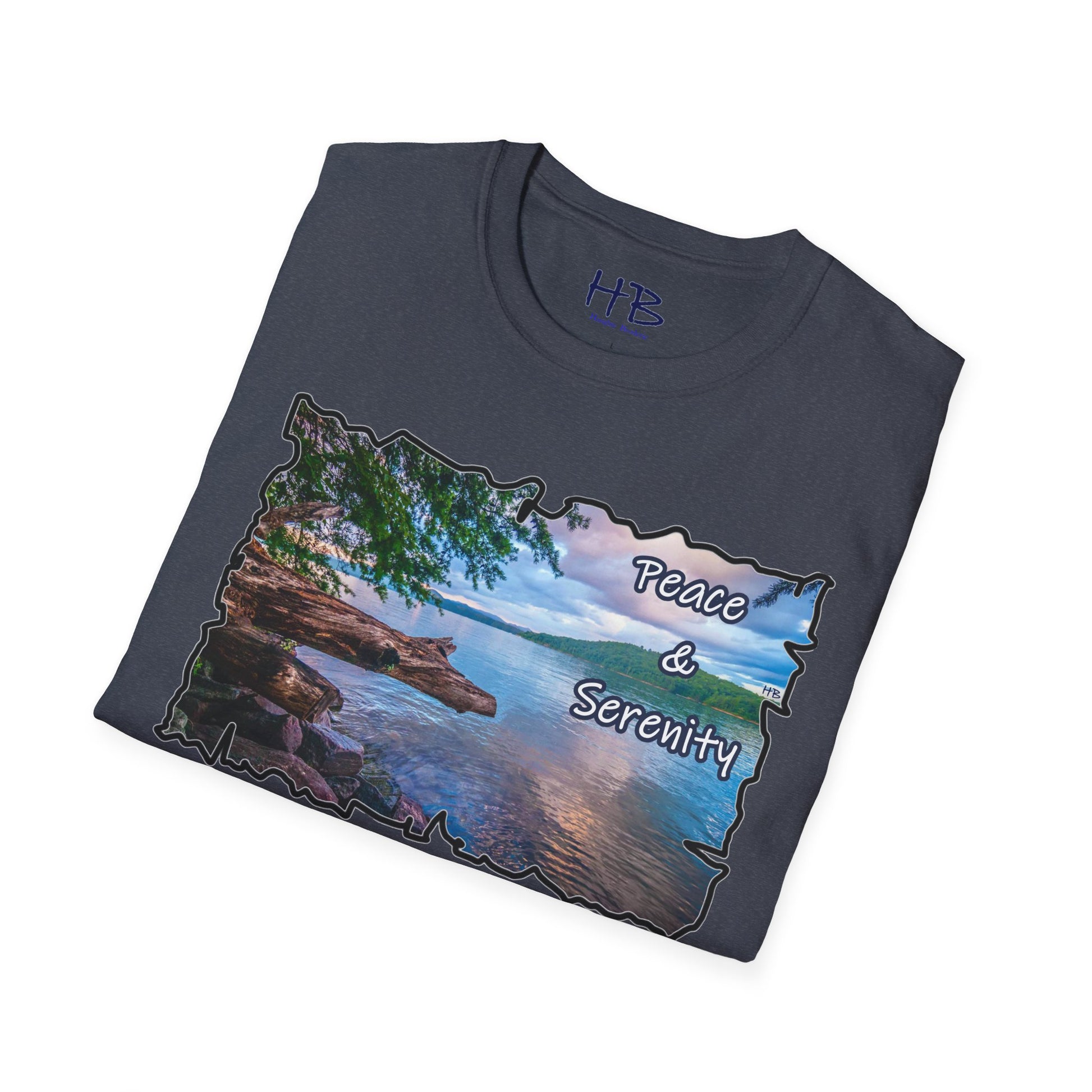 The text "Peace & Serenity" serves as a poignant reminder of the shirt's essence — a visual symphony designed to inspire moments of peace, quiet, meditation, mindfulness, simplicity, and minimalism. The scenic panorama depicts a profound connection with nature, providing a mental sanctuary for those who seek solace.