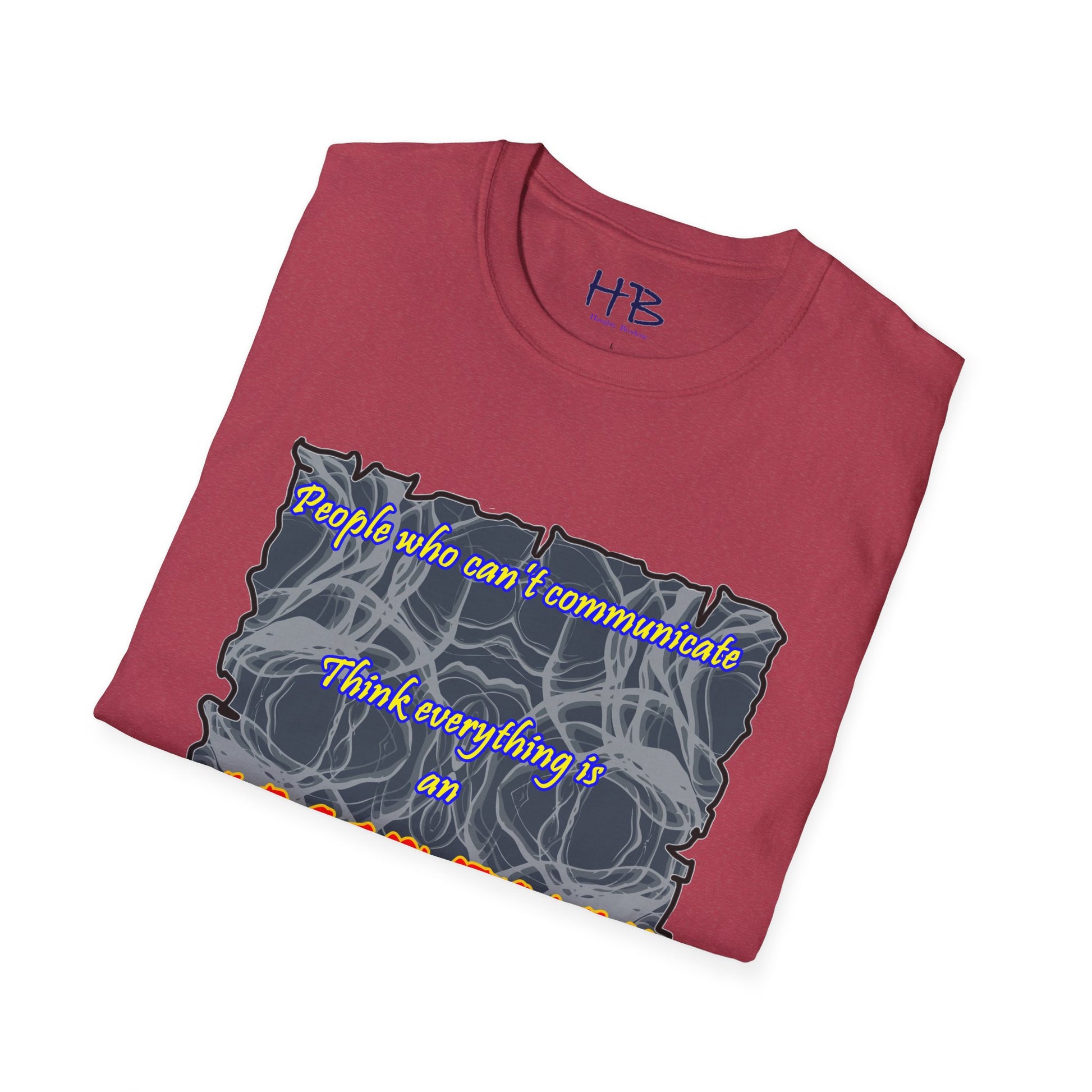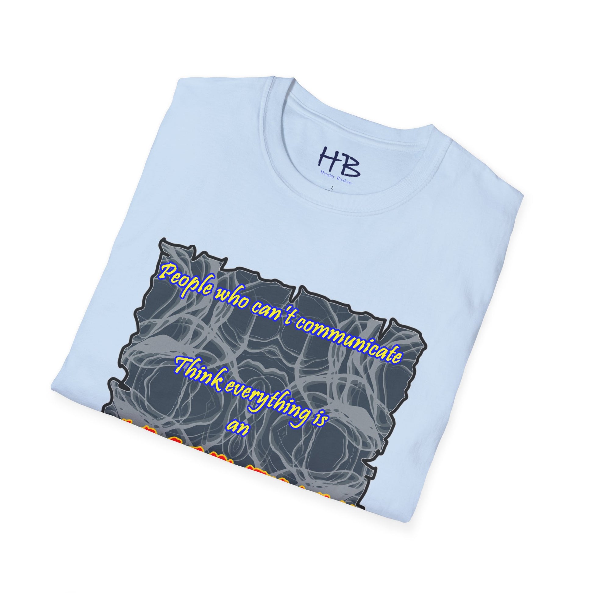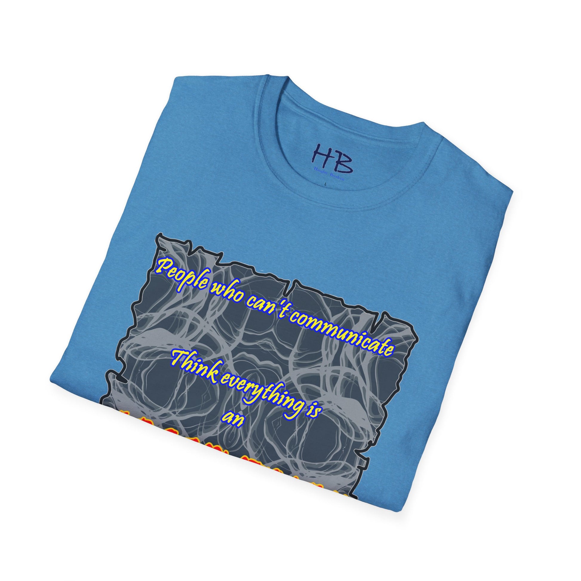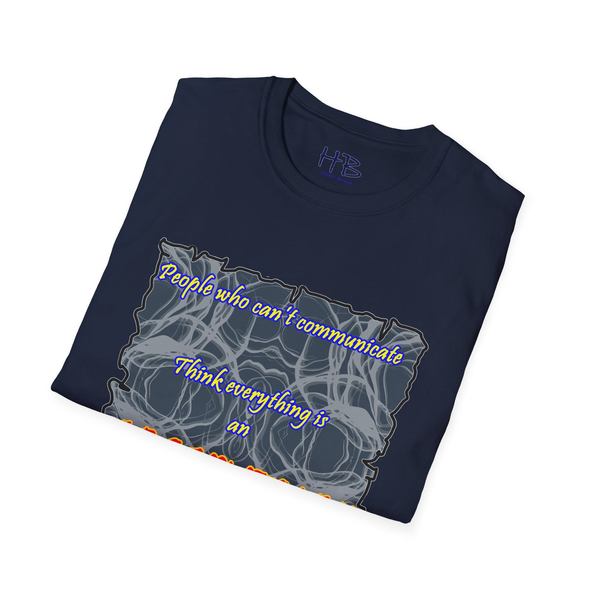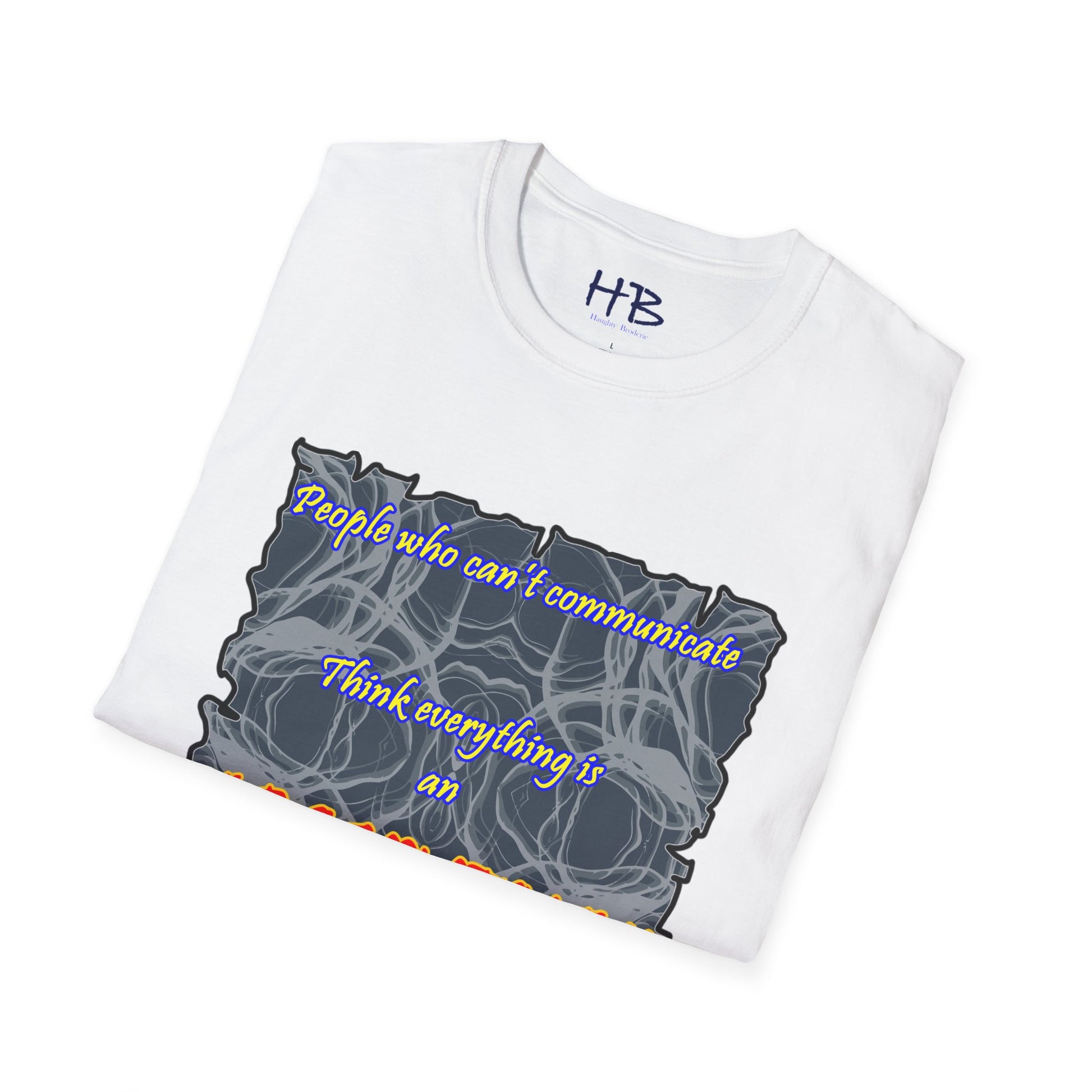 Introducing a captivating tee shirt that underscores the significance of effective communication! This striking design features a powerful message against a tense backdrop, boldly stating "Individuals who are unable to communicate assume all matters are a DISPUTE." This statement encapsulates the struggle experienced by those who lack the ability to express themselves effectively.