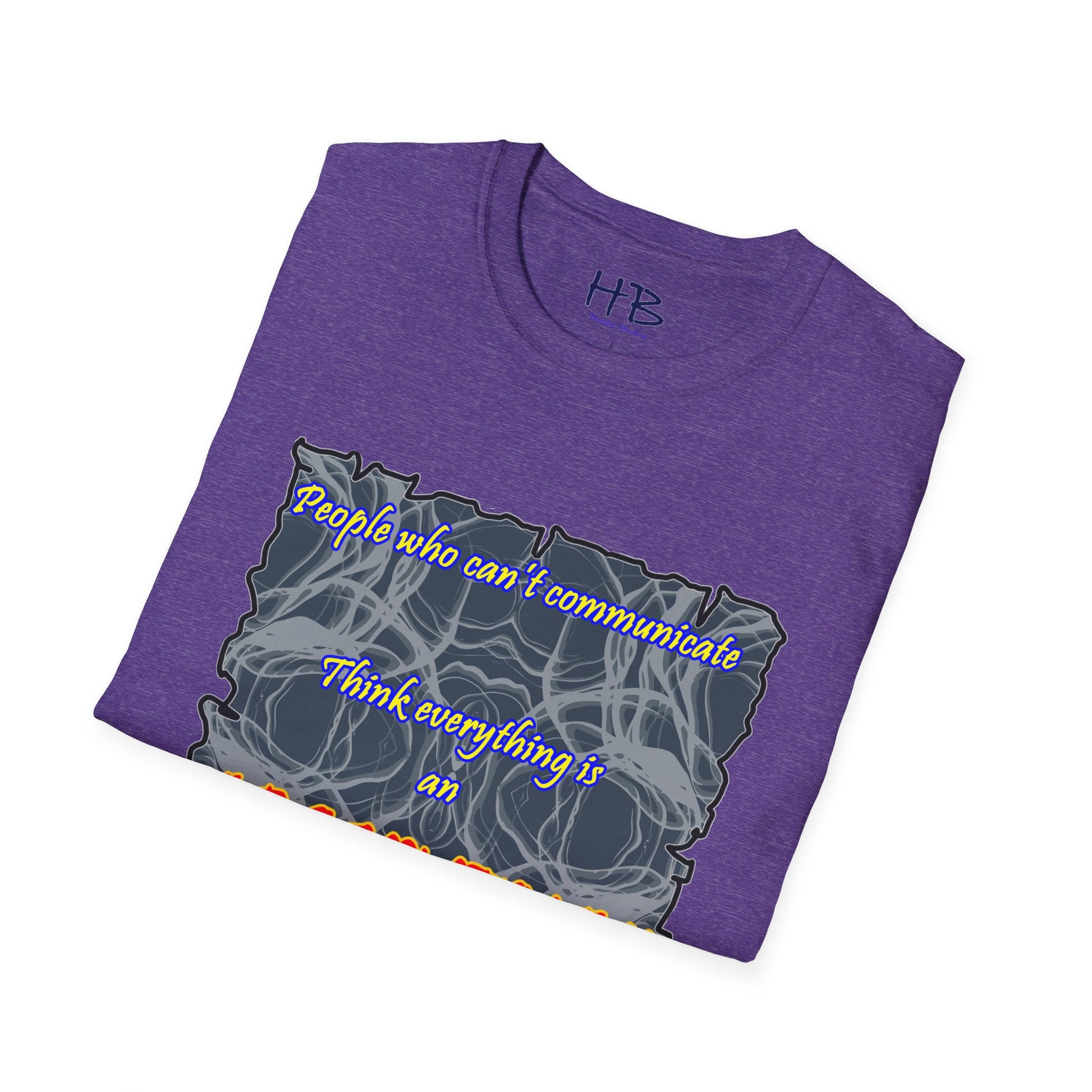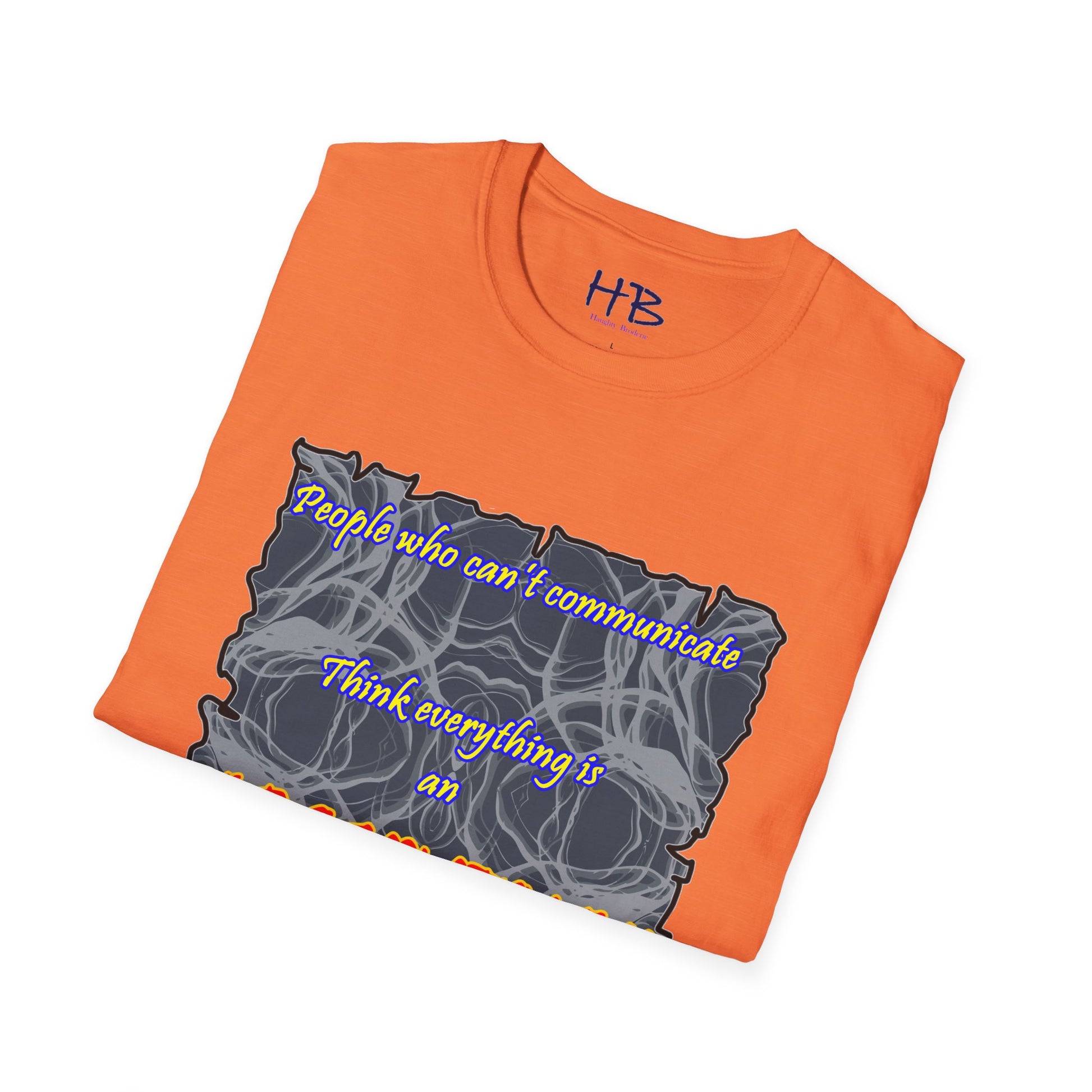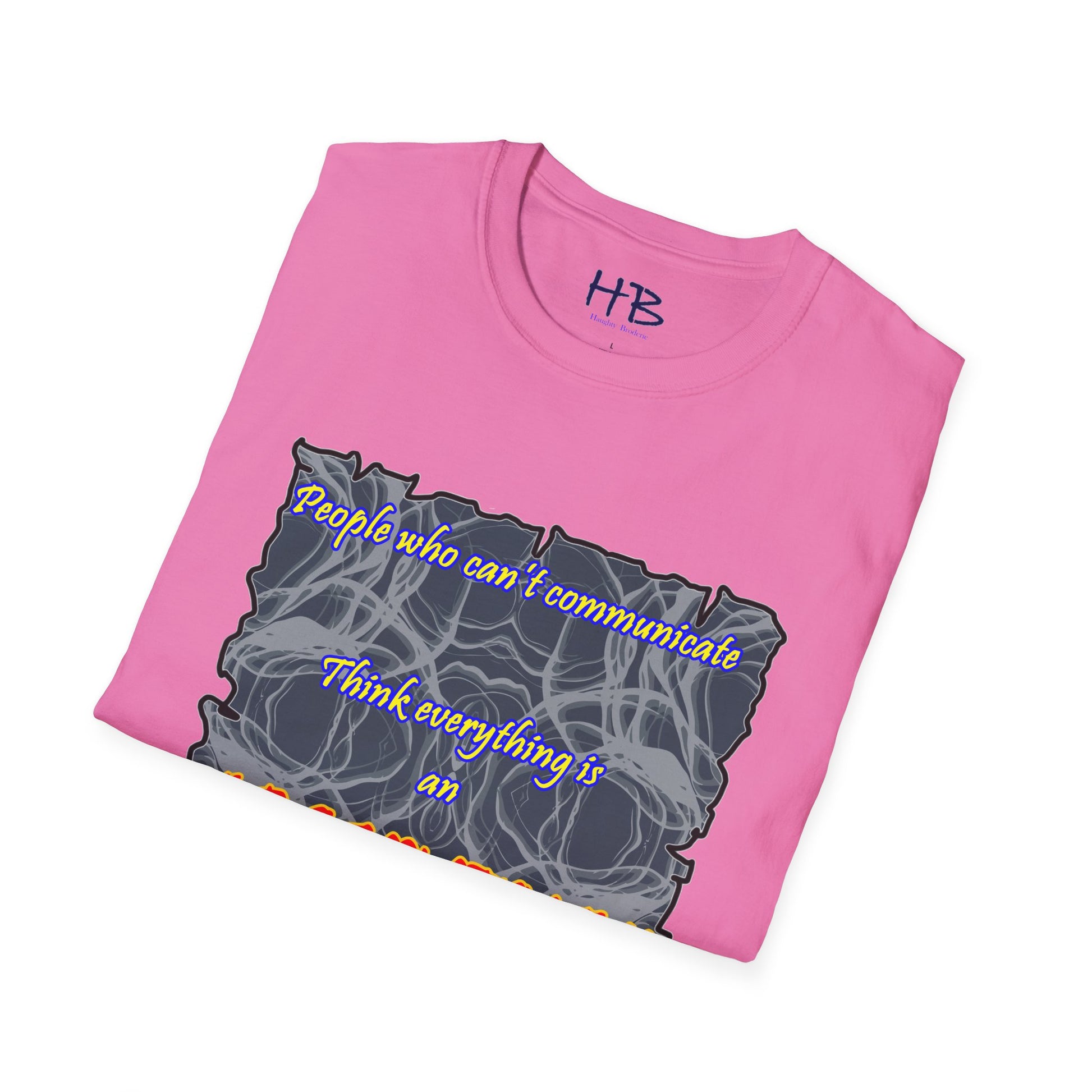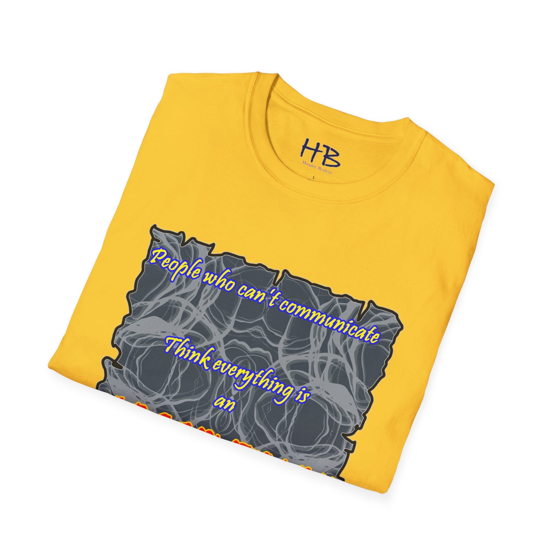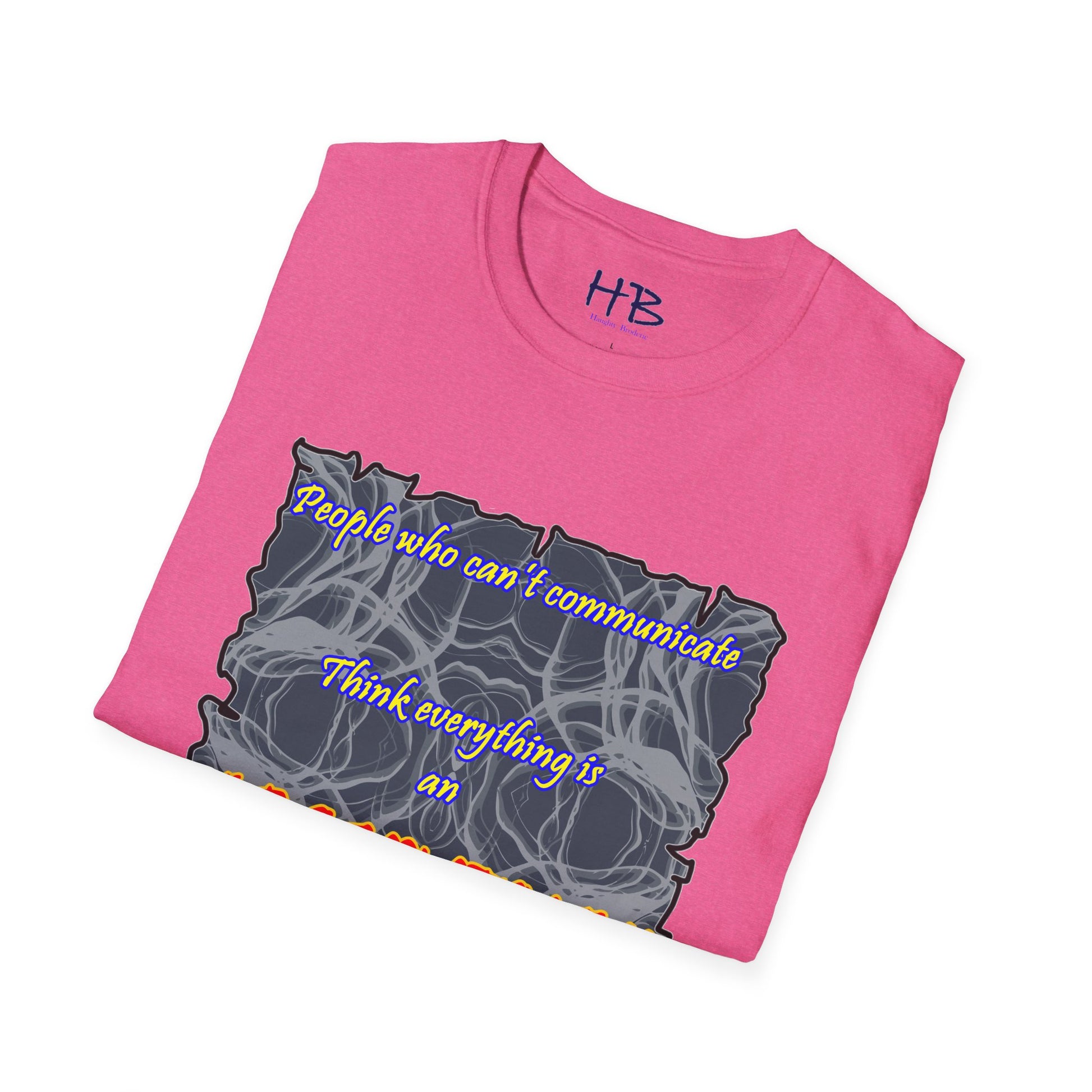 Introducing a captivating tee shirt that underscores the significance of effective communication! This striking design features a powerful message against a tense backdrop, boldly stating "Individuals who are unable to communicate assume all matters are a DISPUTE." This statement encapsulates the struggle experienced by those who lack the ability to express themselves effectively.