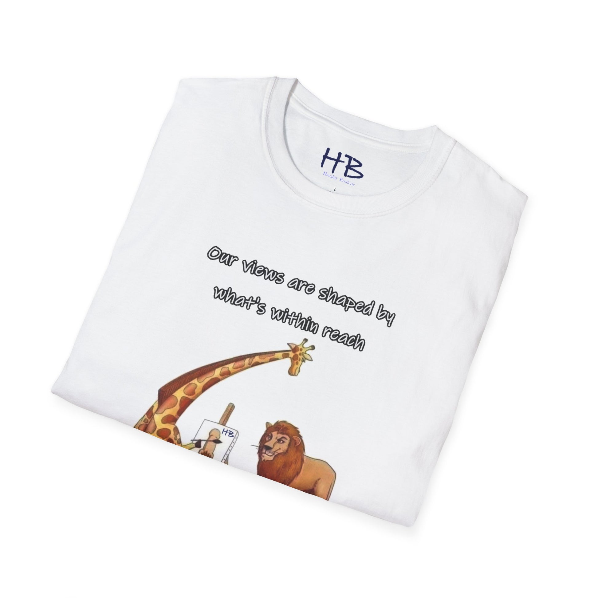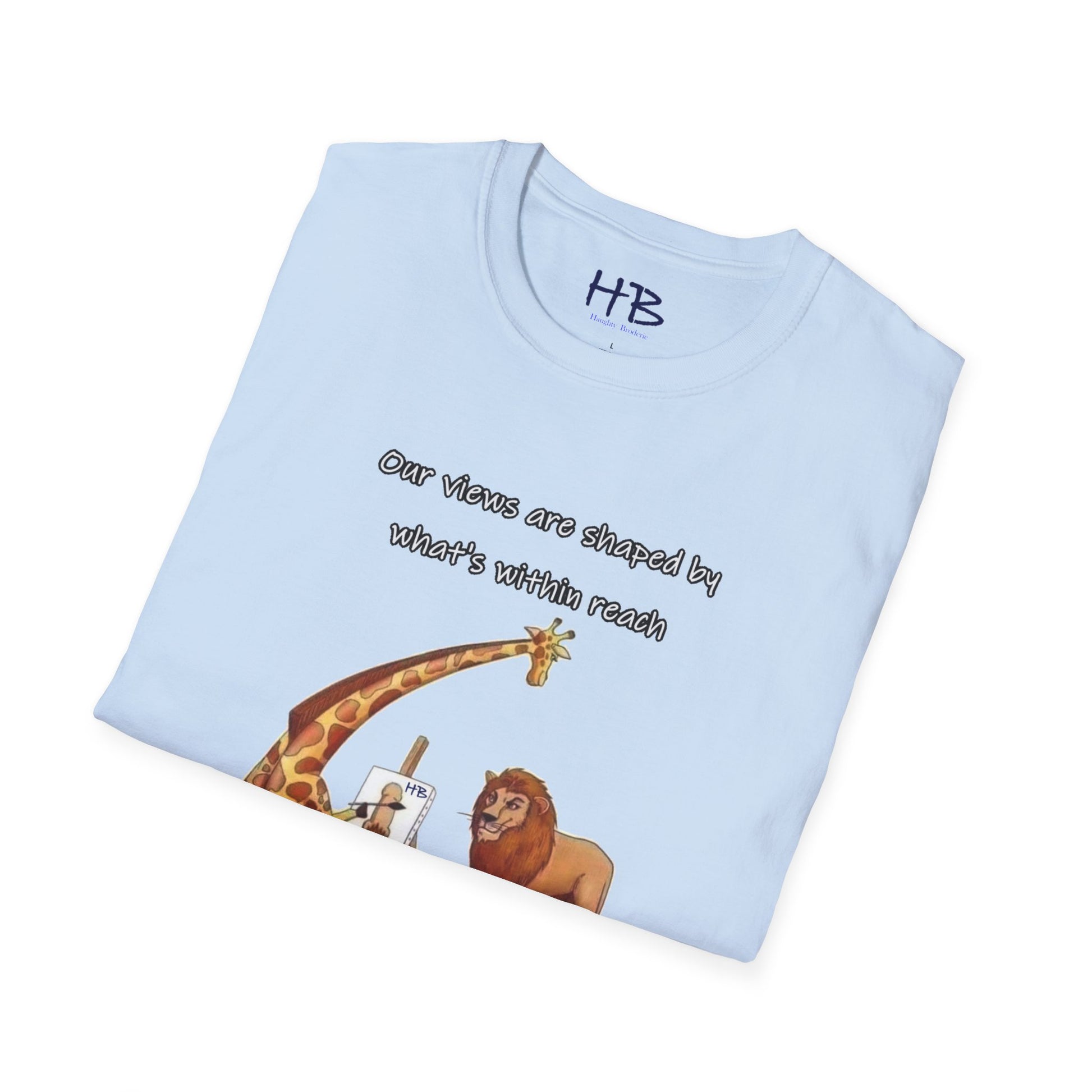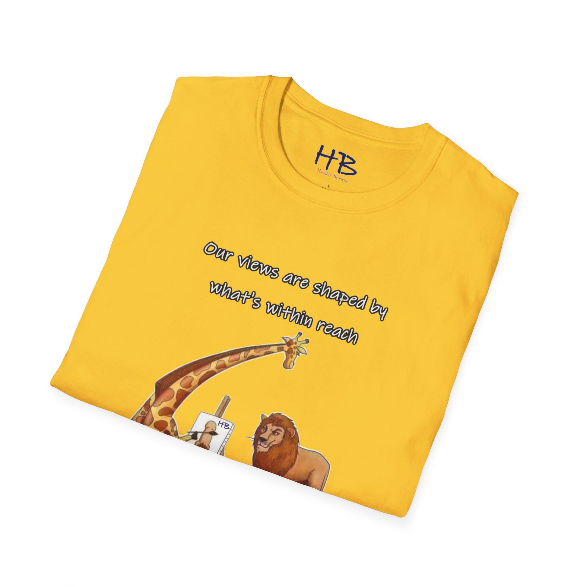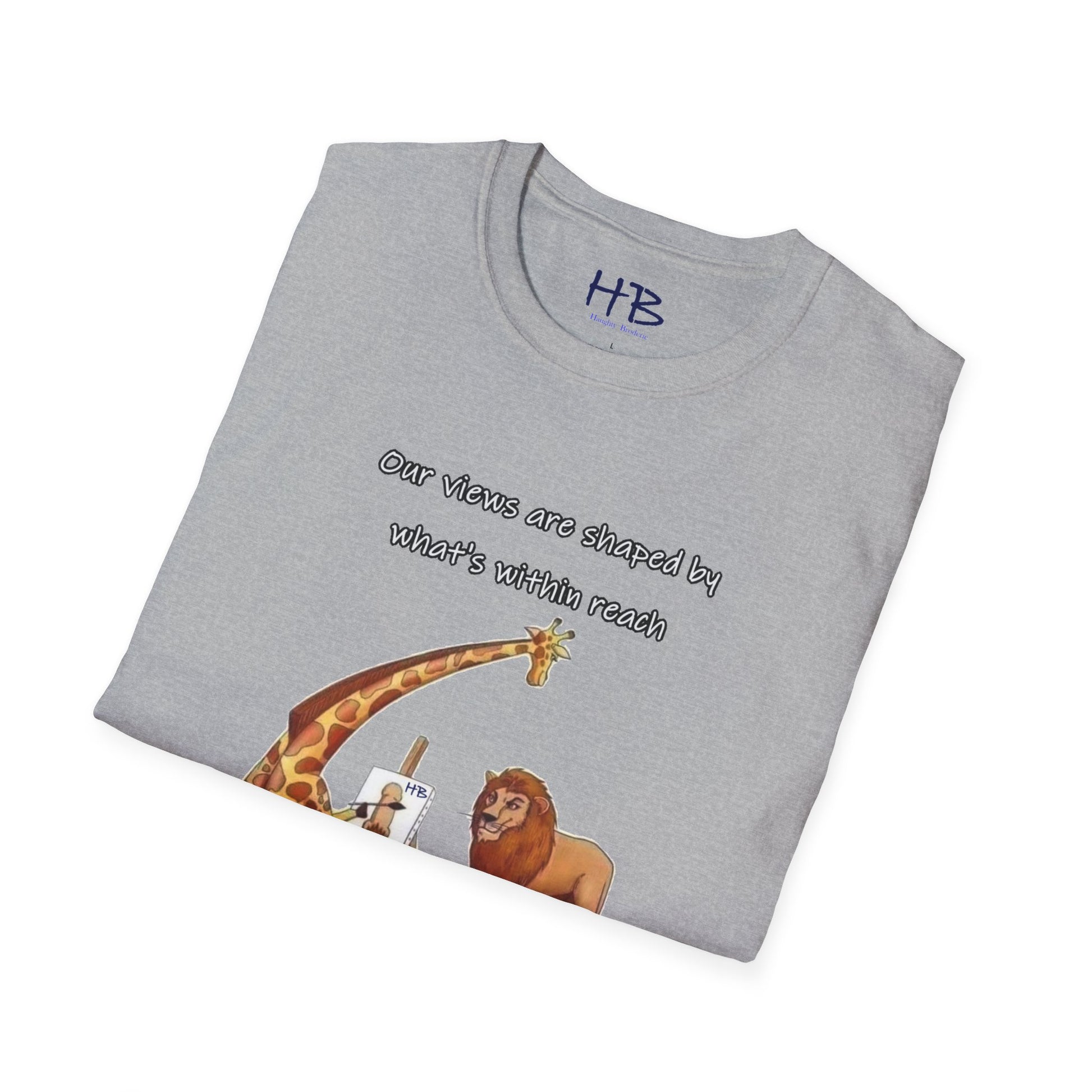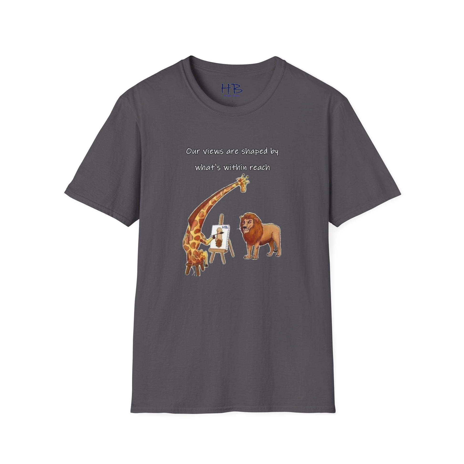As the giraffe's long neck can only capture the lion's back, the accompanying text boldly declares, "Our views are shaped by what's within reach." This isn't just a t-shirt; it's a thought-provoking commentary on the intricacies of our perception. The message is clear – our understanding of the world is intricately woven with the immediate and accessible information or experiences available to us.