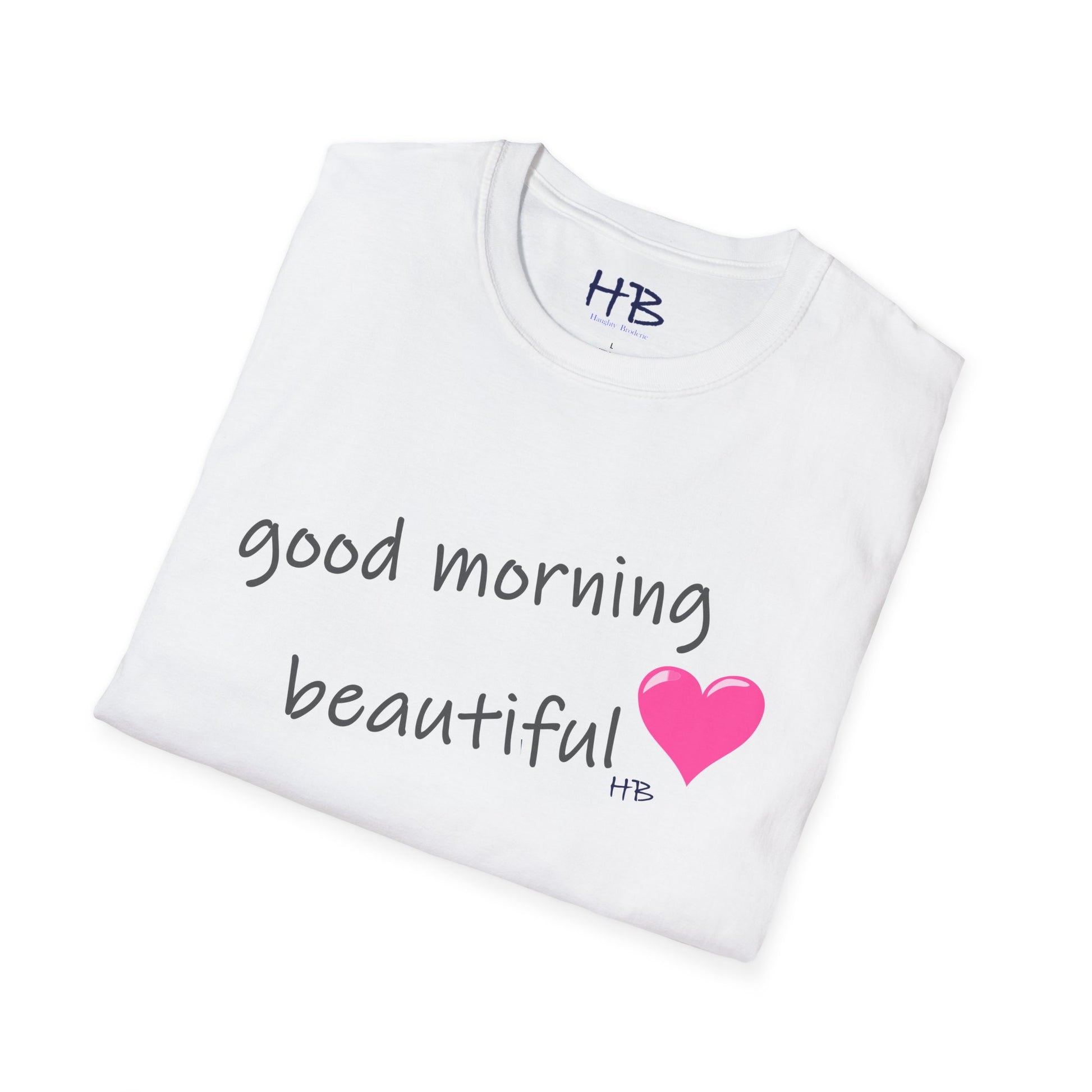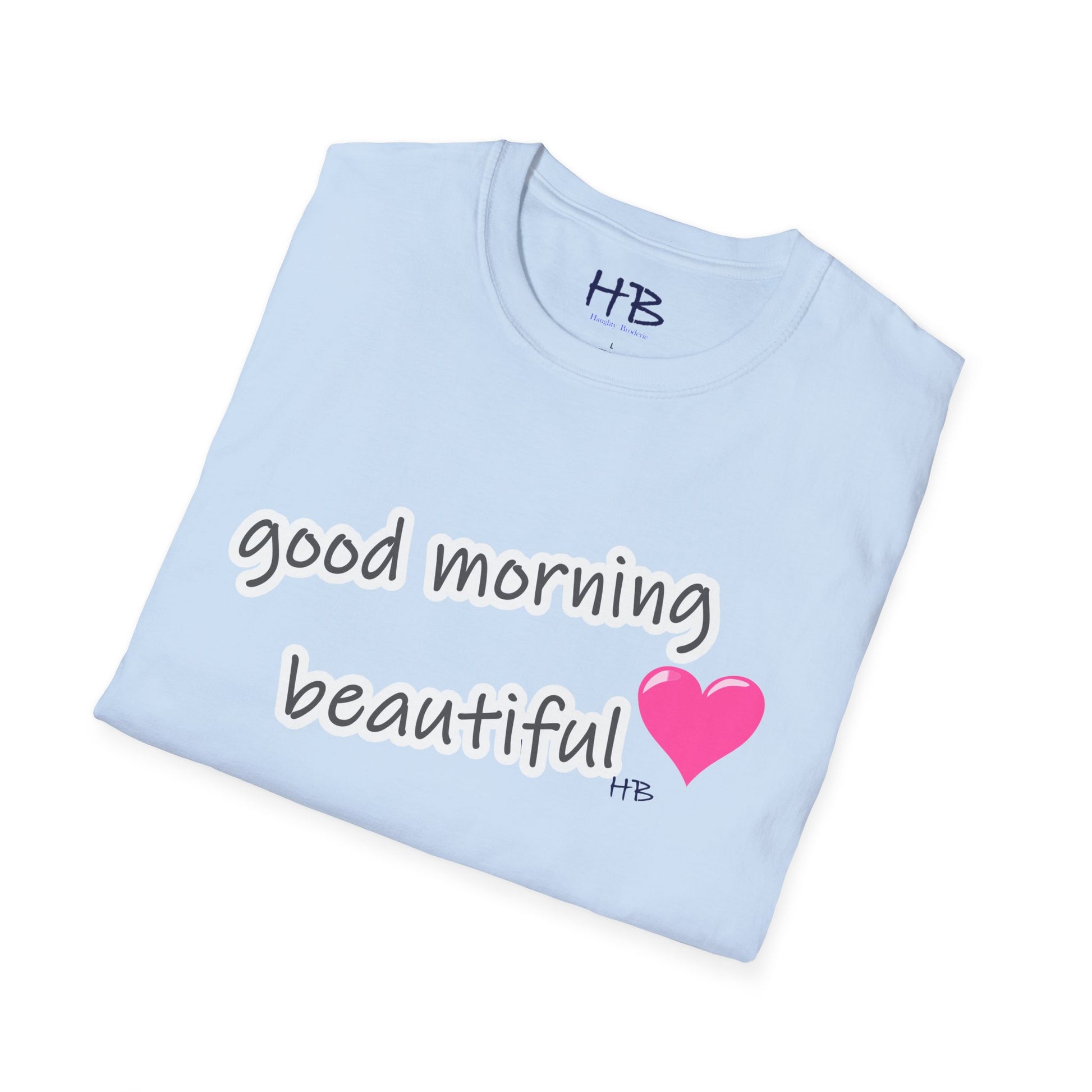 Introducing our fabulous tee shirt, a delightful garment that exudes positivity and spreads love in today's world. Designed with a charming text, it proudly displays the words "Good morning beautiful ❤" in a delightful shade of pink, radiating warmth and affection.