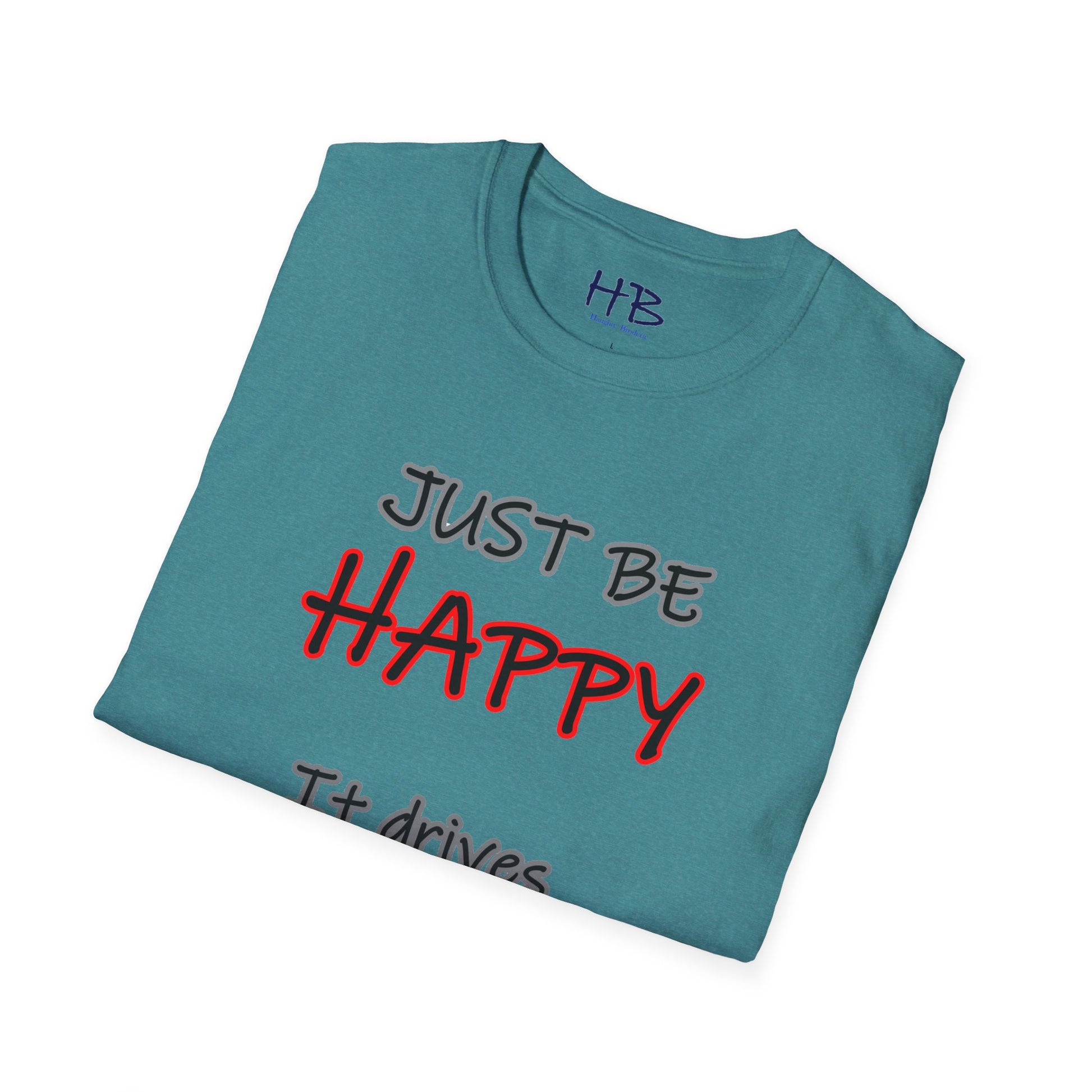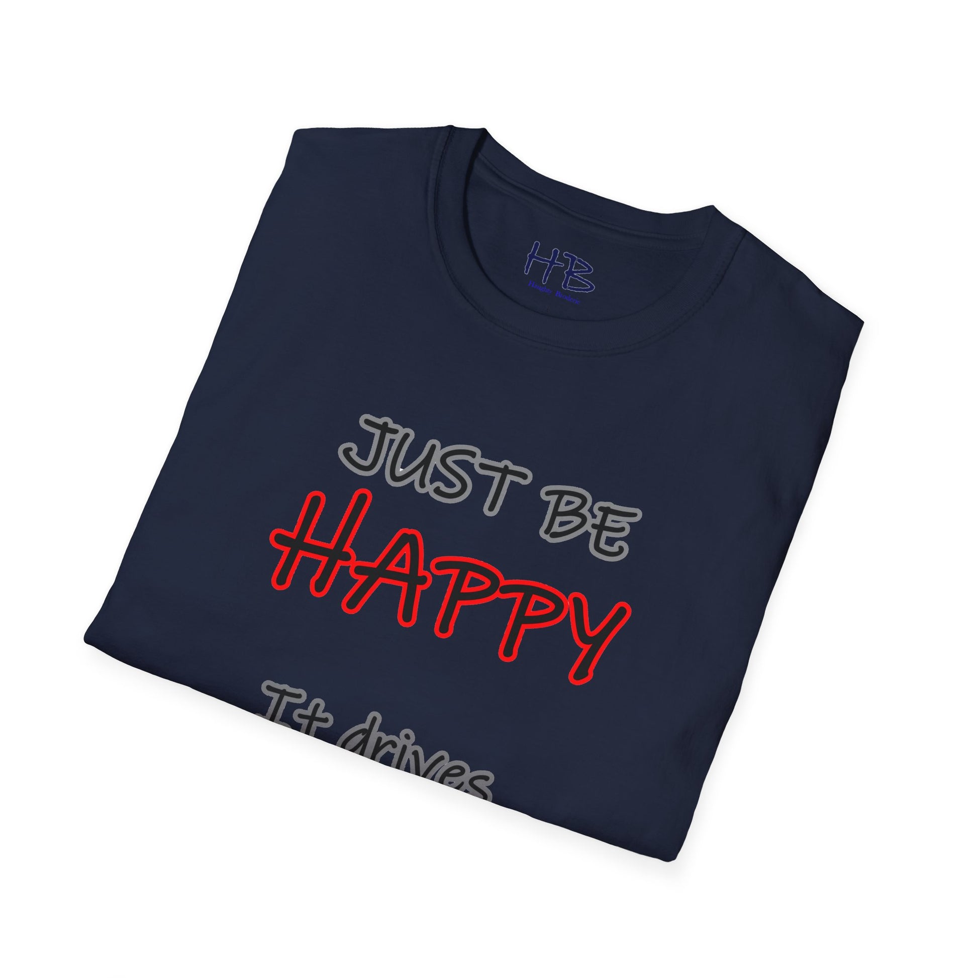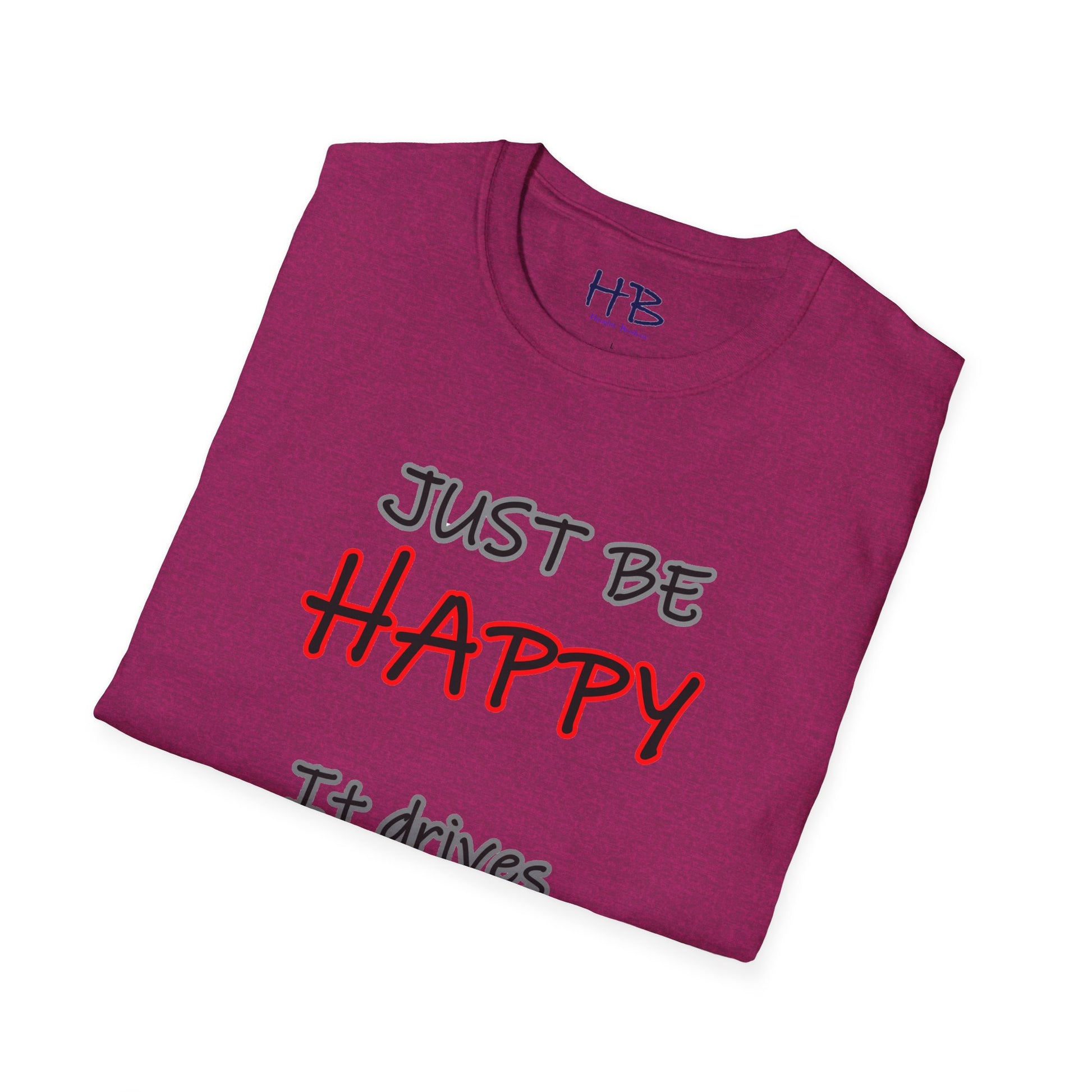 Introducing the epitome of casual chic apparel: a T-shirt that encapsulates the art of finding joy, living in contentment, and spreading positivity to the world. This exceptional garment features an empowering message that reads, "Just be HAPPY. It drives people crazy." This simple yet profound slogan embodies the philosophy of a life well-lived.