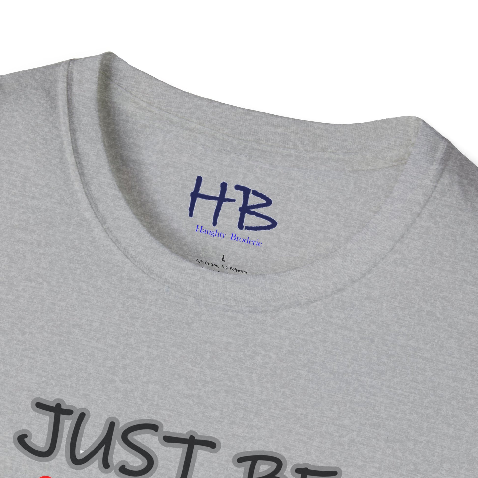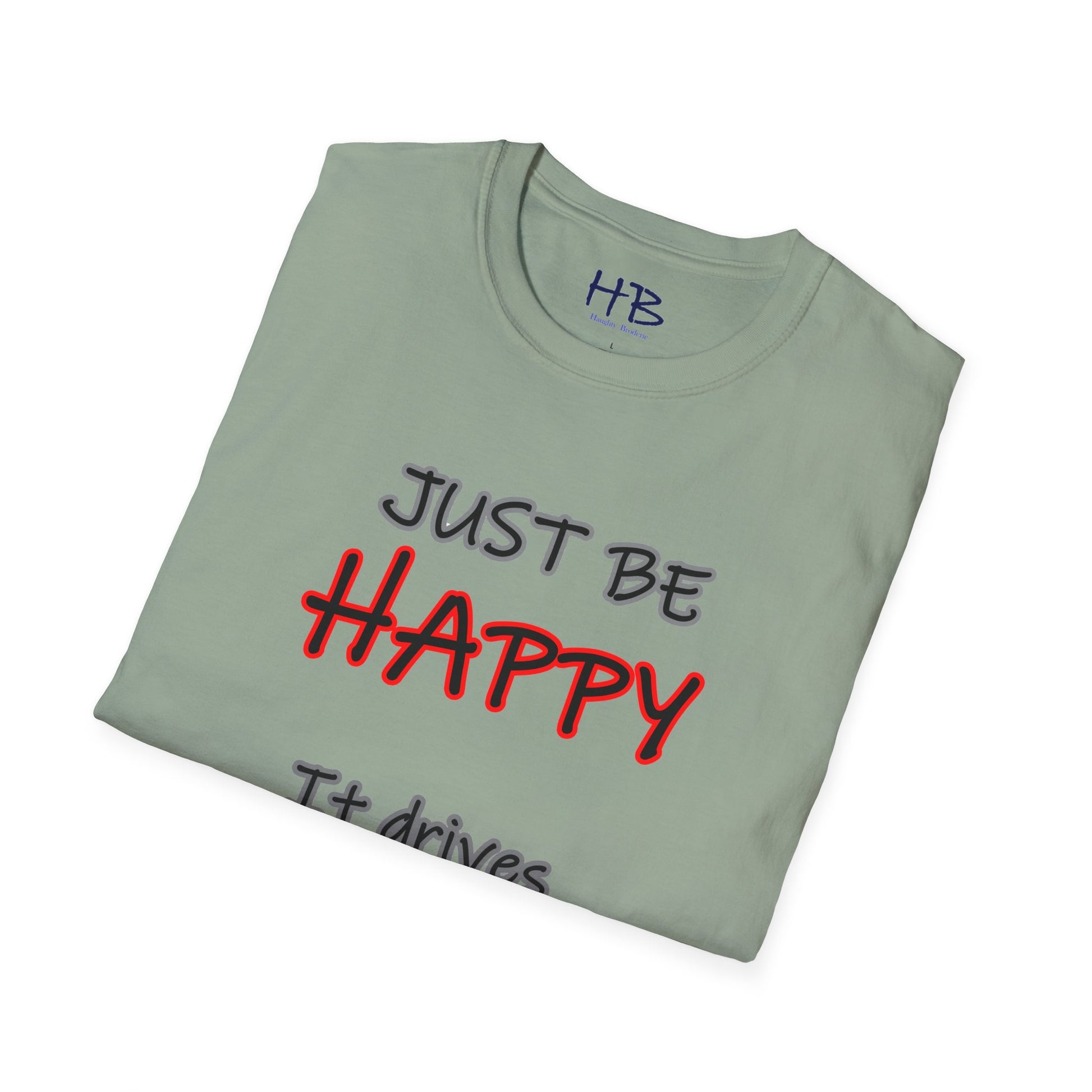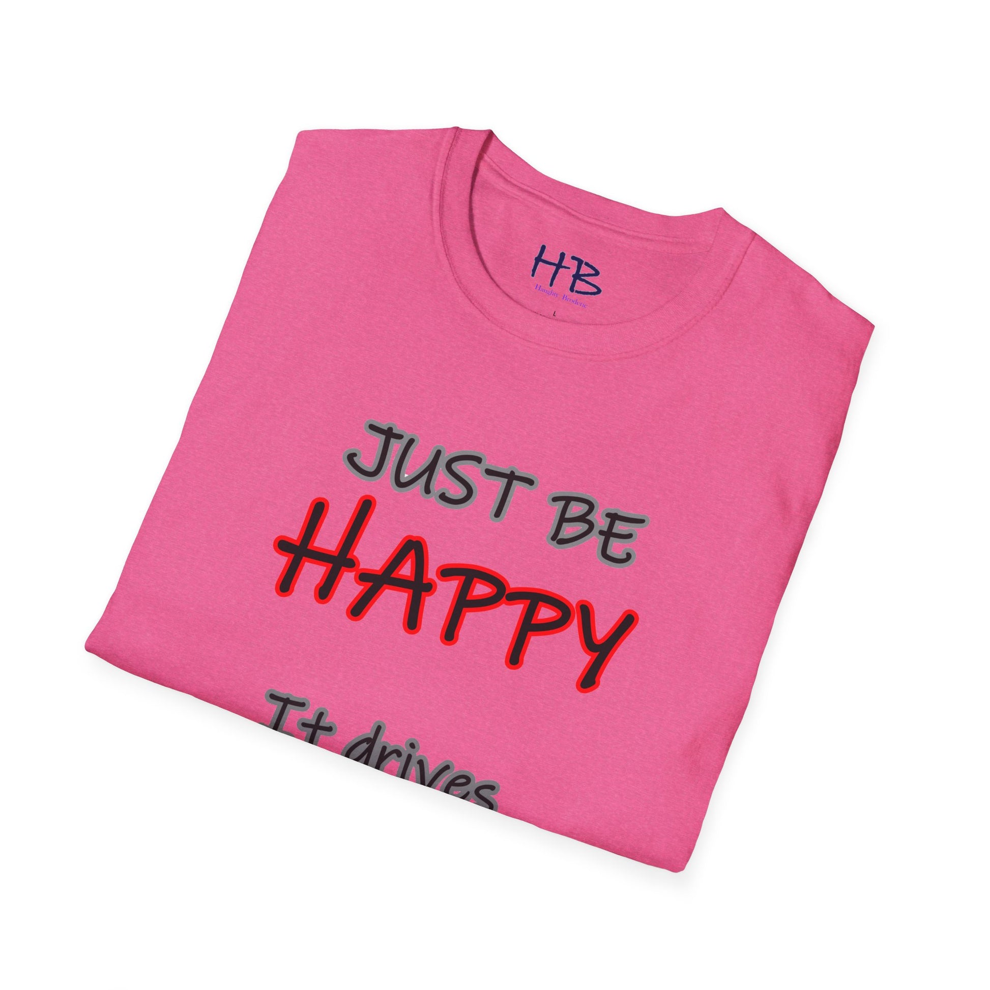 Introducing the epitome of casual chic apparel: a T-shirt that encapsulates the art of finding joy, living in contentment, and spreading positivity to the world. This exceptional garment features an empowering message that reads, "Just be HAPPY. It drives people crazy." This simple yet profound slogan embodies the philosophy of a life well-lived.