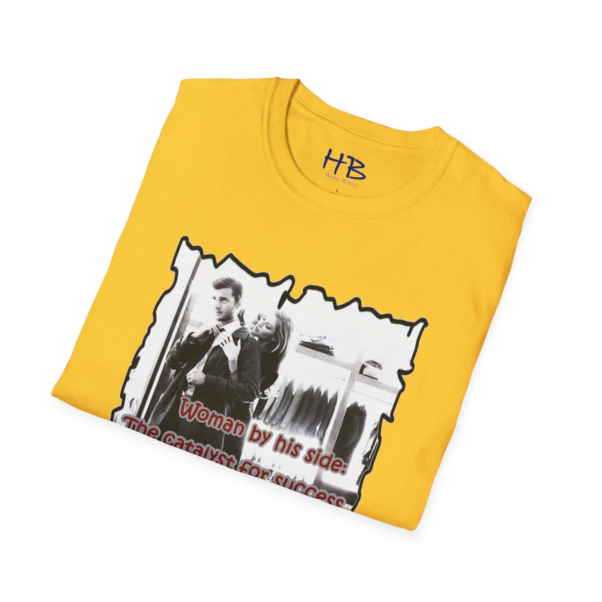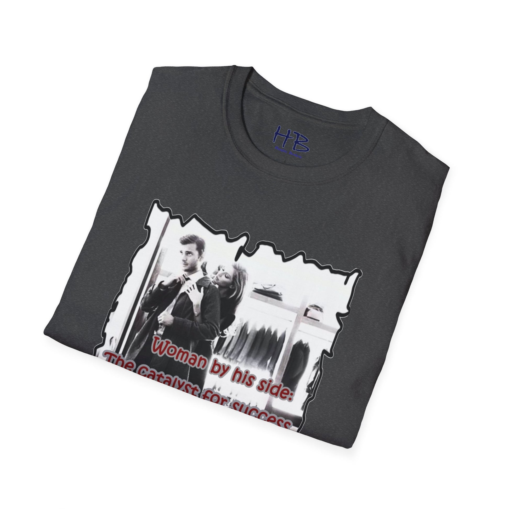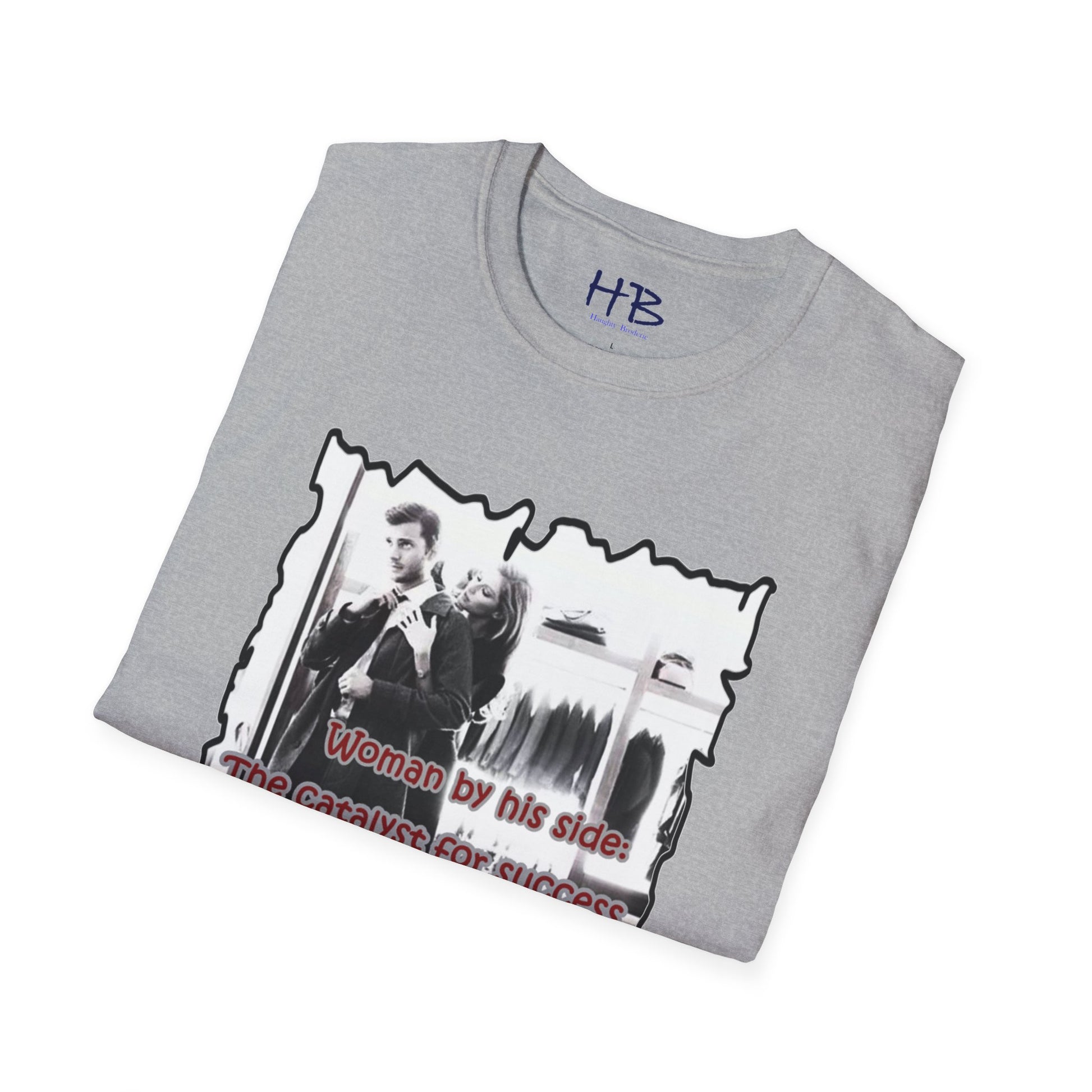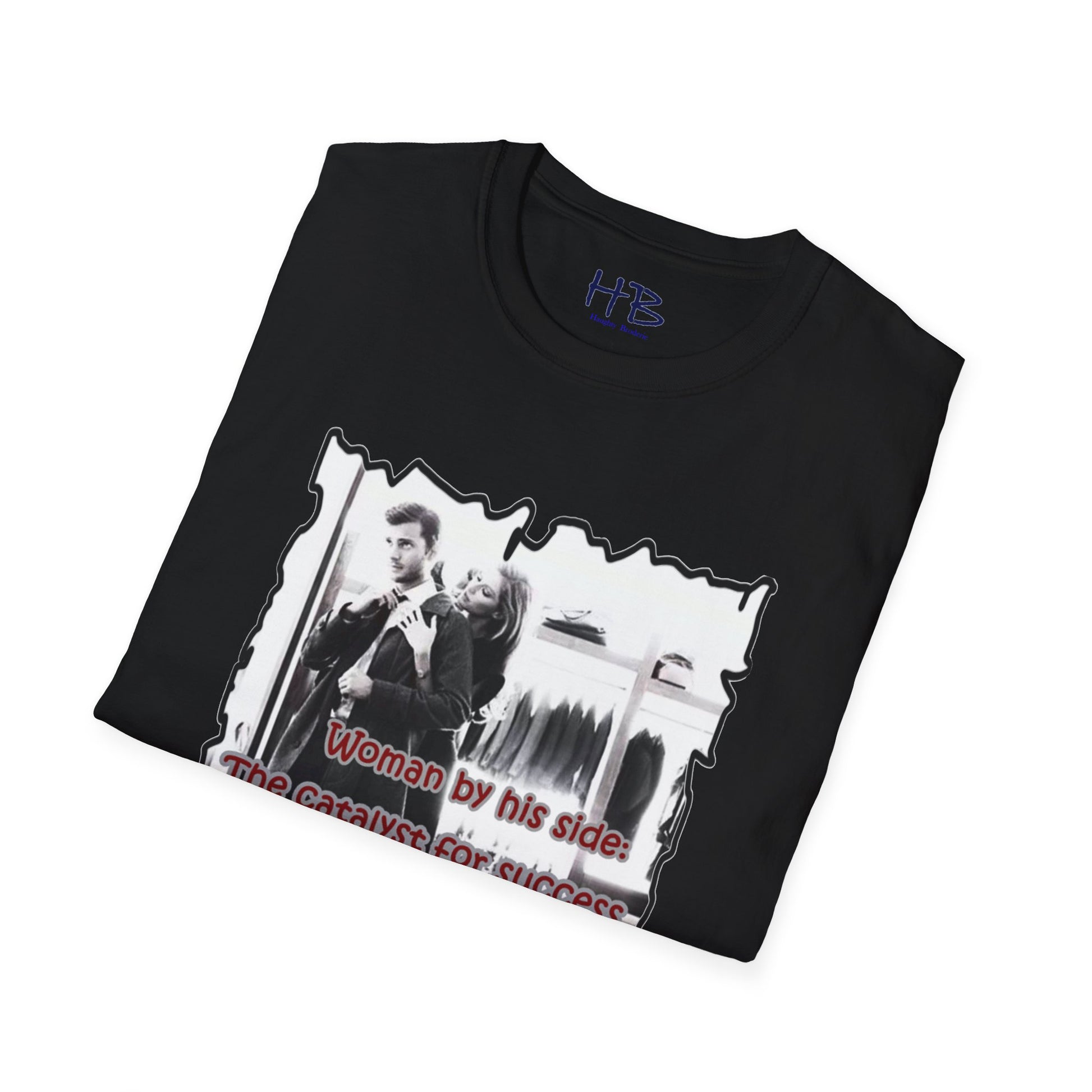 Embedded within the design, the text boldly declares, "Woman by his side: the catalyst for success." These words encapsulate the essence of the tee shirt, representing the profound impact that a woman's presence and support can have on a man's journey towards achieving his goals.