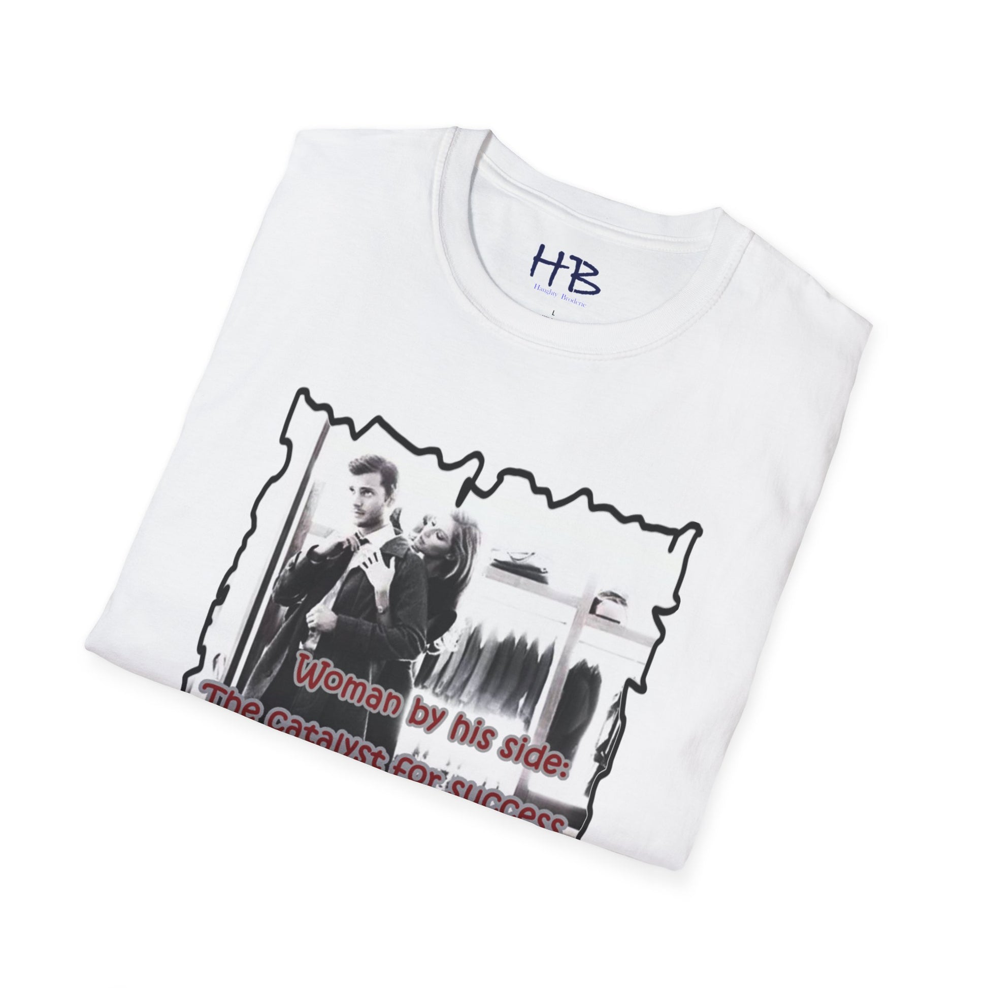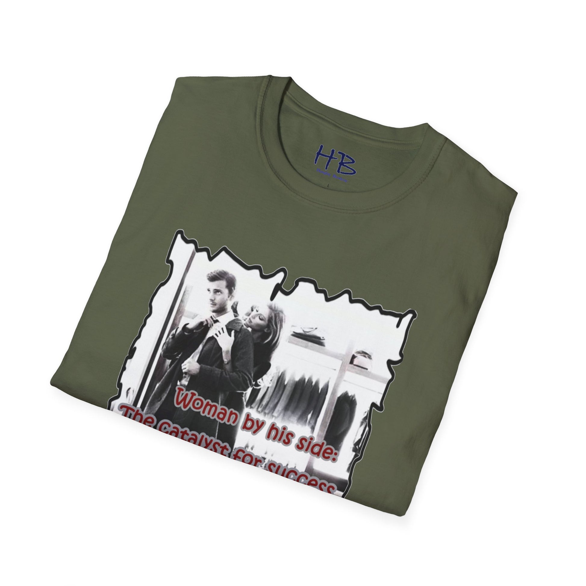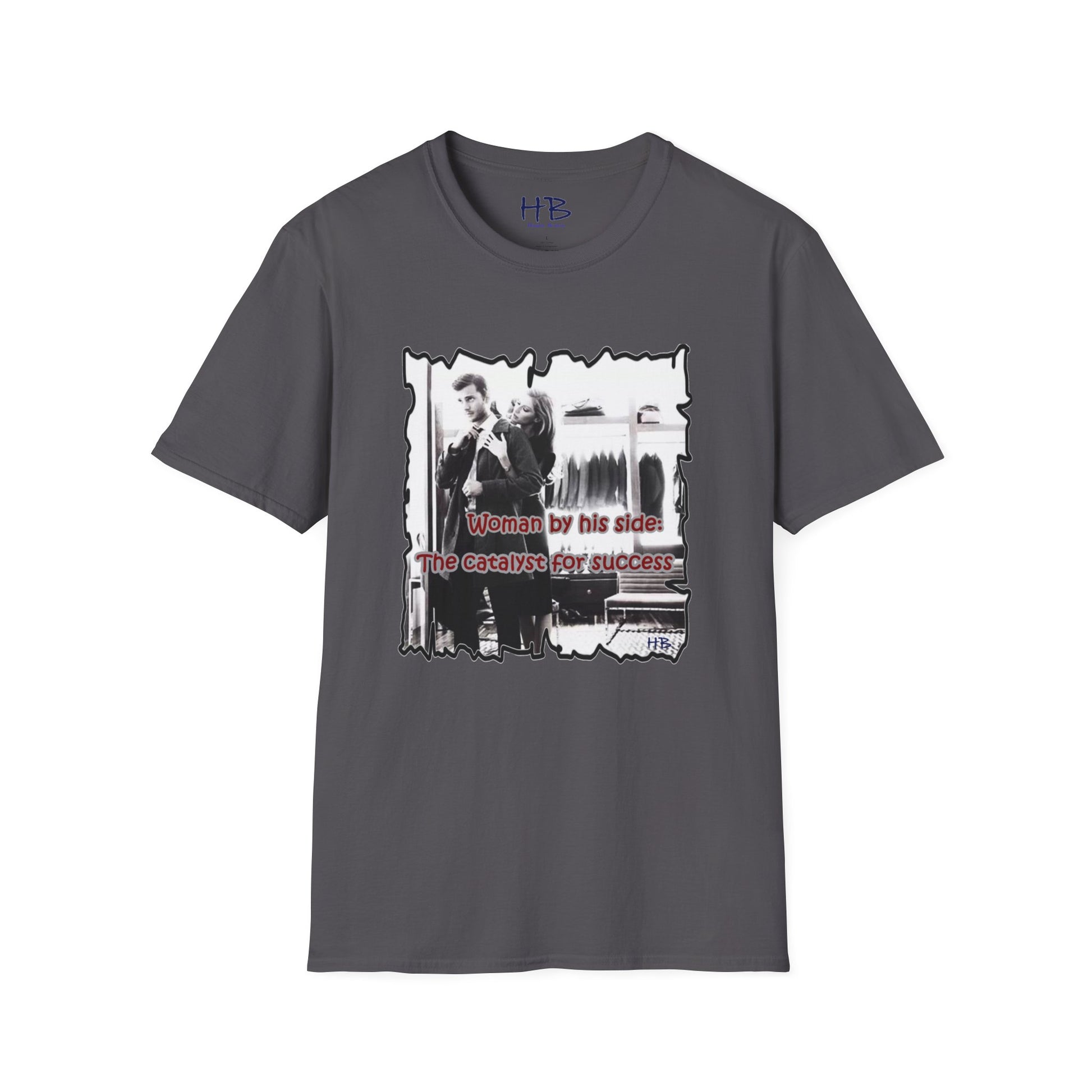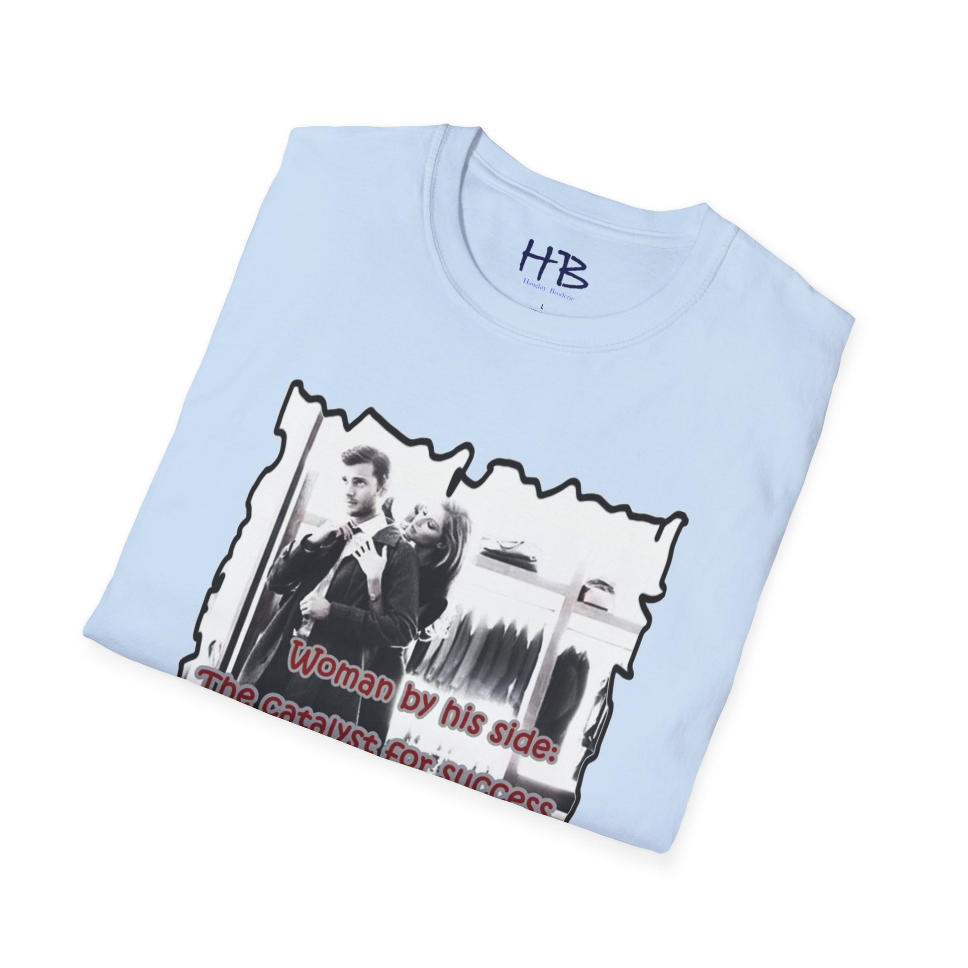 Embedded within the design, the text boldly declares, "Woman by his side: the catalyst for success." These words encapsulate the essence of the tee shirt, representing the profound impact that a woman's presence and support can have on a man's journey towards achieving his goals.