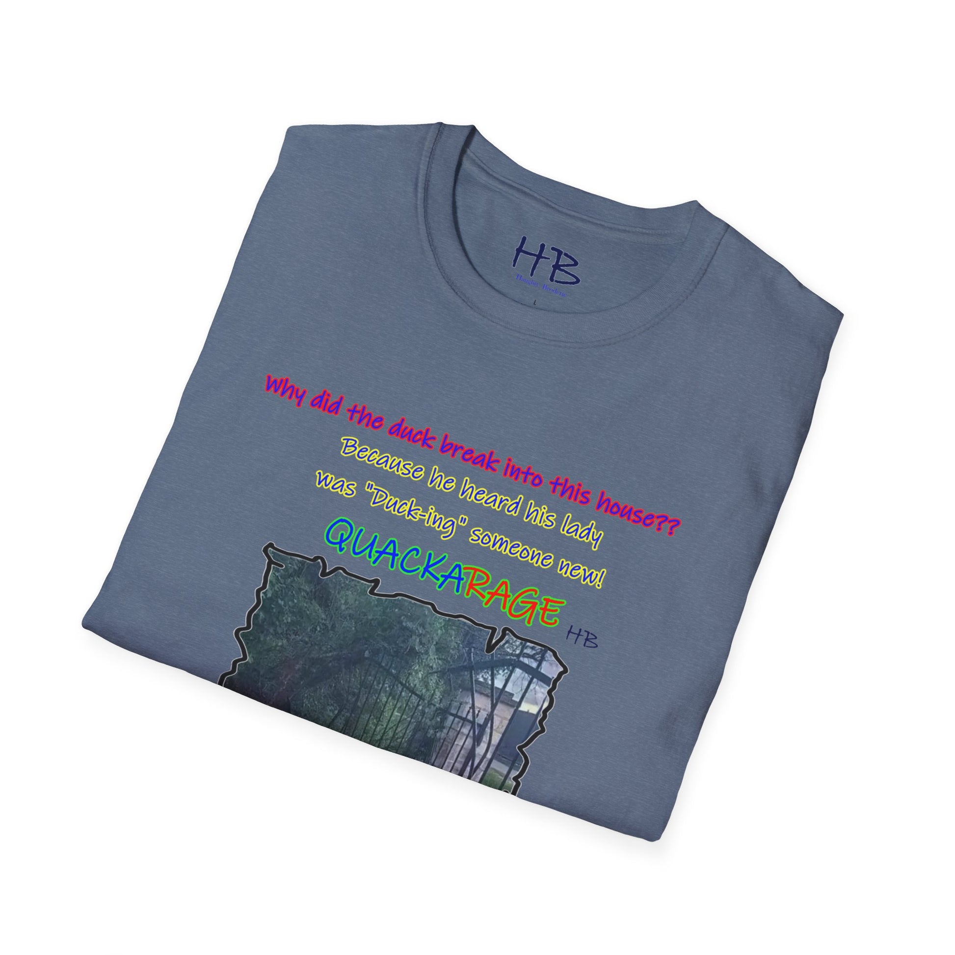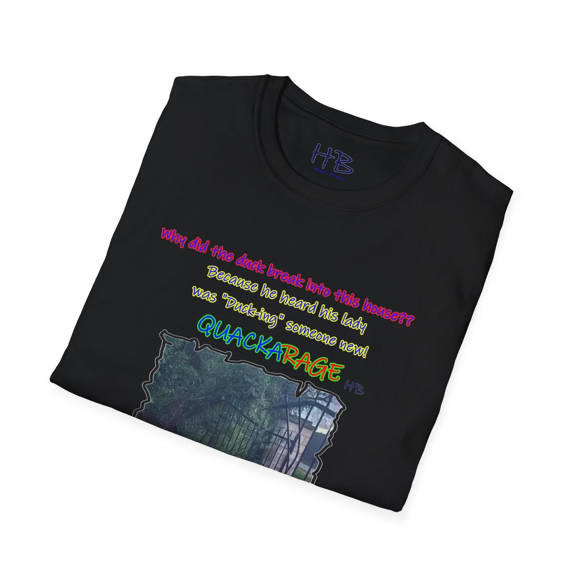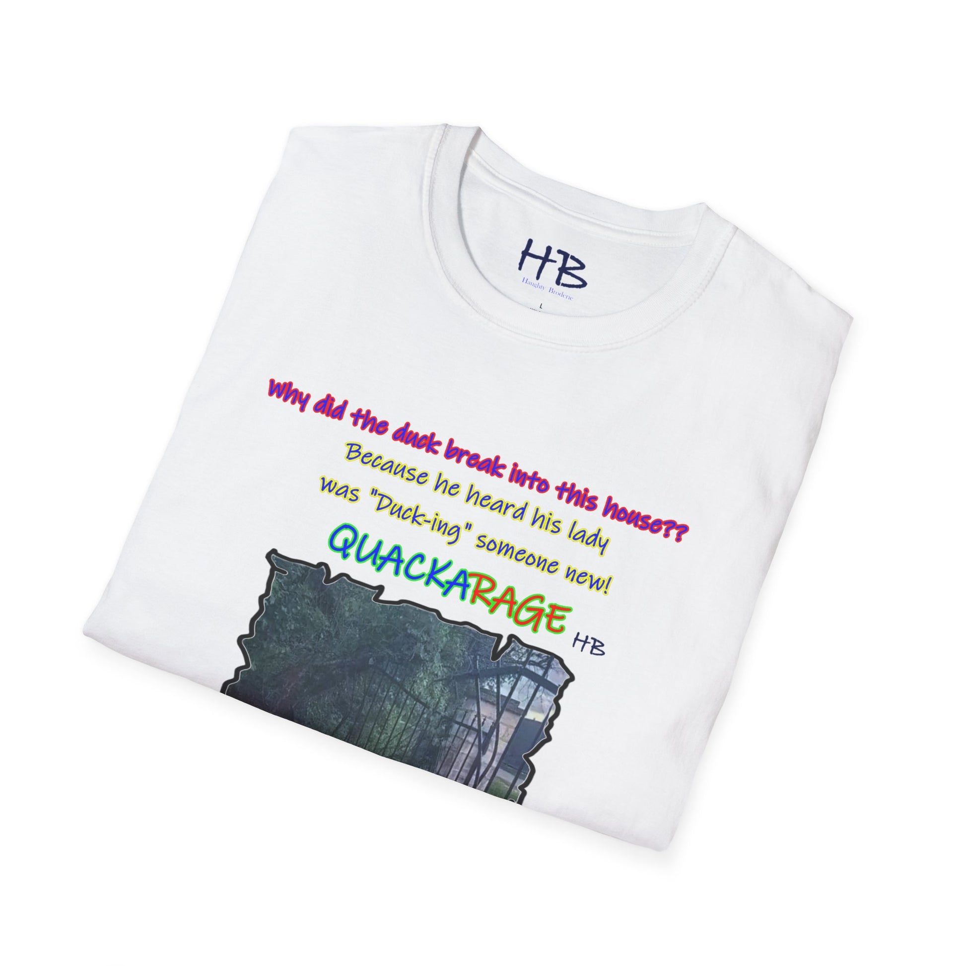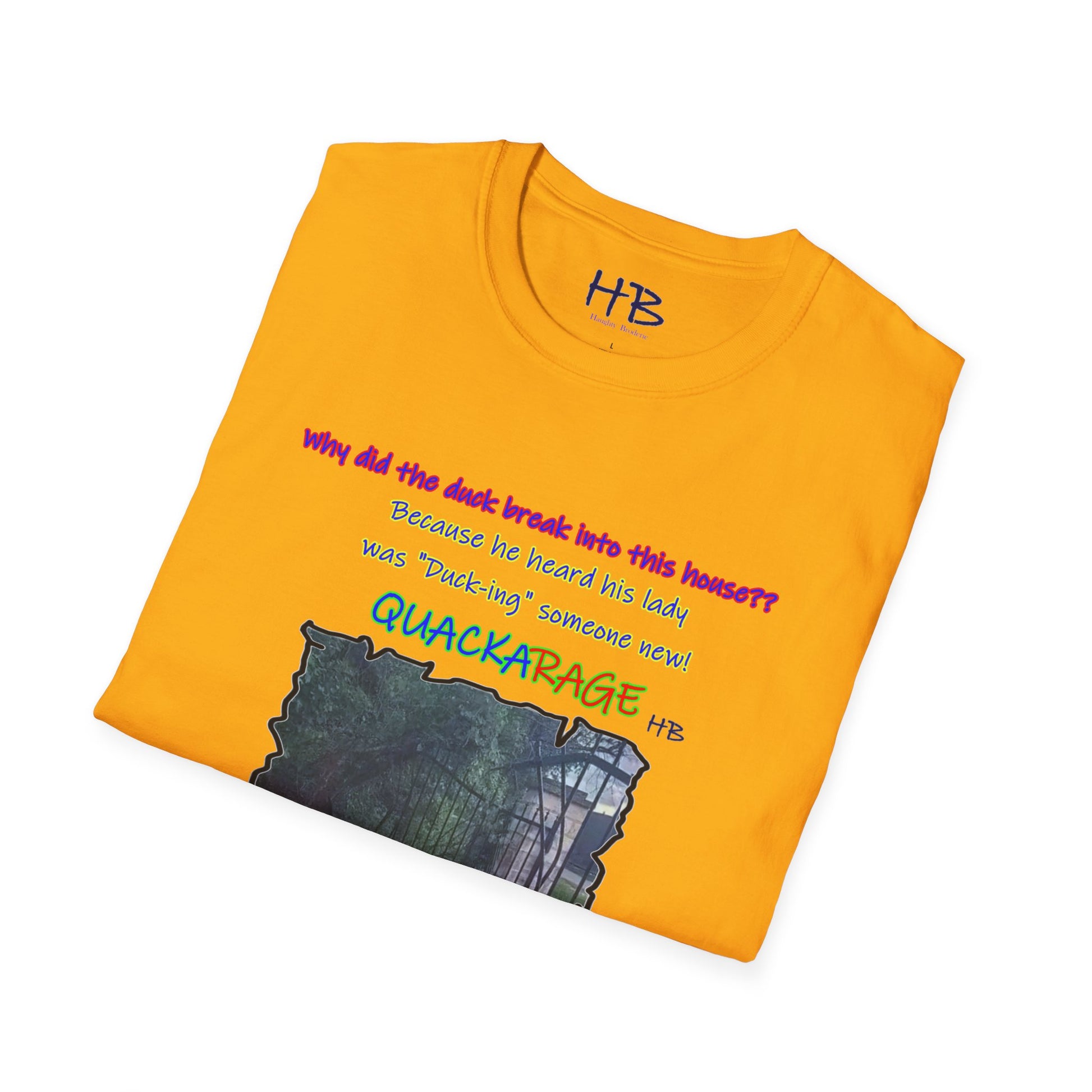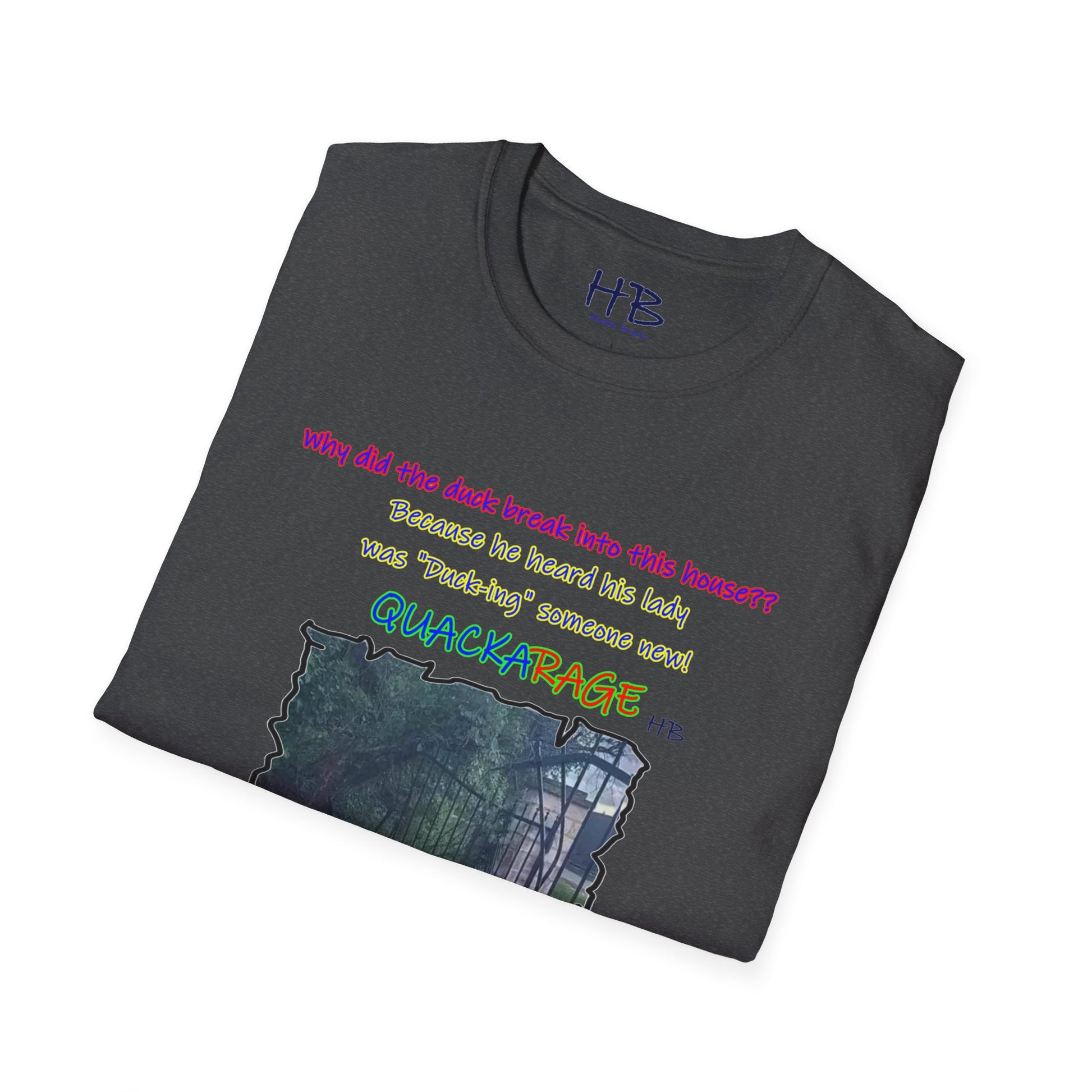 The message is clear - "Why did the duck break into this house? Because he heard his lady was 'duck-ing' someone new!! QUAACKARAGE." This witty and pun-filled design not only adds a touch of humor to your wardrobe but also reflects the modern world's need for a little lightheartedness.