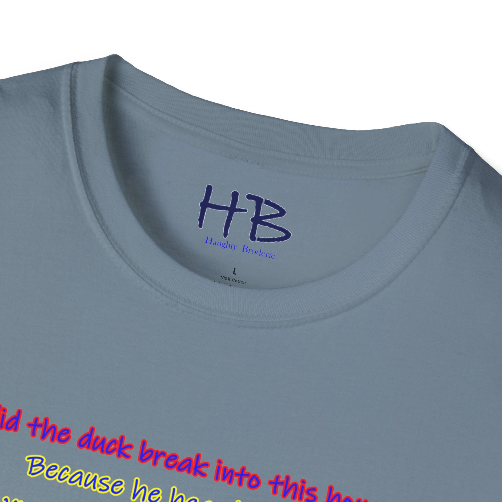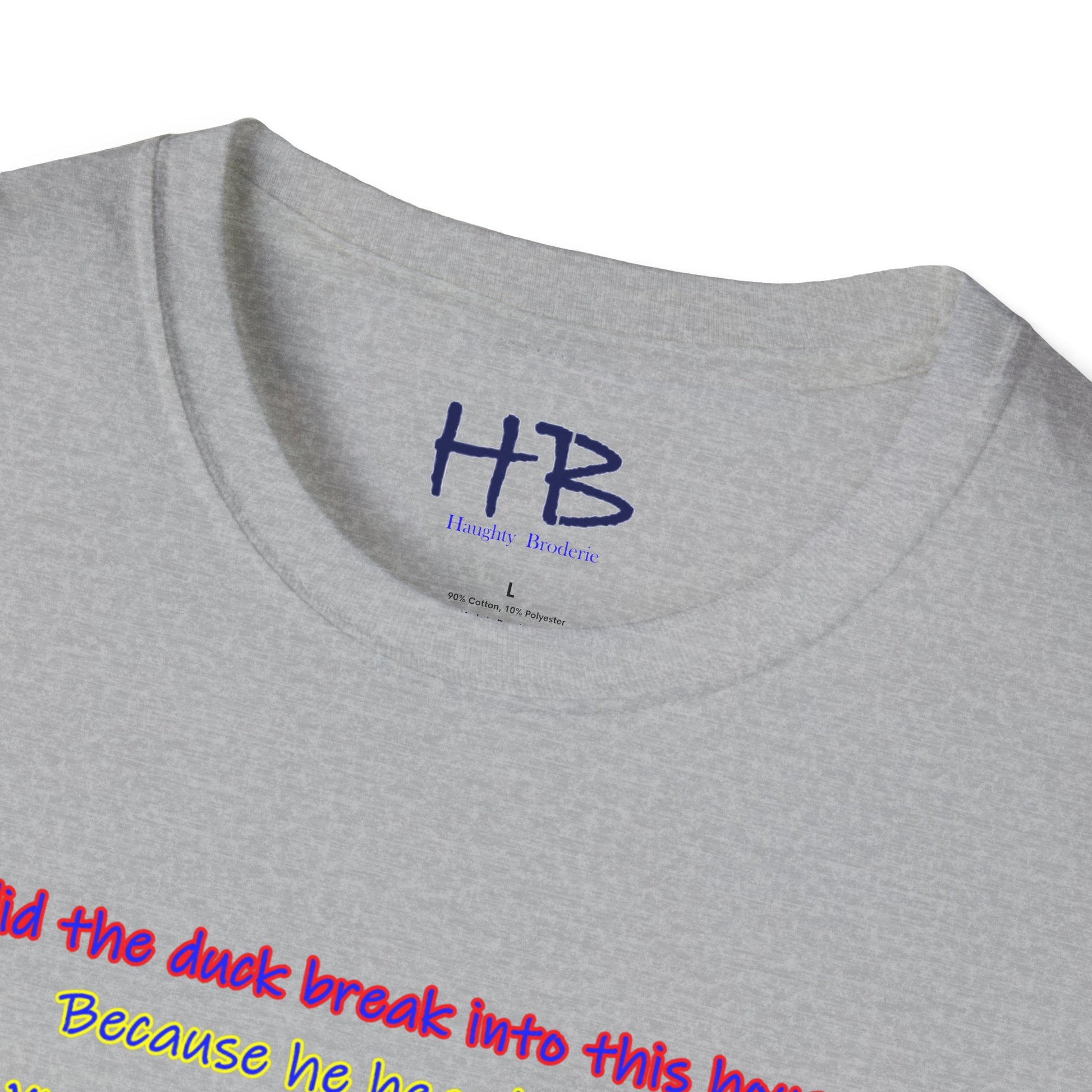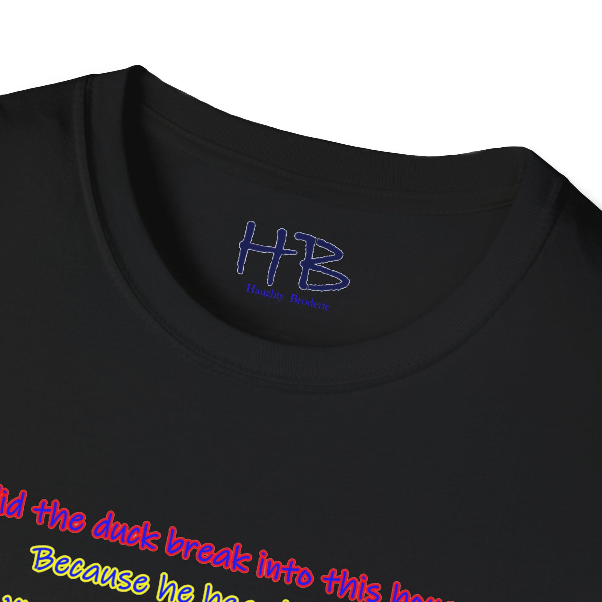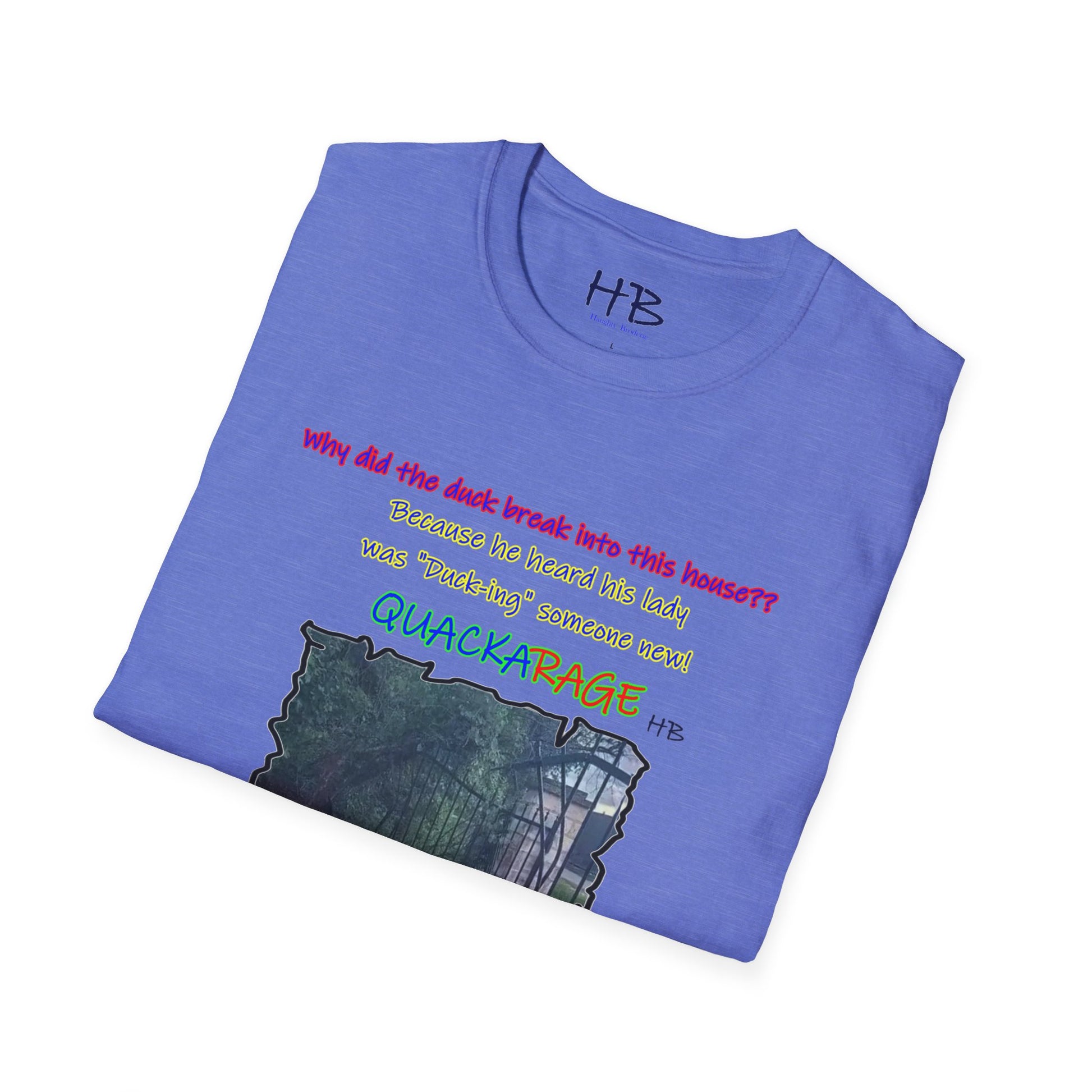 The message is clear - "Why did the duck break into this house? Because he heard his lady was 'duck-ing' someone new!! QUAACKARAGE." This witty and pun-filled design not only adds a touch of humor to your wardrobe but also reflects the modern world's need for a little lightheartedness.