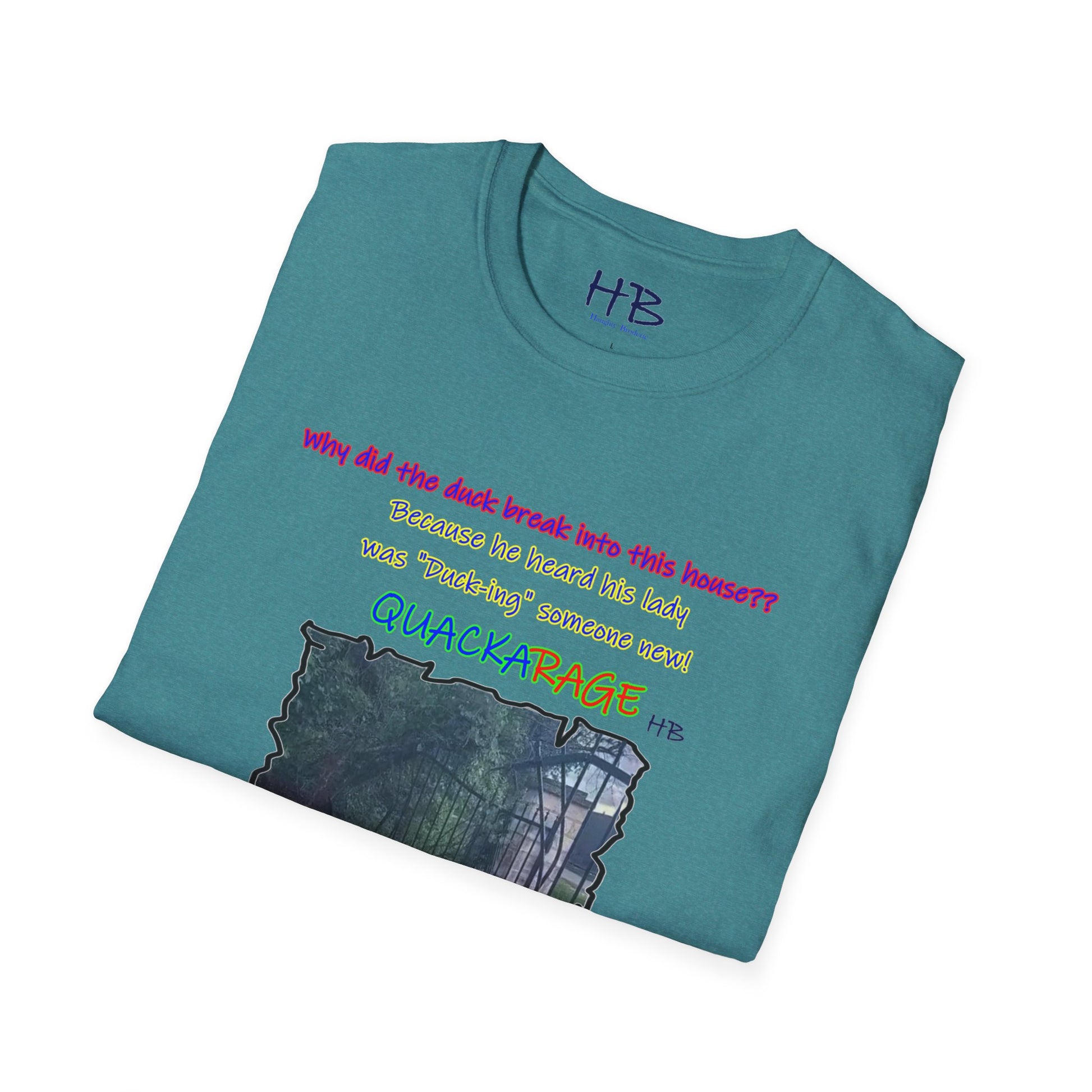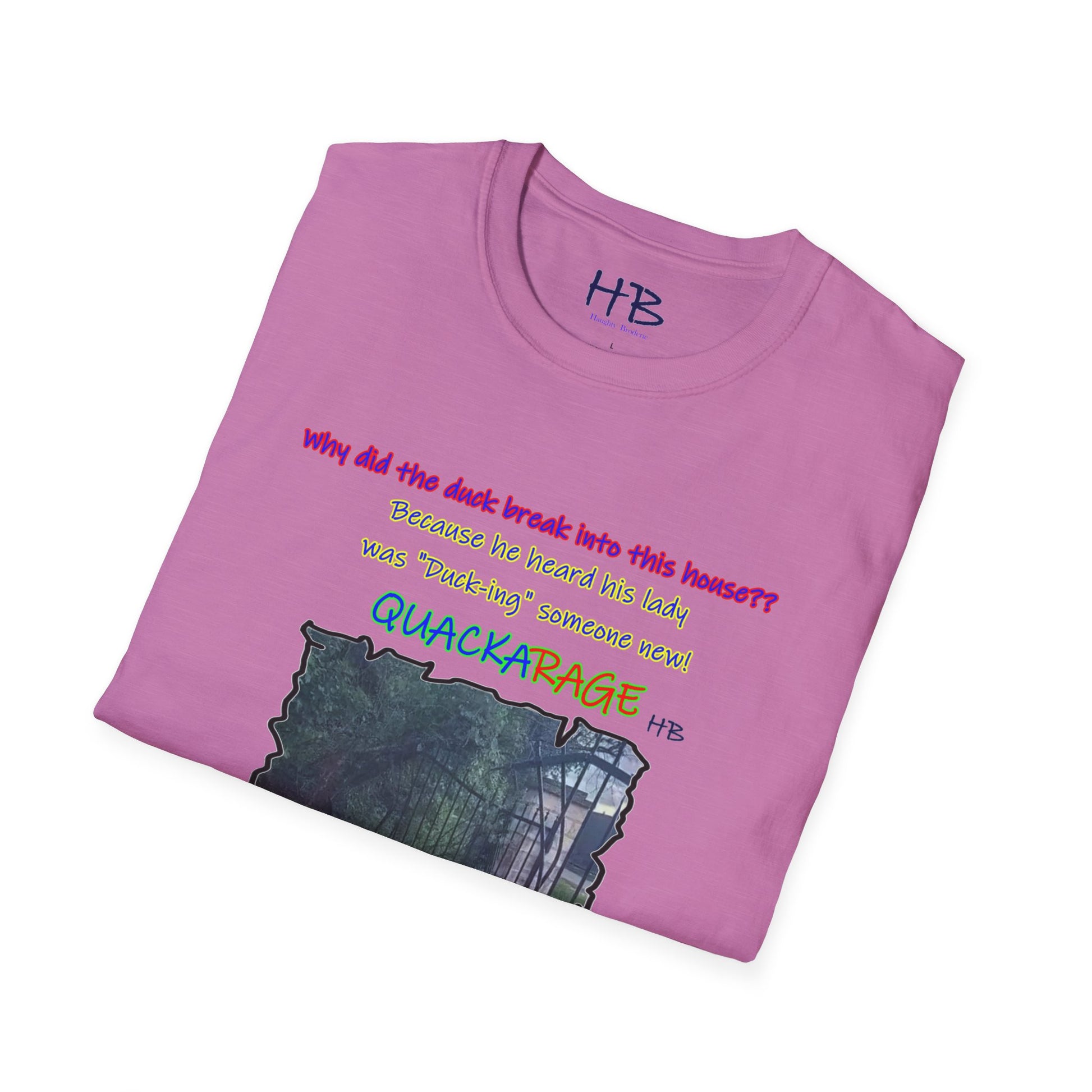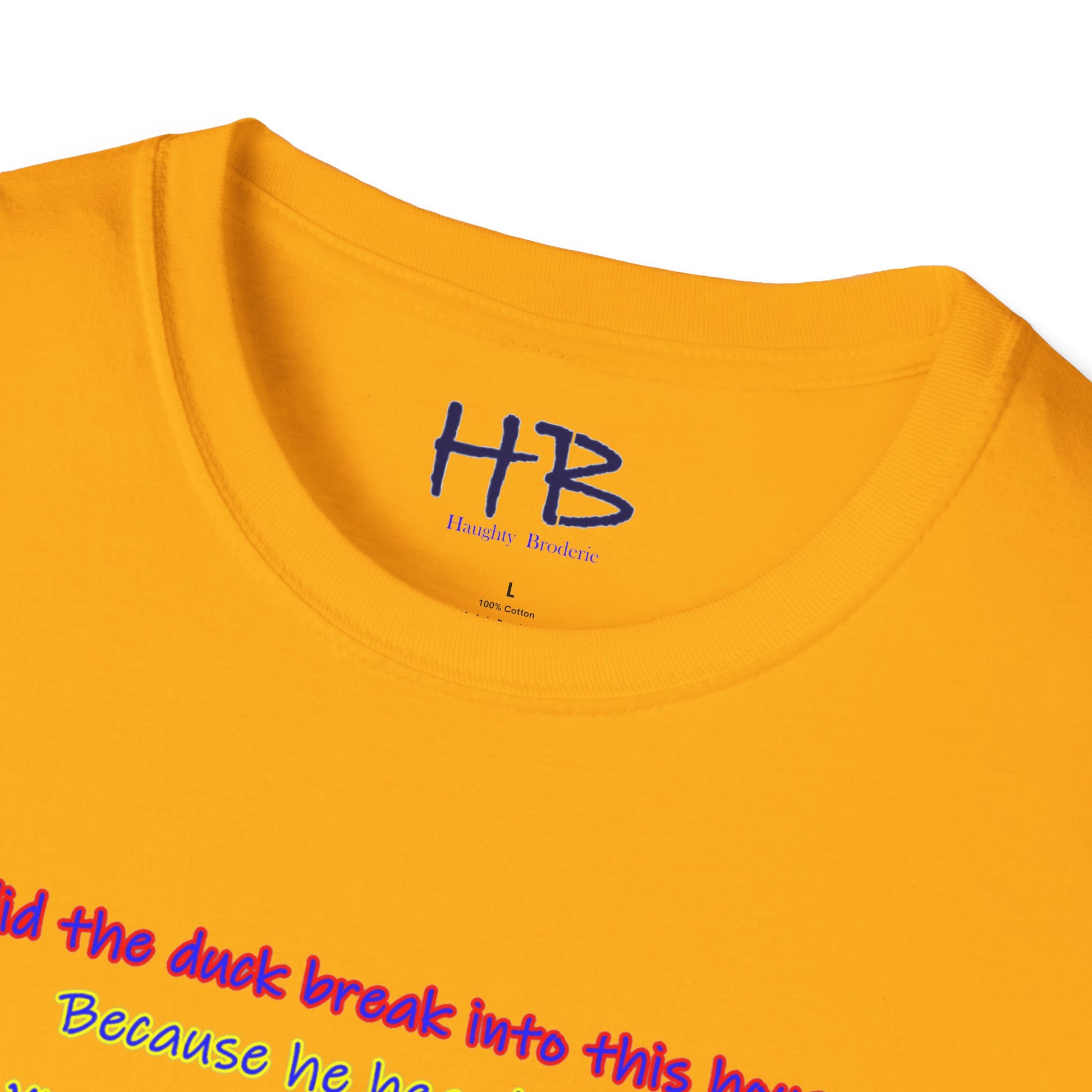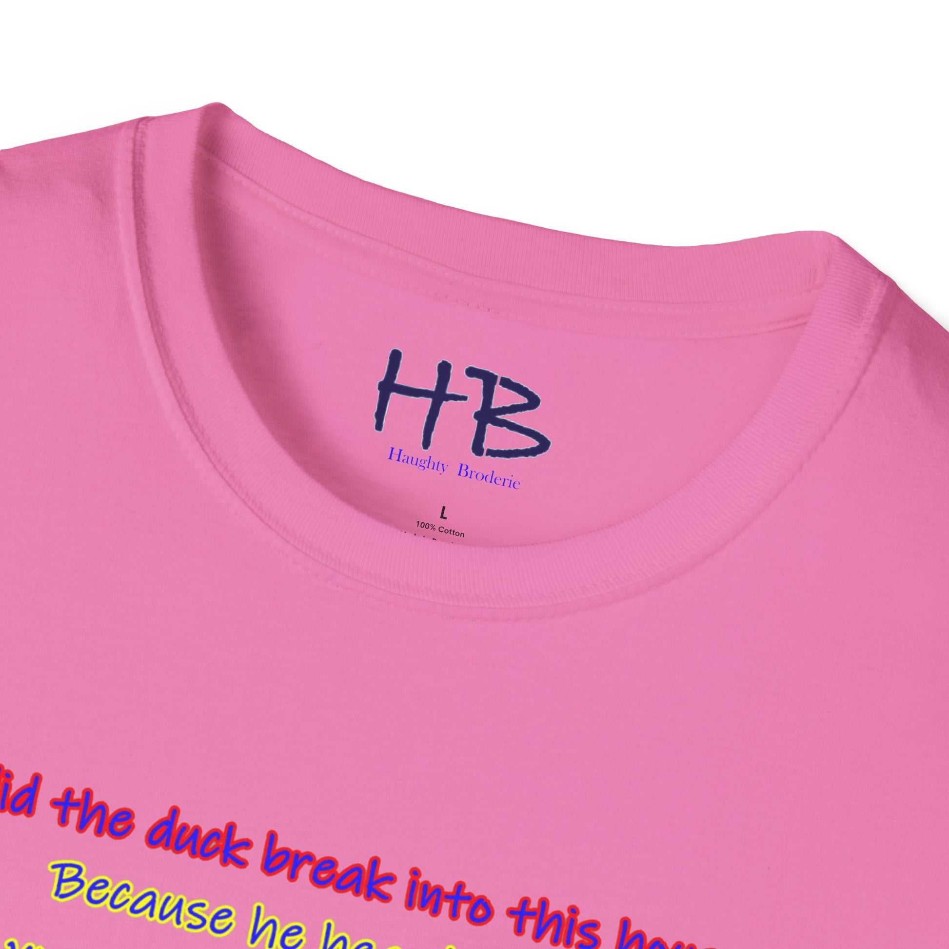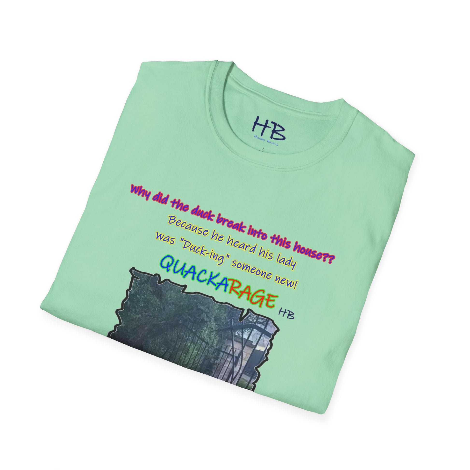 The message is clear - "Why did the duck break into this house? Because he heard his lady was 'duck-ing' someone new!! QUAACKARAGE." This witty and pun-filled design not only adds a touch of humor to your wardrobe but also reflects the modern world's need for a little lightheartedness.