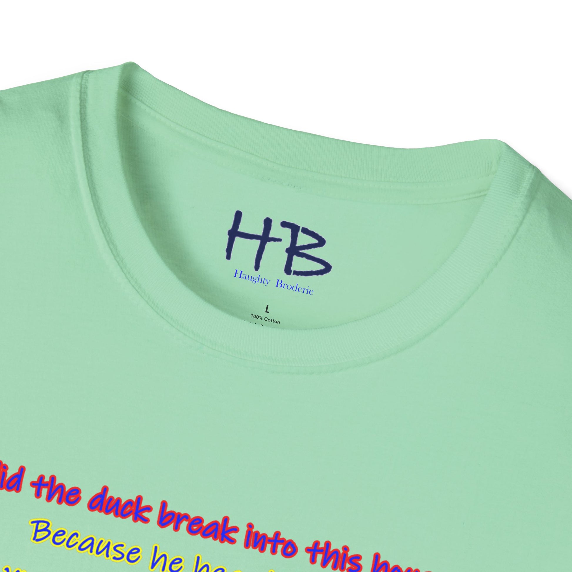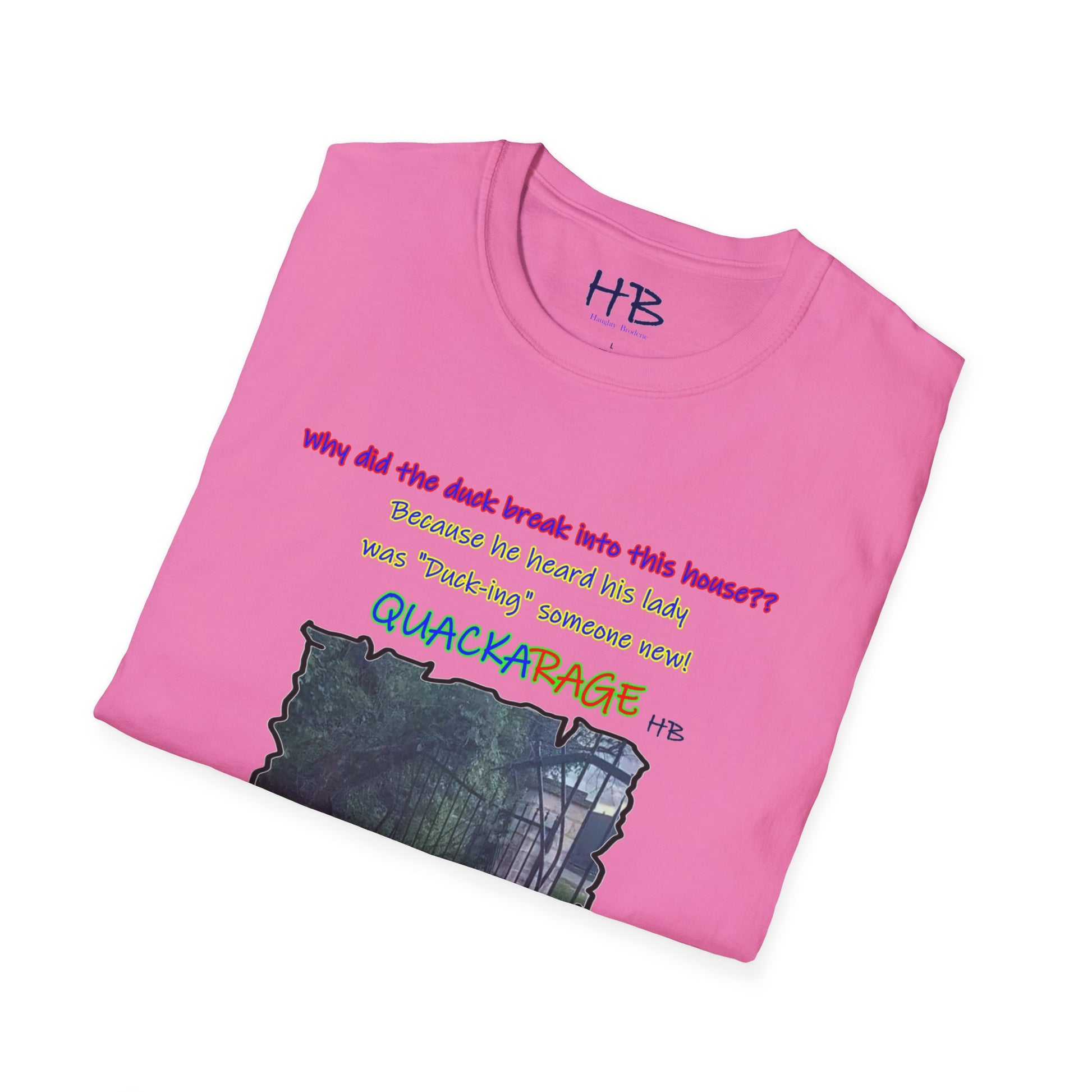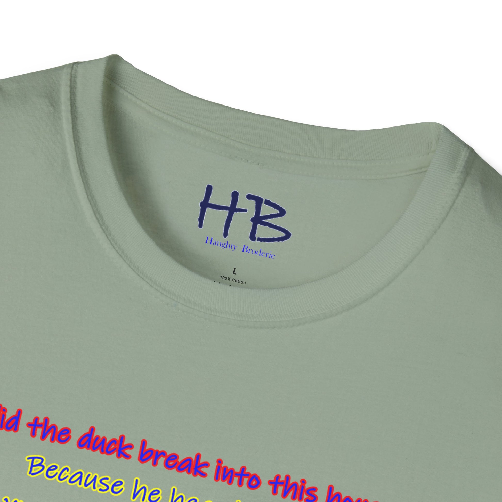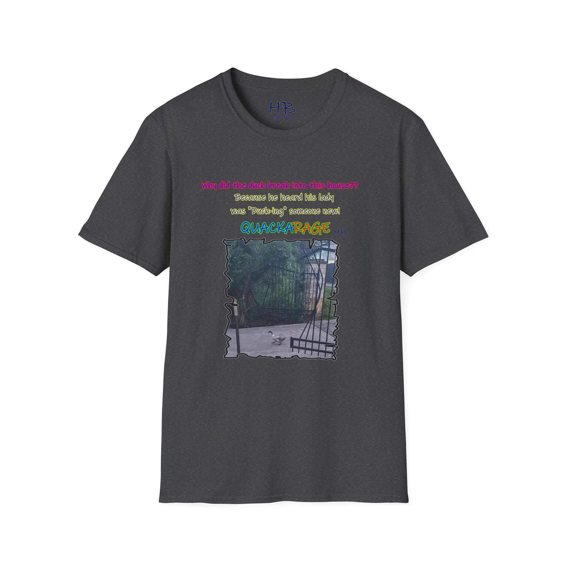 The message is clear - "Why did the duck break into this house? Because he heard his lady was 'duck-ing' someone new!! QUAACKARAGE." This witty and pun-filled design not only adds a touch of humor to your wardrobe but also reflects the modern world's need for a little lightheartedness.