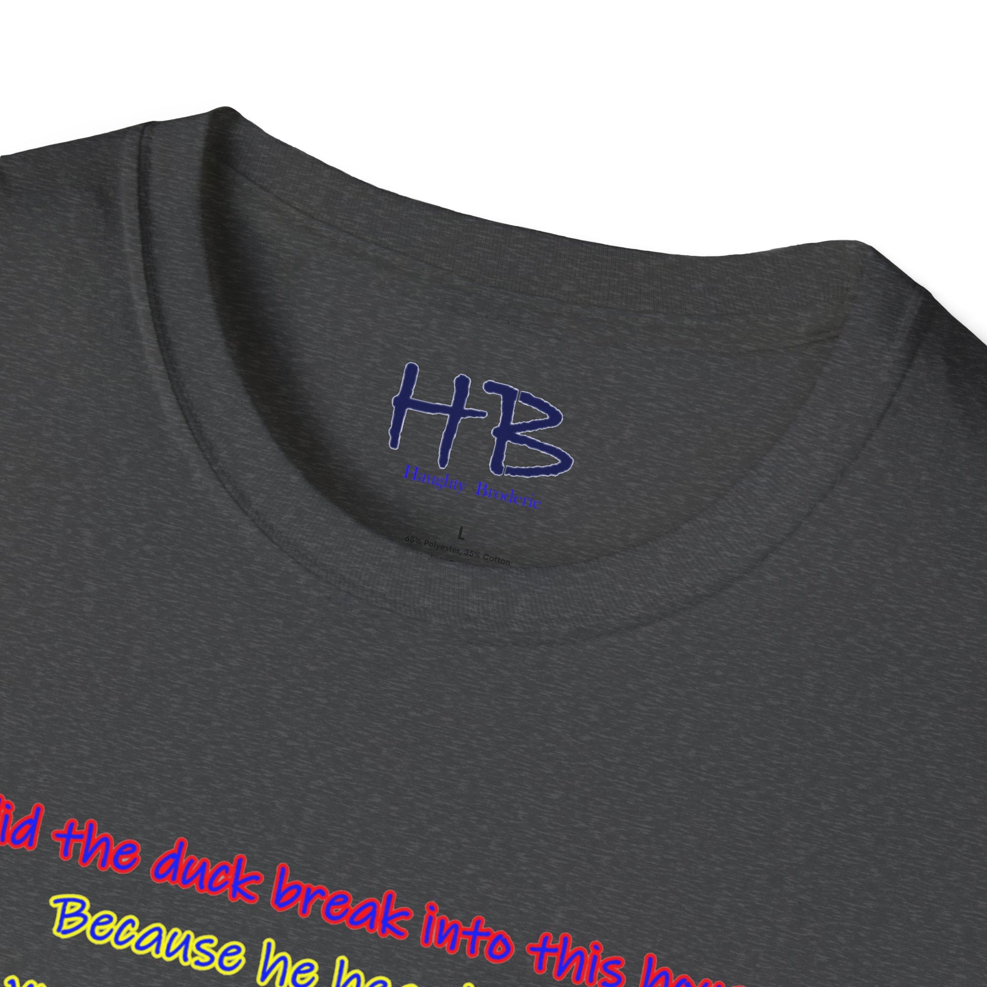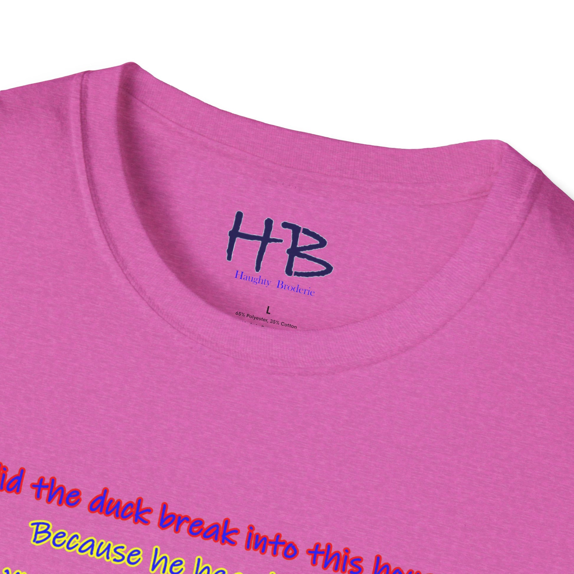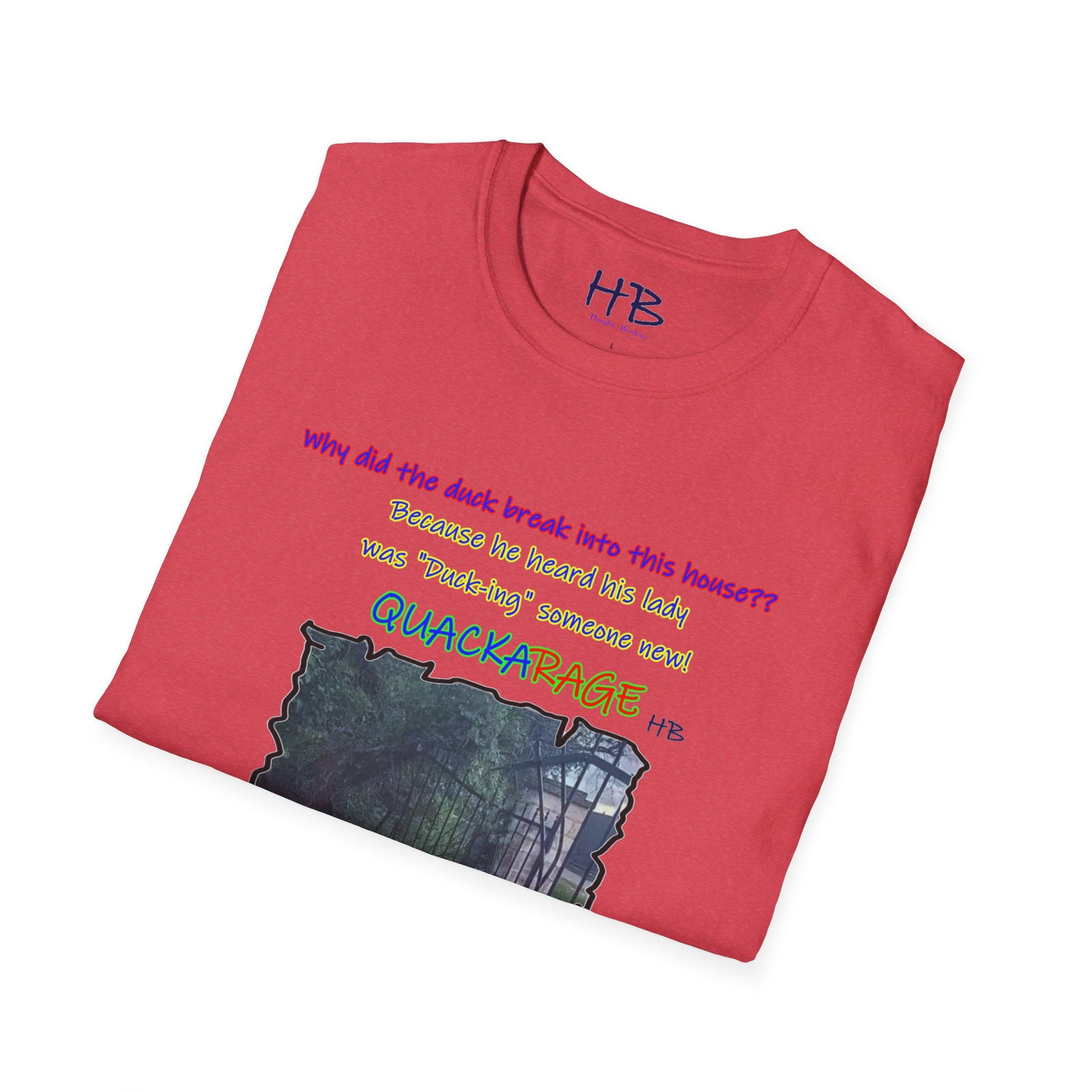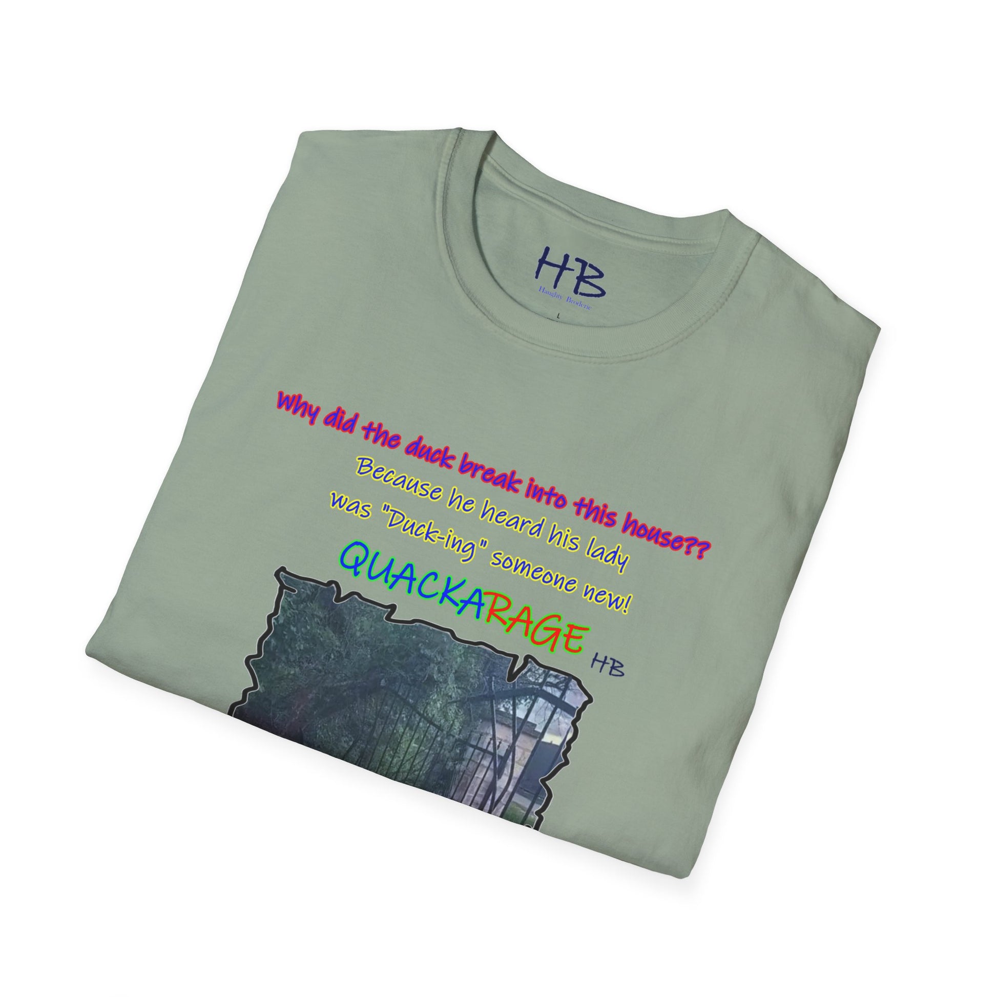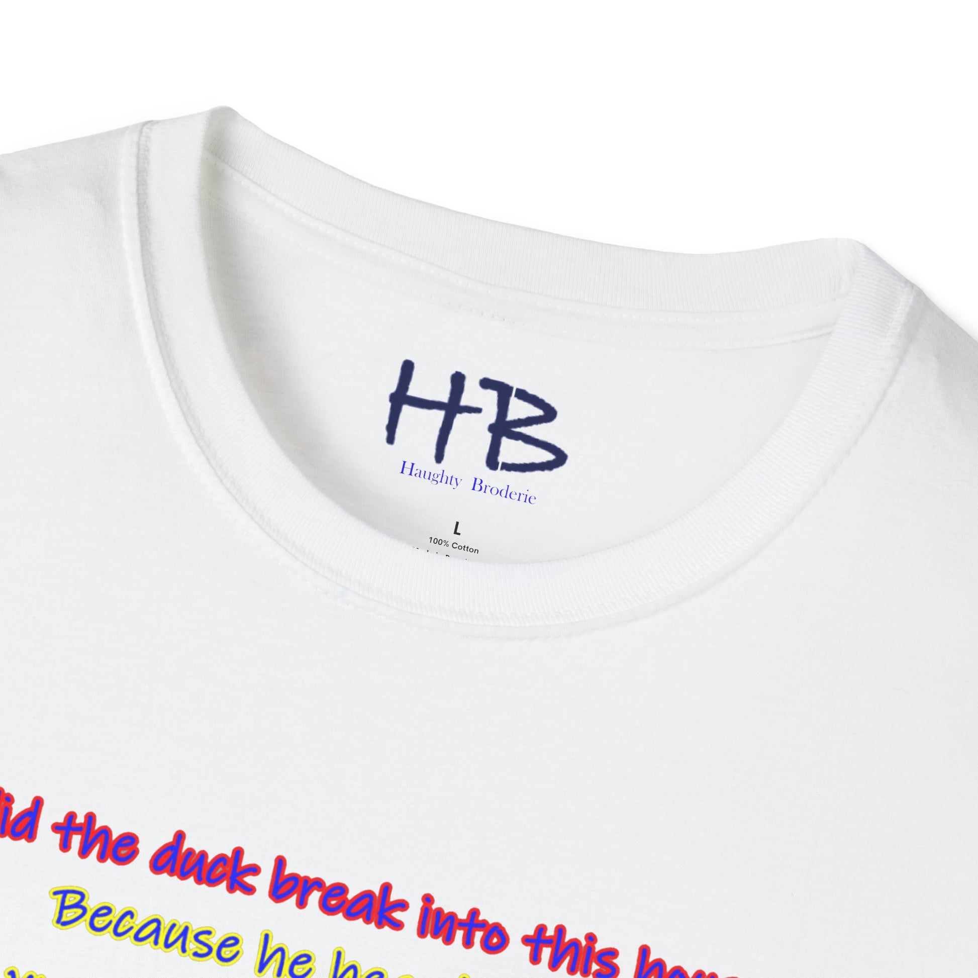 The message is clear - "Why did the duck break into this house? Because he heard his lady was 'duck-ing' someone new!! QUAACKARAGE." This witty and pun-filled design not only adds a touch of humor to your wardrobe but also reflects the modern world's need for a little lightheartedness.
