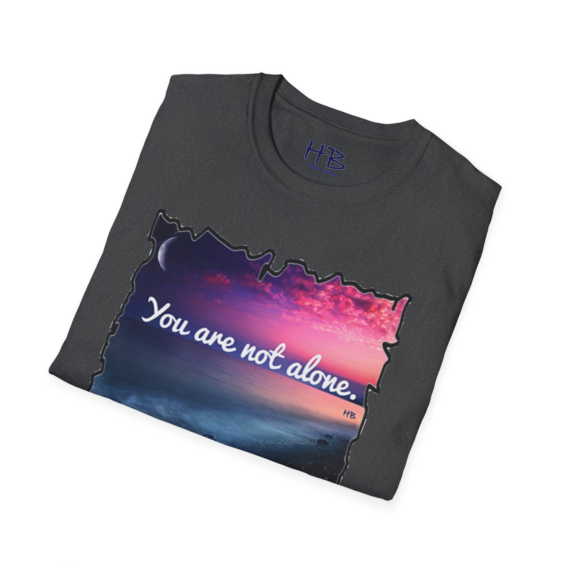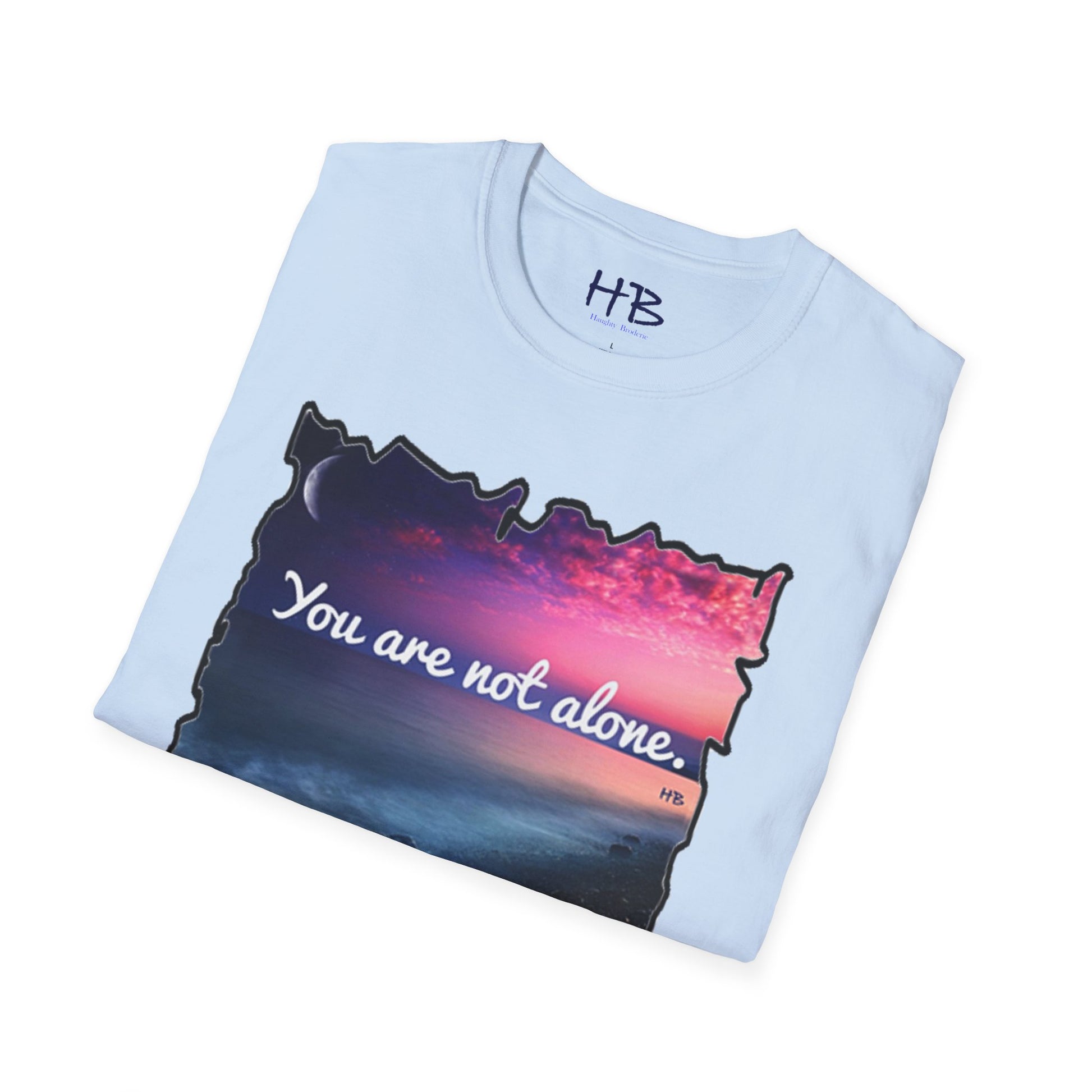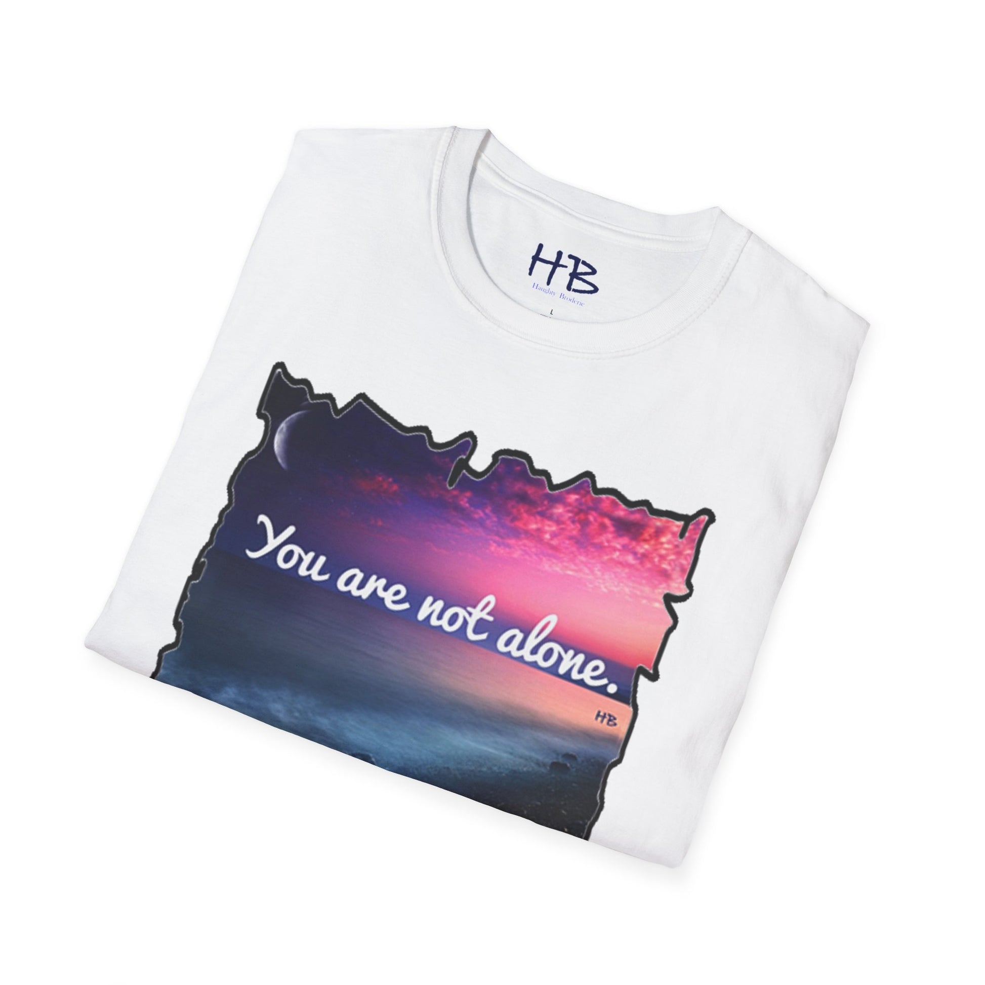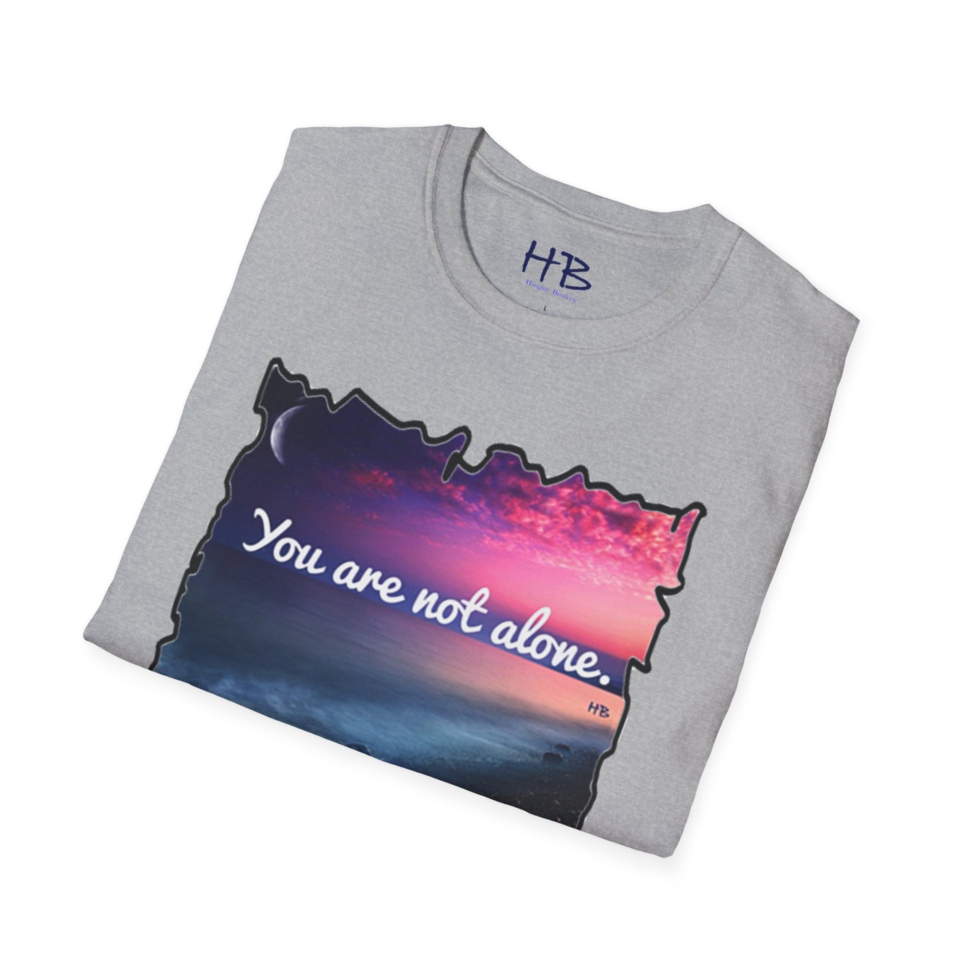 Introducing our stunning garment showcasing a captivating pink sky with a crescent moon gracefully resting on the horizon. This picturesque scene is complemented by rocky sands being gently embraced by the rhythmic caress of ocean waves. As you explore this visually enchanting tee shirt, you'll discover a profound message that reads, "You are not alone."