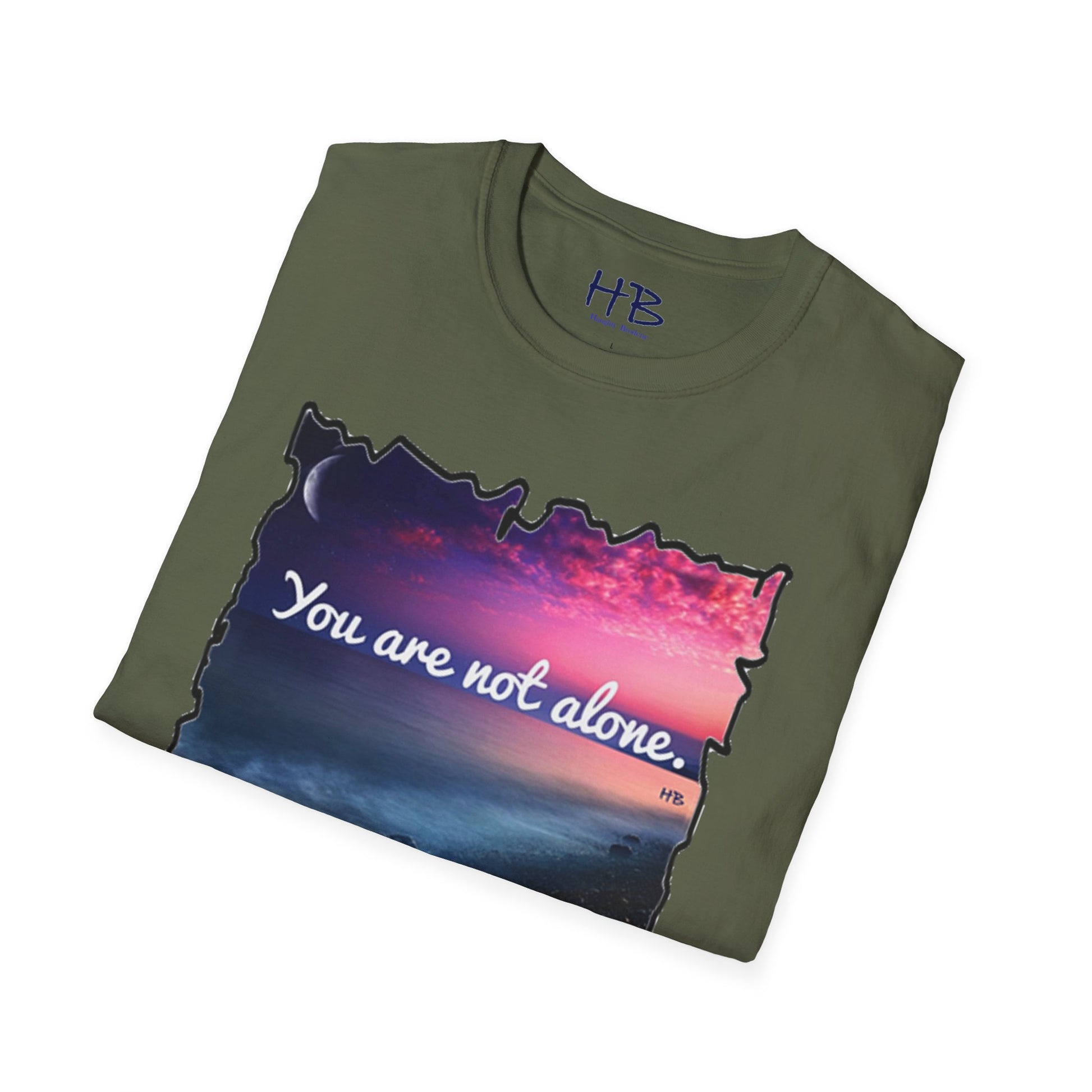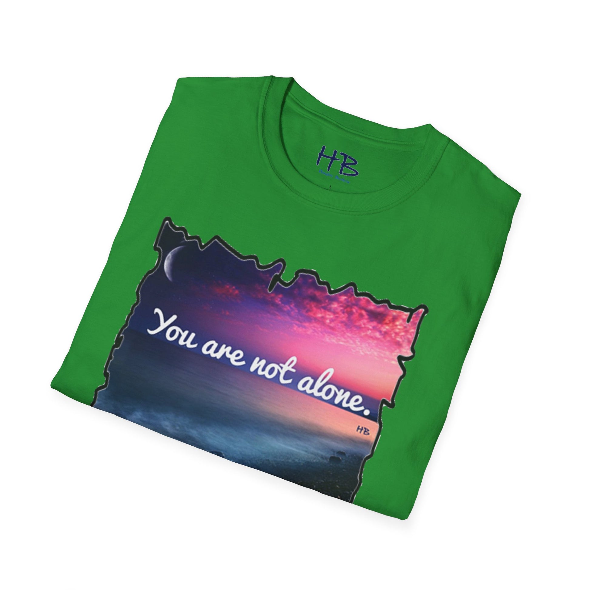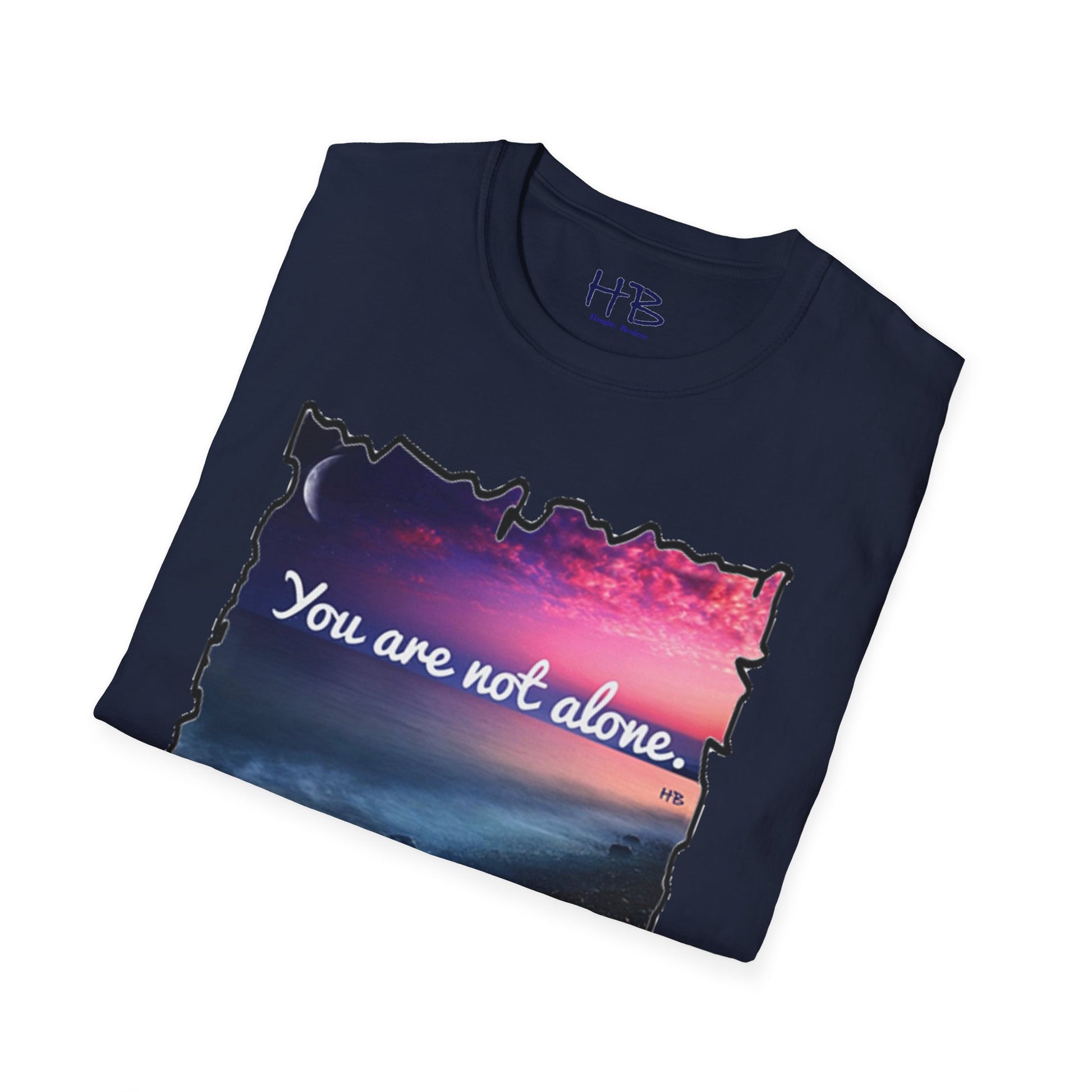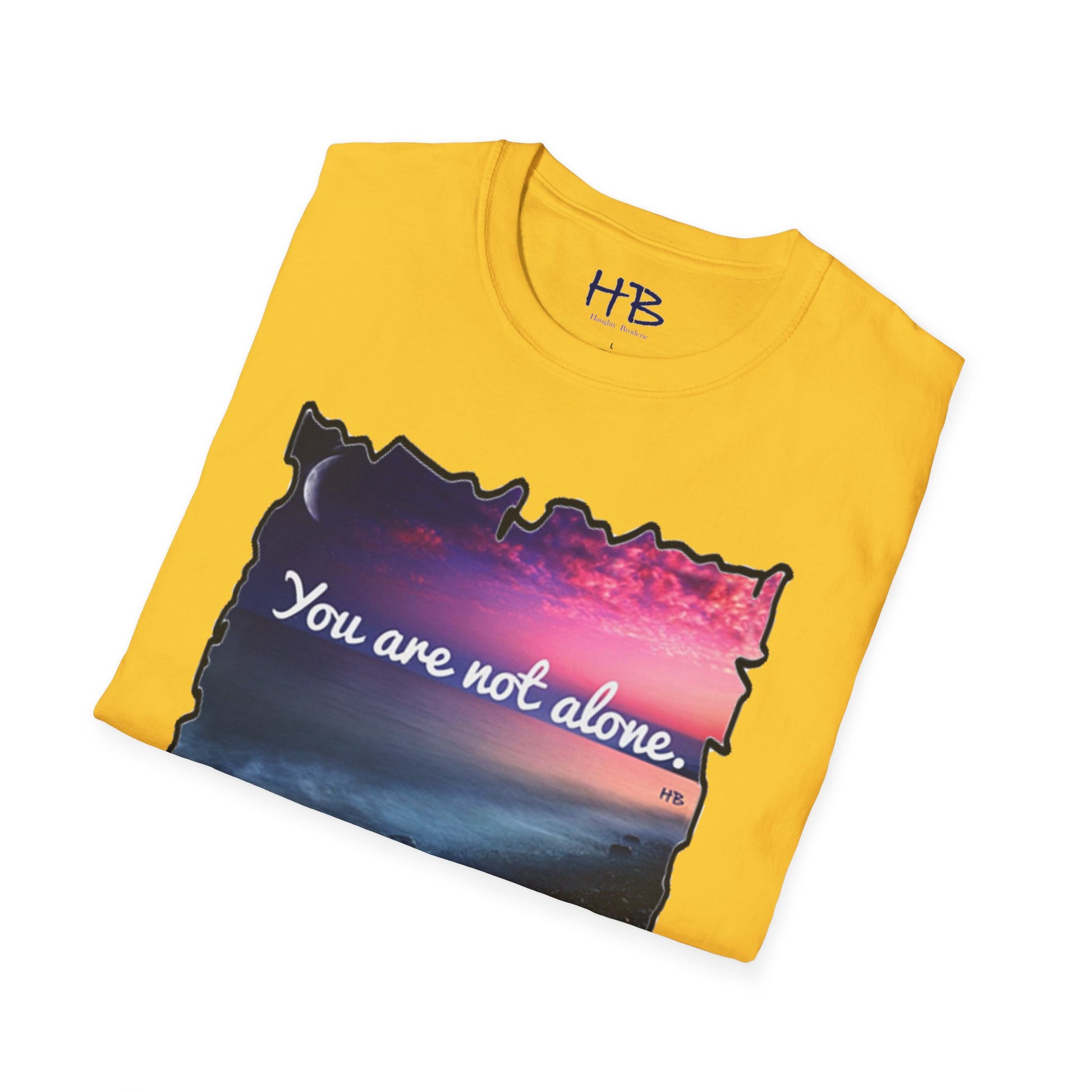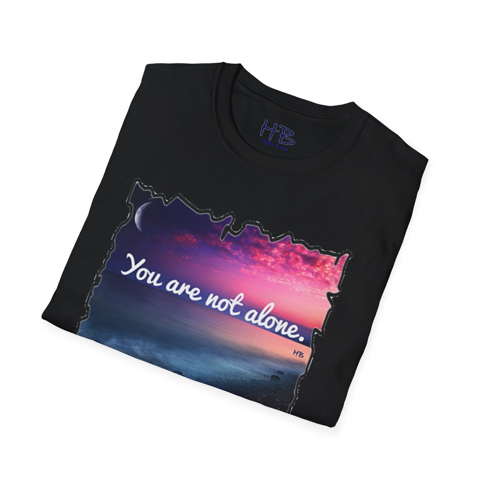 Introducing our stunning garment showcasing a captivating pink sky with a crescent moon gracefully resting on the horizon. This picturesque scene is complemented by rocky sands being gently embraced by the rhythmic caress of ocean waves. As you explore this visually enchanting tee shirt, you'll discover a profound message that reads, "You are not alone."