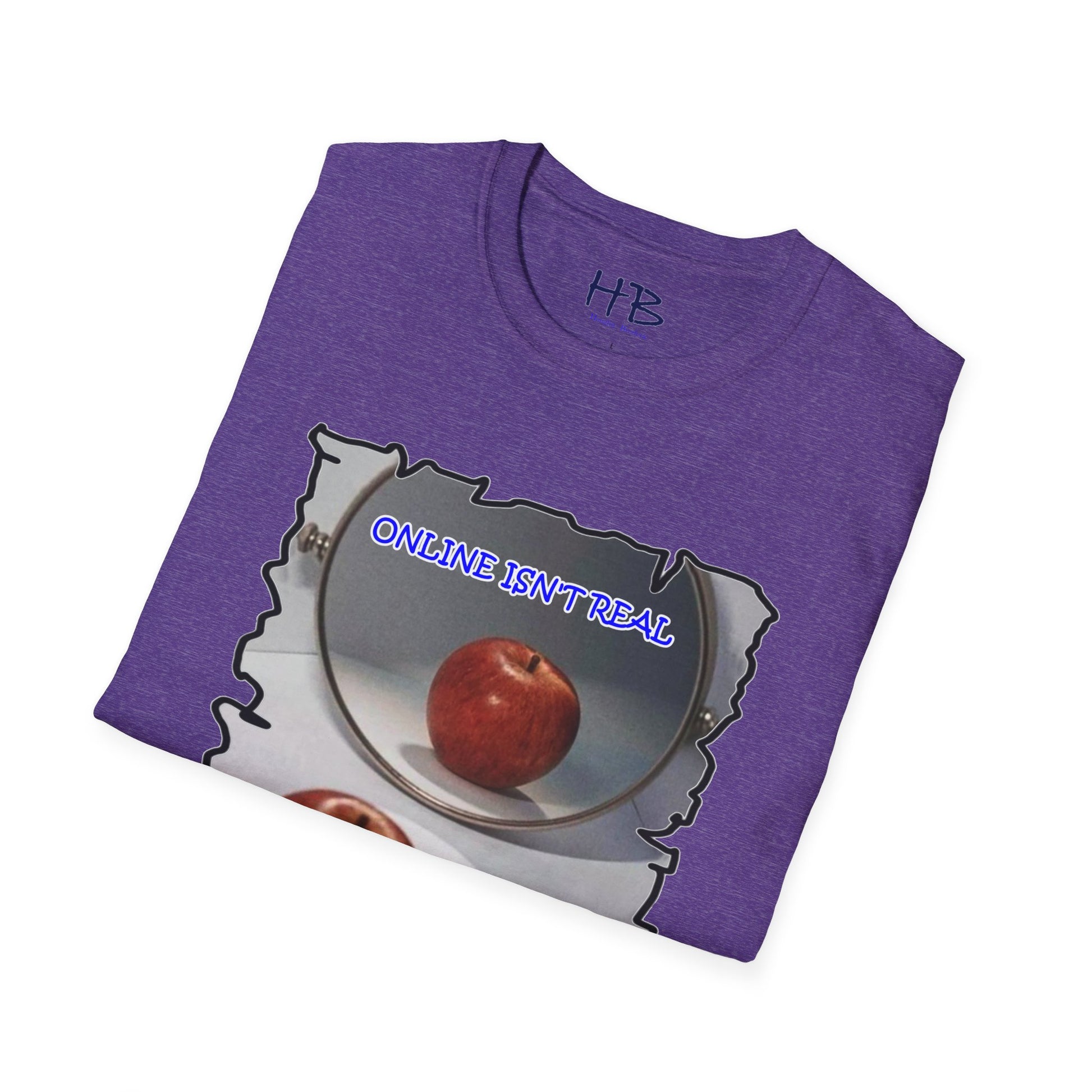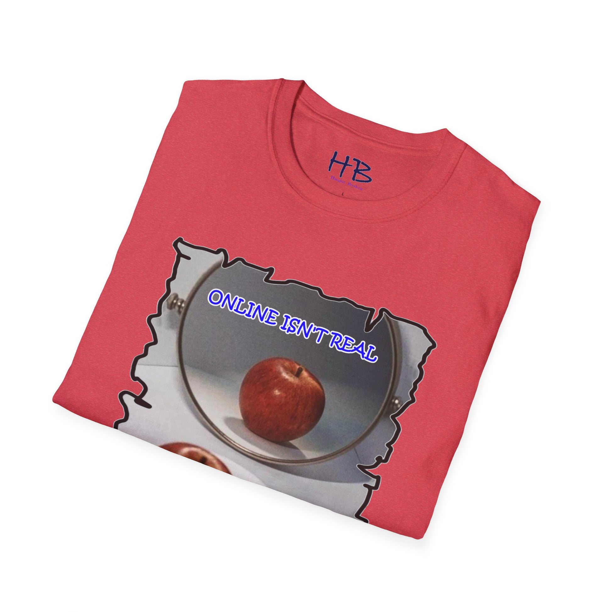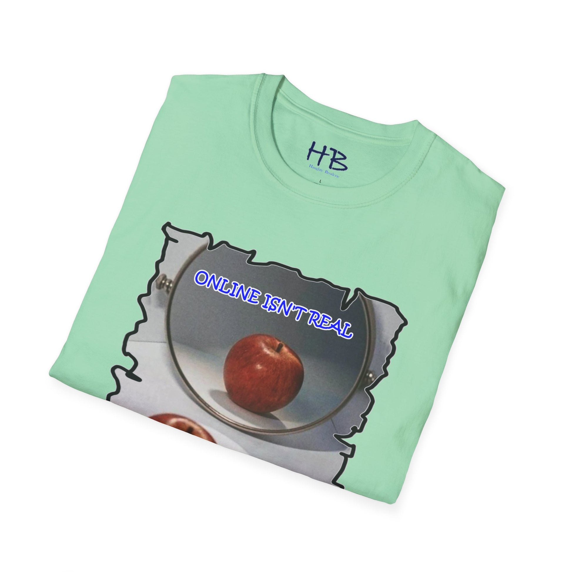 The lens of the camera captures a peculiar angle, revealing the apple's hidden secret. As the apple looks into the mirror, its reflective surface unmasks a shocking truth - the backside of the apple has been devoured, leaving an empty space where its core once resided. This duality serves as a metaphor, an elegant representation of the digital realm we navigate daily. The text etched onto the mirror, "ONLINE ISN'T REAL," delivers a powerful statement about perception, reality, and the truths concealed beneath polished facades.