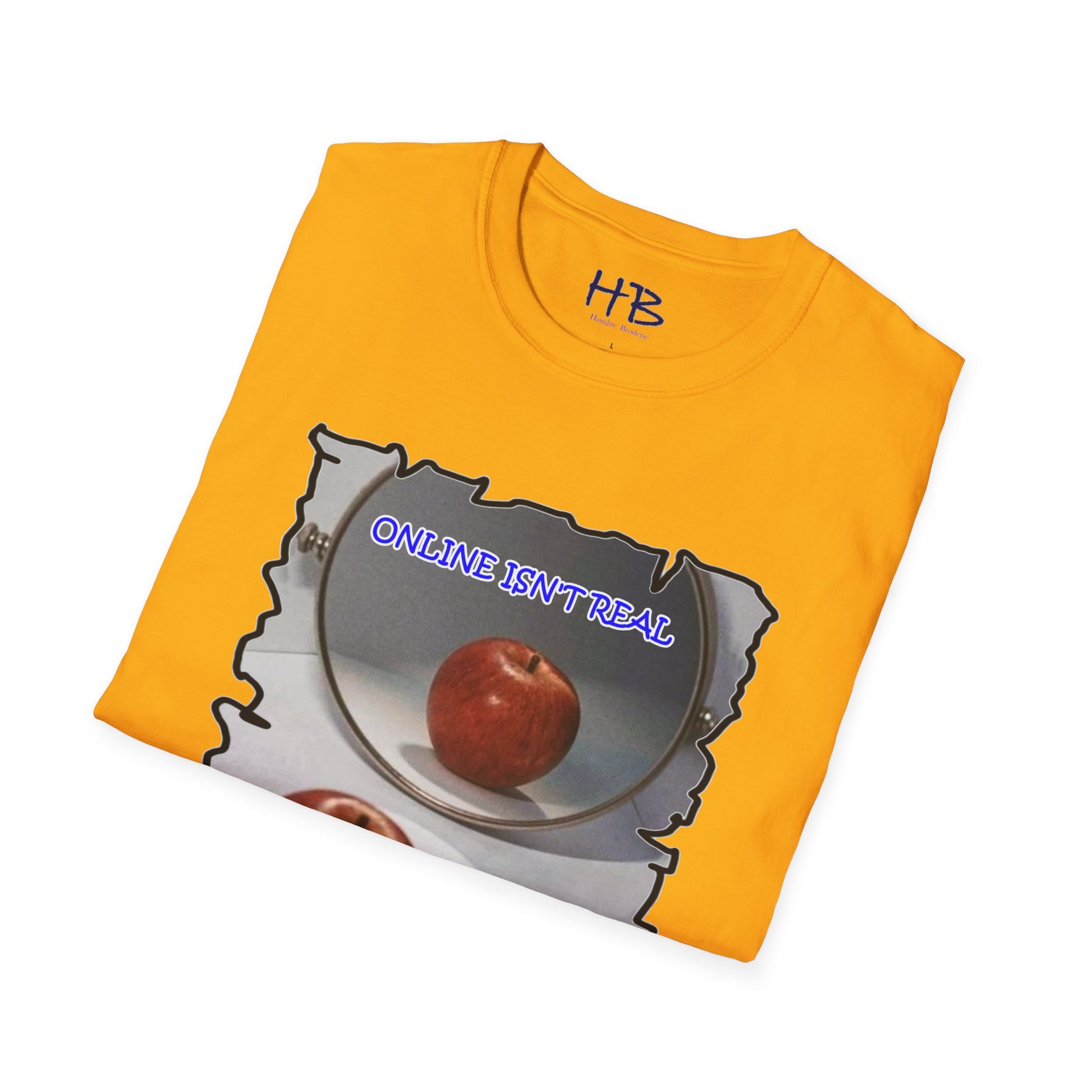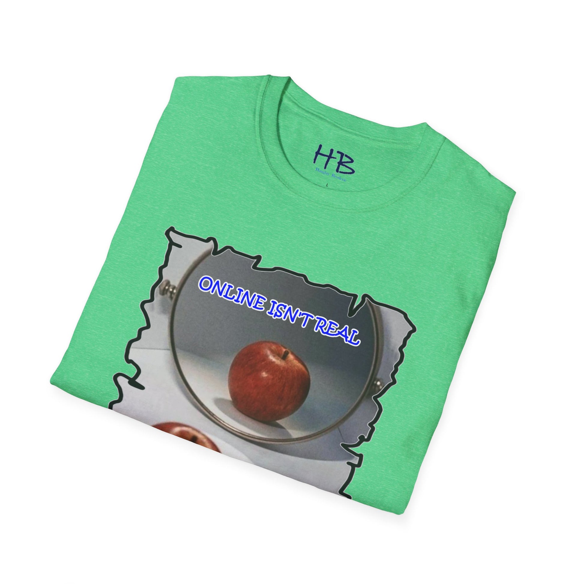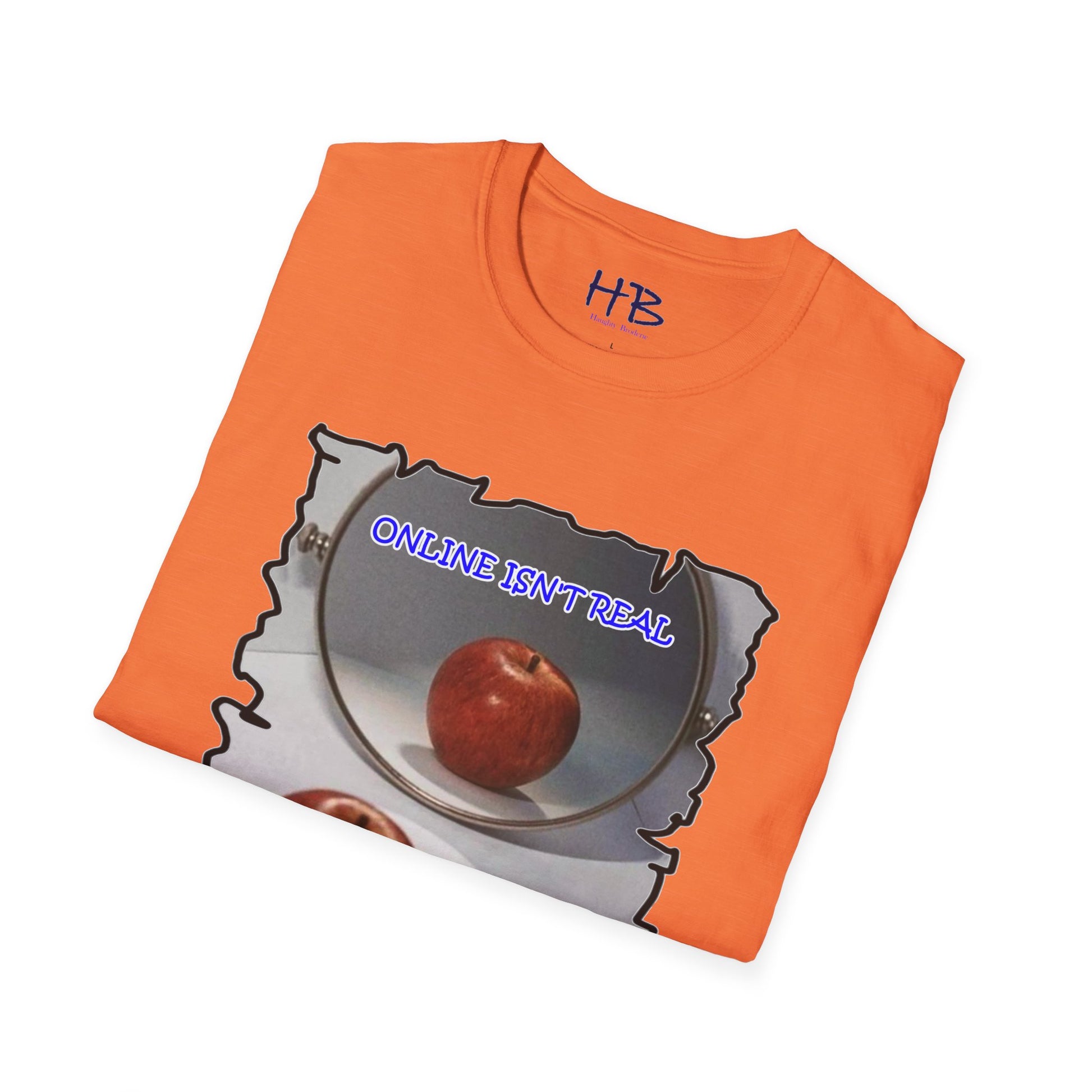The lens of the camera captures a peculiar angle, revealing the apple's hidden secret. As the apple looks into the mirror, its reflective surface unmasks a shocking truth - the backside of the apple has been devoured, leaving an empty space where its core once resided. This duality serves as a metaphor, an elegant representation of the digital realm we navigate daily. The text etched onto the mirror, "ONLINE ISN'T REAL," delivers a powerful statement about perception, reality, and the truths concealed beneath polished facades.