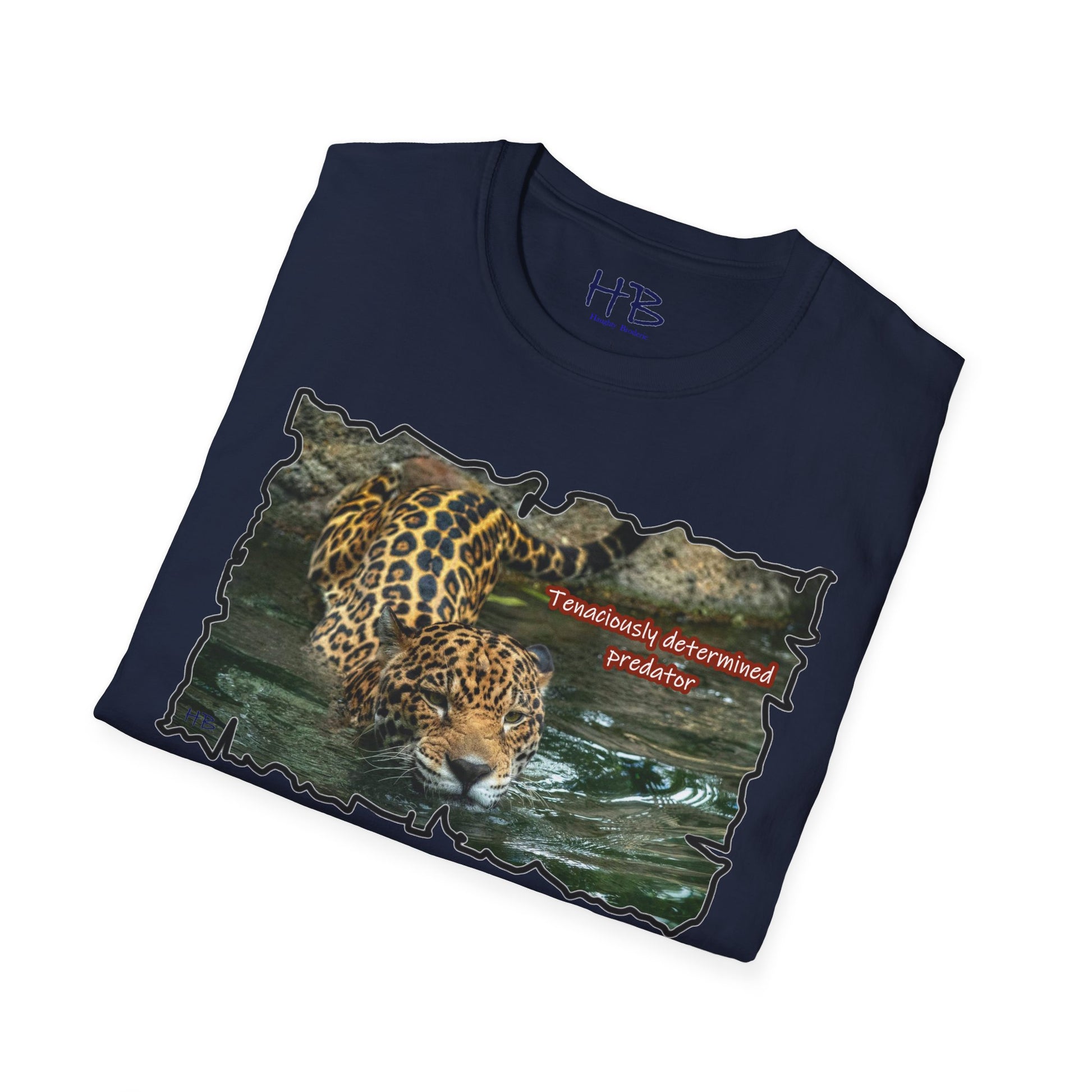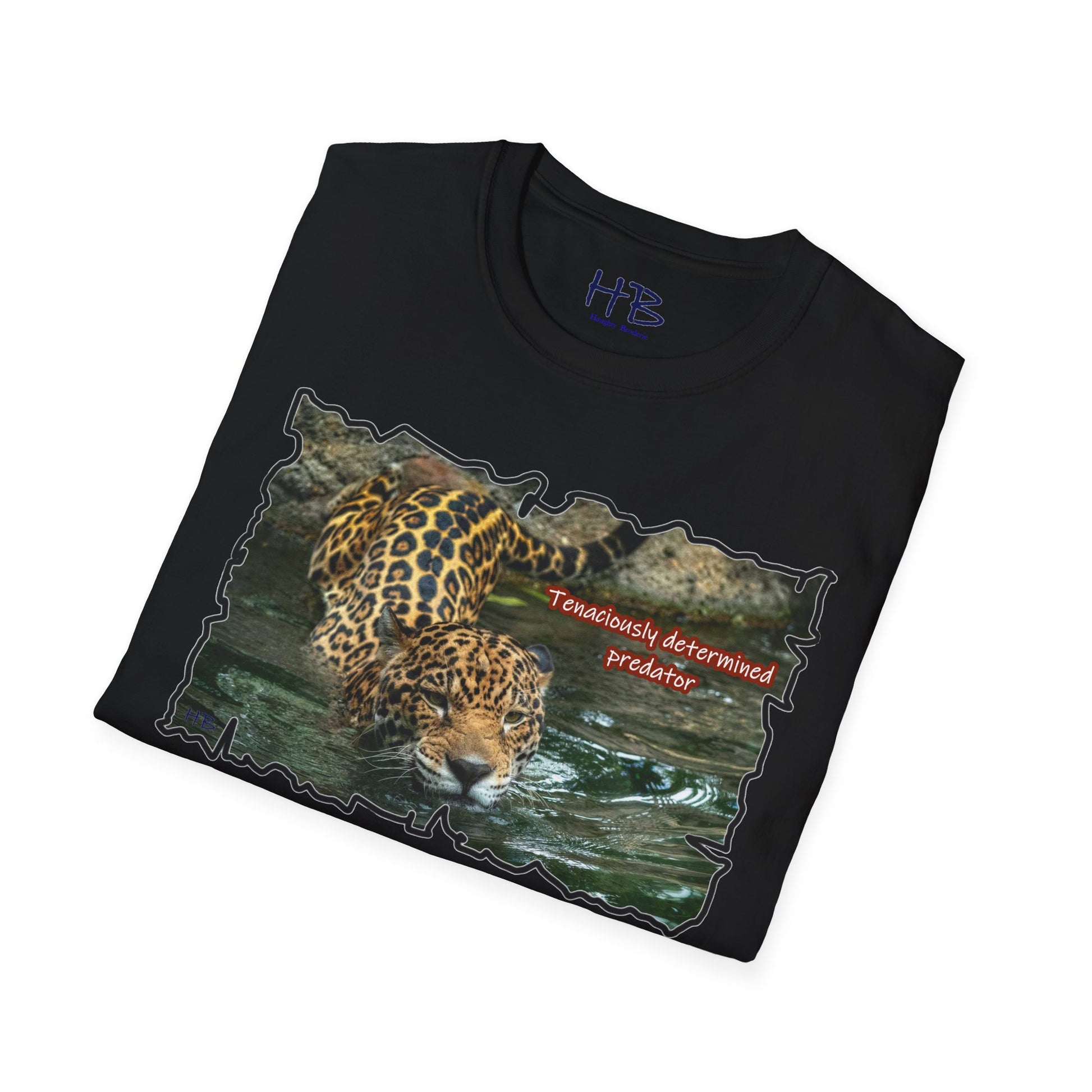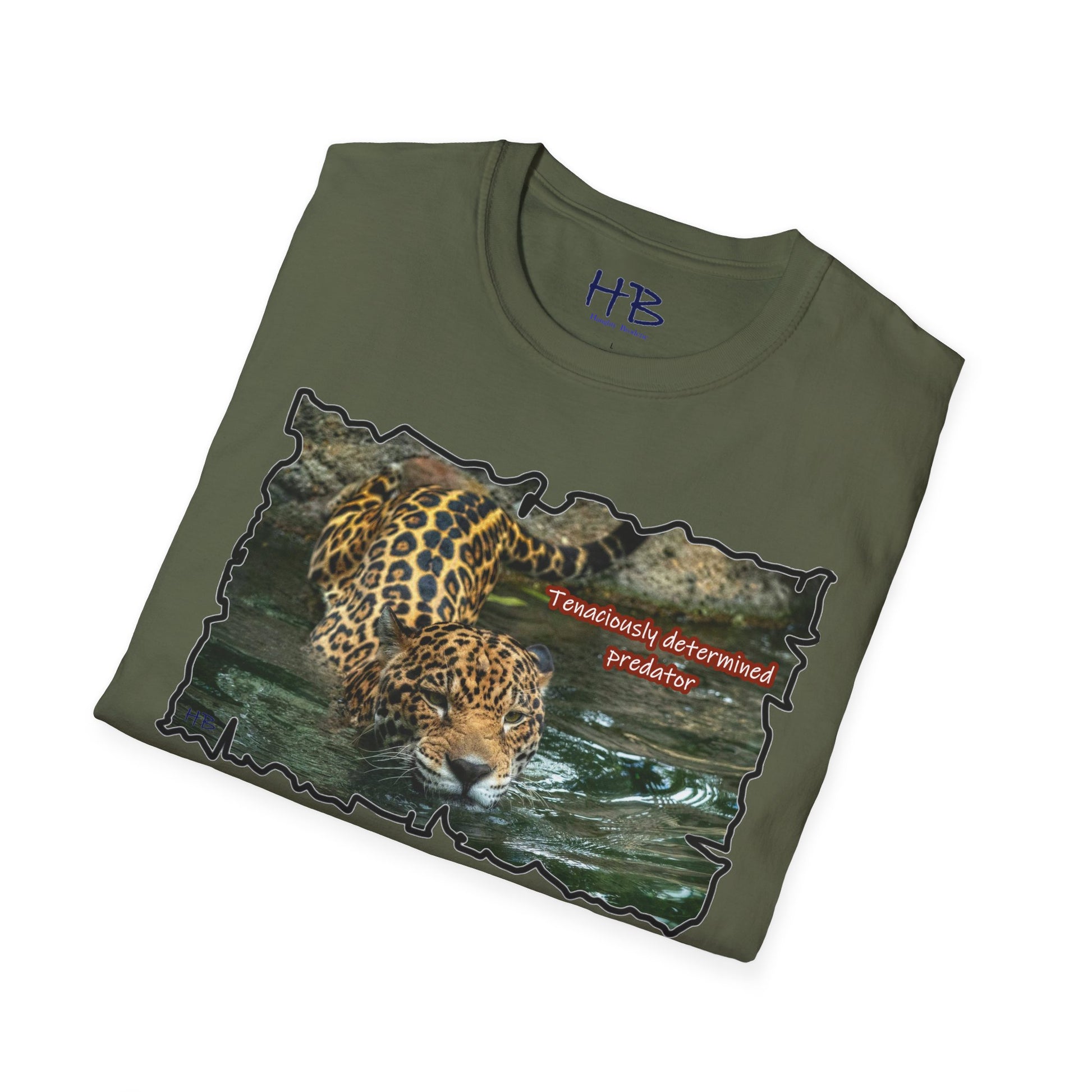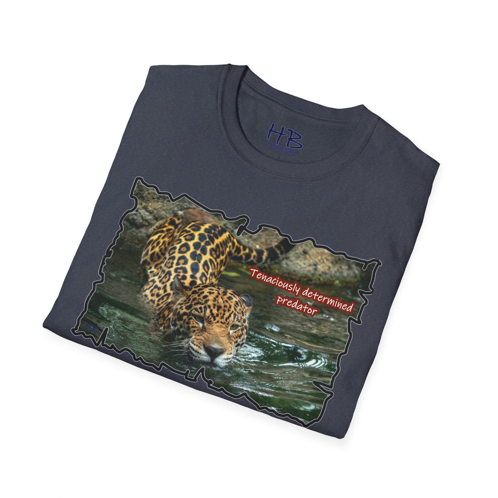 Introducing the "Tenaciously Determined Predator" T-Shirt: a masterpiece of wearable art that encapsulates the essence of the animal kingdom's relentless pursuit. This extraordinary garment features a stunning depiction of a magnificent leopard, its sleek fur glistening with droplets as it fearlessly ventures into a wet terrain. The envious green brightness of its eyes conveys an intensity that speaks volumes, while its ears pulled back in a gesture of disdain reveal the feline's unyielding focus on the prey before it.