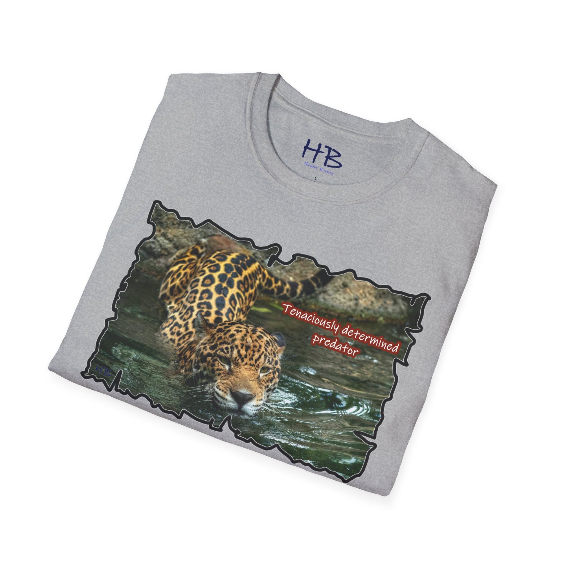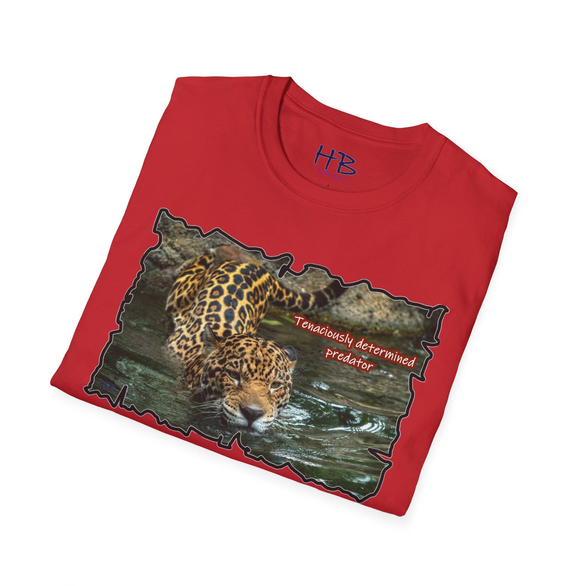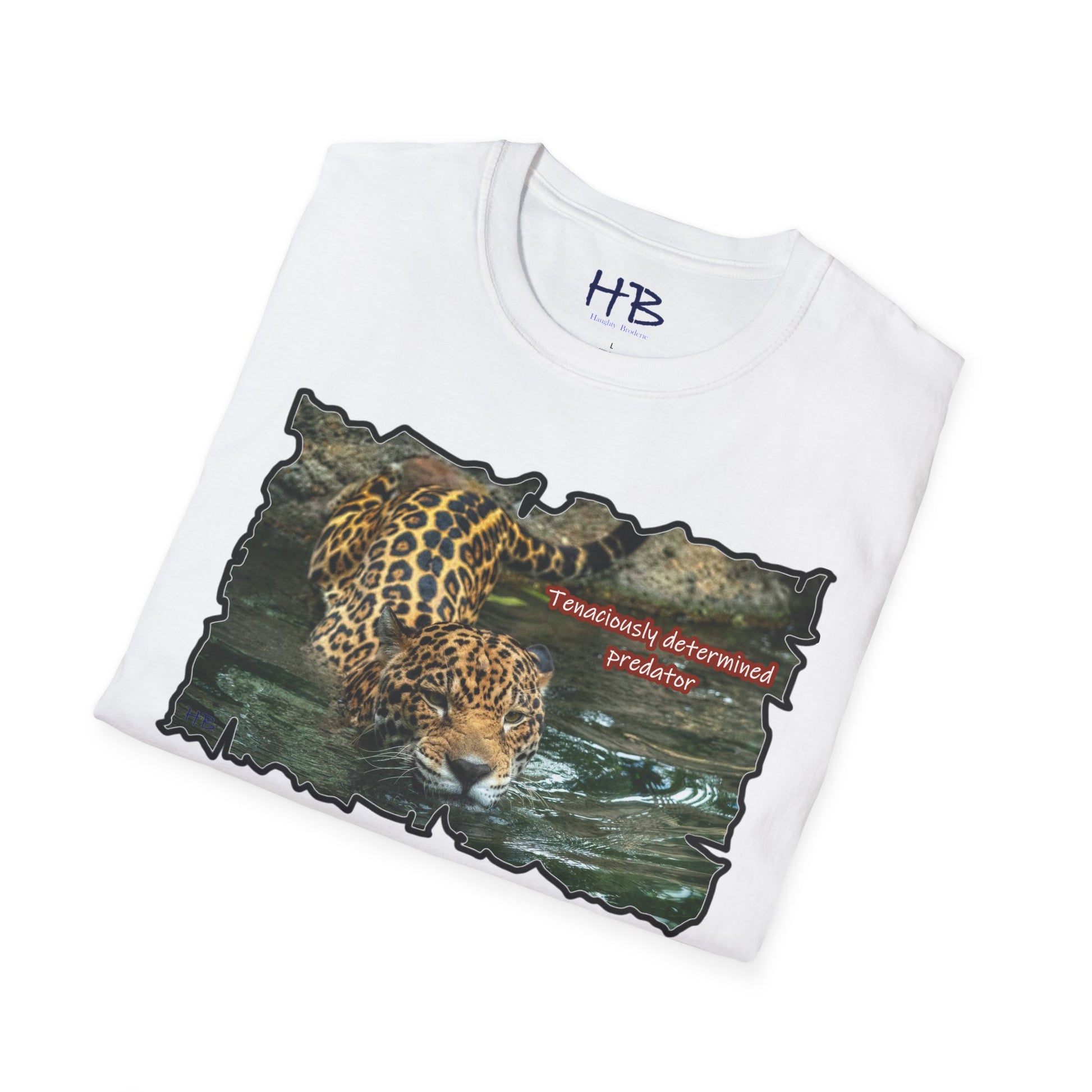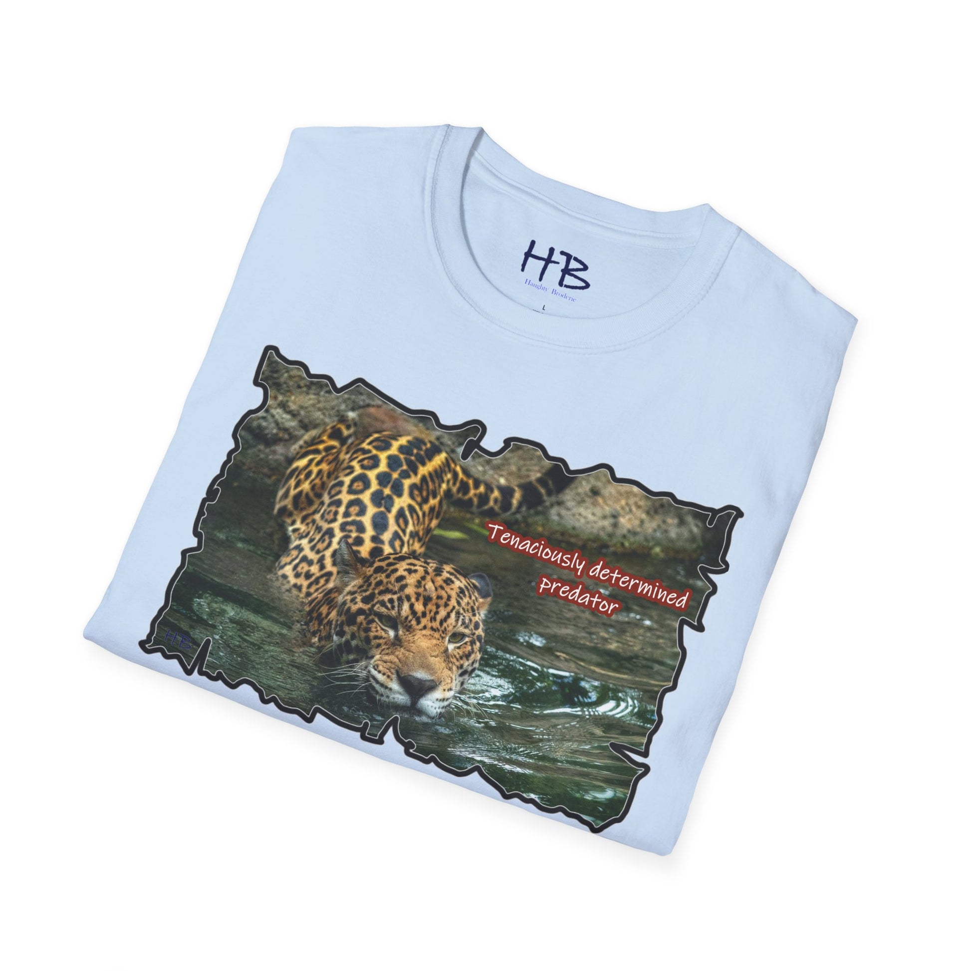 Introducing the "Tenaciously Determined Predator" T-Shirt: a masterpiece of wearable art that encapsulates the essence of the animal kingdom's relentless pursuit. This extraordinary garment features a stunning depiction of a magnificent leopard, its sleek fur glistening with droplets as it fearlessly ventures into a wet terrain. The envious green brightness of its eyes conveys an intensity that speaks volumes, while its ears pulled back in a gesture of disdain reveal the feline's unyielding focus on the prey before it.