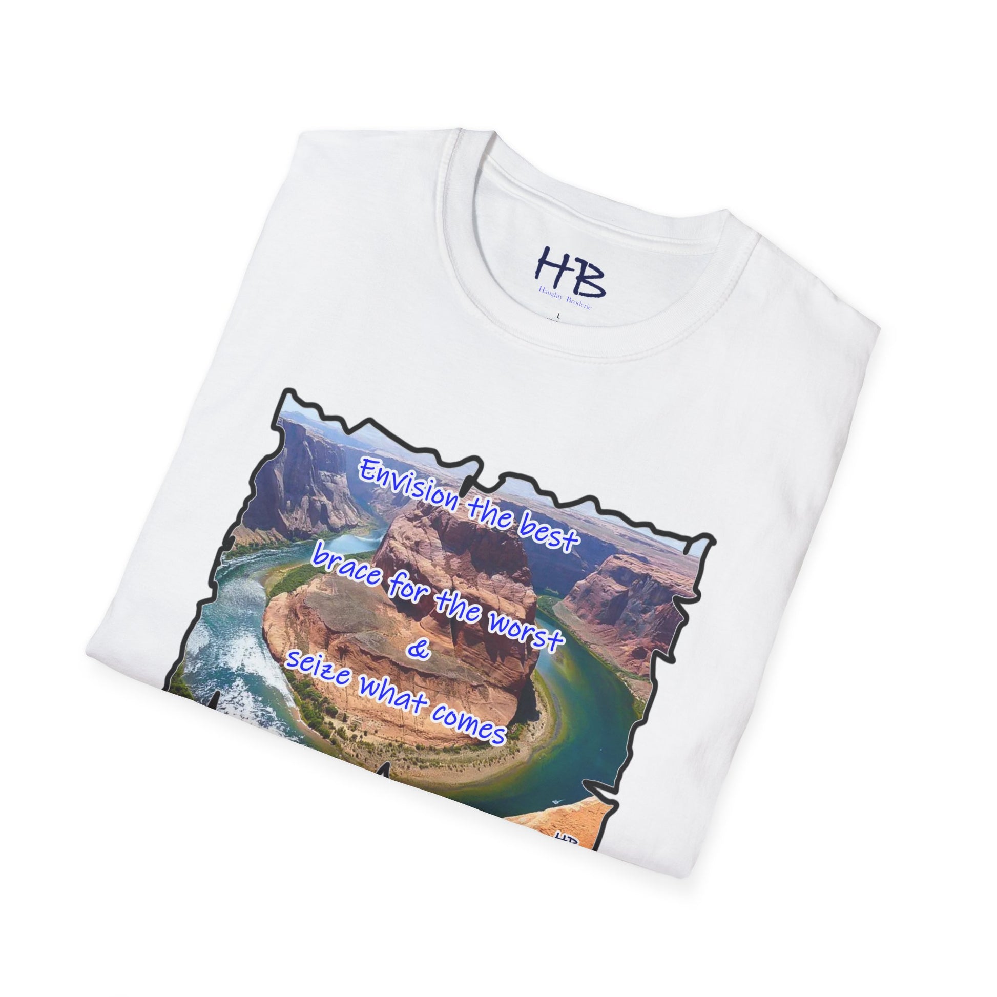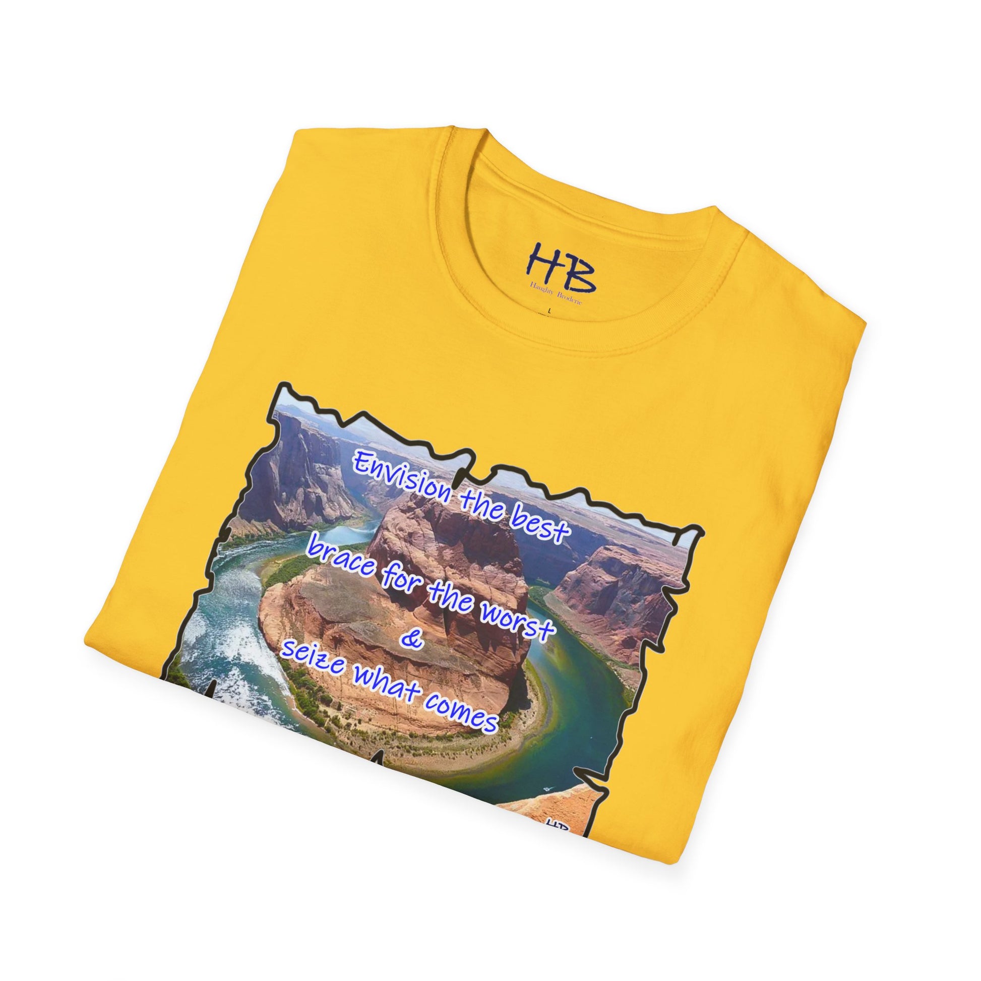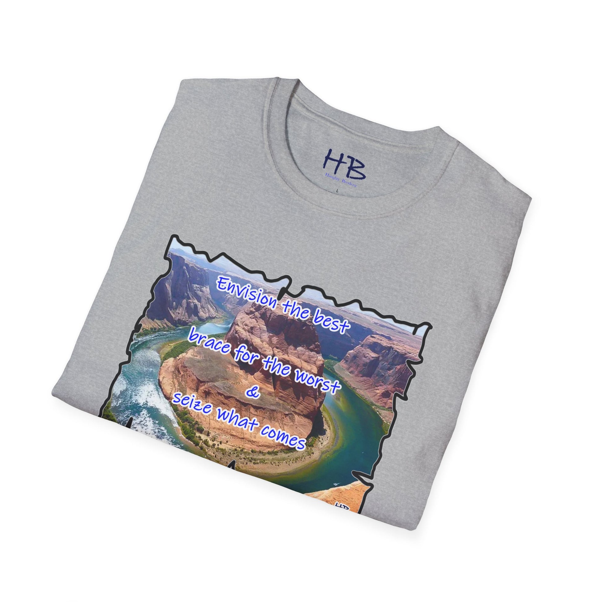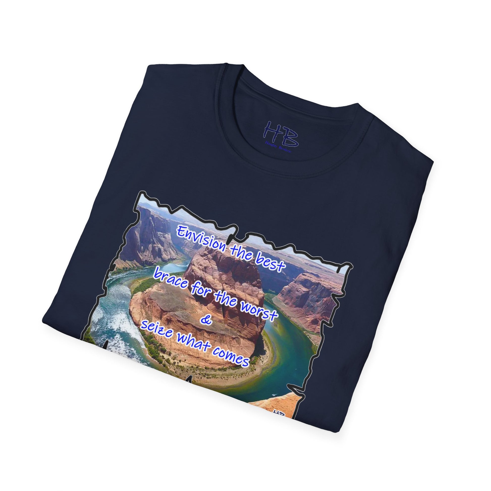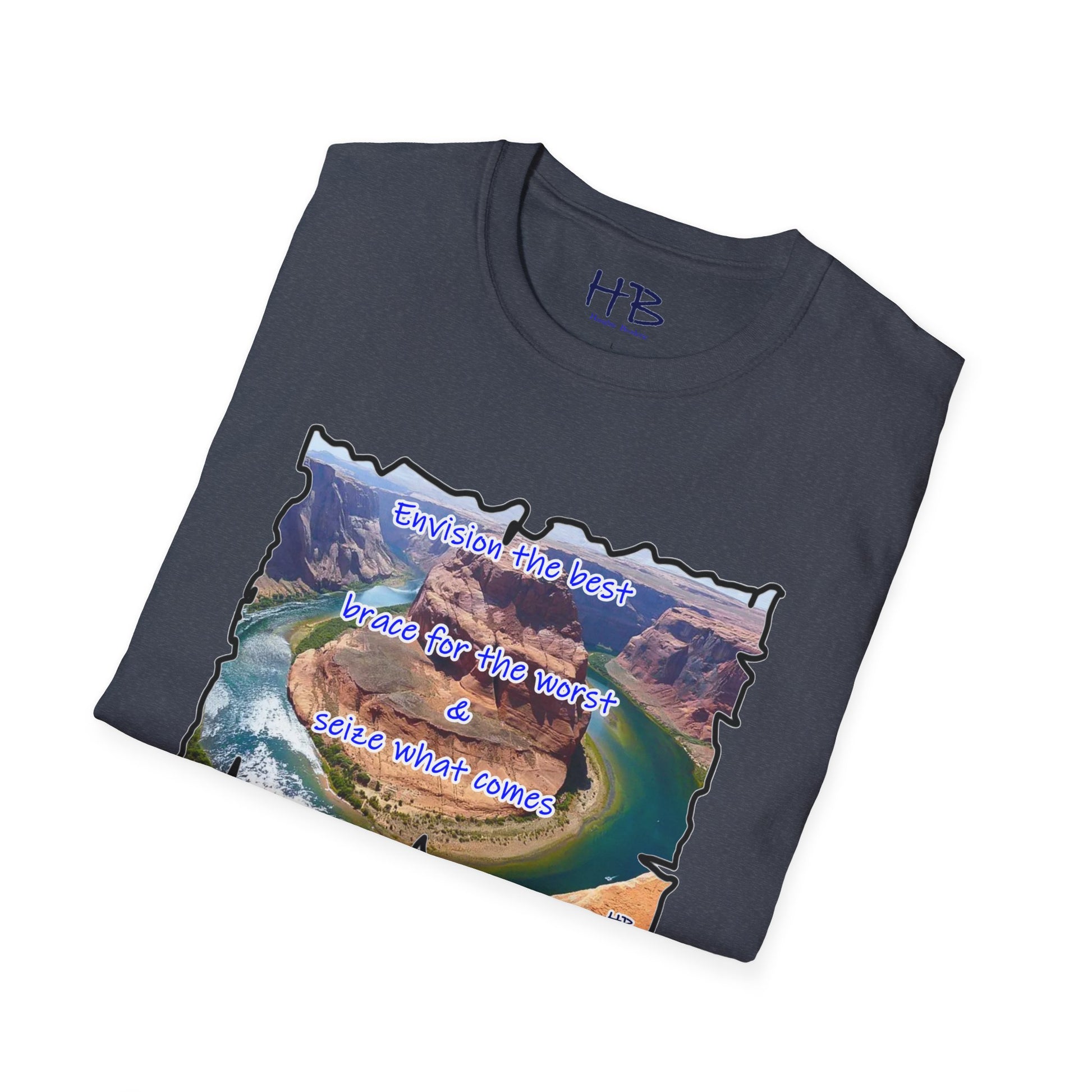 In a world full of uncertainty, the Resilience Riverside Tee embodies the essence of hope and adaptability through its captivating design. This shirt features a breathtaking natural landscape, where a serene river gracefully flows, encircling a massive rock before tracing its steps in a U-turn fashion. The powerful message, "Envision the best, brace for the worst, and seize what comes," accompanies this scenic marvel.