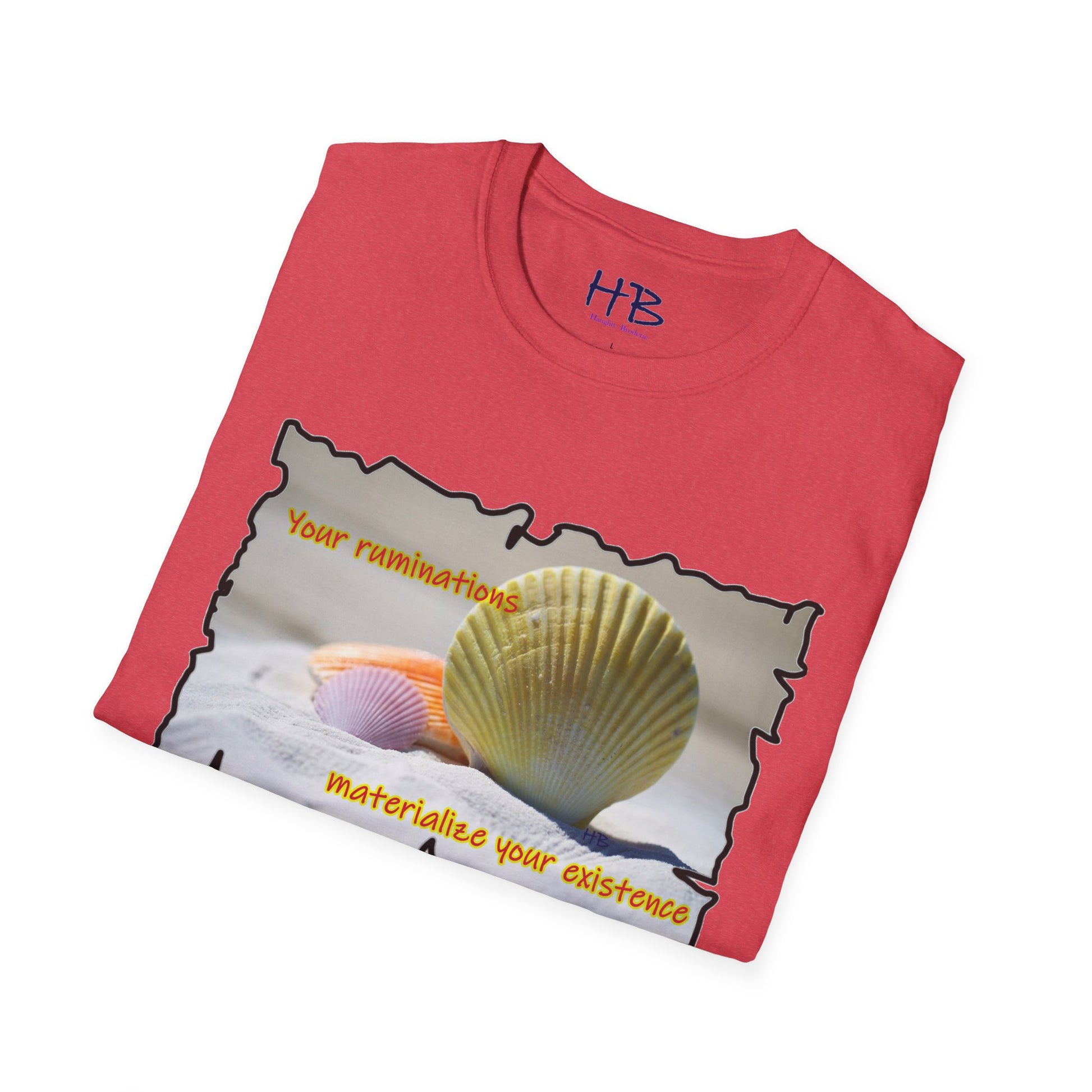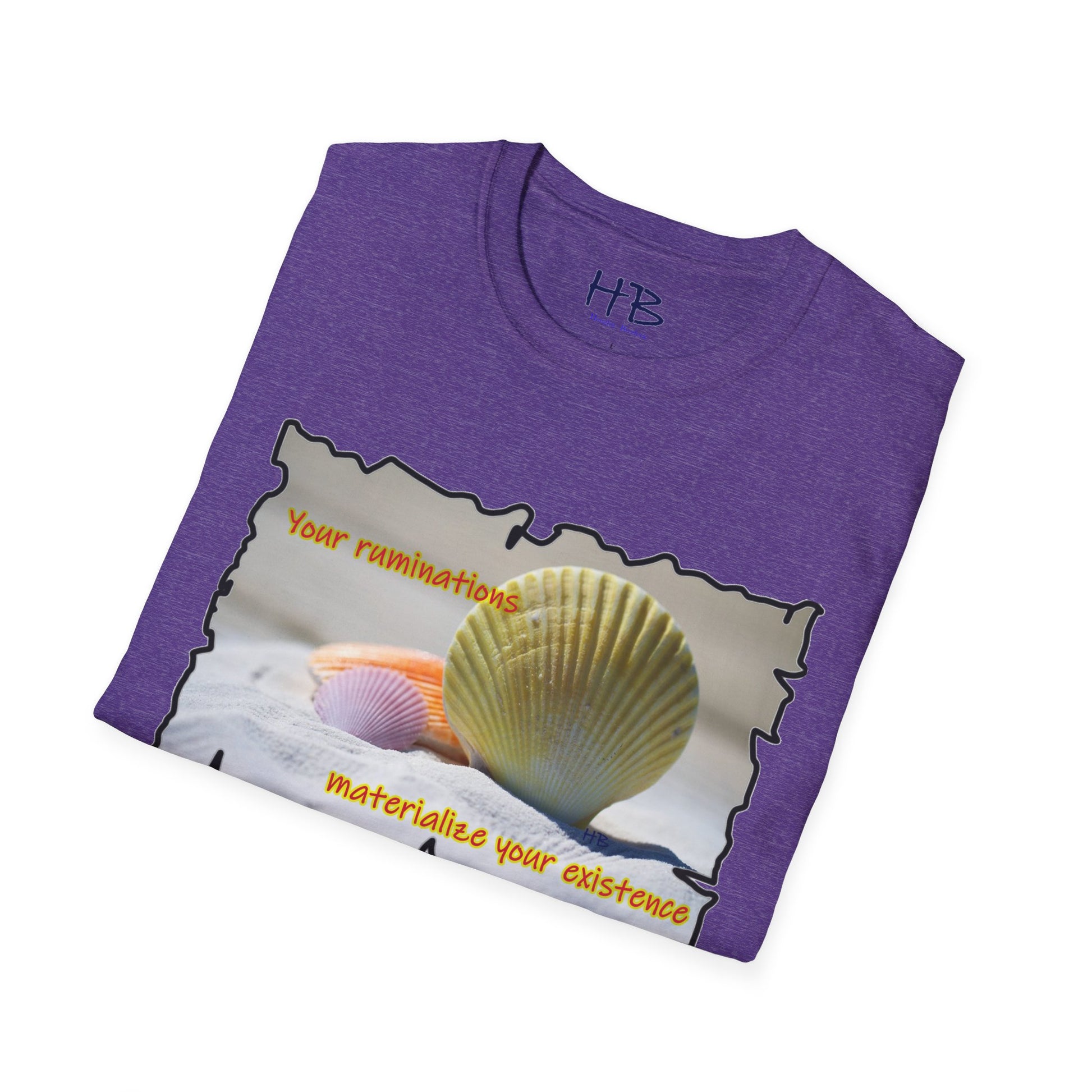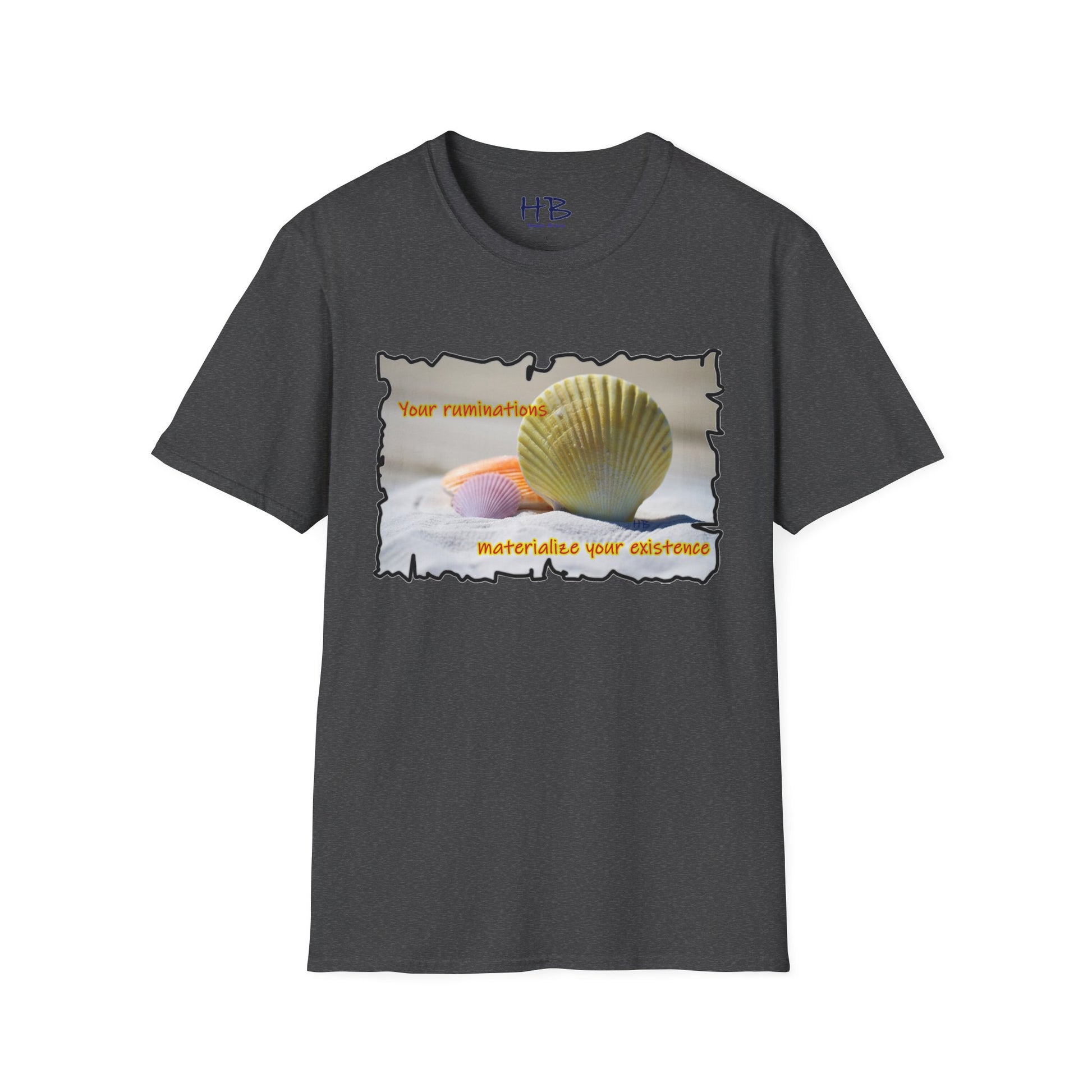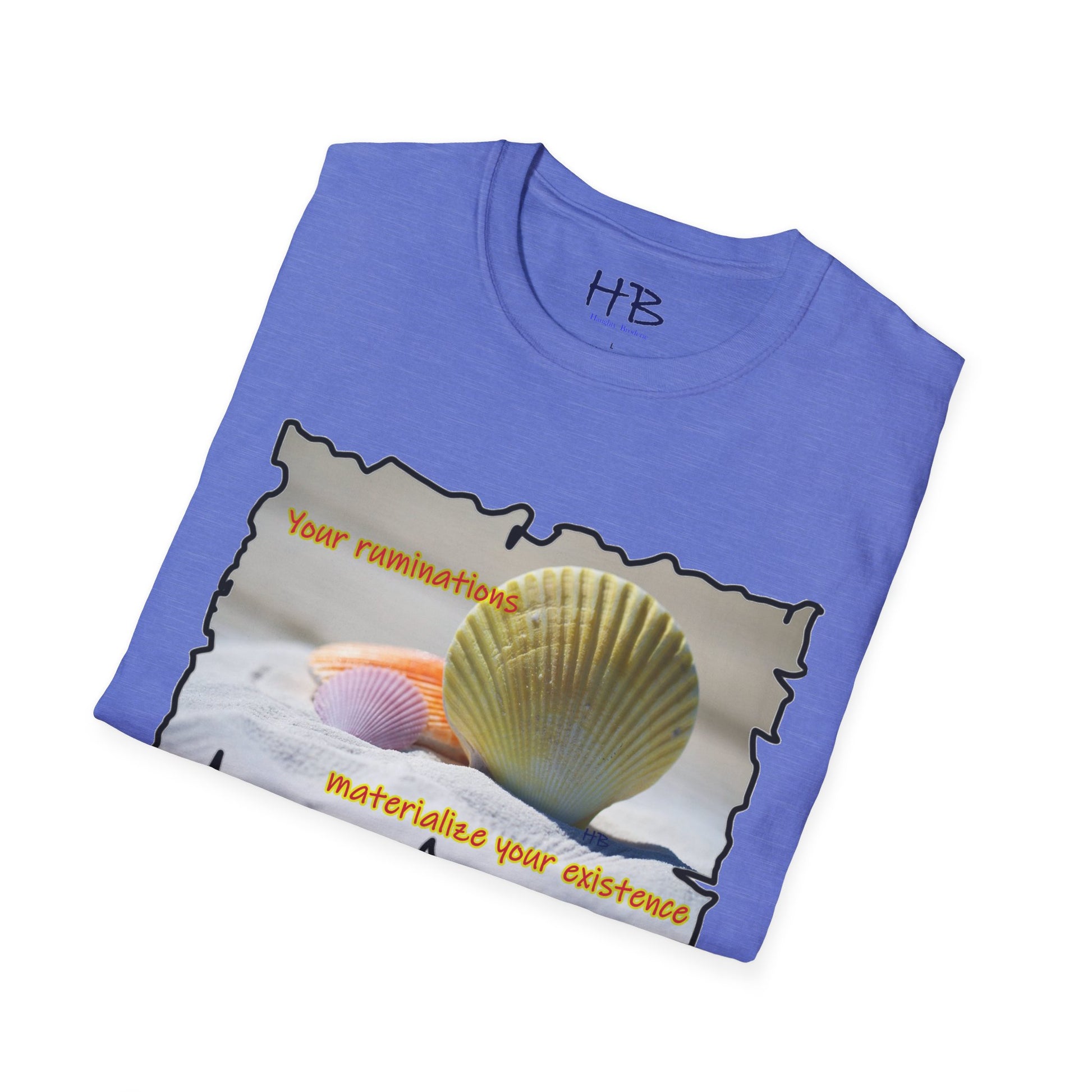 Introducing our exquisite garment adorned with an exquisite tableau! Picture a pristine shoreline, where the soft white sand cradles a pair of resplendent, multicolored seashells. This picturesque scene beckons you to explore its depths. And there, woven into the fabric of this tee shirt, you'll find an enigmatic message: "Your rumincations materialize your existence."