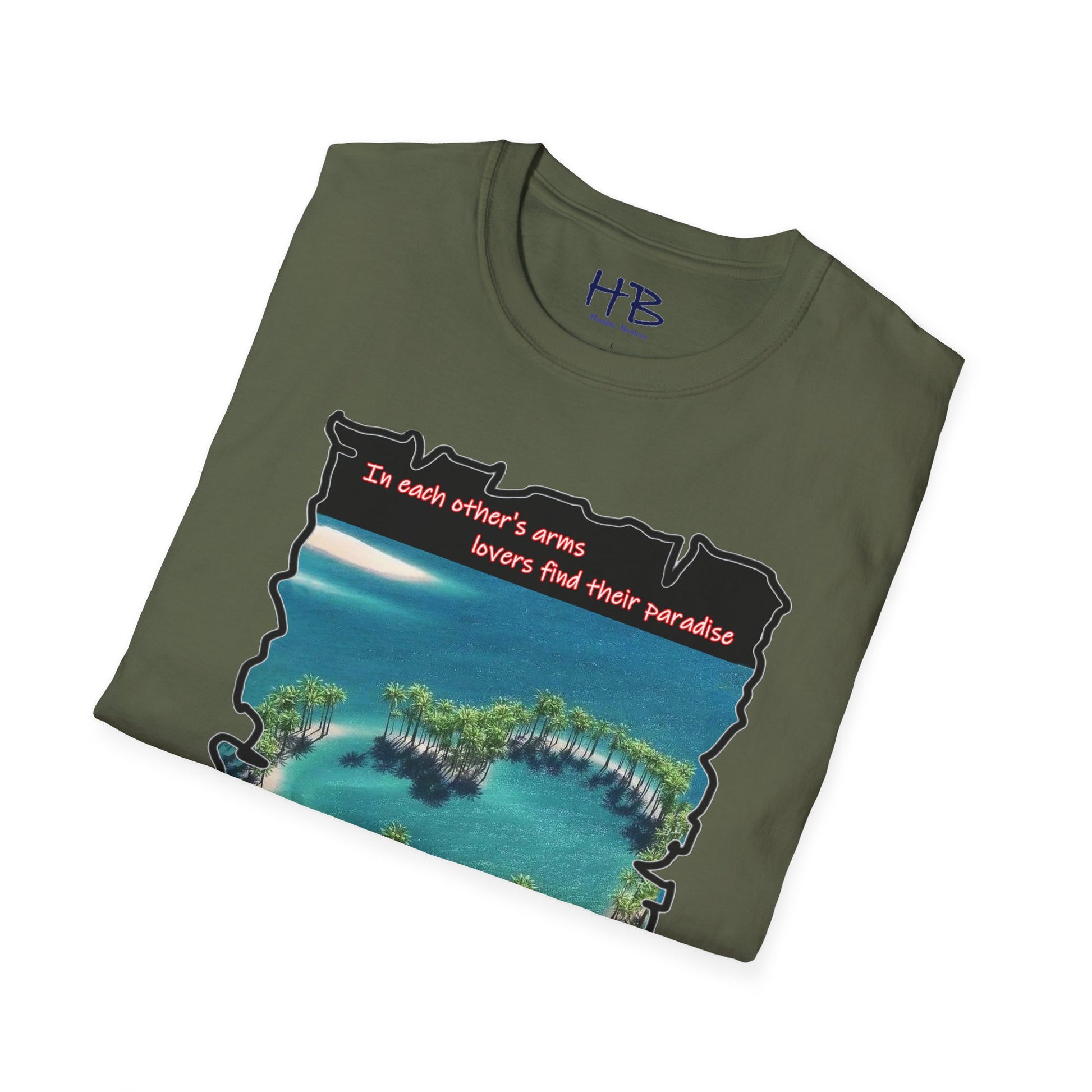 Introducing our exclusive Paradise Found T-Shirt, a captivating masterpiece that beautifully captures the essence of love, serenity, and natural beauty. Immerse yourself in the breathtaking view of the Maldives, where tiny islands come together to form a heart shape, adorned with luscious palm trees swaying gracefully in the tropical breeze.