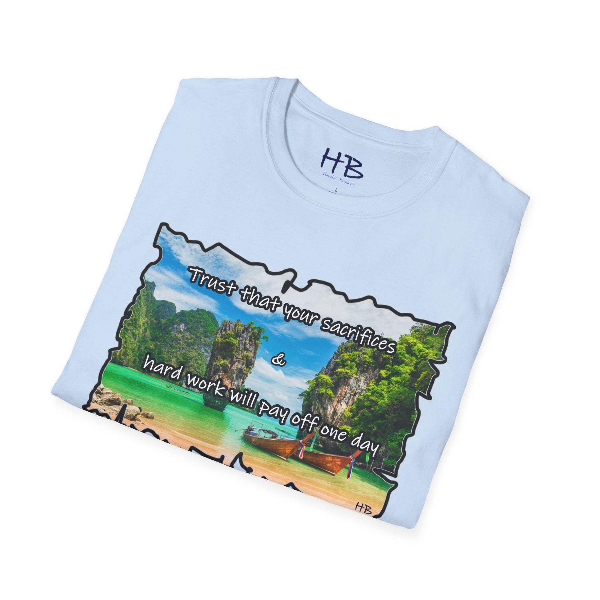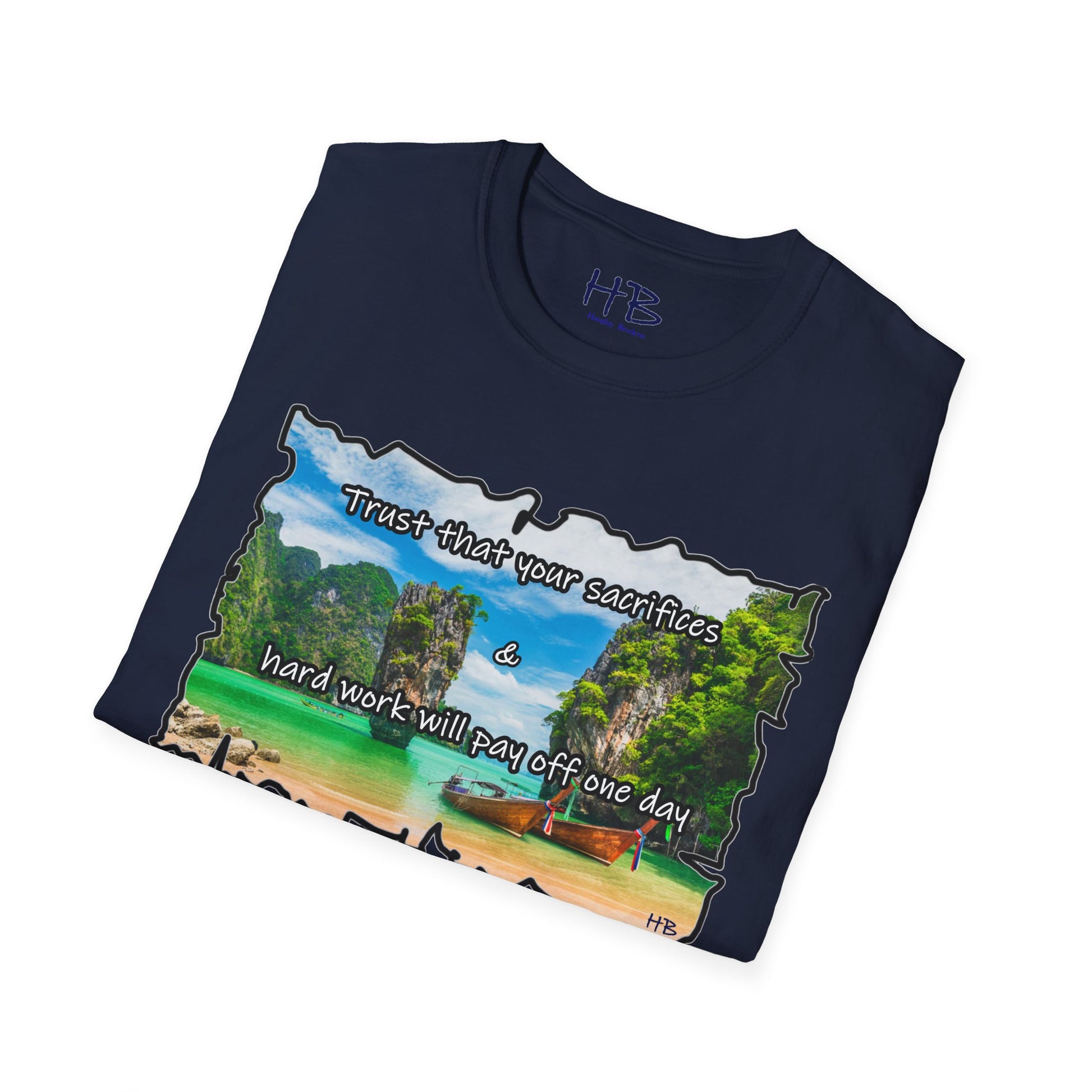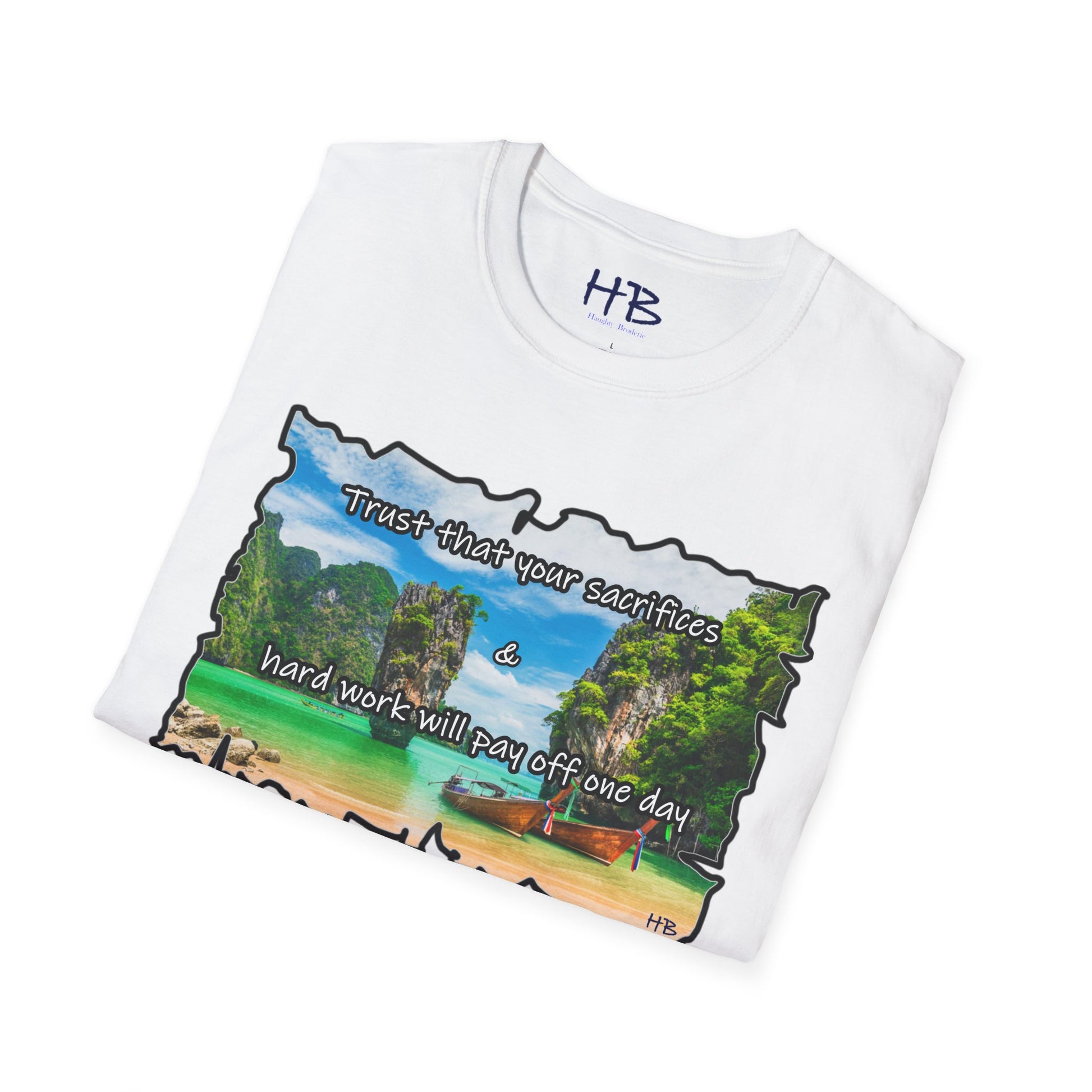 Introducing the Elysian Aspiration Enigma Tee, a wearable masterpiece that encapsulates a utopian dreamscape, a destination coveted by many – an unattainable paradise where azure waters meld seamlessly with the pristine white sands, accompanied by the quaint charm of wooden fishing boats. This exclusive design captures the essence of a luxury retreat, a sanctuary of serenity where the weary find solace and where dreams manifest into reality.