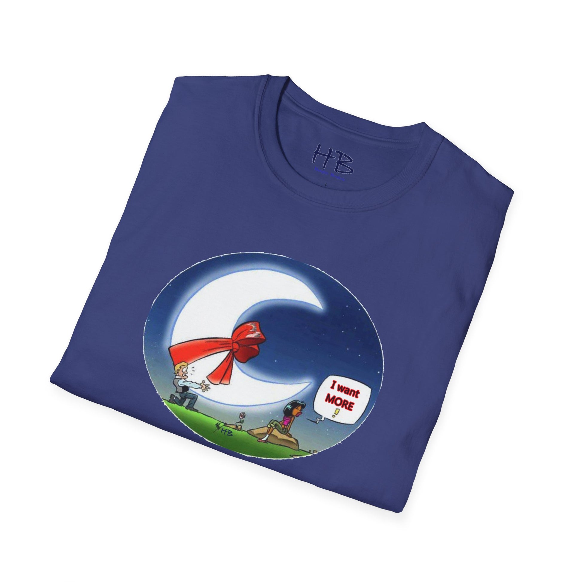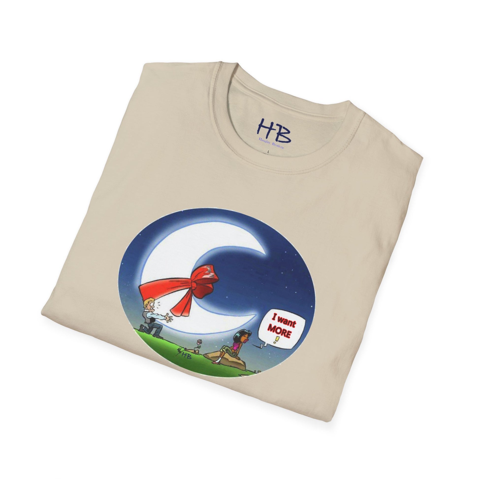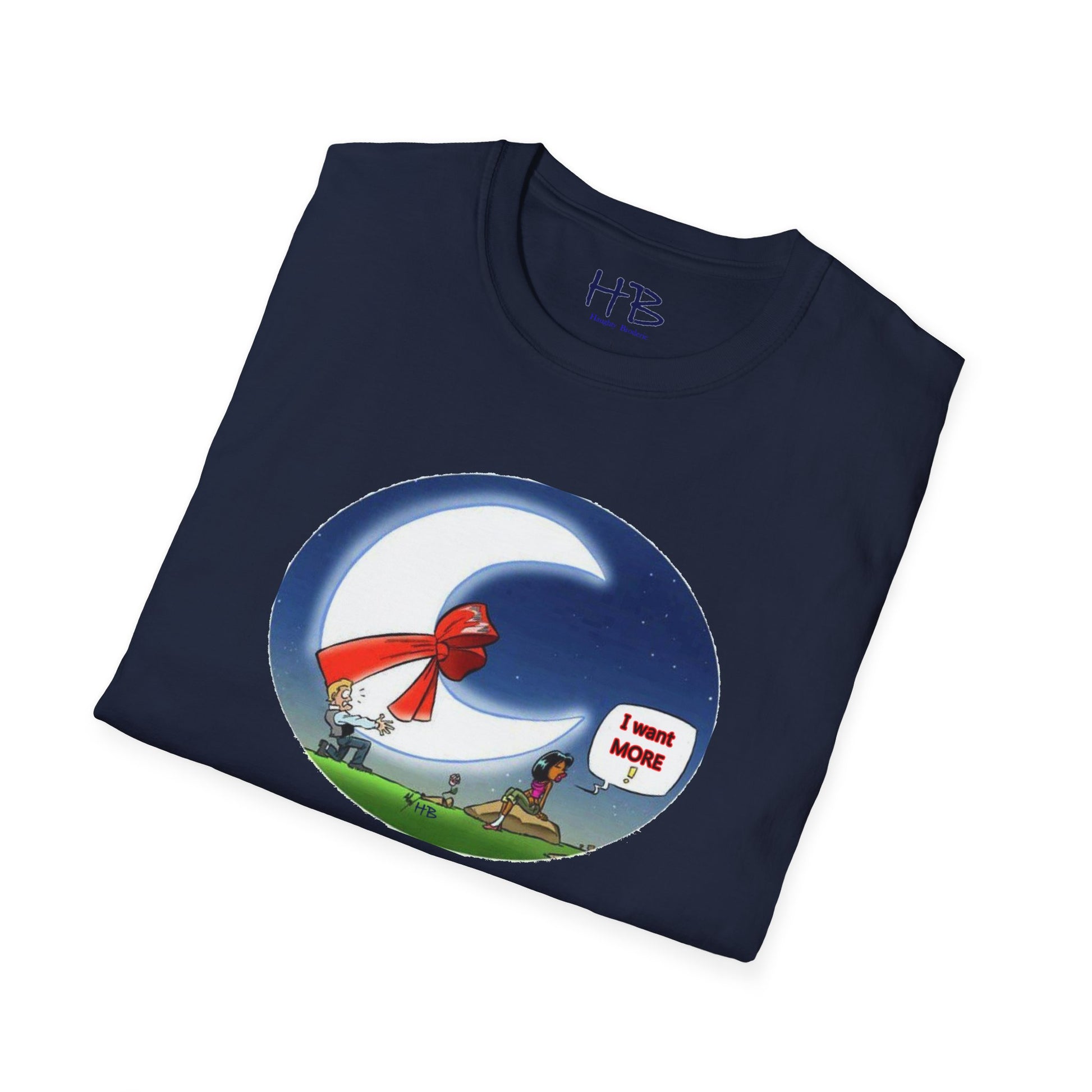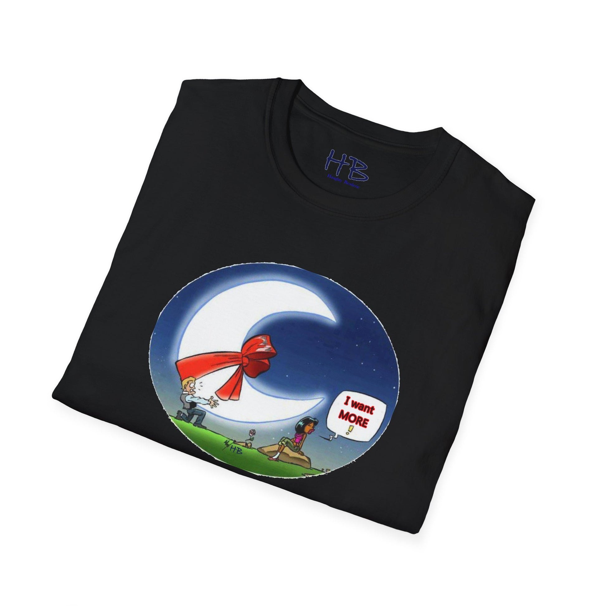 The shirt features a stunning image of a man on his knees, struggling to carry a GIGANTIC crescent moon adorned with a big red gift bow. The man offers this celestial gift to a pretty lady sitting on a rock, but to his dismay, she turns her head away from him and screams, "I WANT MORE!!"
